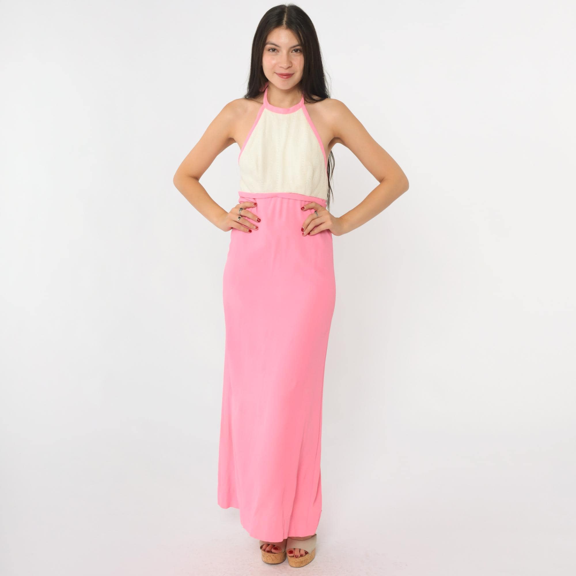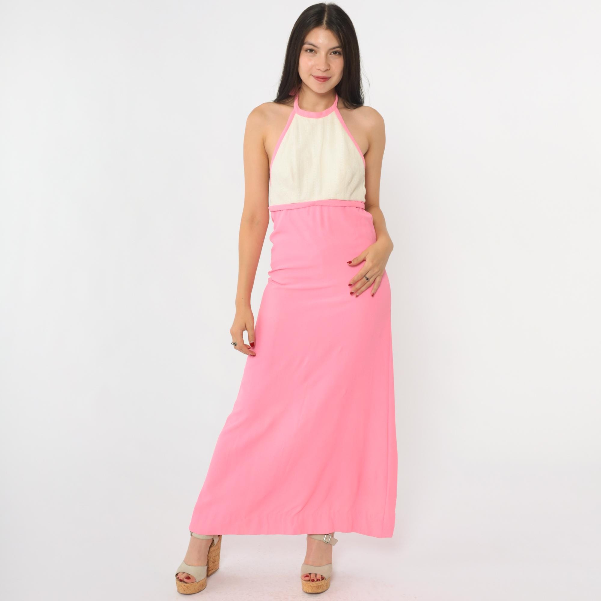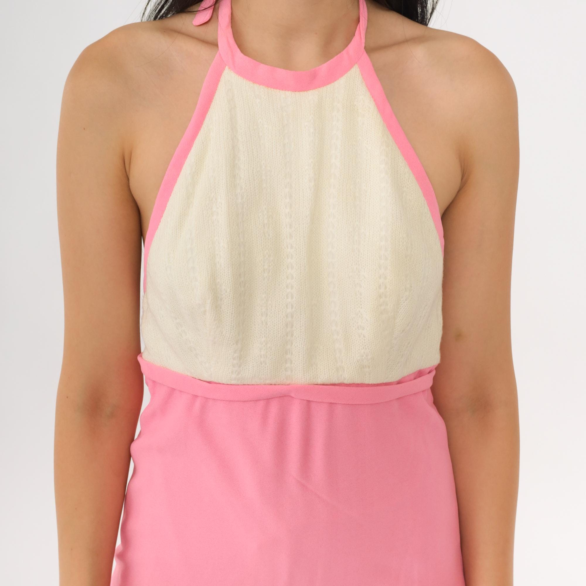 Vintage 70s maxi dress in bright pink featuring a halter neck and a white pointelle knit bodice. It has a high waist, open back, and a rear zipper.