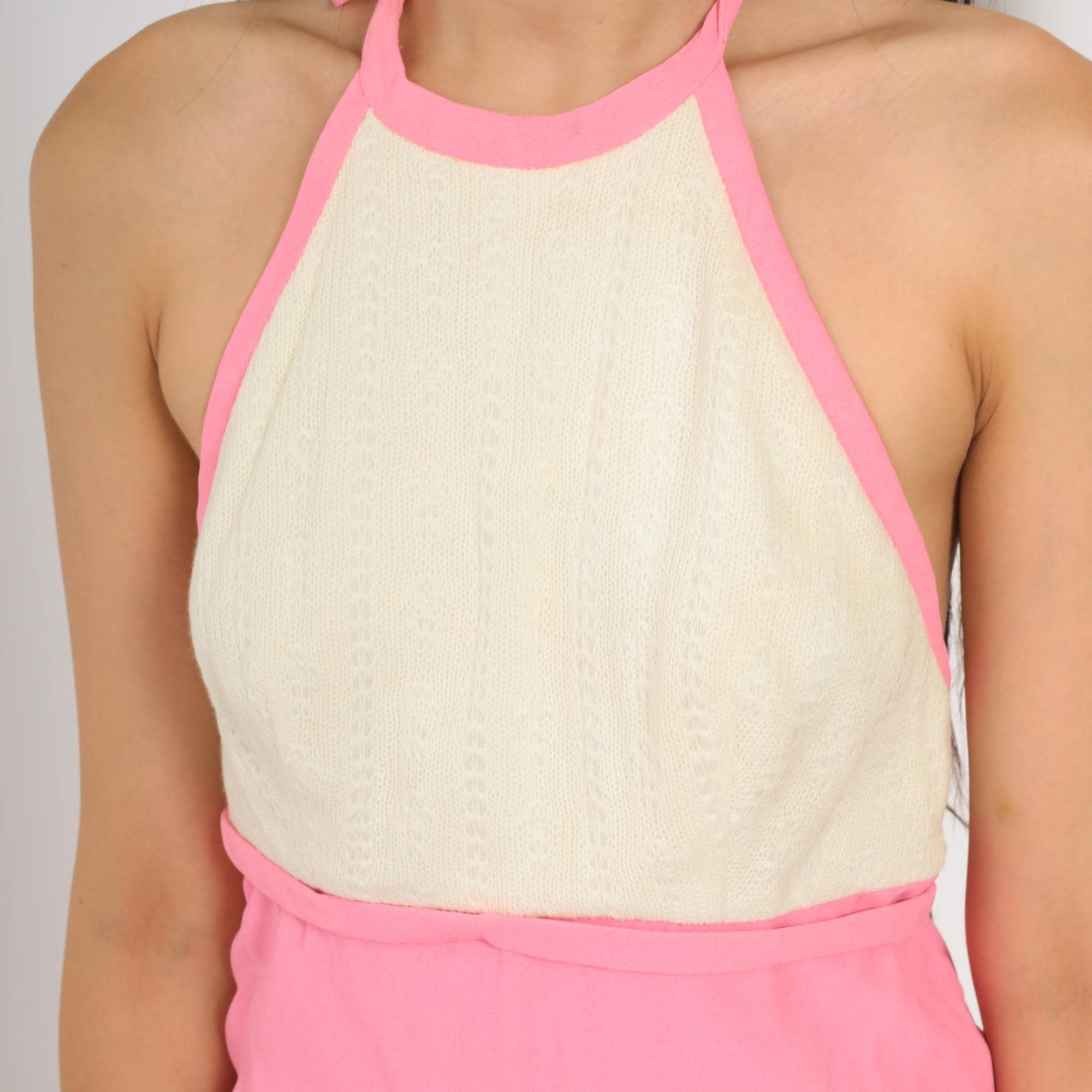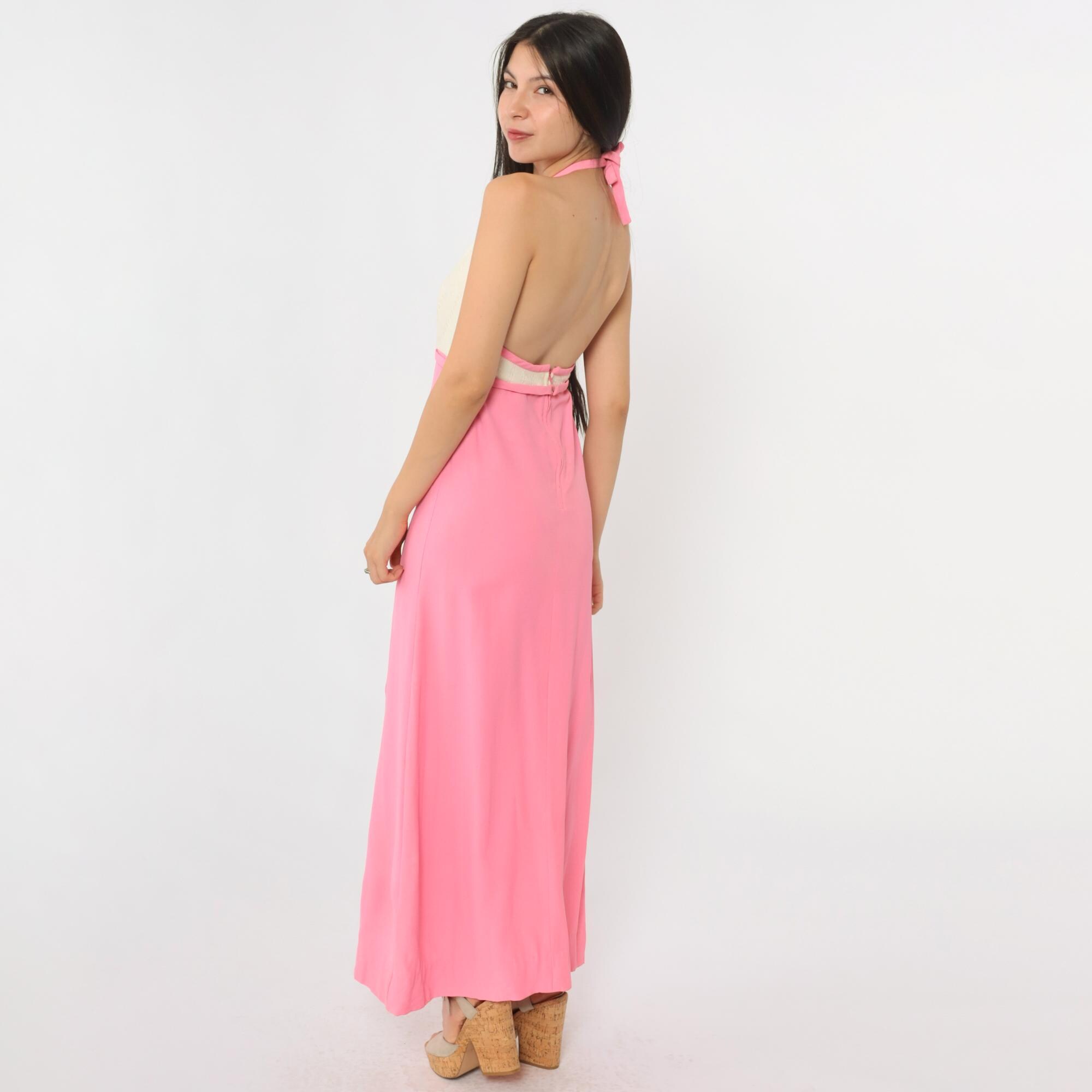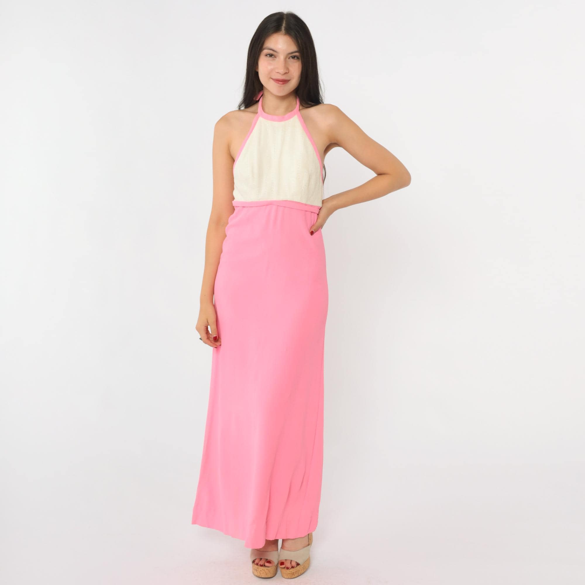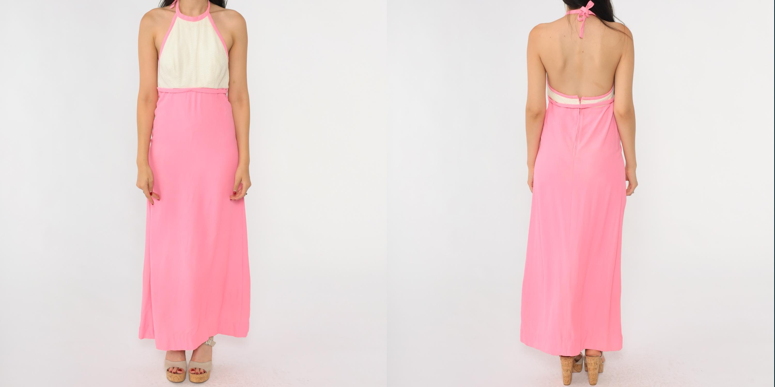 Vintage 70s maxi dress in bright pink featuring a halter neck and a white pointelle knit bodice. It has a high waist, open back, and a rear zipper.