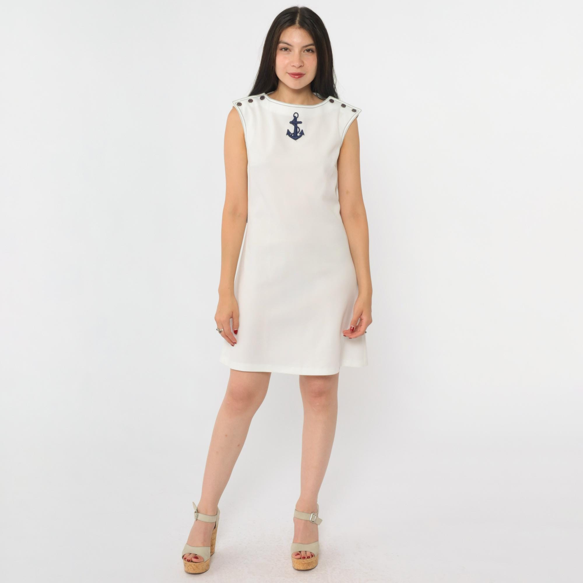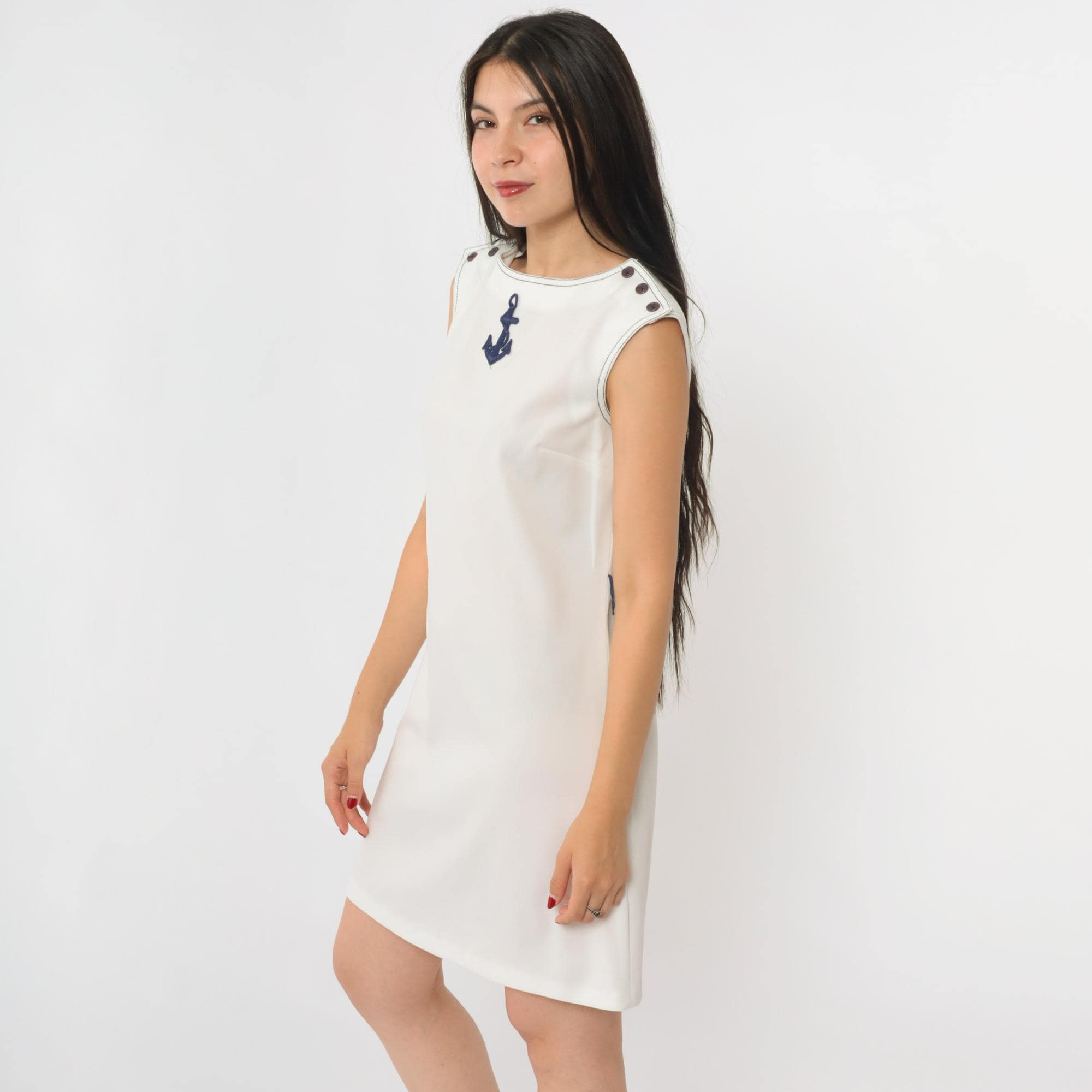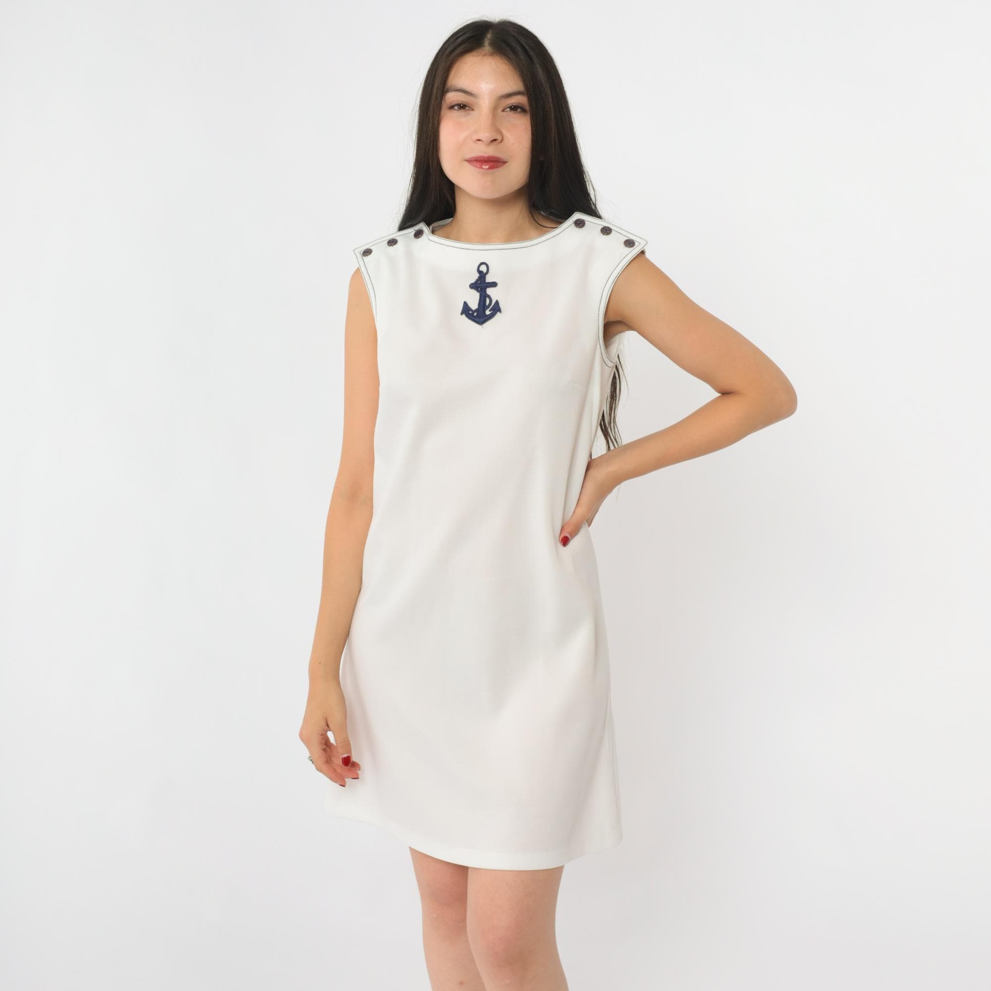 Vintage 70s dress in white with a blue anchor applique on the chest. It has a sleeveless shift cut with buttons on the shoulders. Mini length.