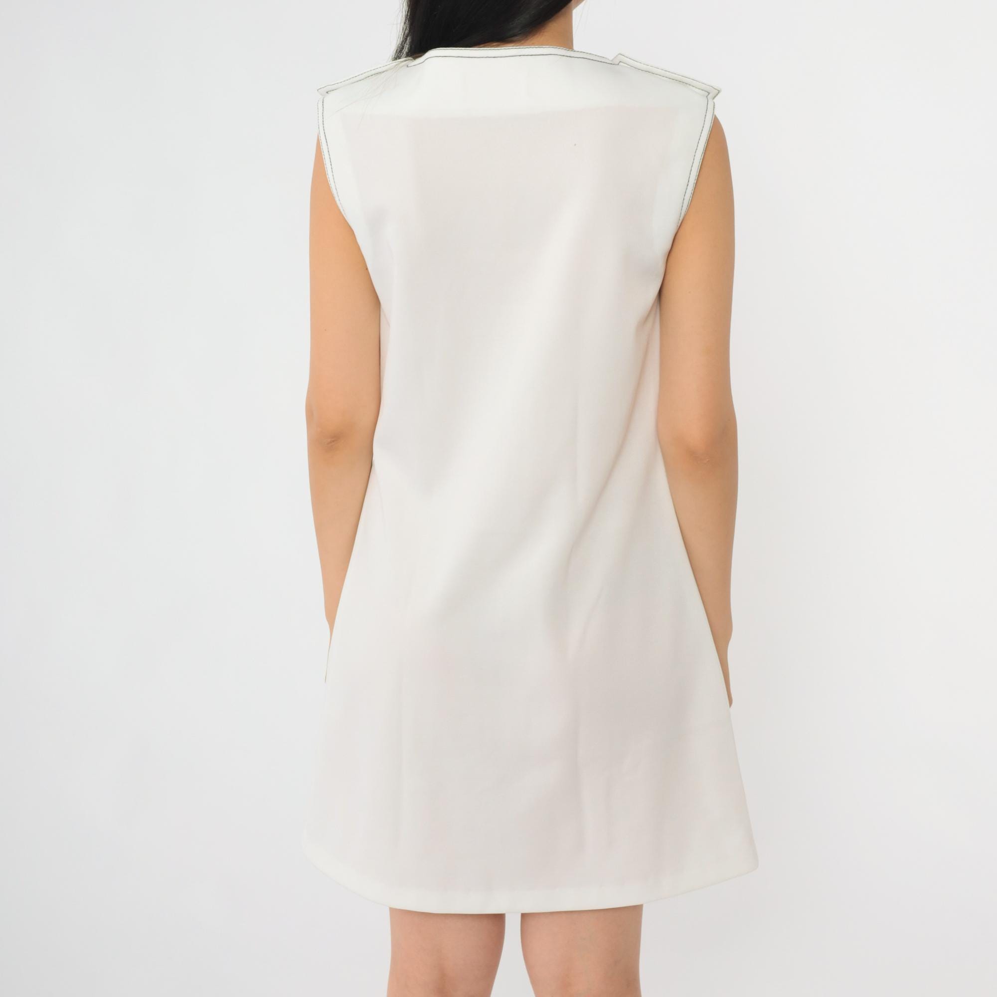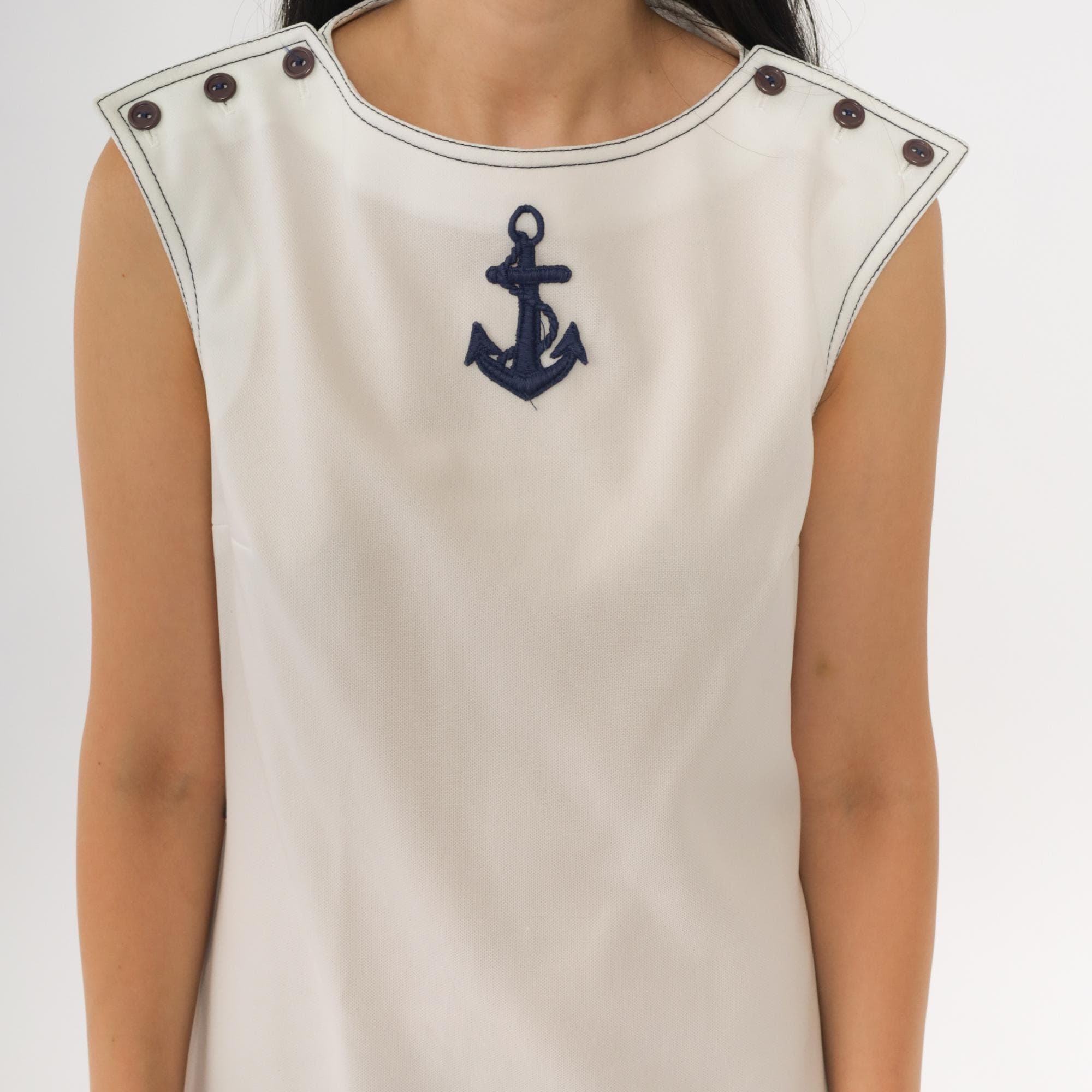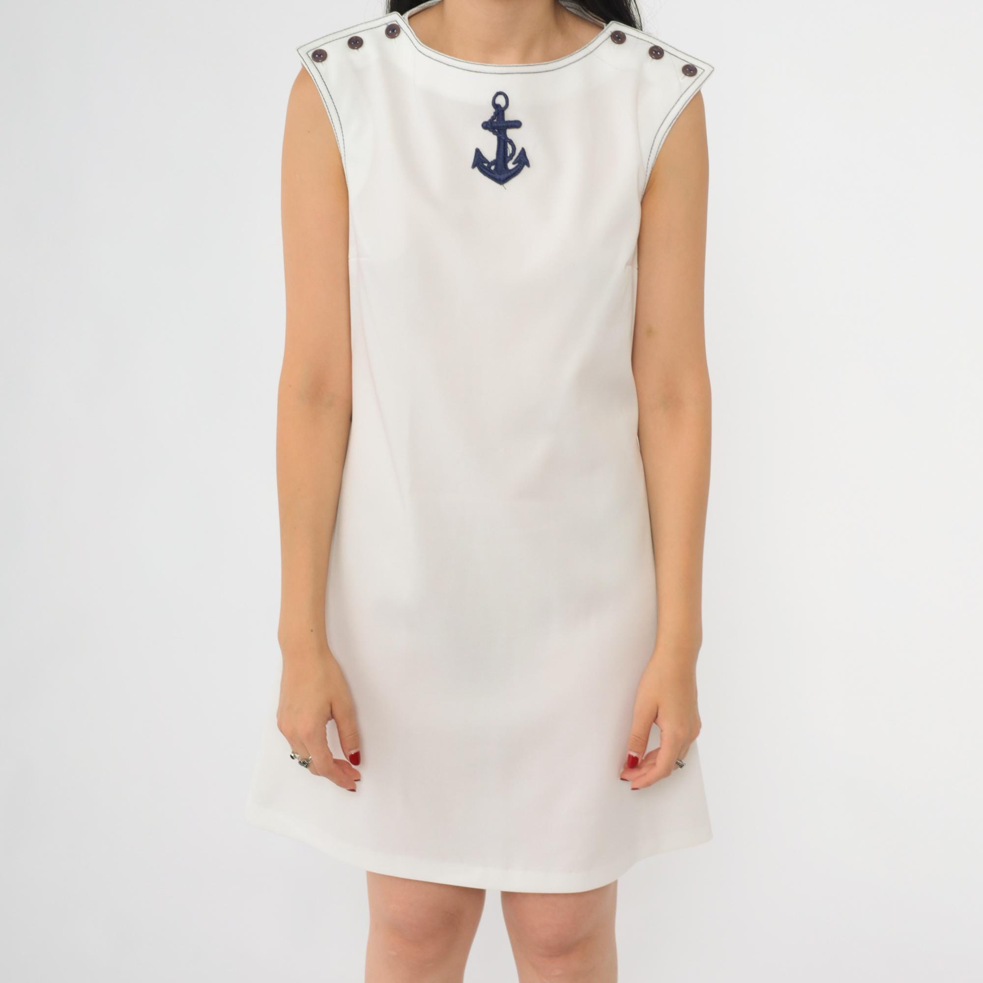 Vintage 70s dress in white with a blue anchor applique on the chest. It has a sleeveless shift cut with buttons on the shoulders. Mini length.
