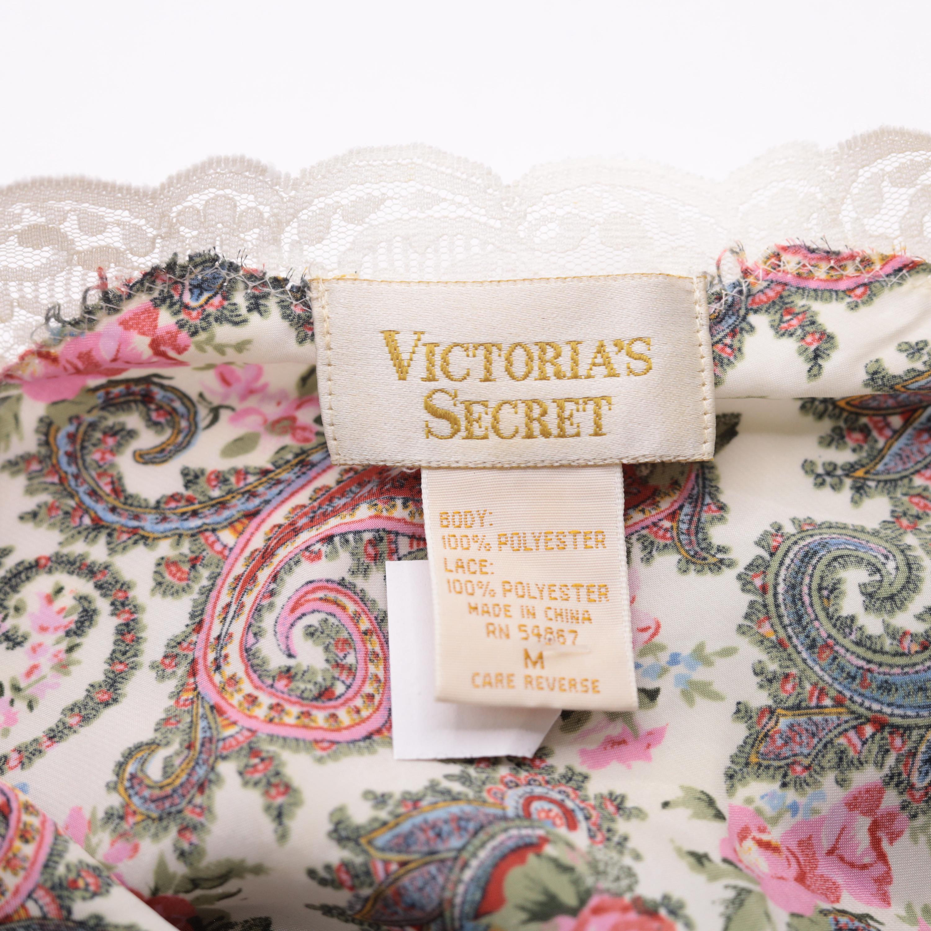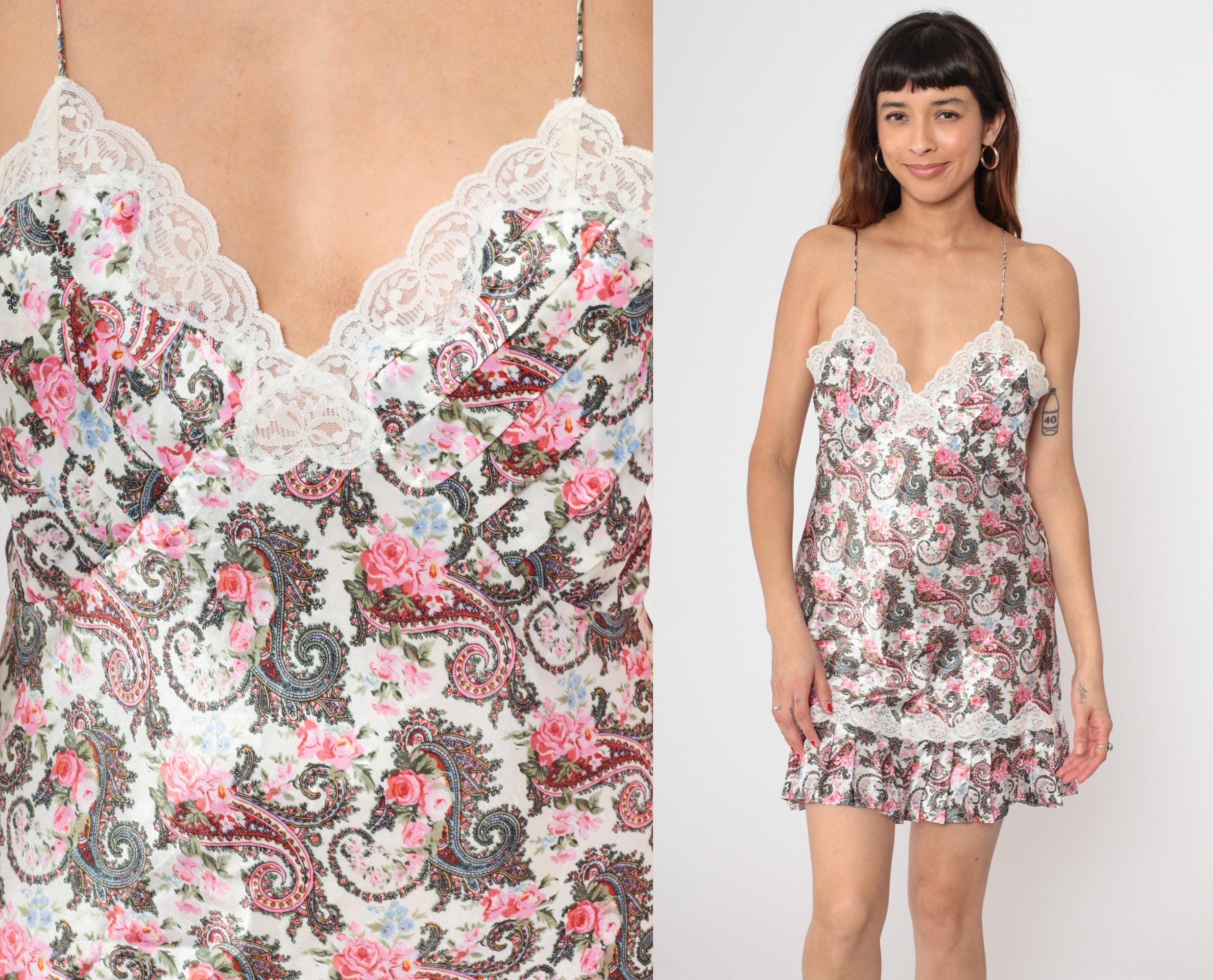 Vintage 90s slip dress by Victoria's Secret in white floral satin with lace trim. It has an empire waist and spaghetti straps. Mini length.