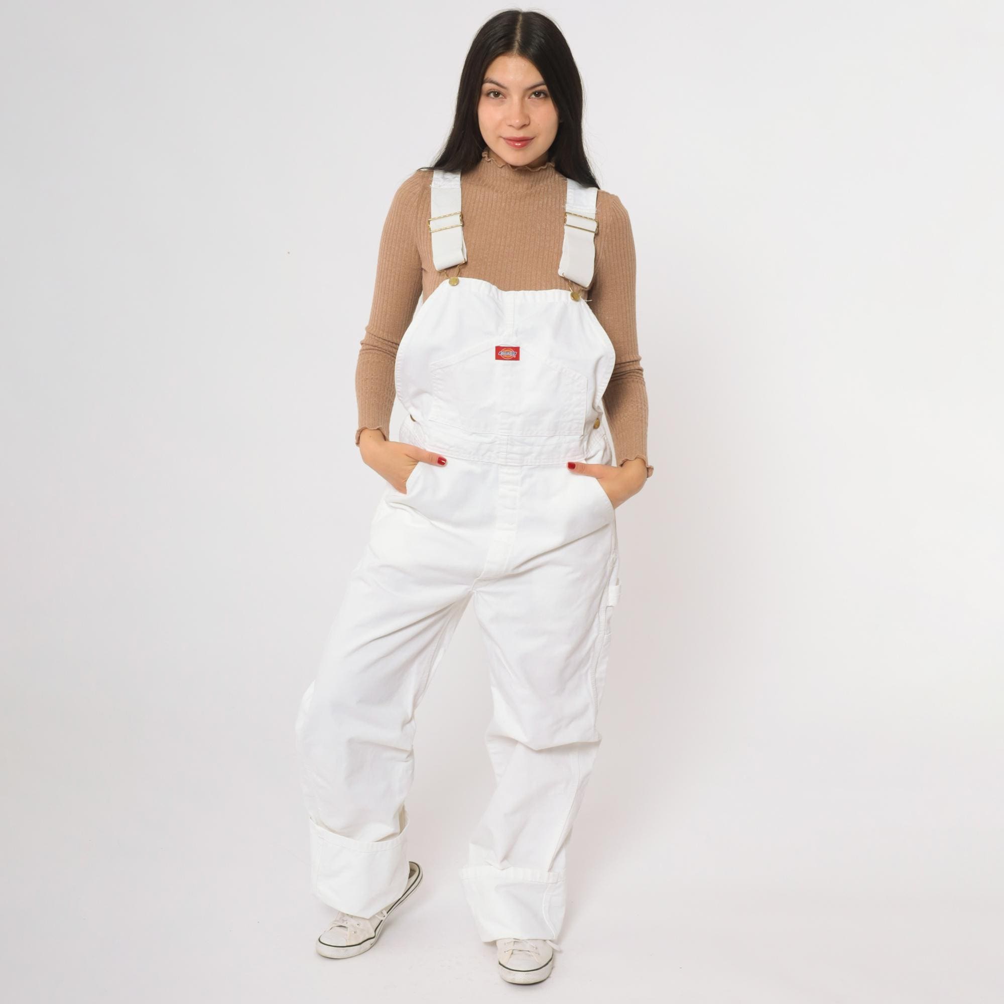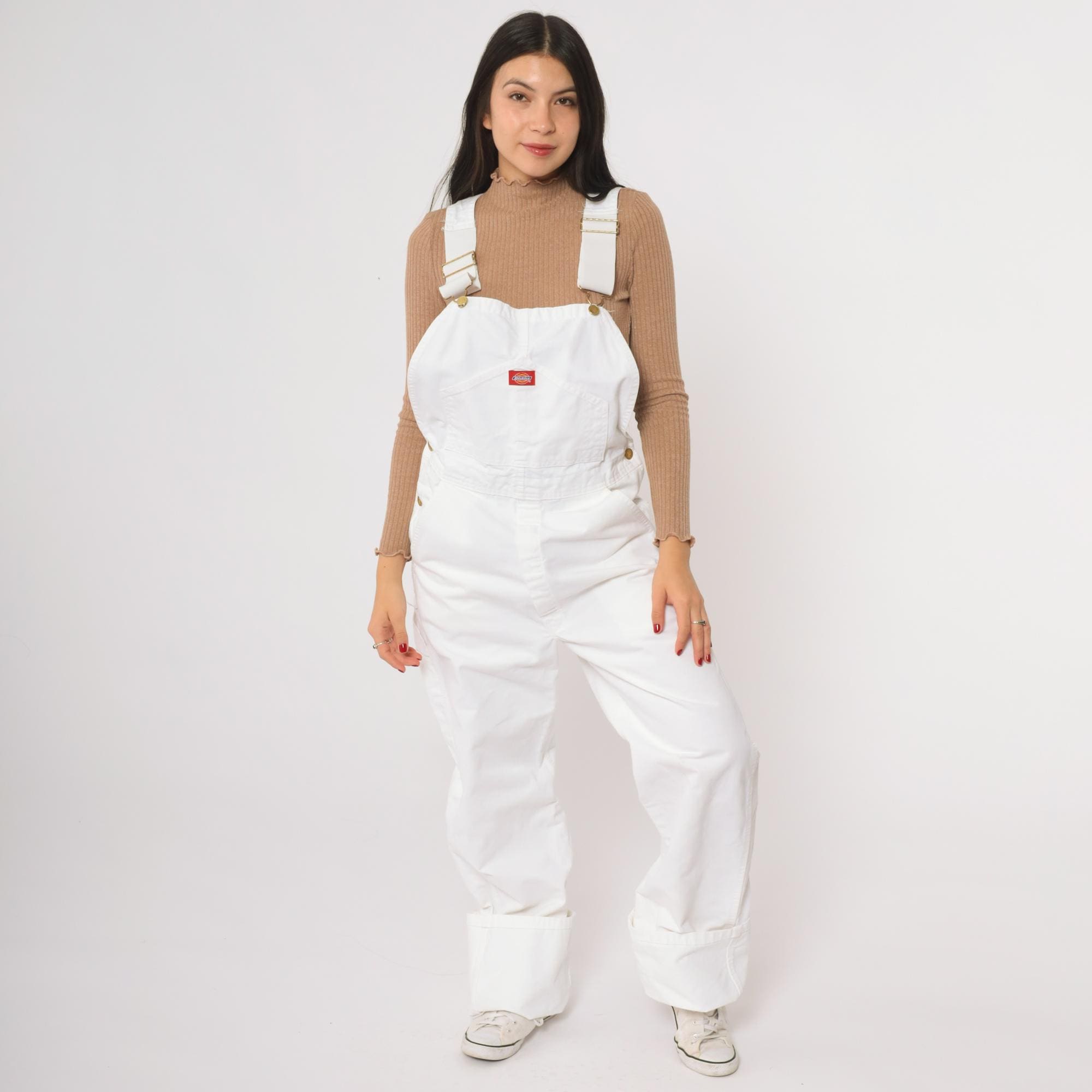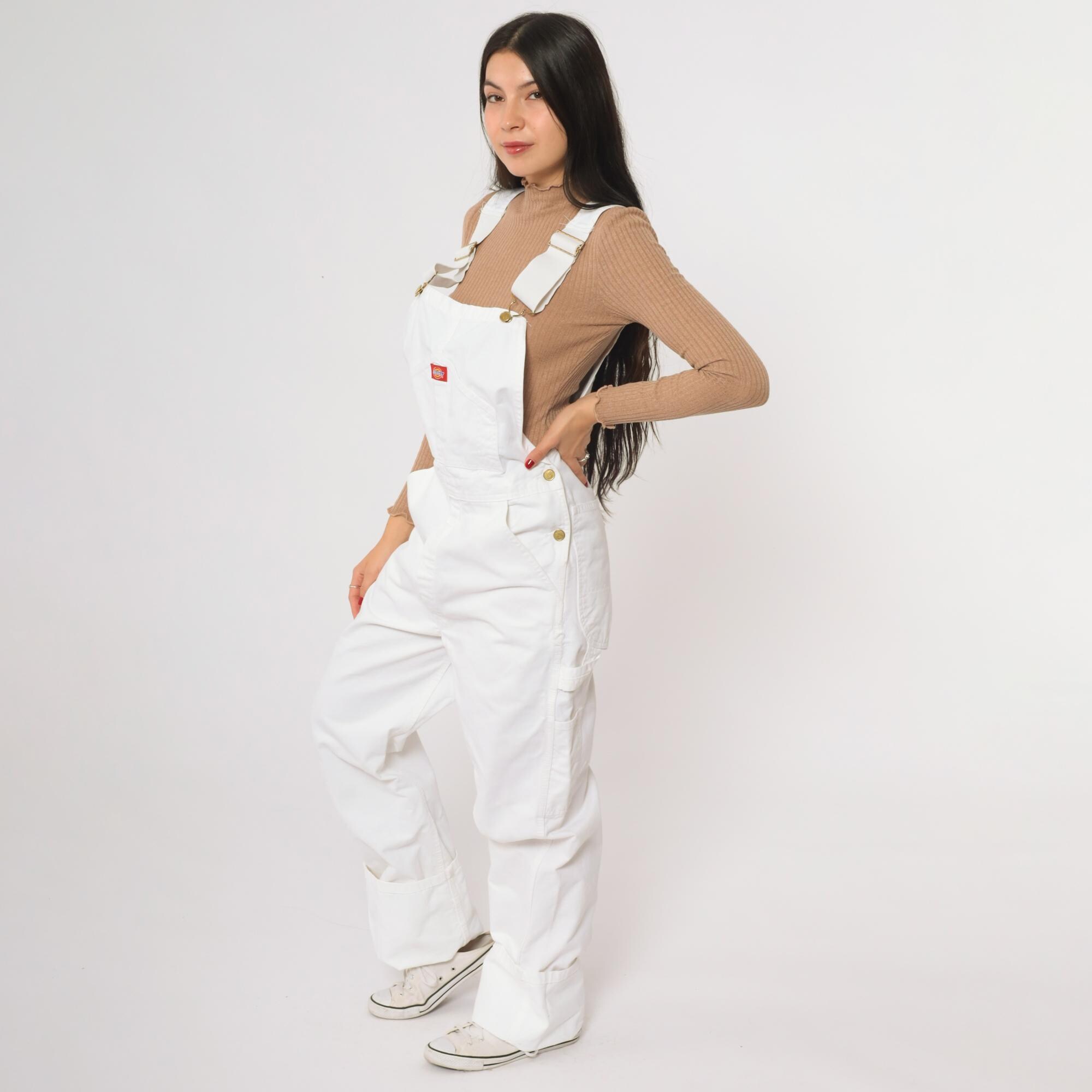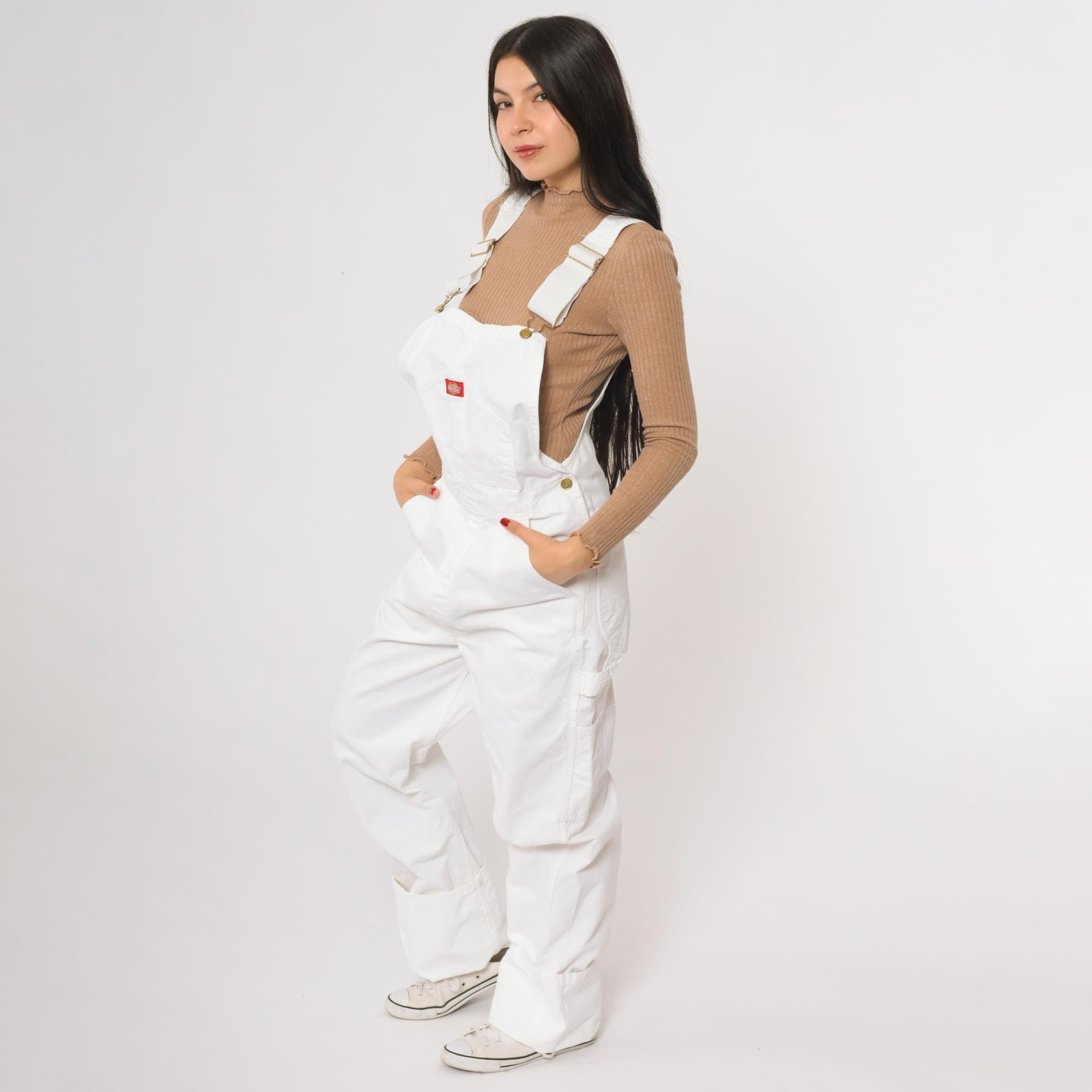Y2K white Dickies overalls featuring baggy carpenter-style fit with adjustable shoulder straps and side utility pockets. Classic workwear construction and Dickies red logo patch on chest.