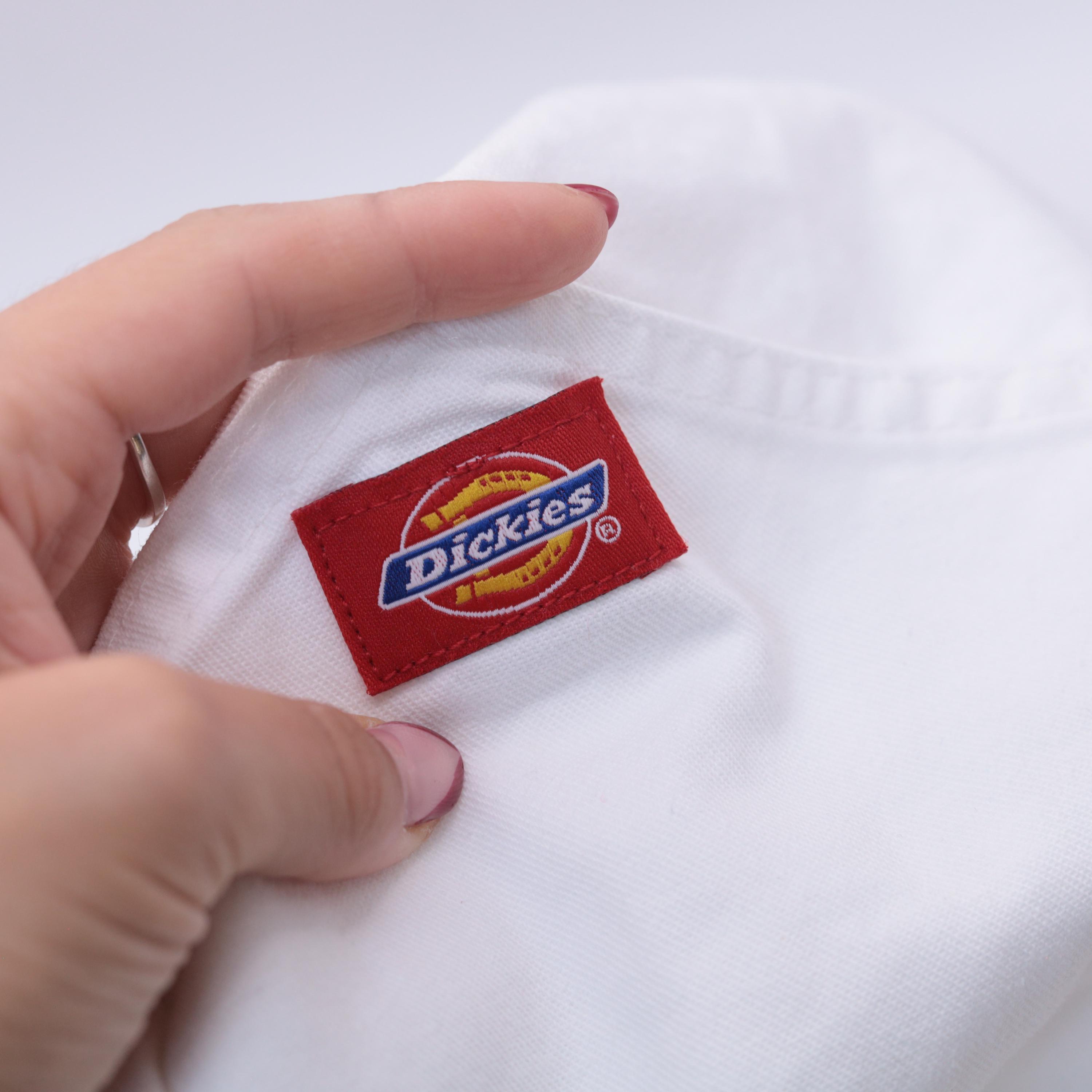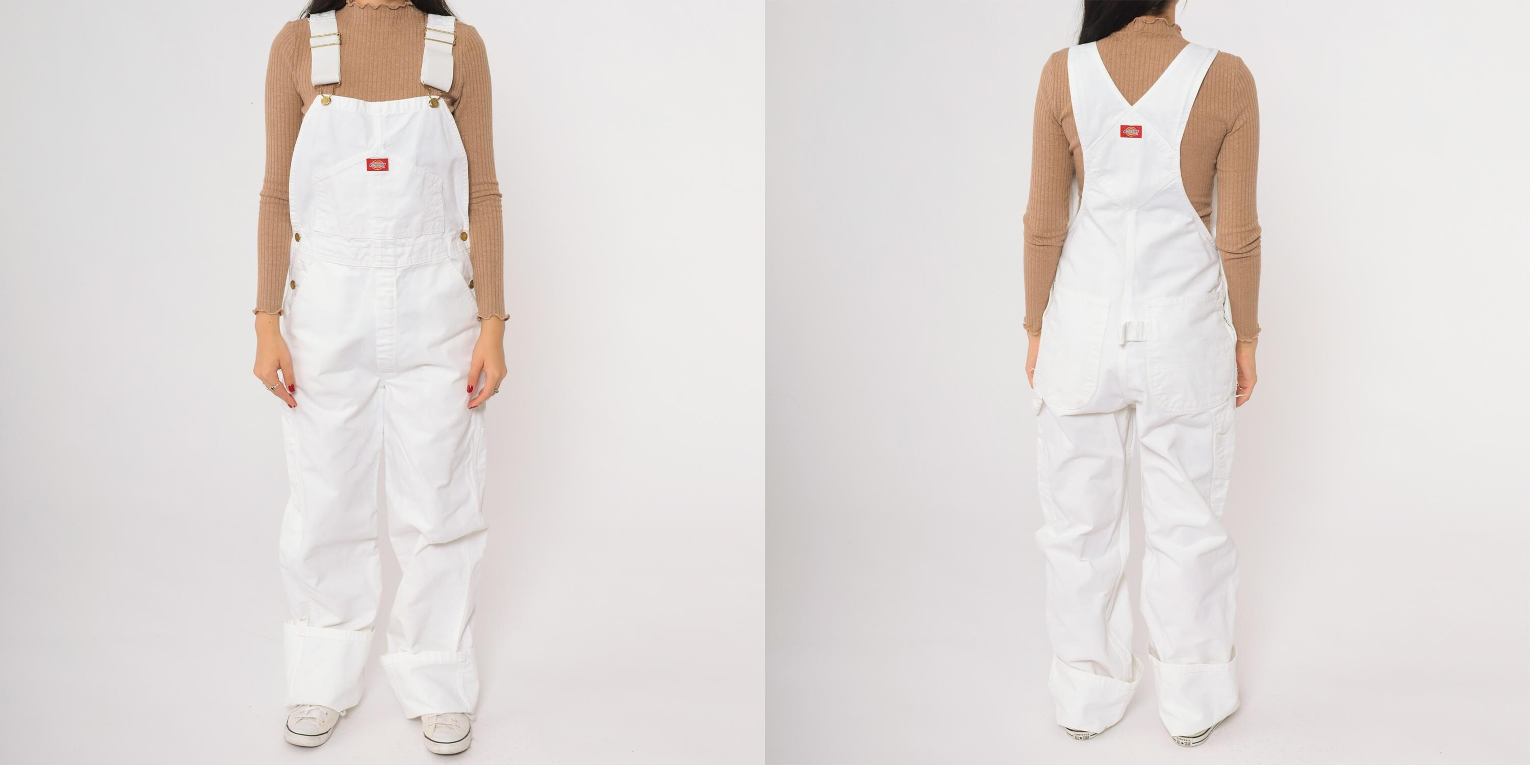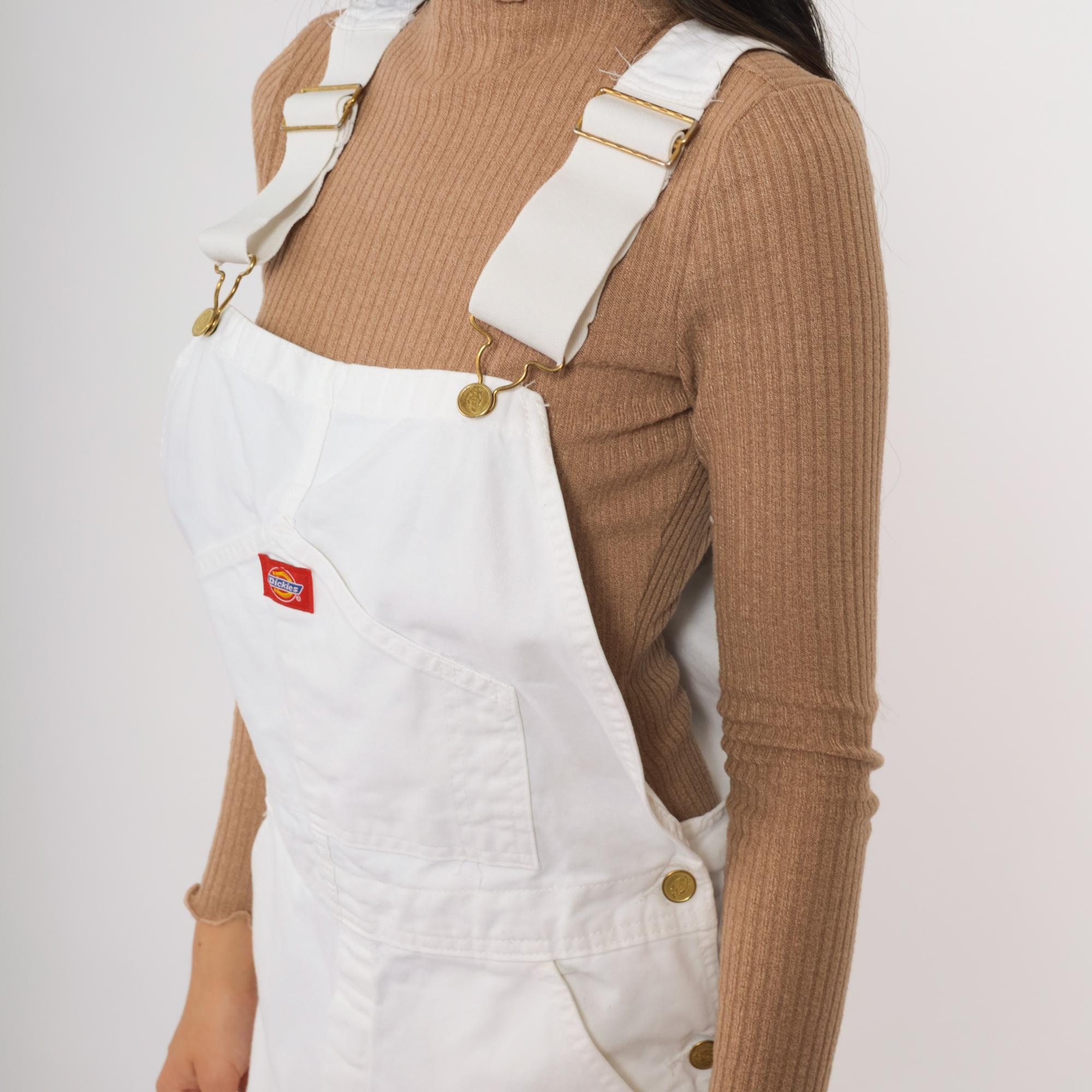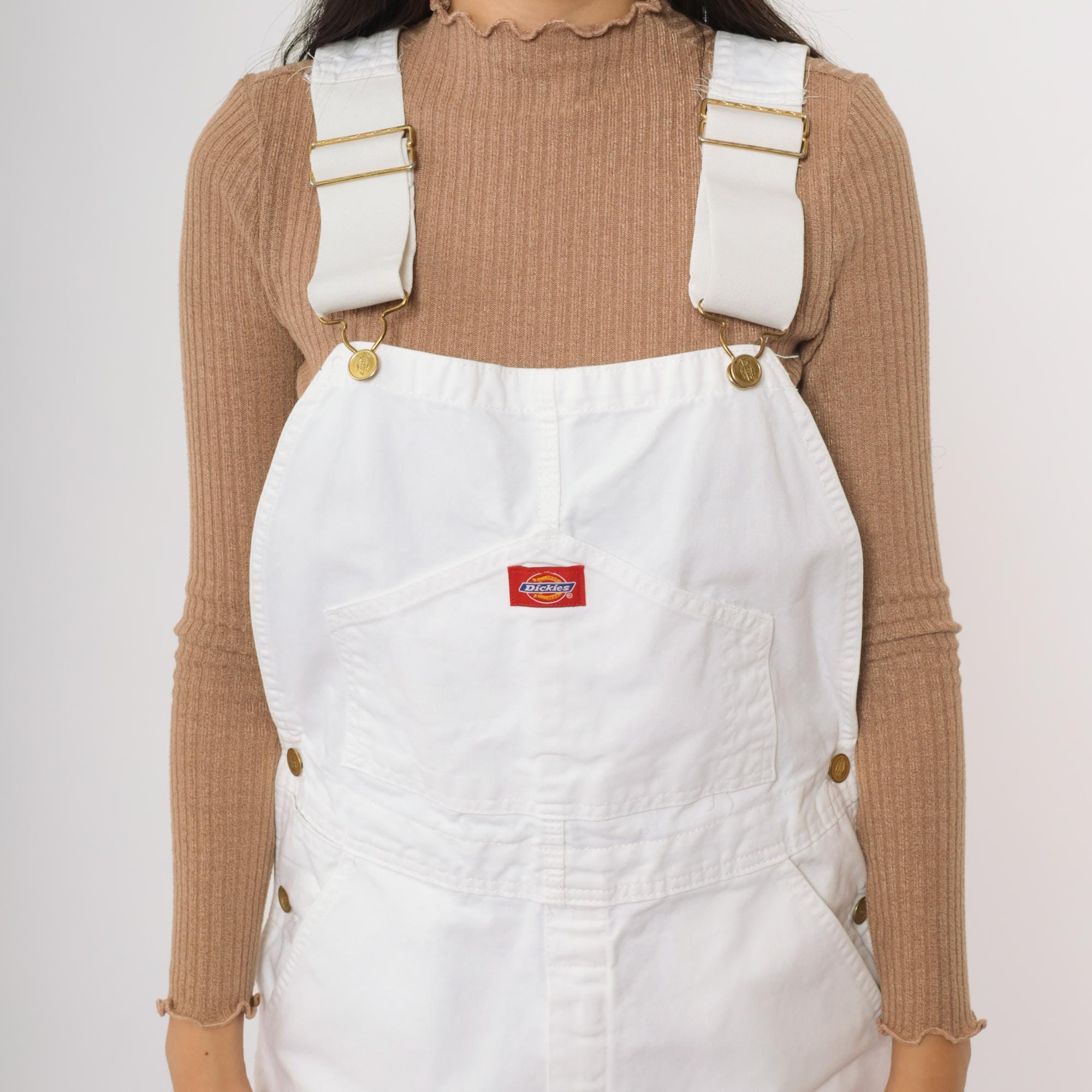 Y2K white Dickies overalls featuring baggy carpenter-style fit with adjustable shoulder straps and side utility pockets. Classic workwear construction and Dickies red logo patch on chest.