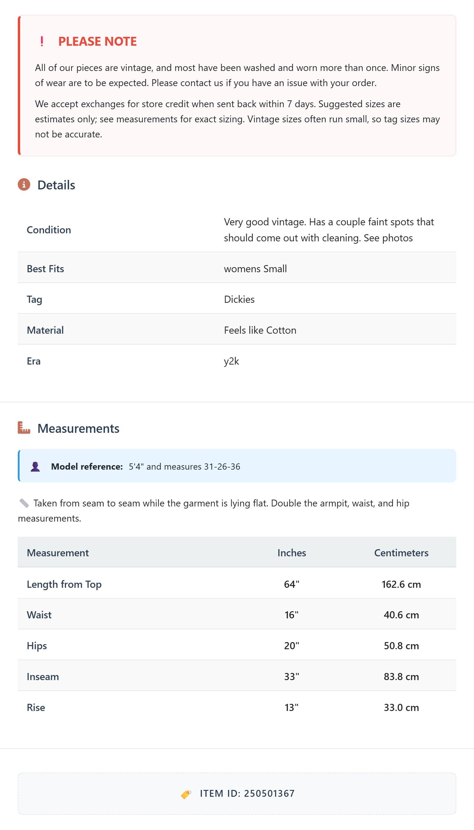 All of our pieces are vintage, and most have been washed and worn more than once. Minor signs of wear are to be expected. Please contact us if you have an issue with your order. We accept exchanges for store credit when sent back within 7 days.