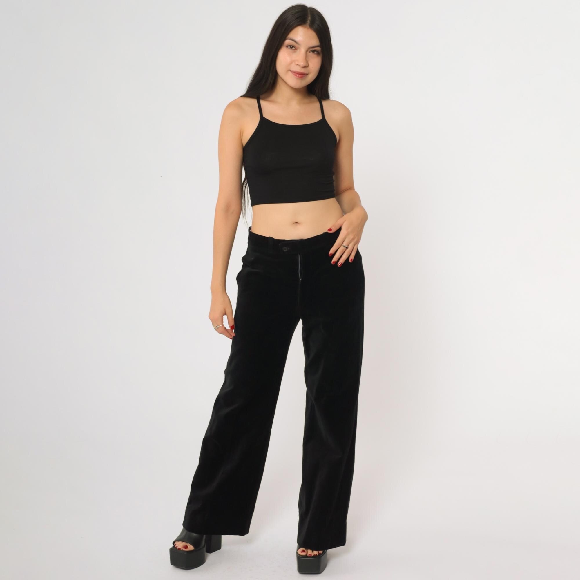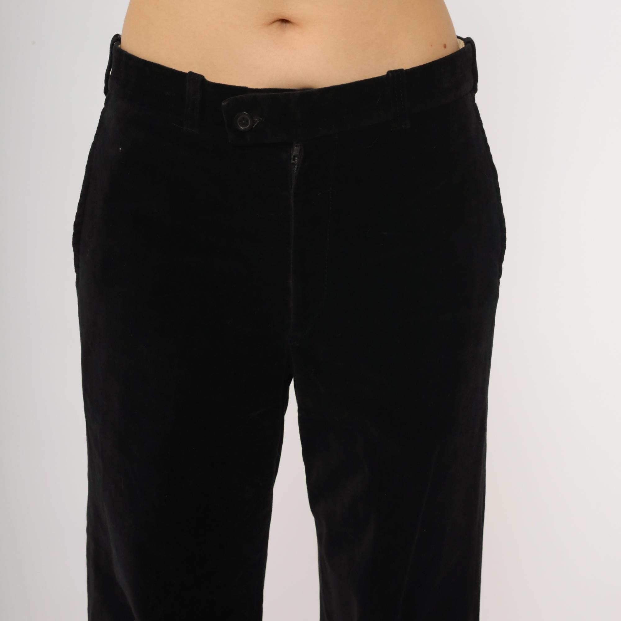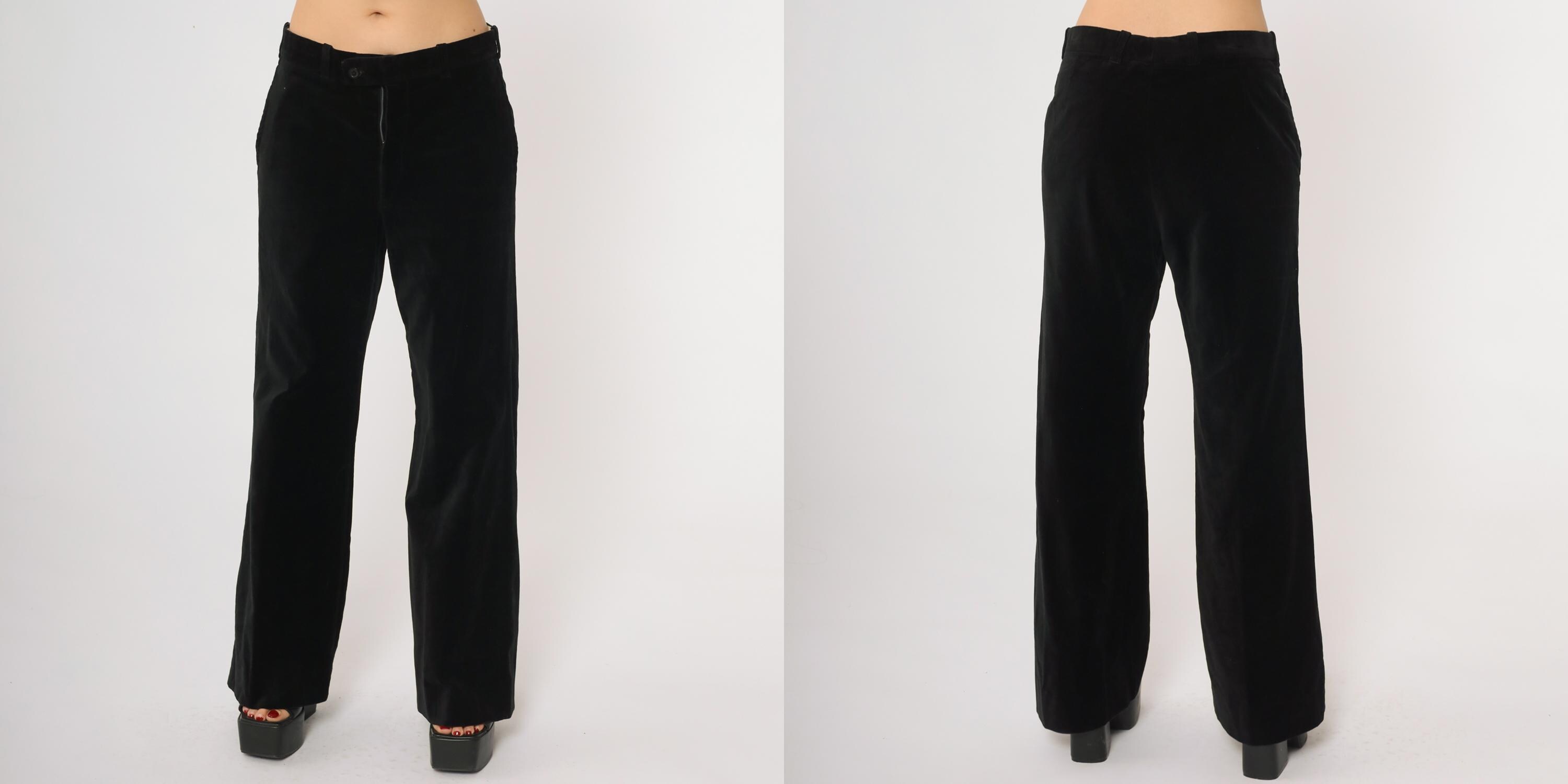 80s black wide leg pants featuring high waisted design with relaxed straight leg silhouette. Cotton polyester blend material with classic tailored construction.