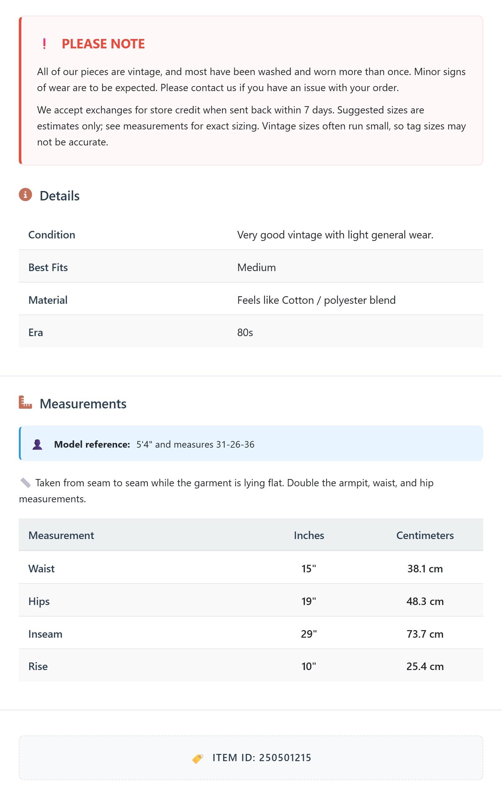 Vintage denim was usually made without any stretch, unlike modern jeans. Check the measurements to ensure proper fit, and remember to give yourself a little wiggle room in the waist and hips, depending on your preferred fit.