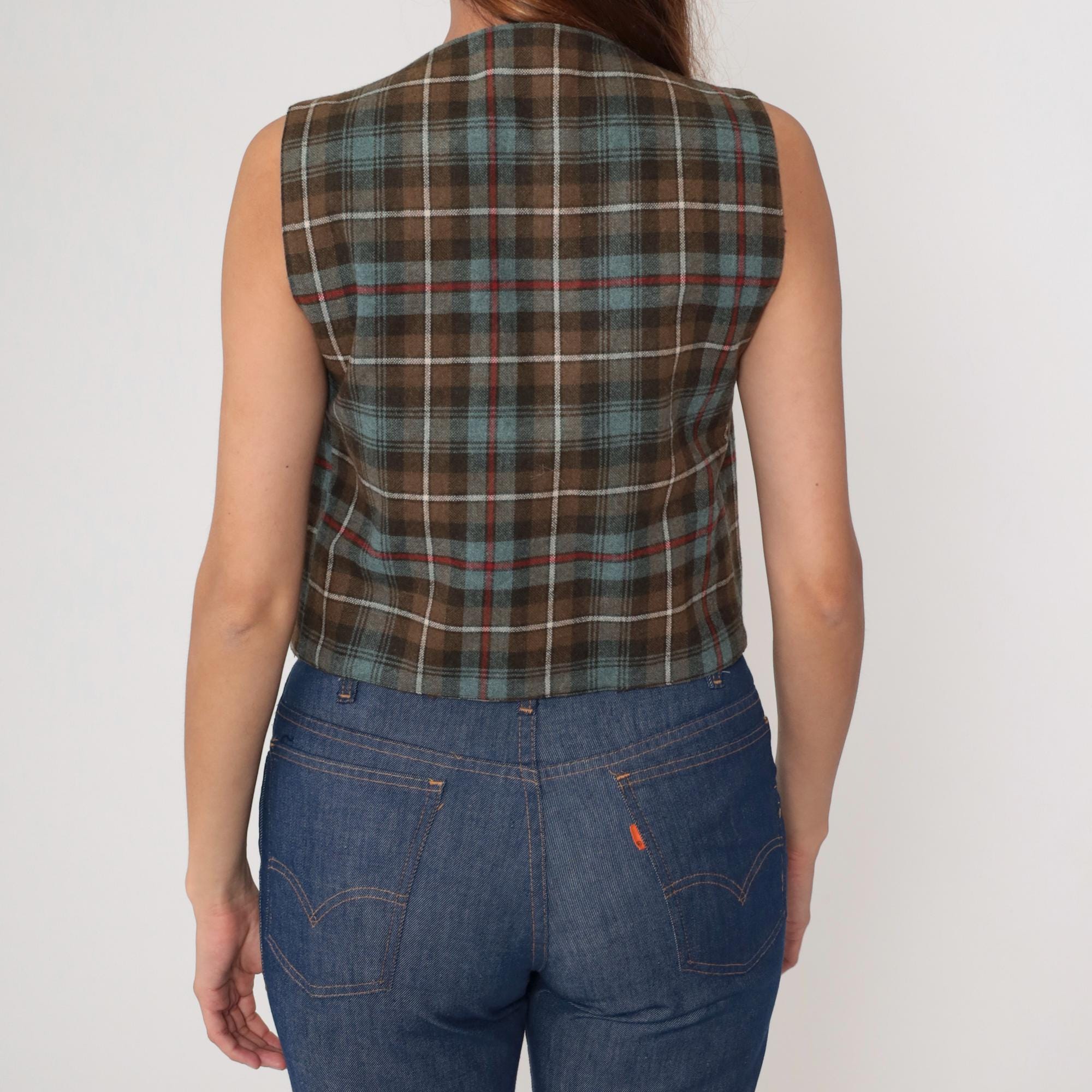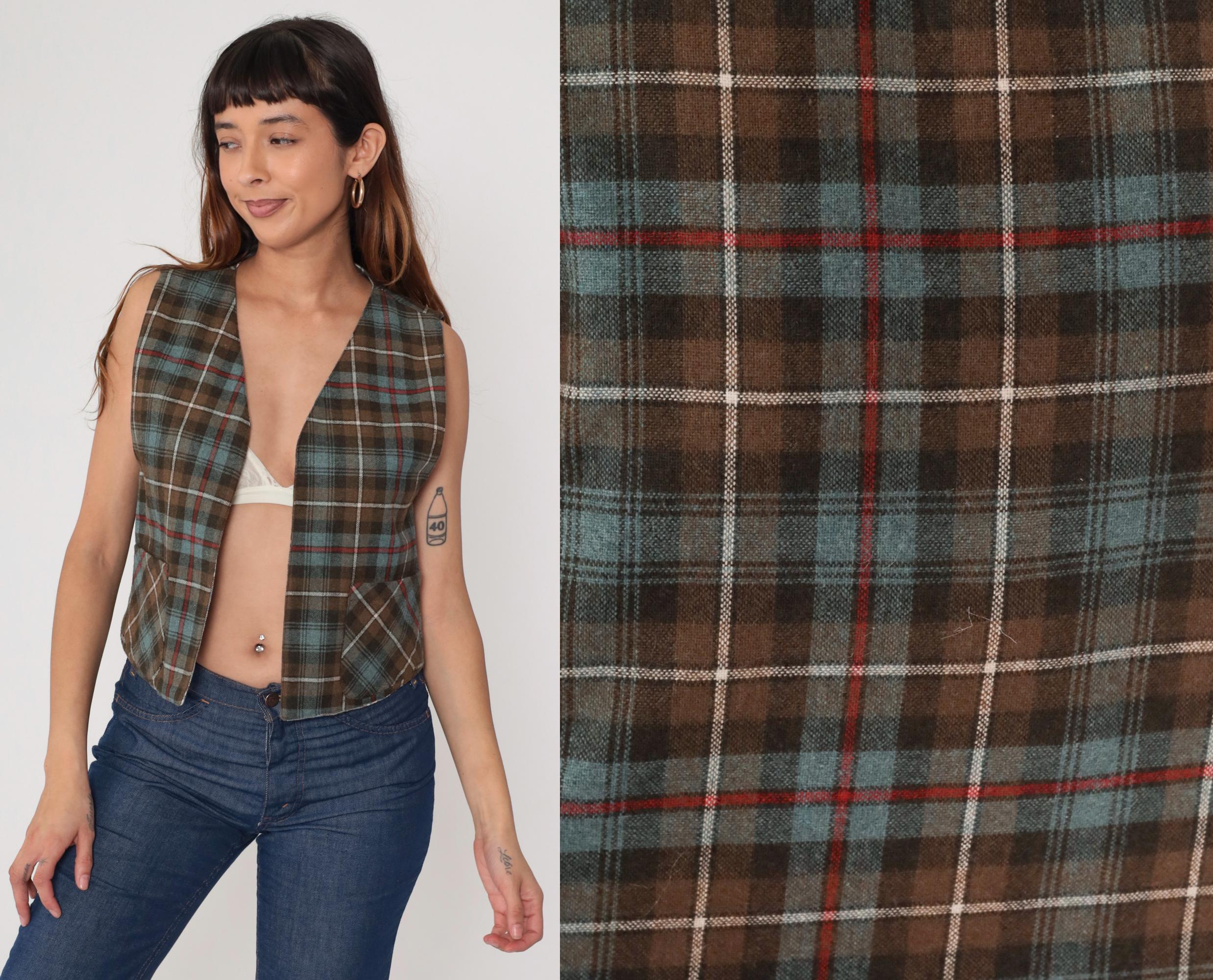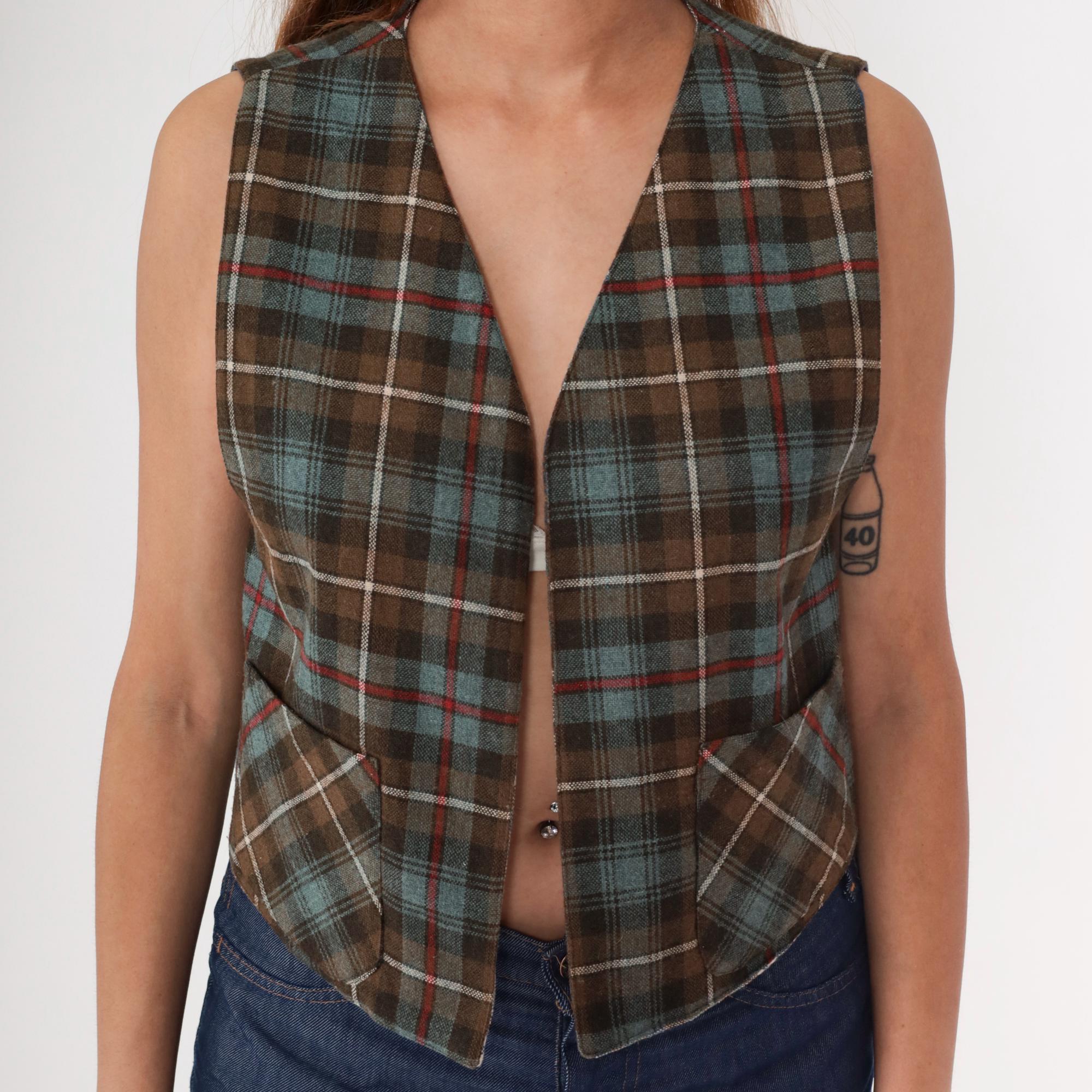 1970s reversible plaid vest featuring brown, blue, and cream tartan pattern on both sides. Classic sleeveless waistcoat design with open front closure and deep V-neckline. Two front patch pockets with diagonal design detail.