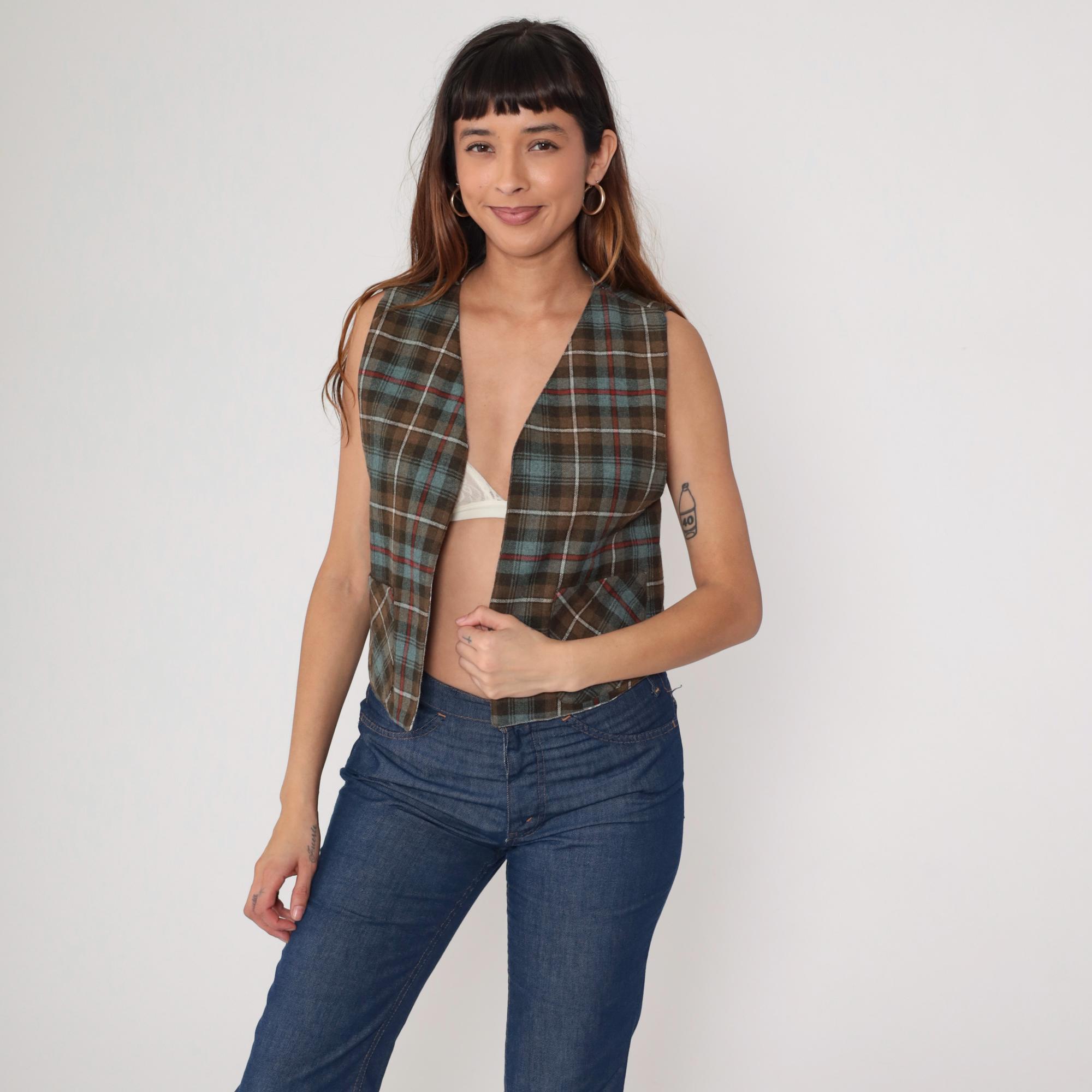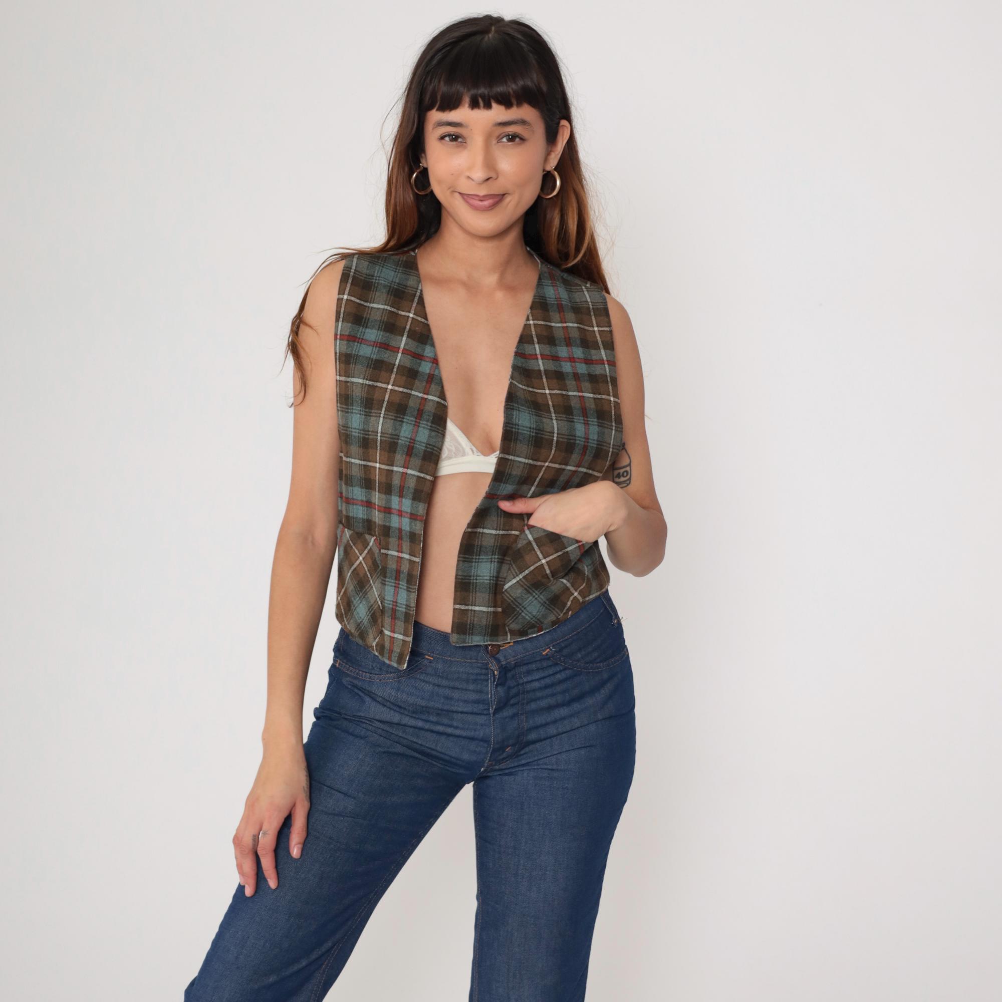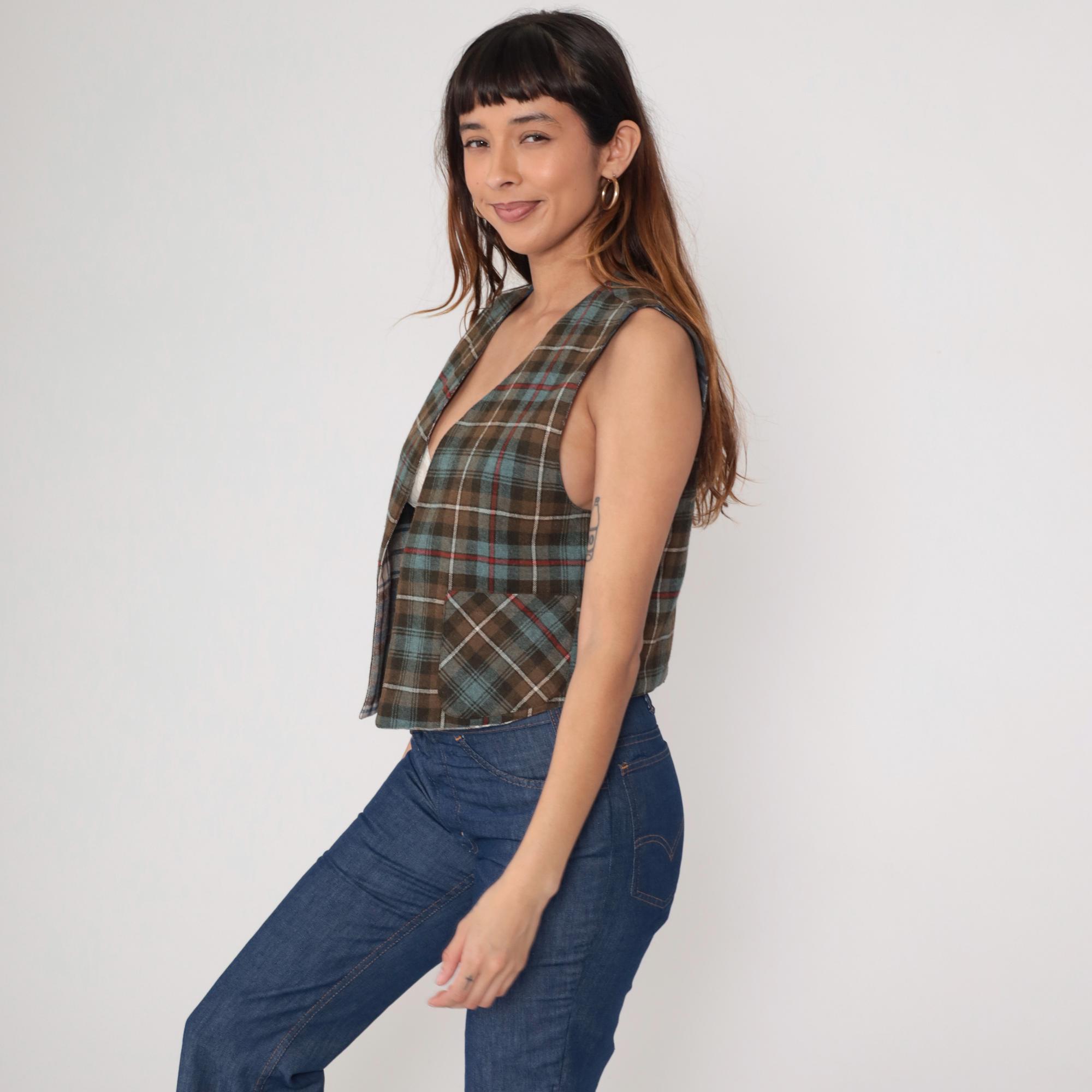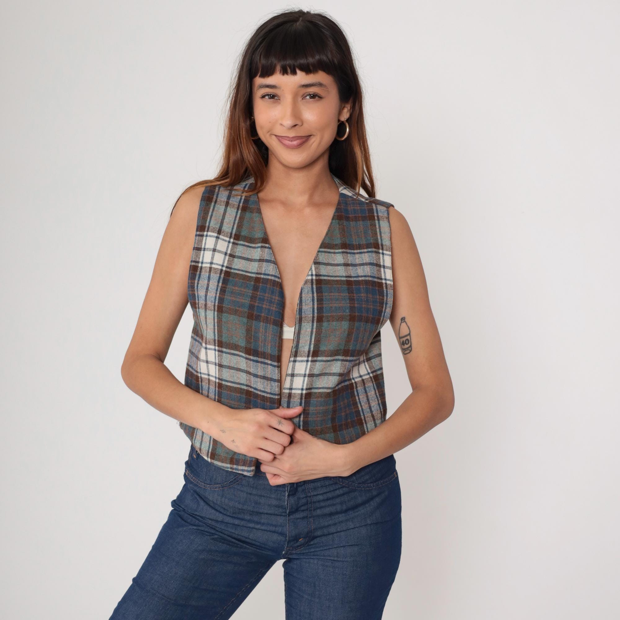 1970s reversible plaid vest featuring brown, blue, and cream tartan pattern on both sides. Classic sleeveless waistcoat design with open front closure and deep V-neckline. Two front patch pockets with diagonal design detail.