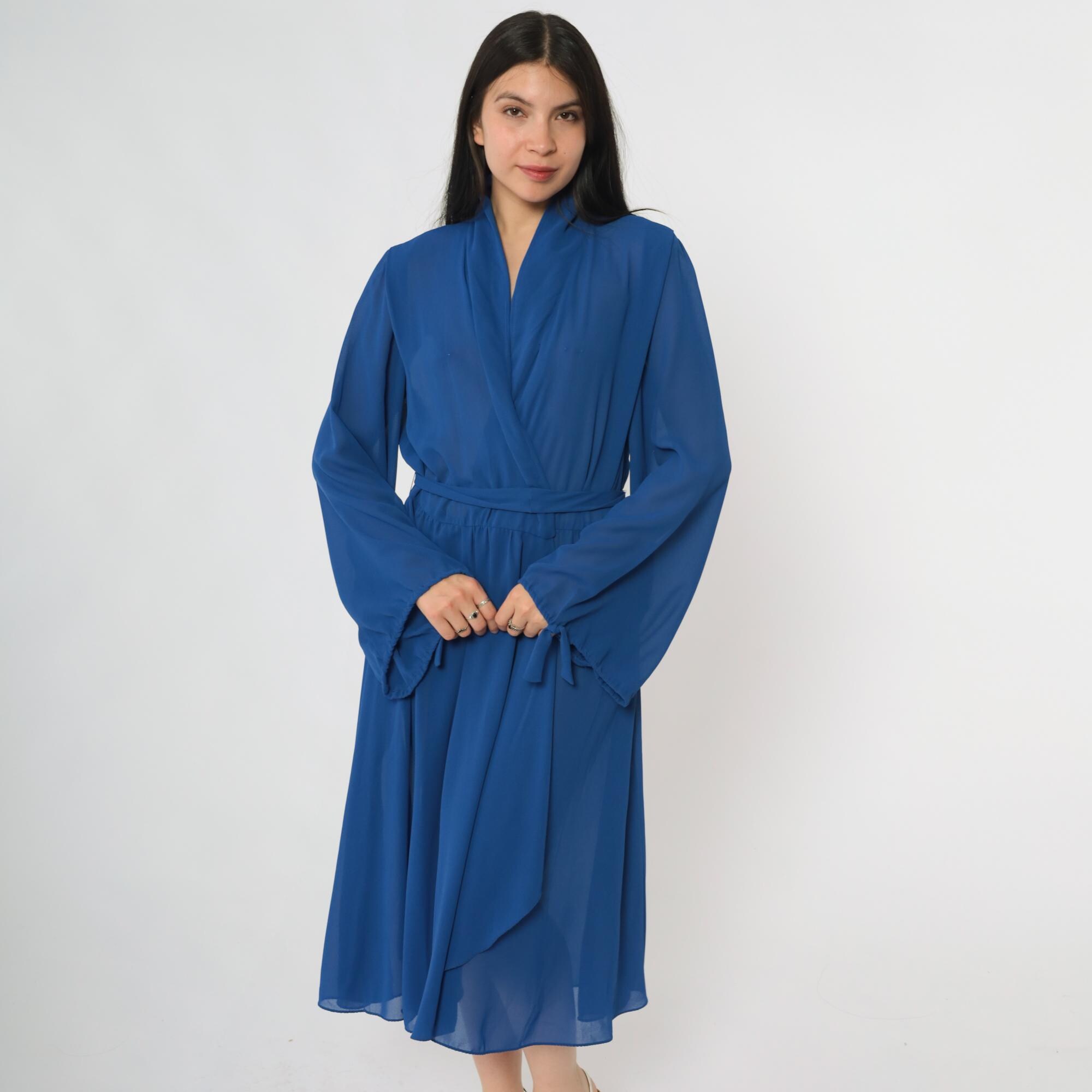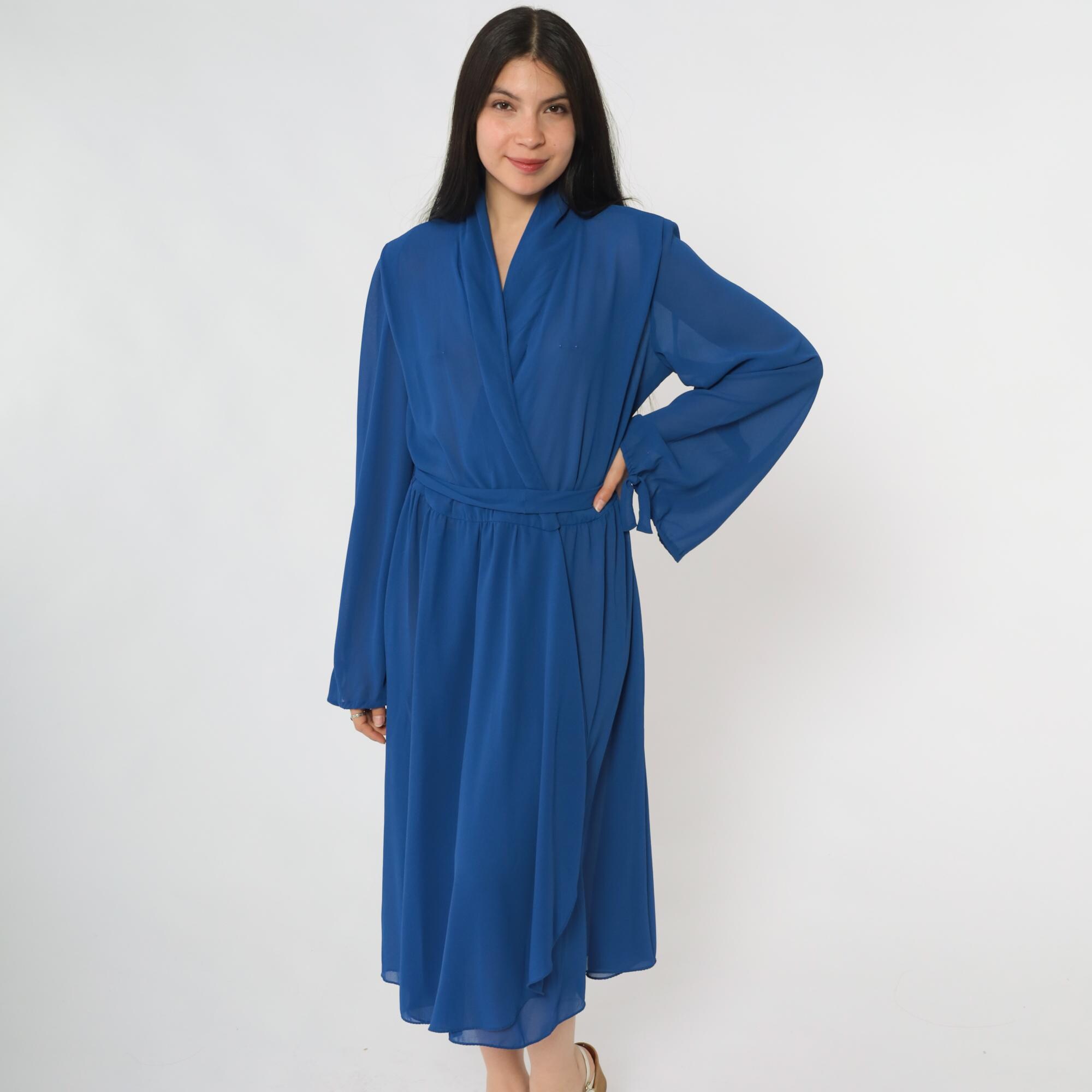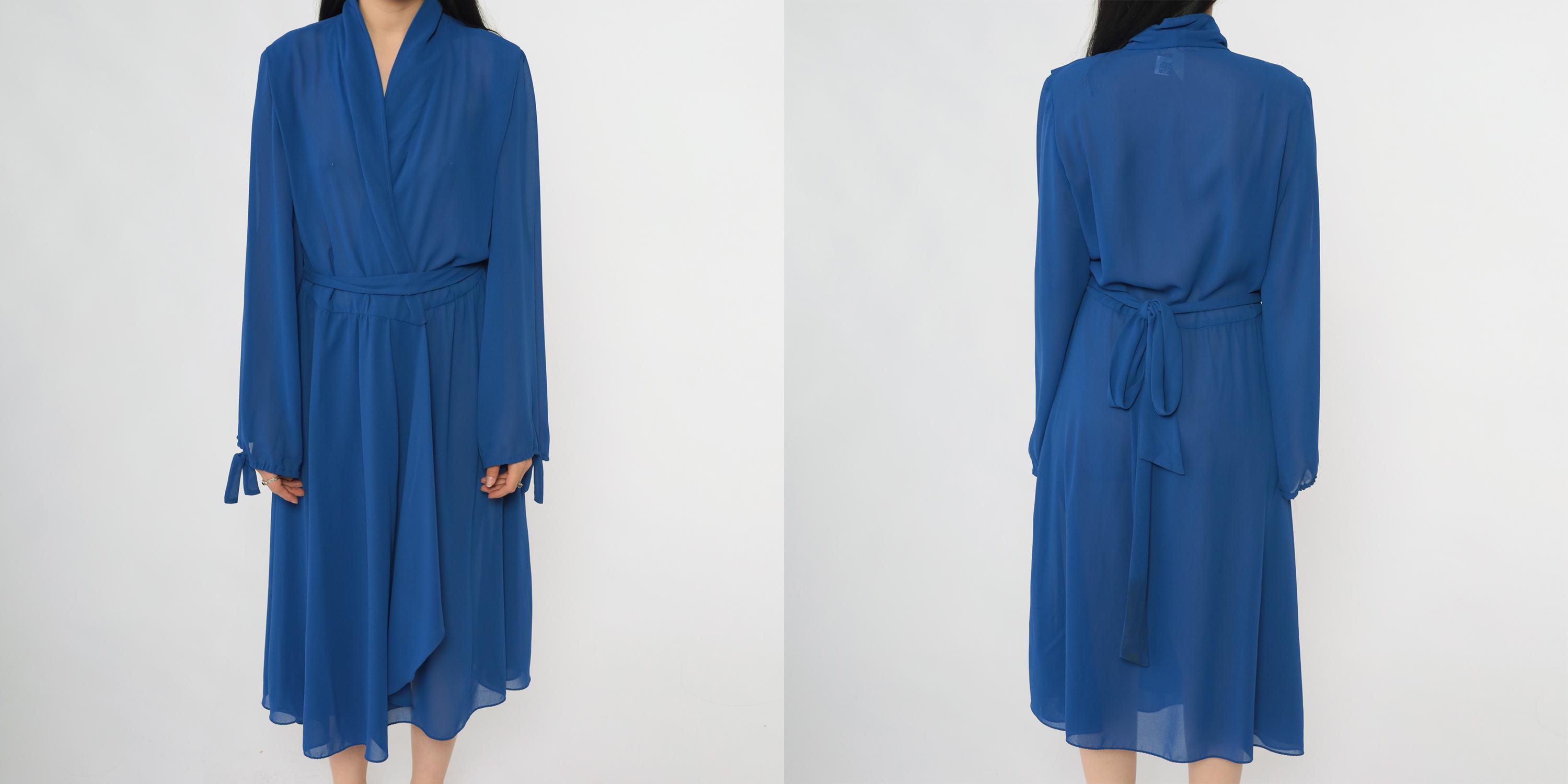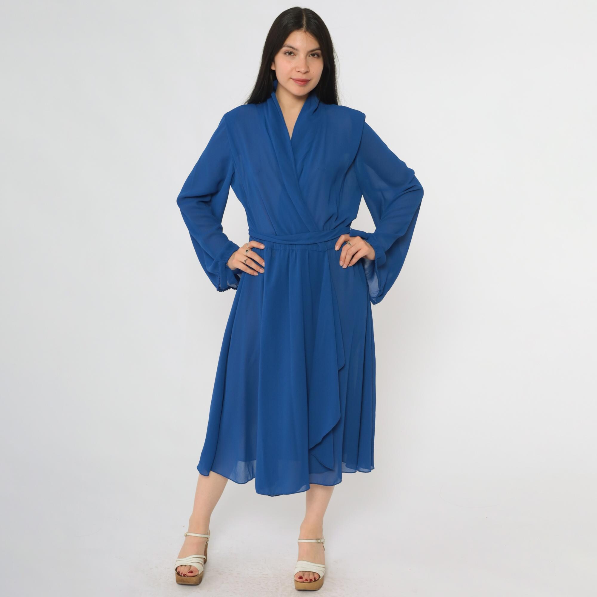 80s royal blue wrap dress from Miss Elliette. Features long sleeves with tie cuffs, deep wrap front with tie waist belt, and midi length. Classic power dressing silhouette with flowing skirt and professional styling.
