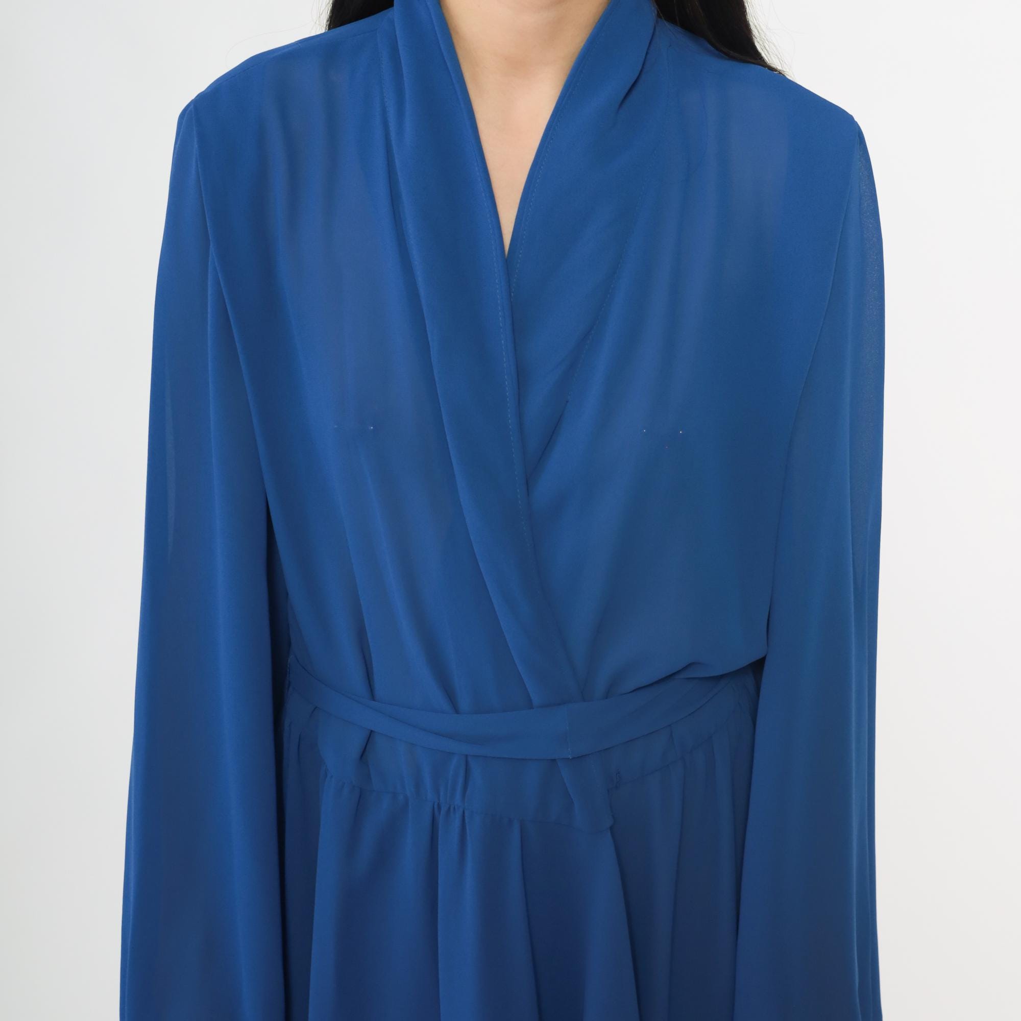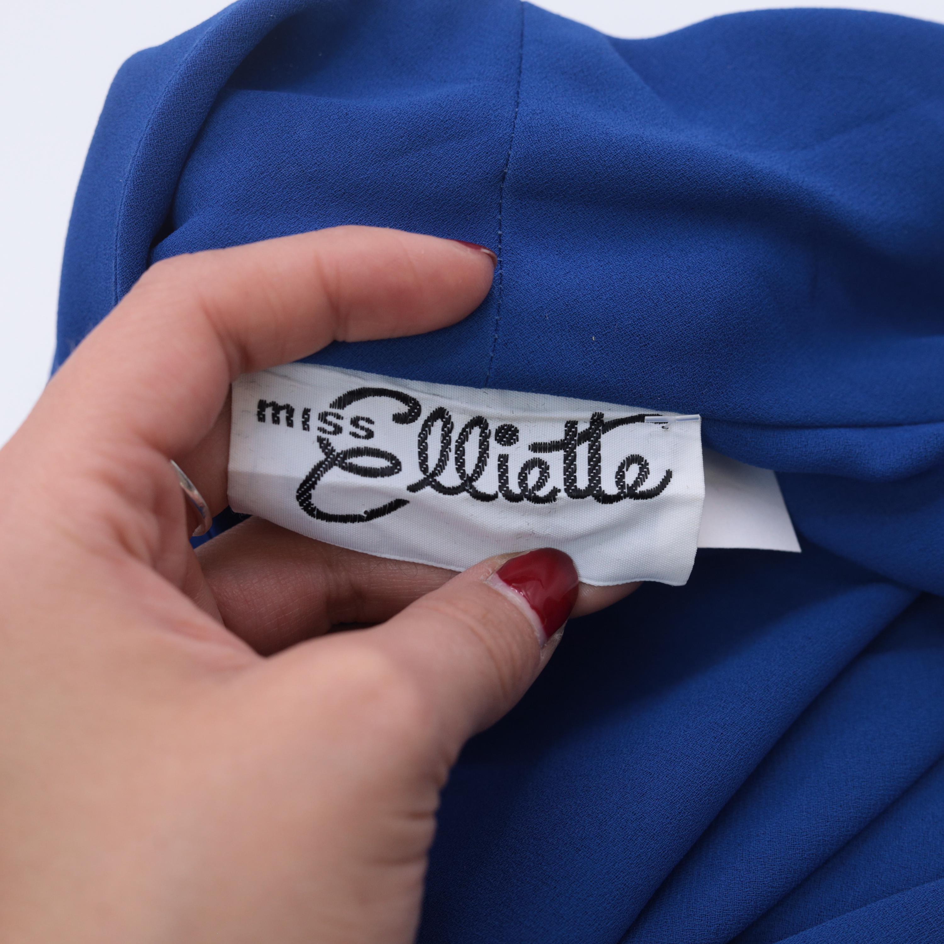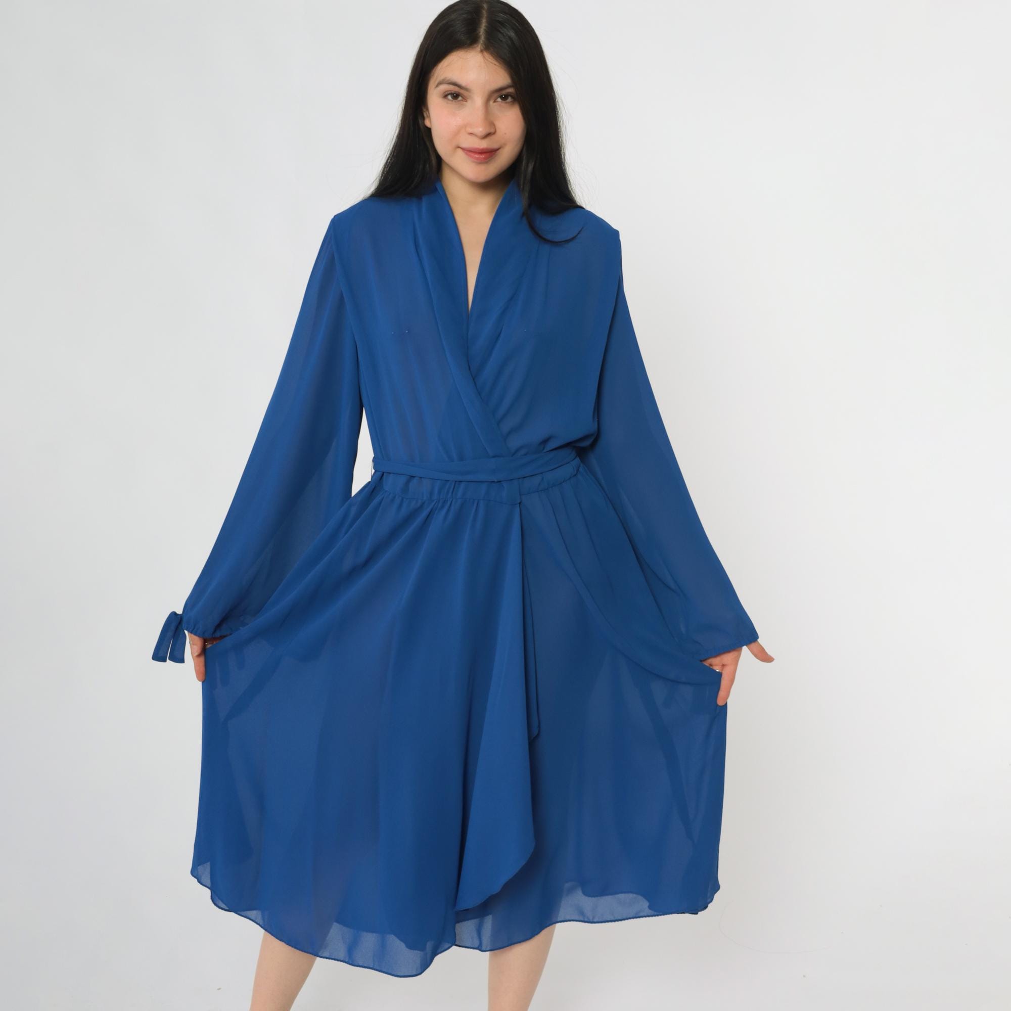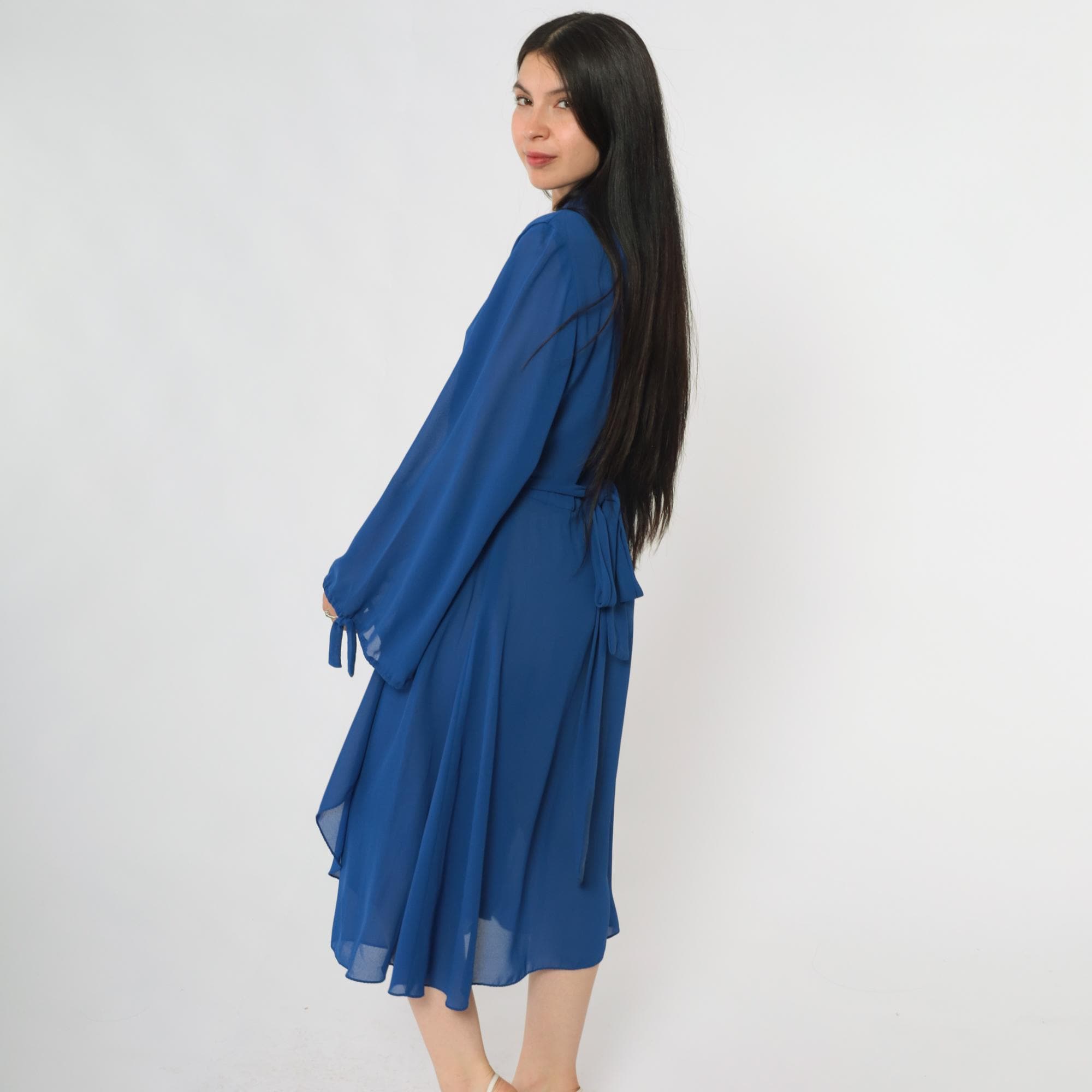 80s royal blue wrap dress from Miss Elliette. Features long sleeves with tie cuffs, deep wrap front with tie waist belt, and midi length. Classic power dressing silhouette with flowing skirt and professional styling.