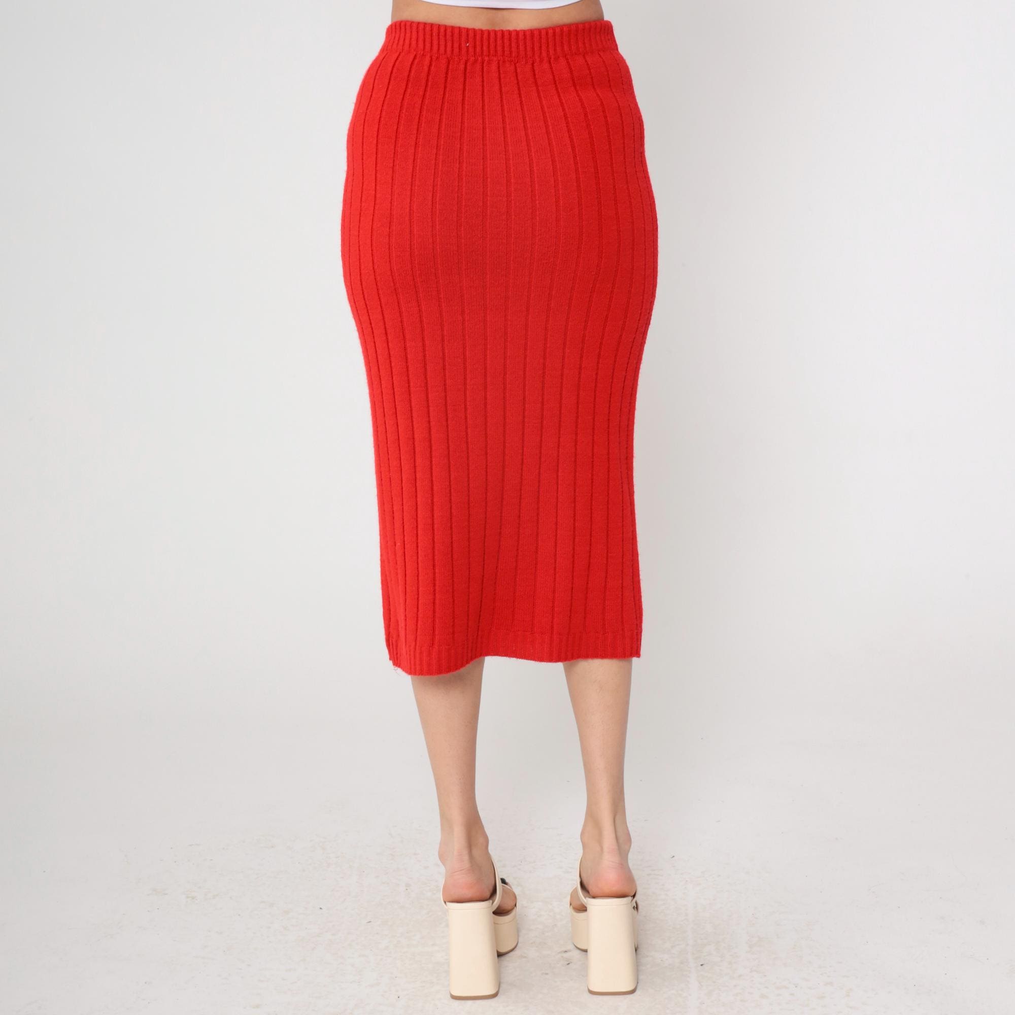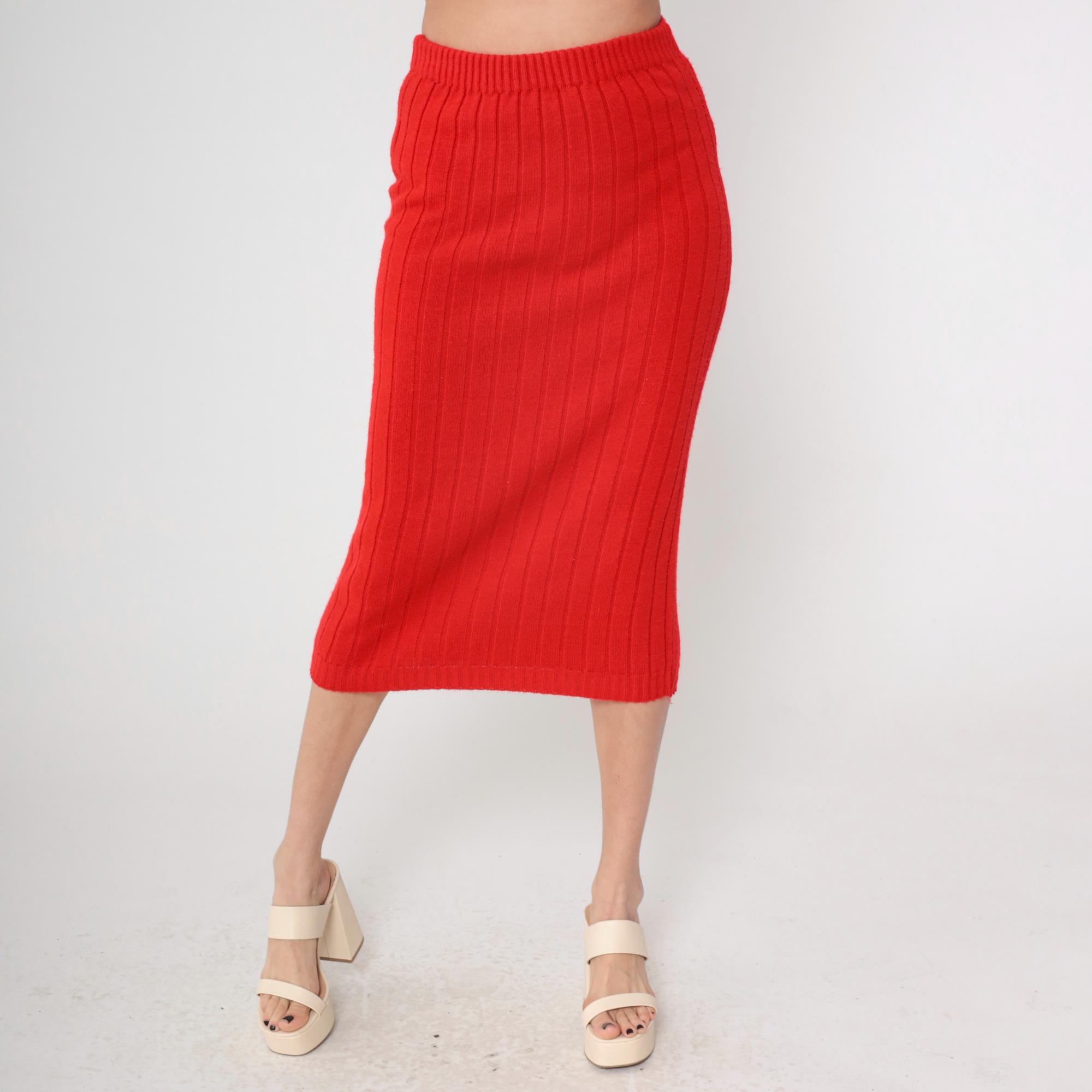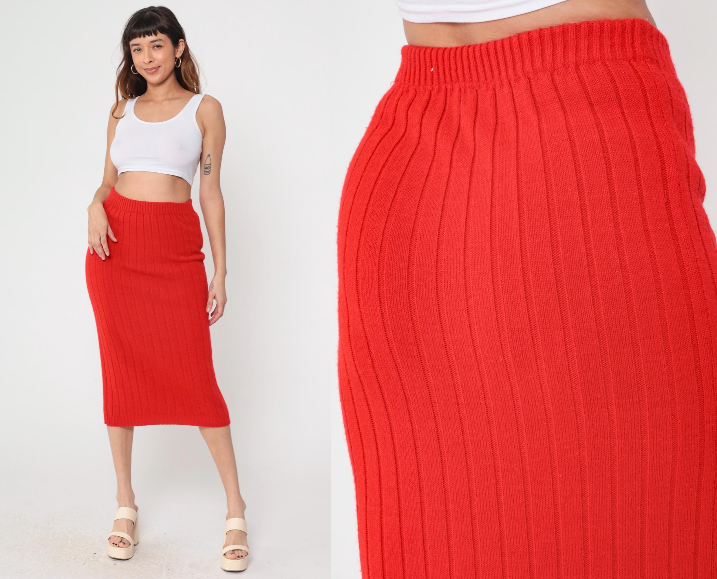 Vintage 70s skirt in red ribbed knit with a high elastic waist.