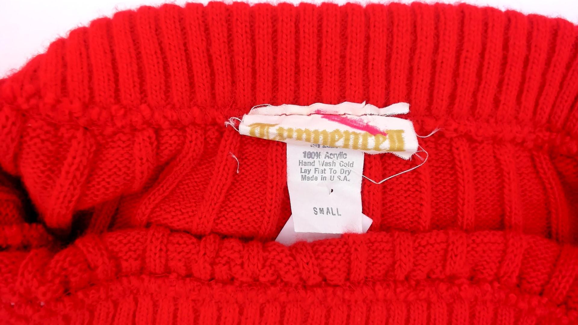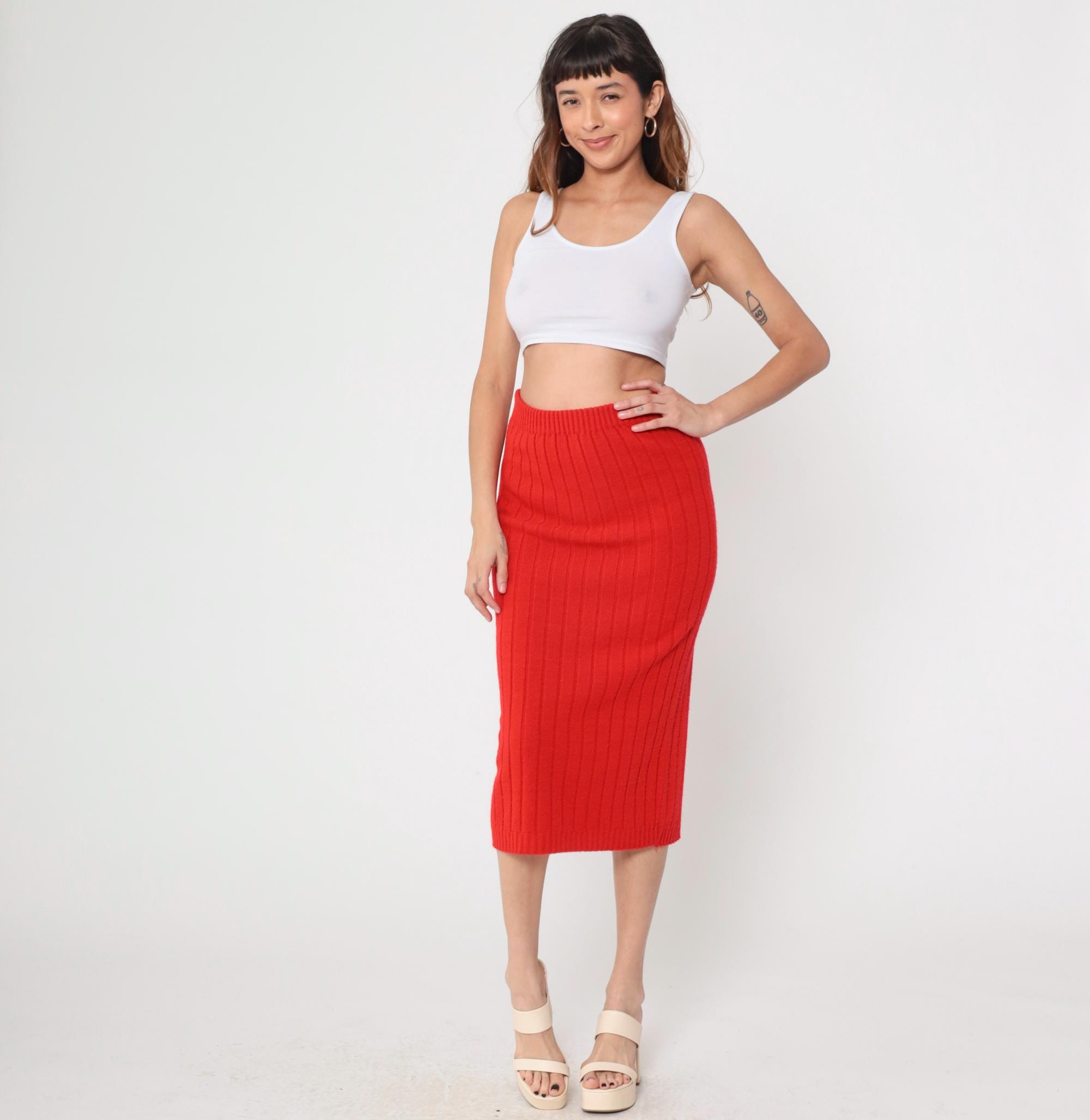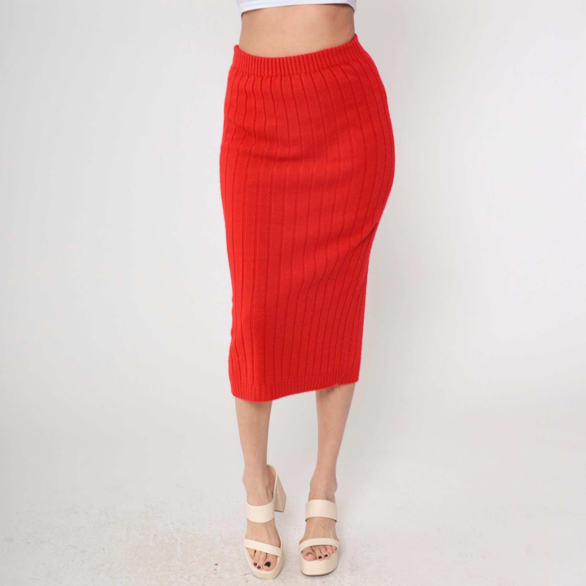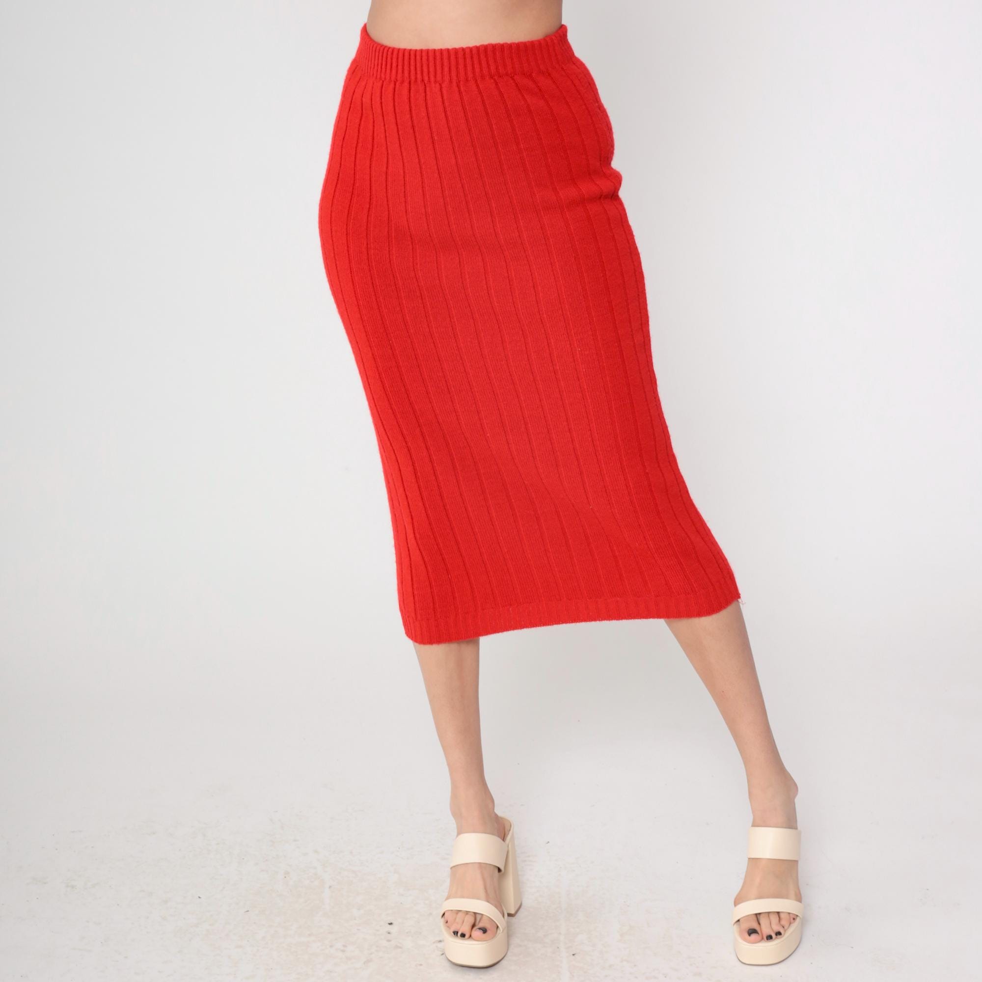 Vintage 70s skirt in red ribbed knit with a high elastic waist.