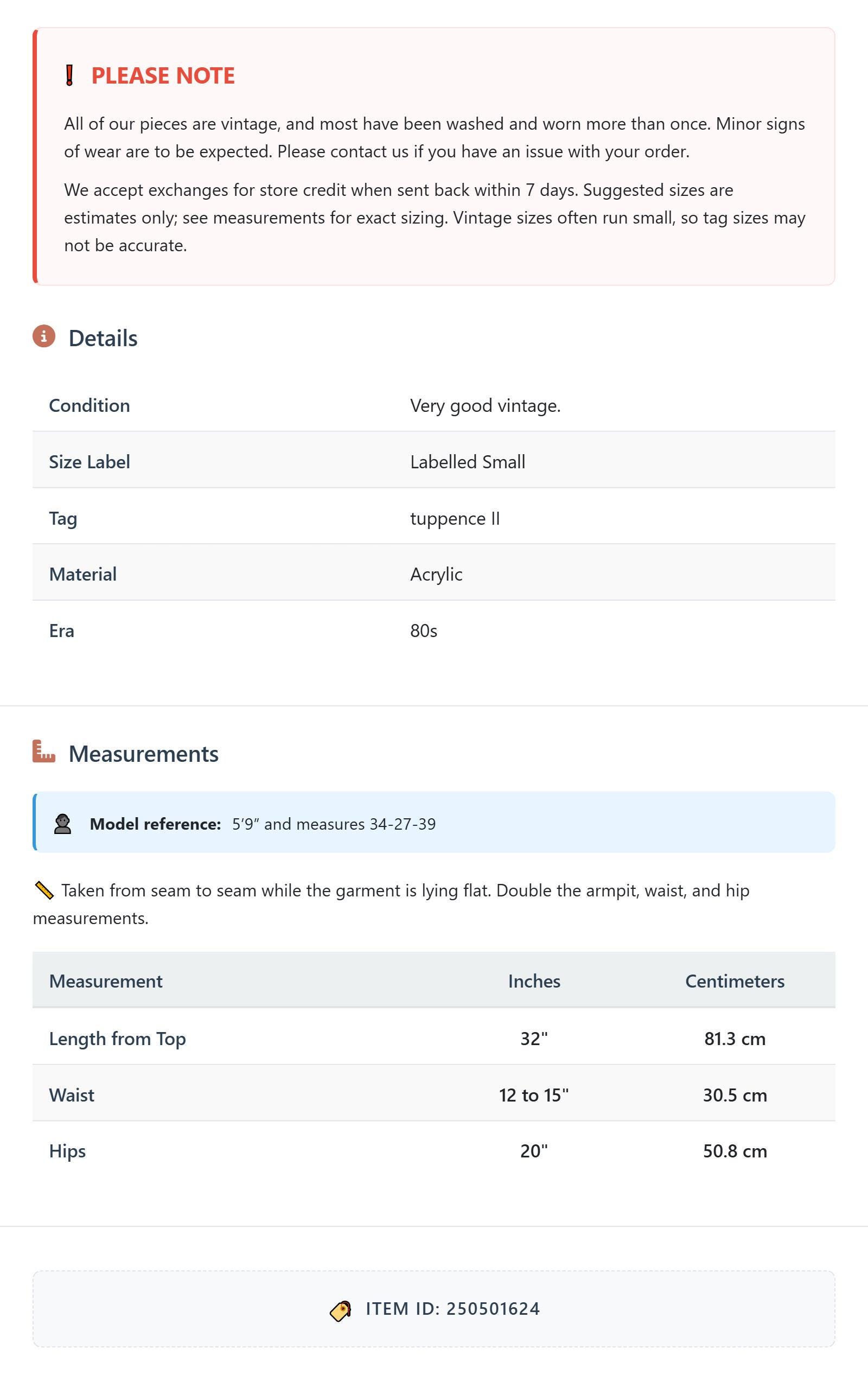 Suggested sizes are estimates only; see measurements for exact sizing. Vintage sizes often run small, so tag sizes may not be accurate.