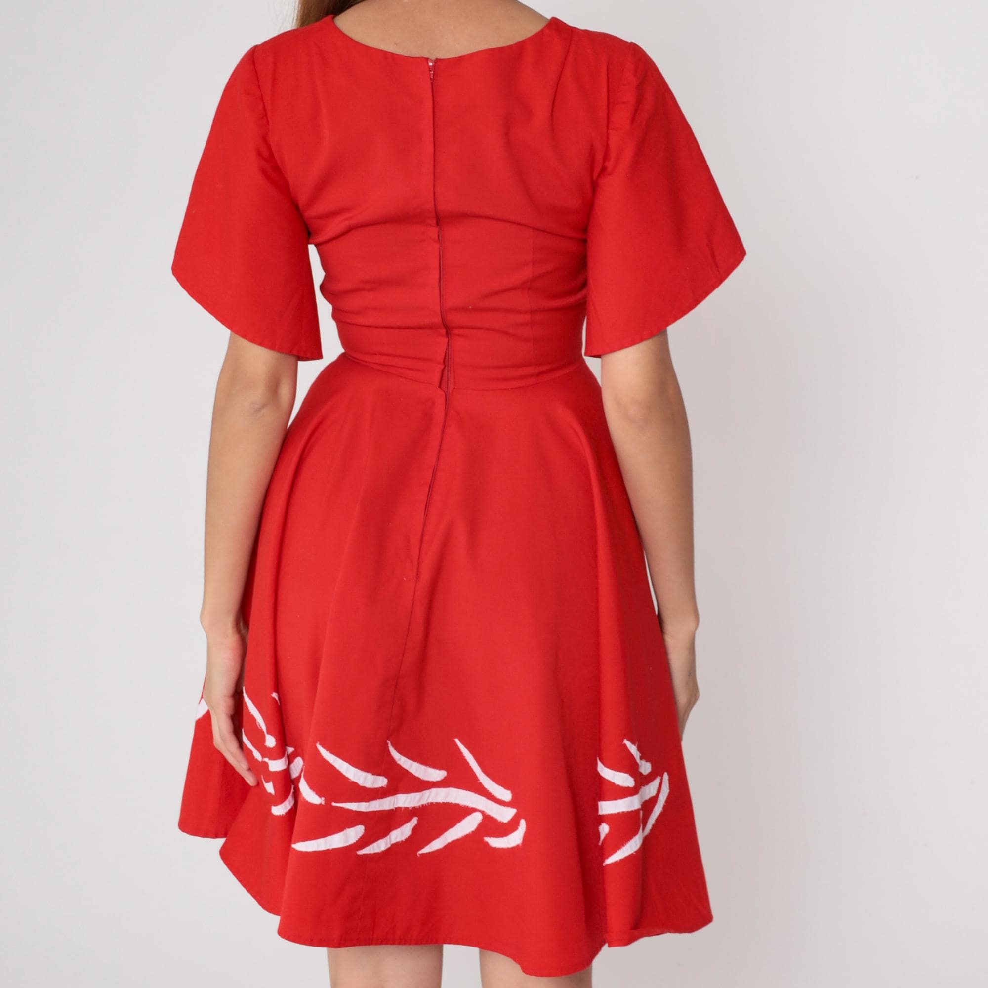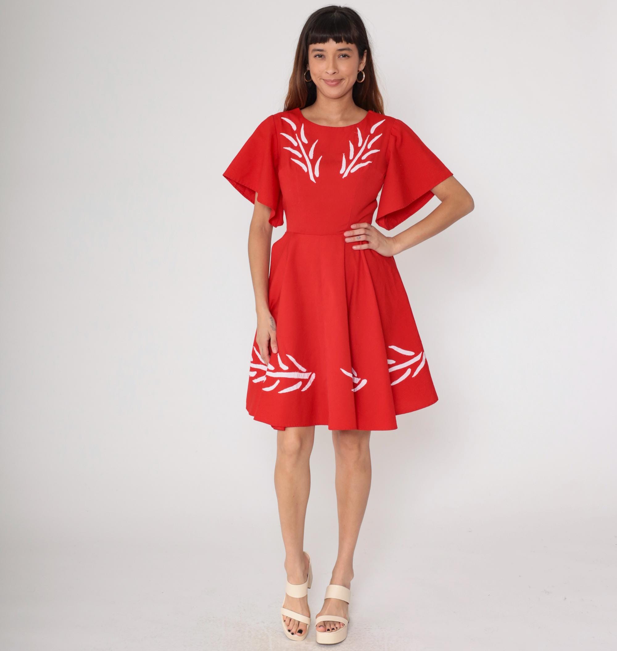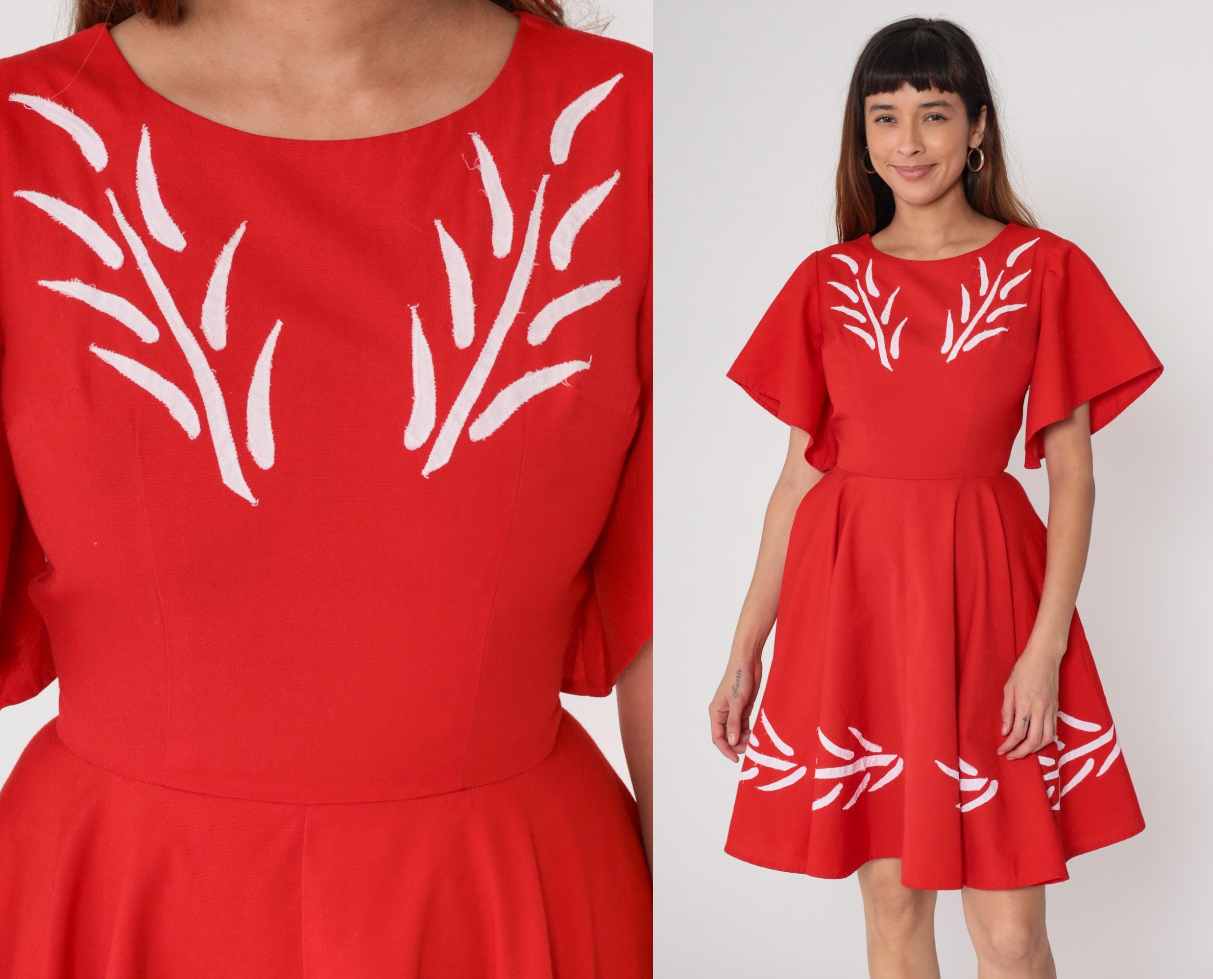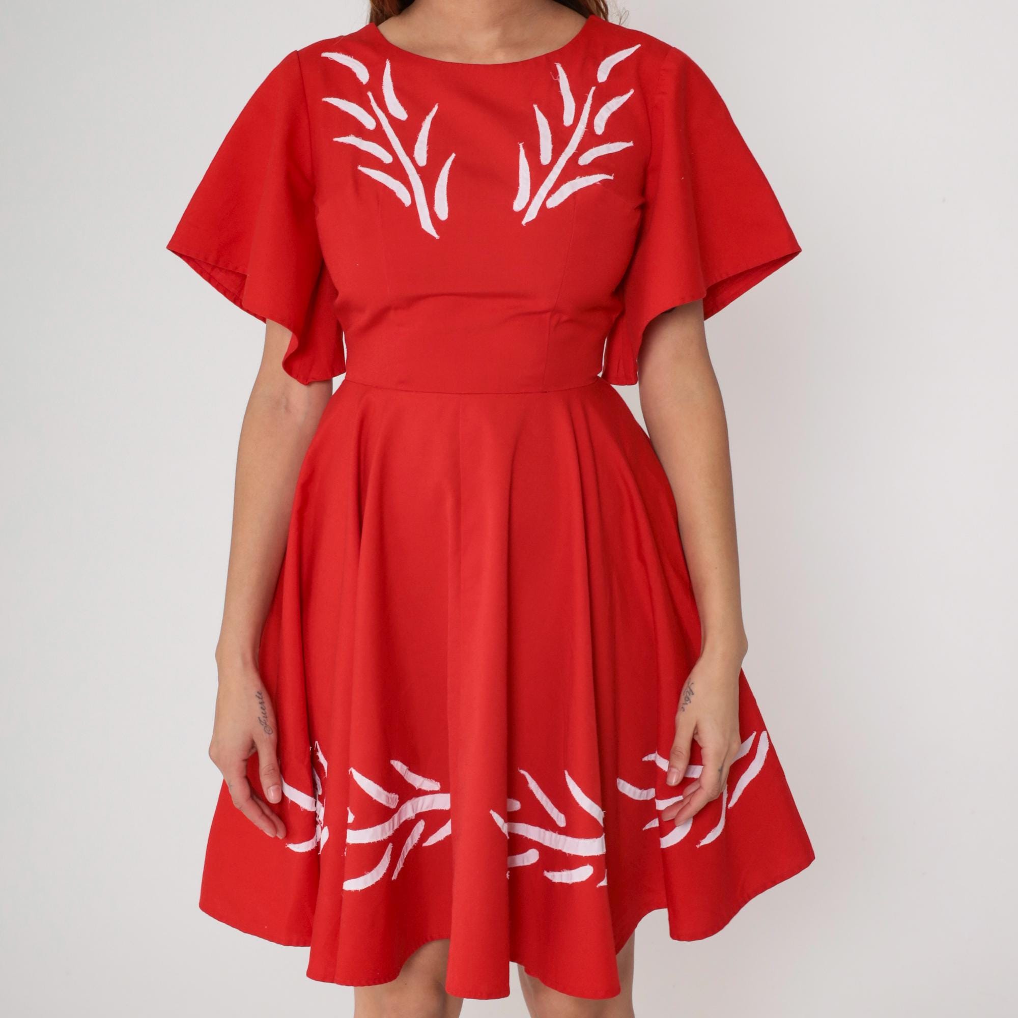 1960s red mini dress with white embroidery. Flutter sleeves. Fit and flare silhouette with full gathered skirt. Back zip.