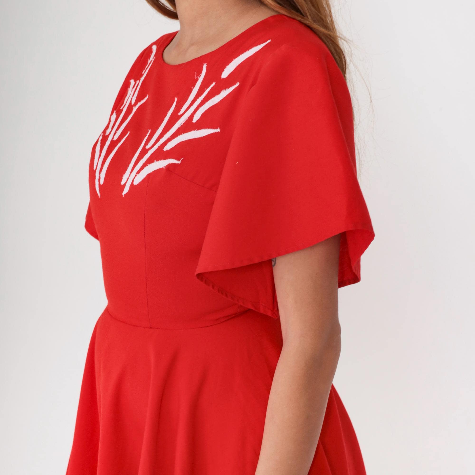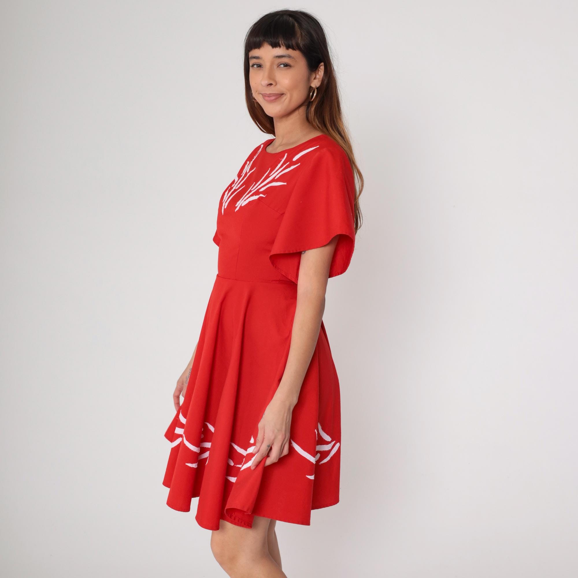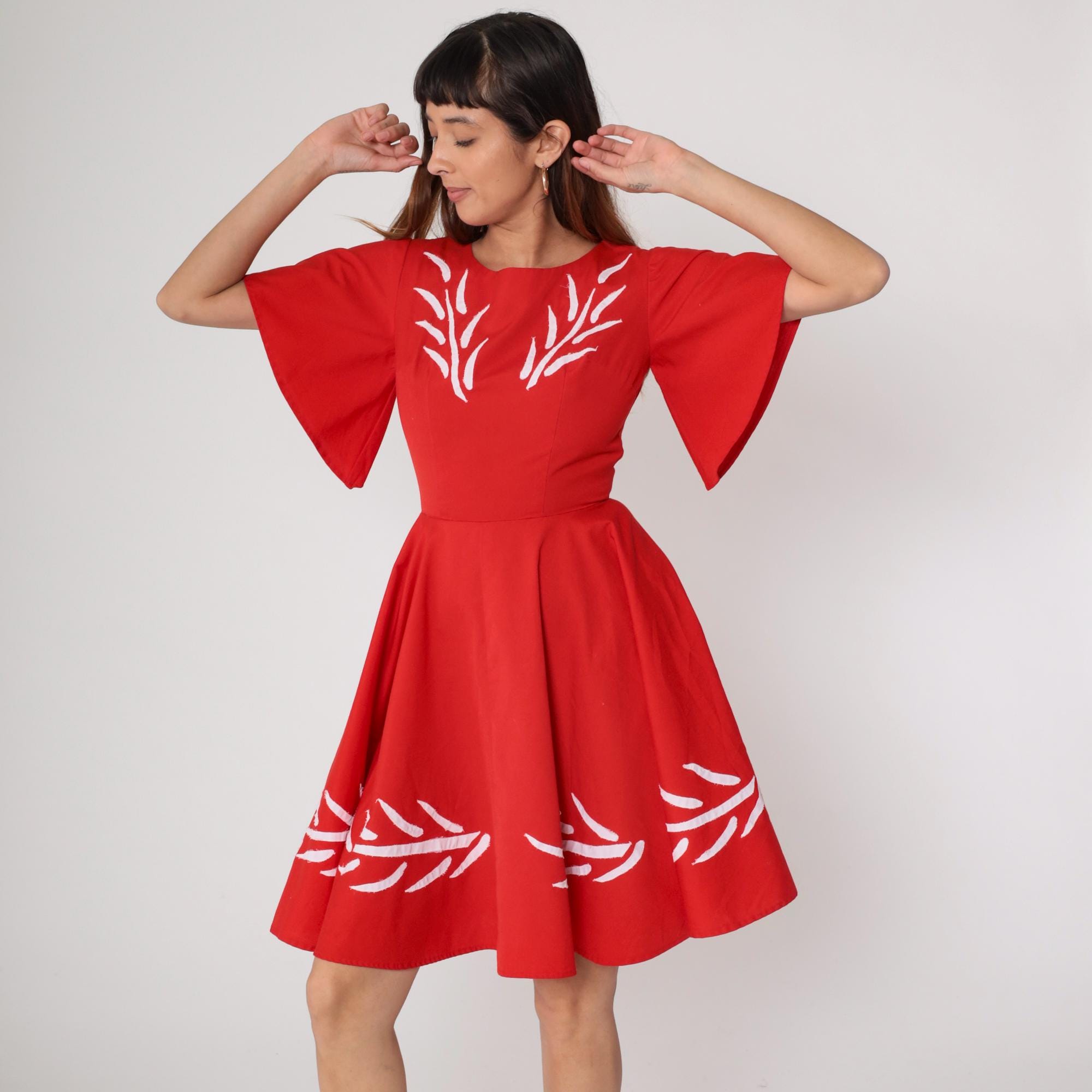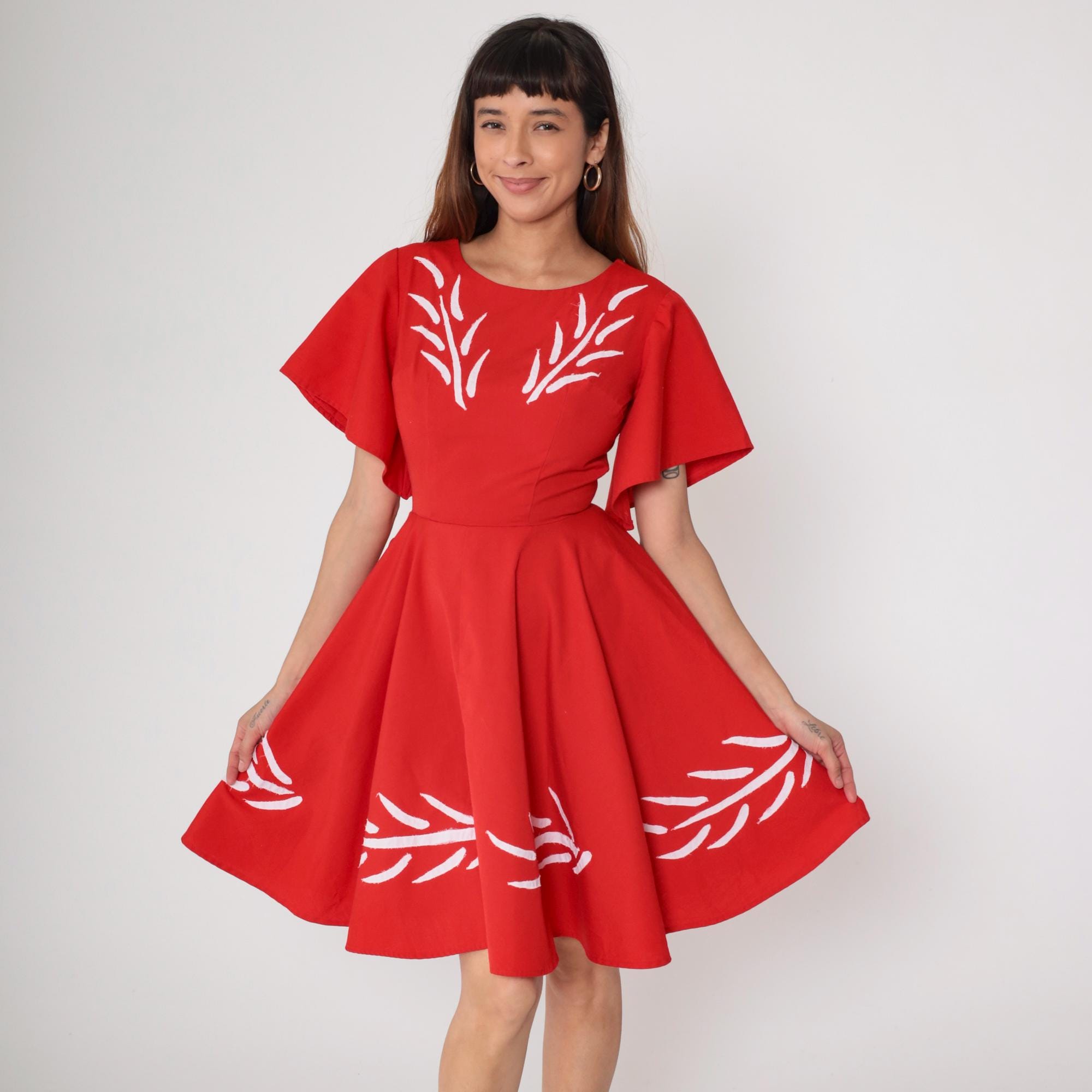1960s red mini dress with white embroidery. Flutter sleeves. Fit and flare silhouette with full gathered skirt. Back zip.