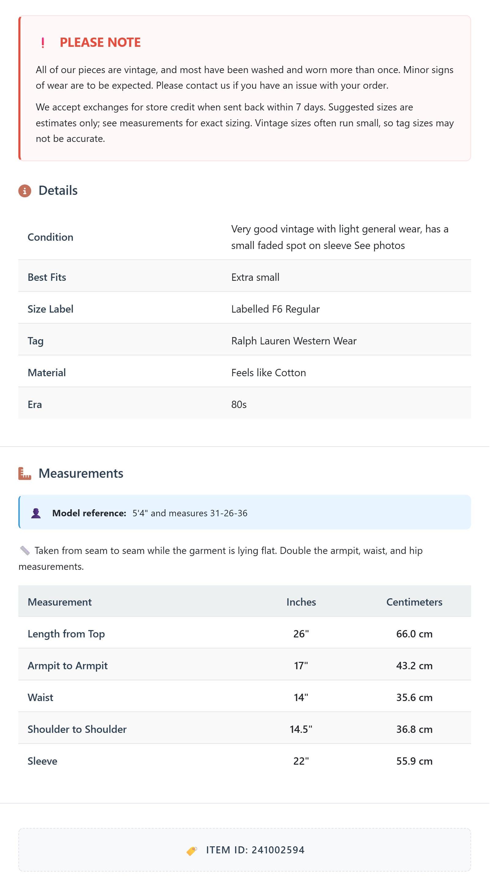 All of our pieces are vintage, and most have been washed and worn more than once. Minor signs of wear are to be expected. Please contact us if you have an issue with your order. We accept exchanges for store credit when sent back within 7 days.