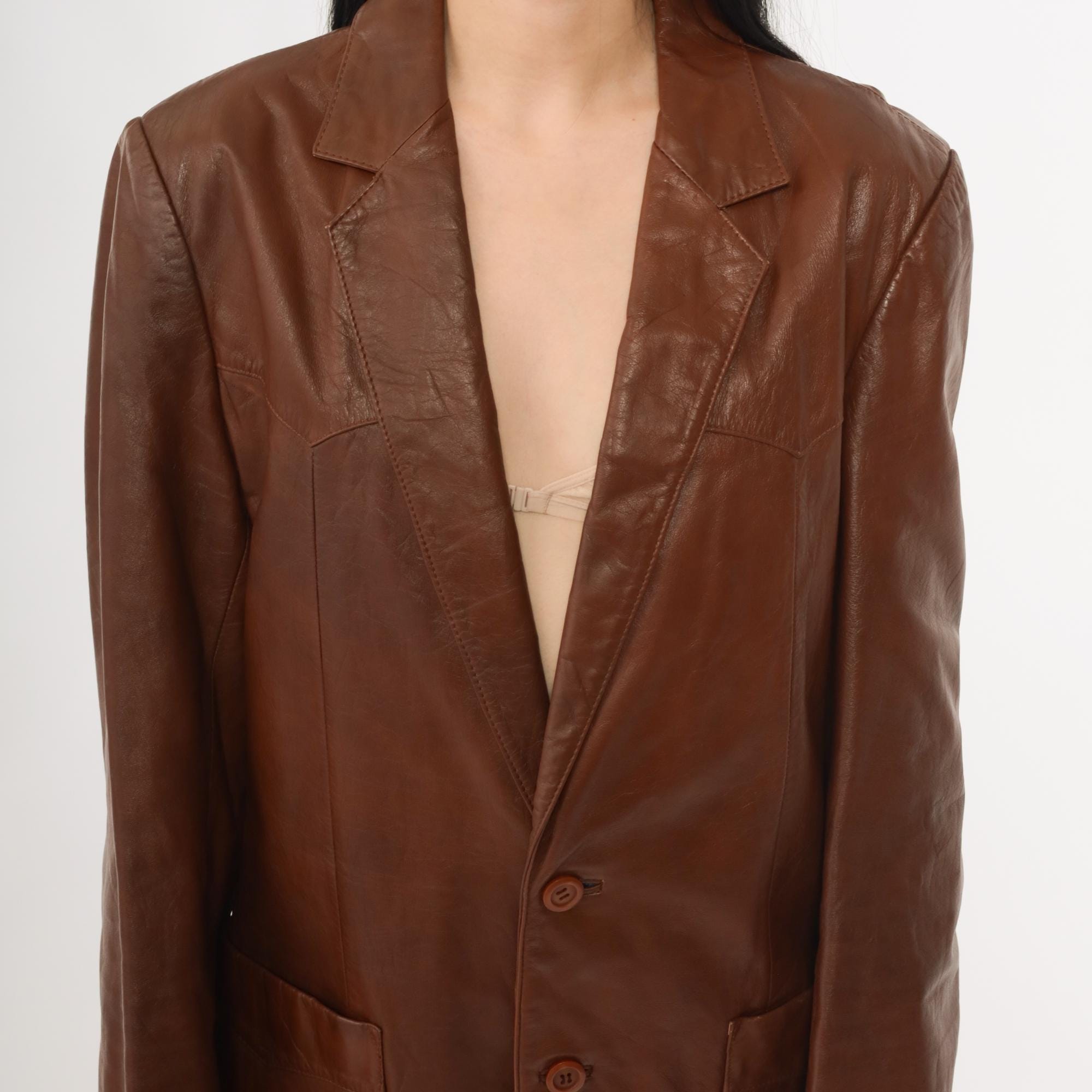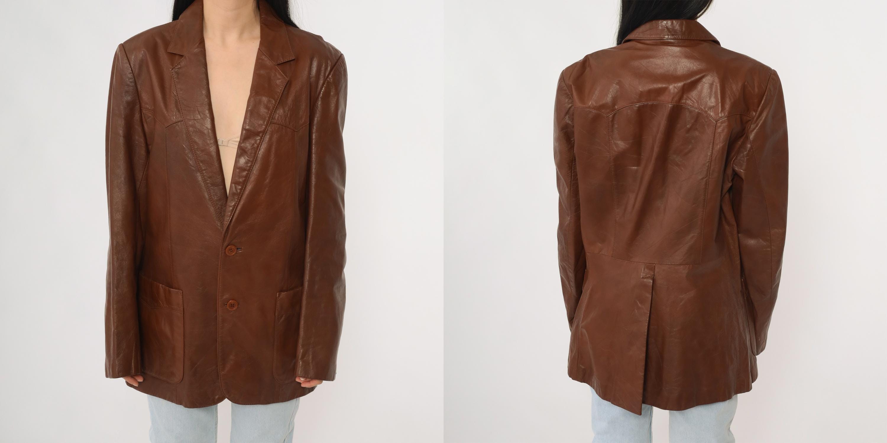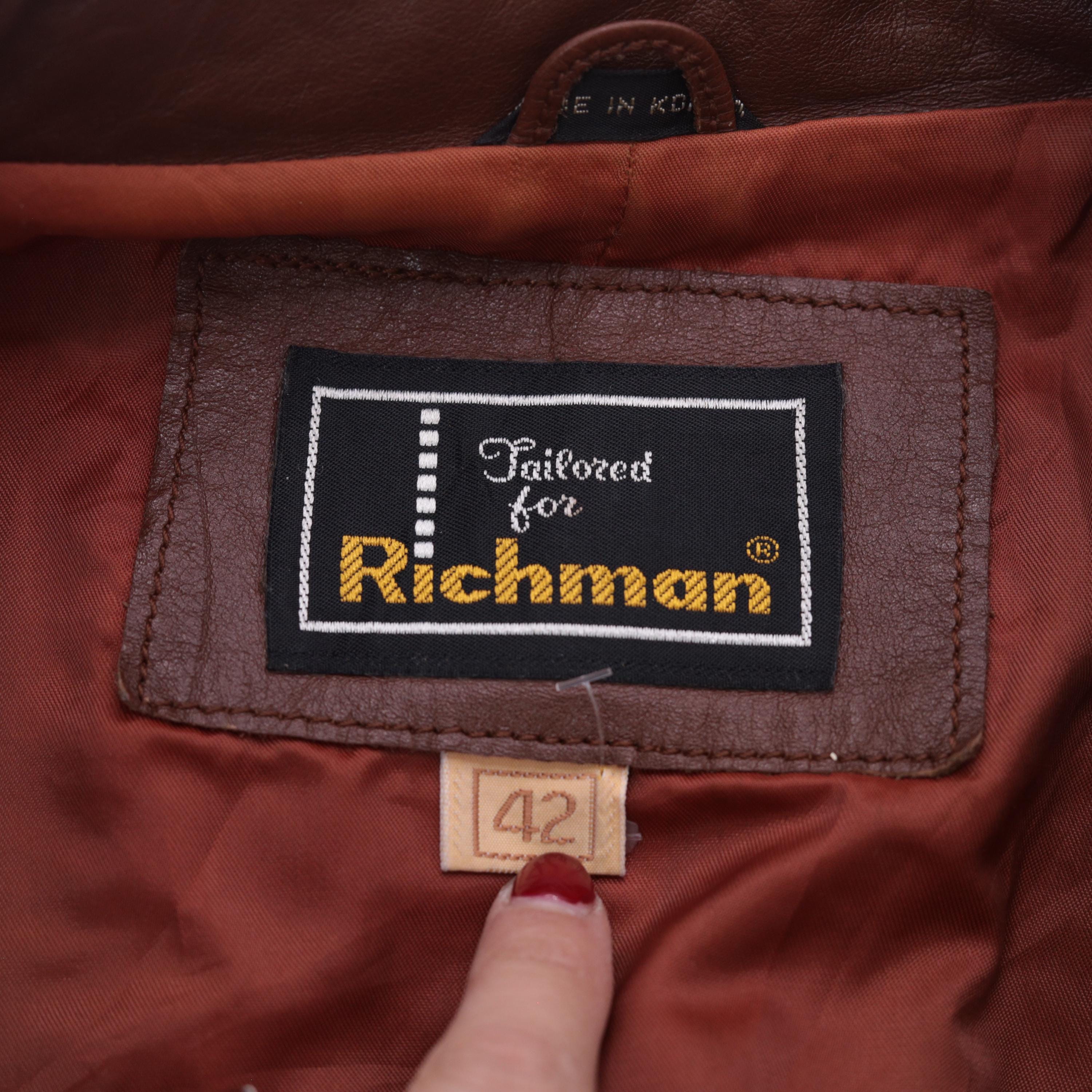 70s brown leather blazer labeled Tailored for Richman. Features a two button front closure, long sleeves, and notched lapel collar. Includes large patch front pockets and a single back vent. Fully lined in nylon and acetate.