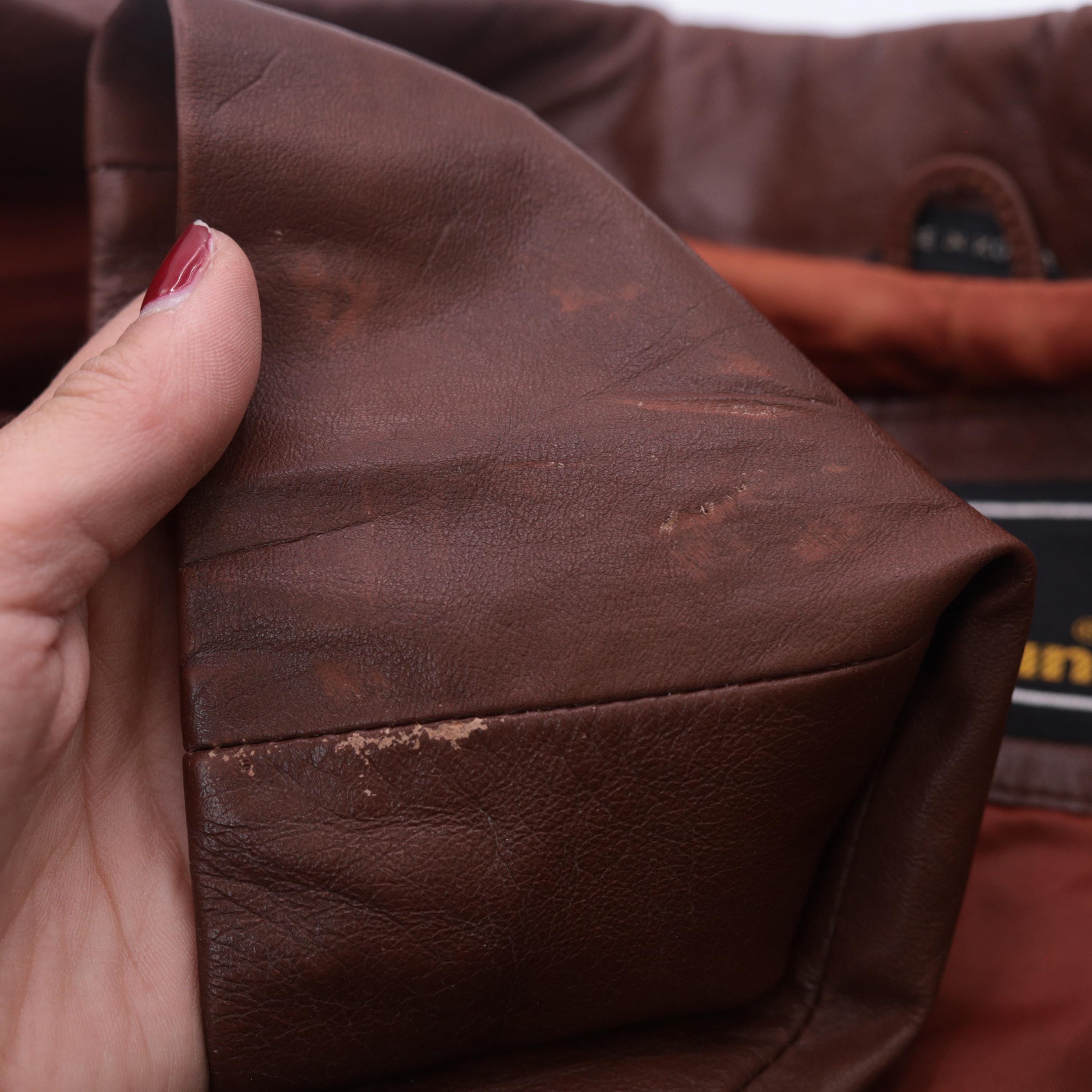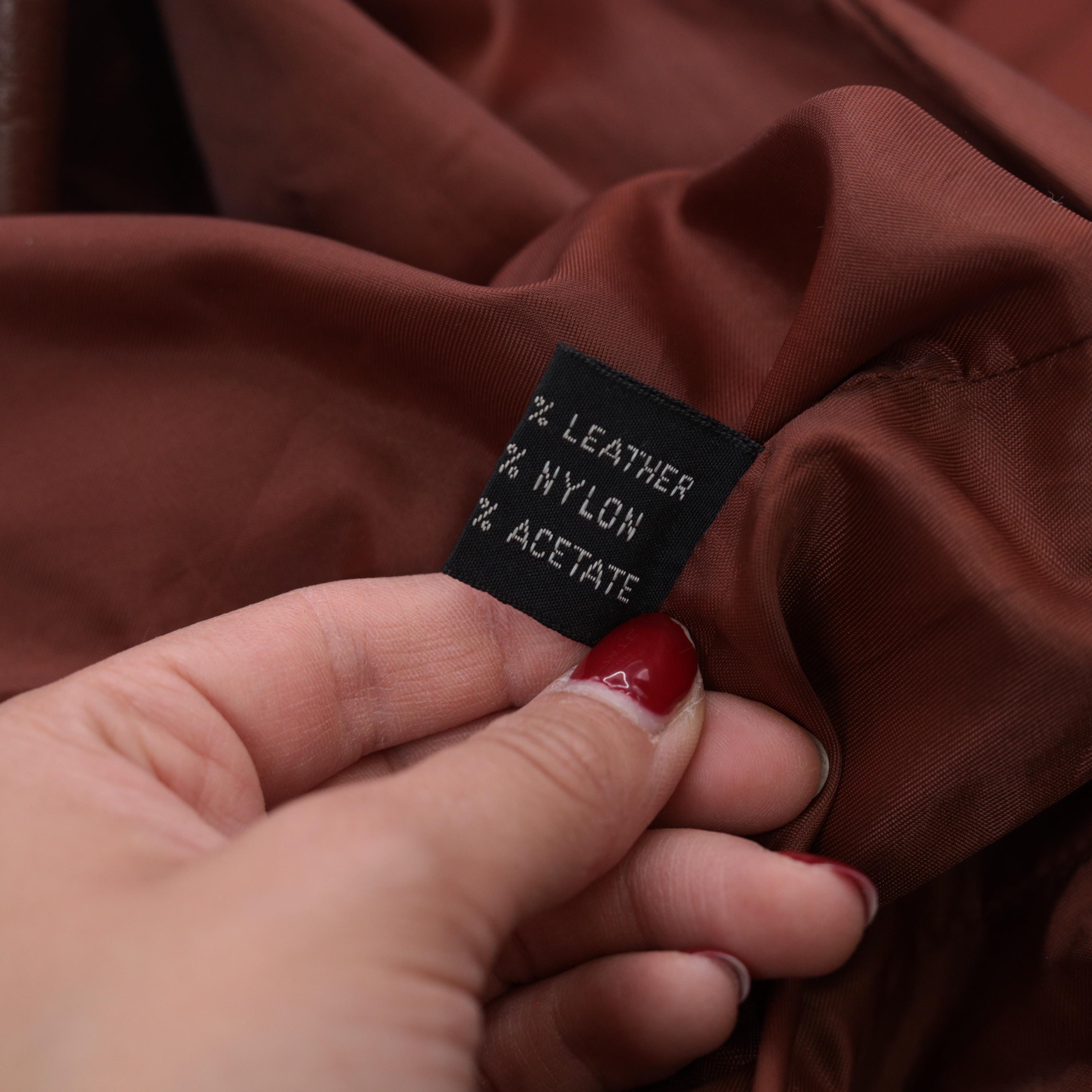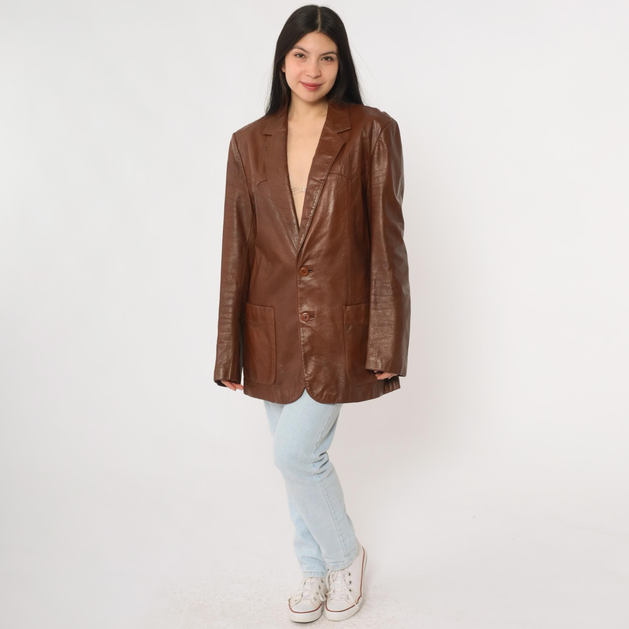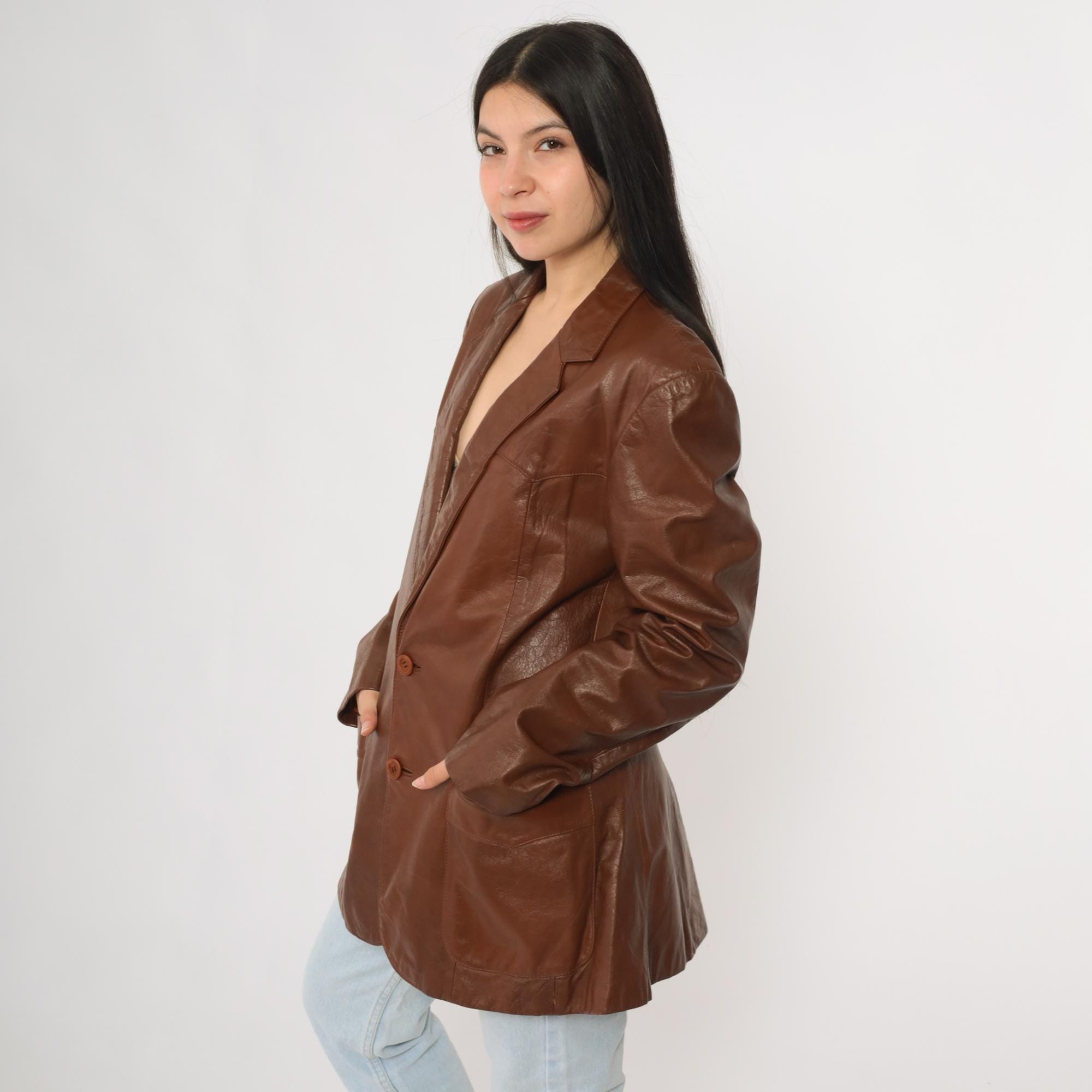 70s brown leather blazer labeled Tailored for Richman. Features a two button front closure, long sleeves, and notched lapel collar. Includes large patch front pockets and a single back vent. Fully lined in nylon and acetate.