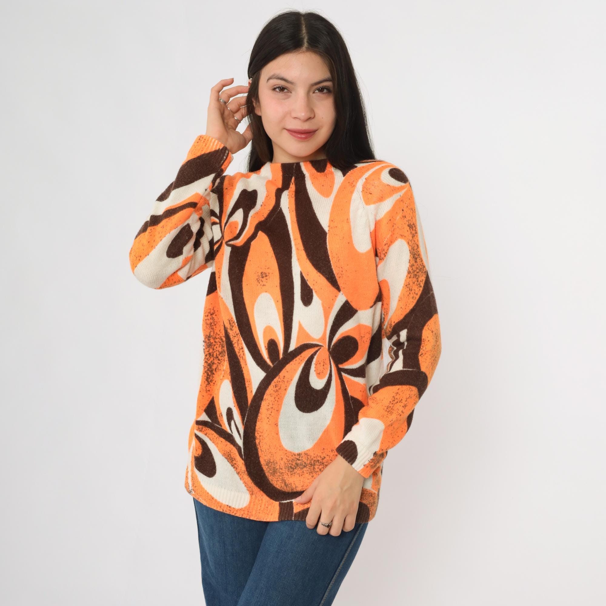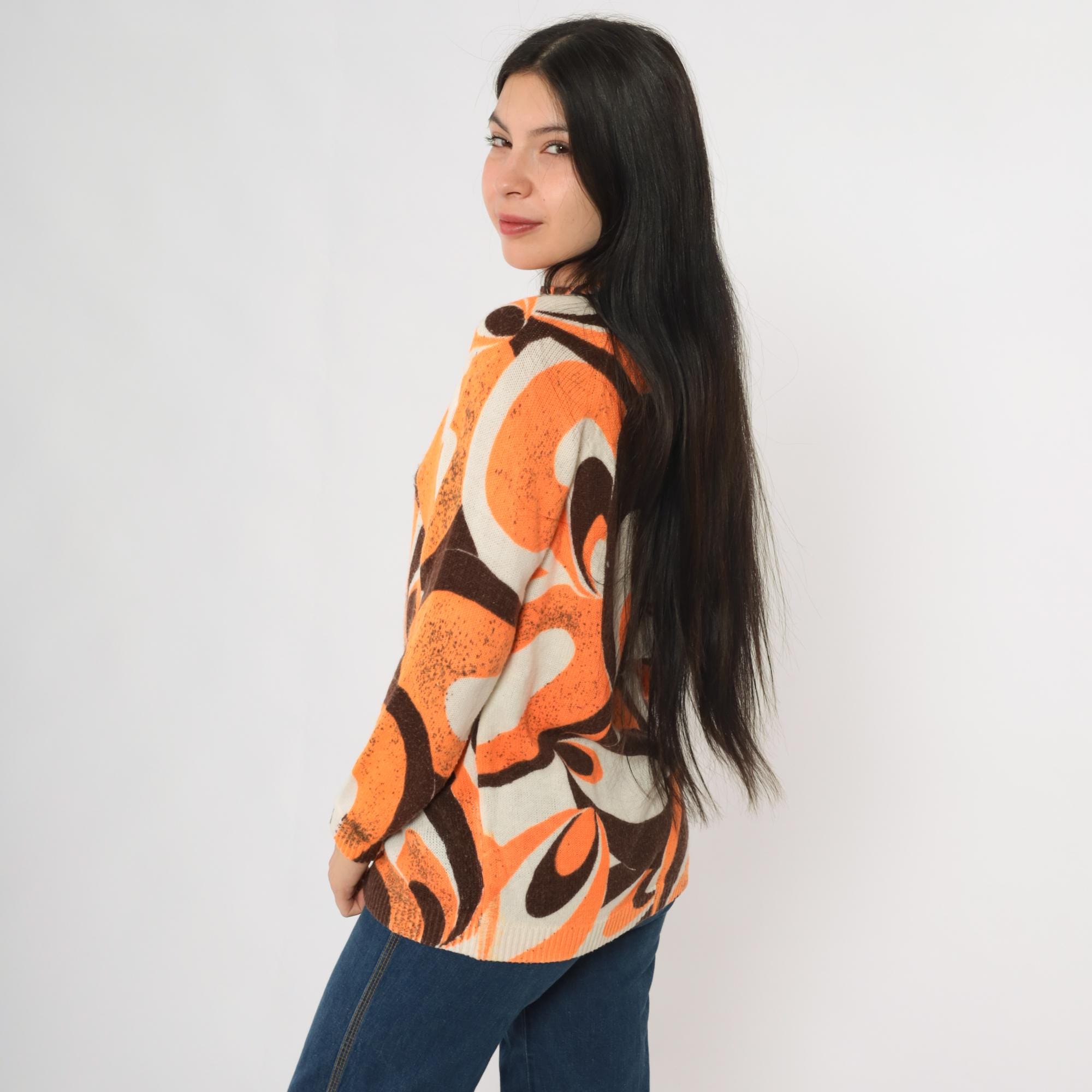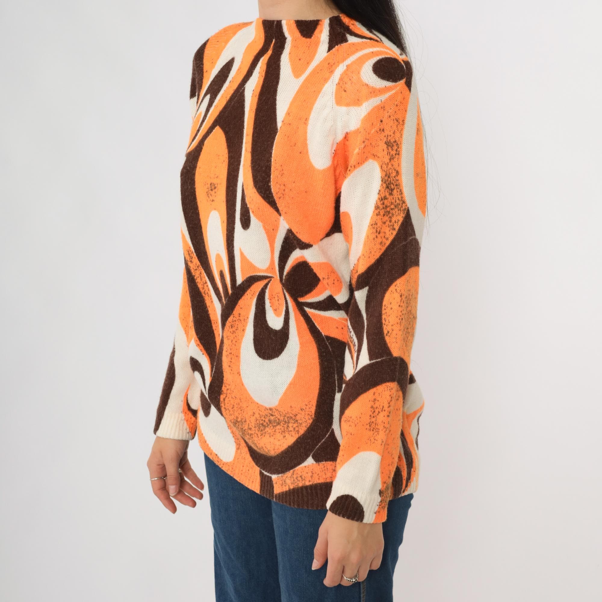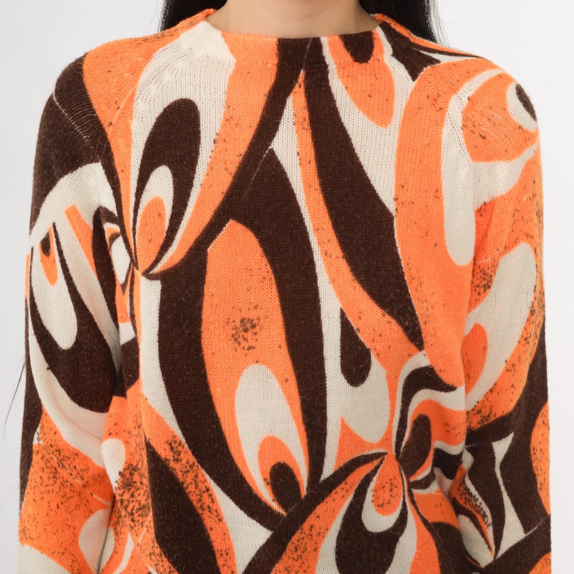 Vintage 70s psychedelic sweater featuring a bold orange, brown, and white abstract swirl pattern. This pullover knit has a crew neckline, long sleeves, and a slightly fitted shape through the body.