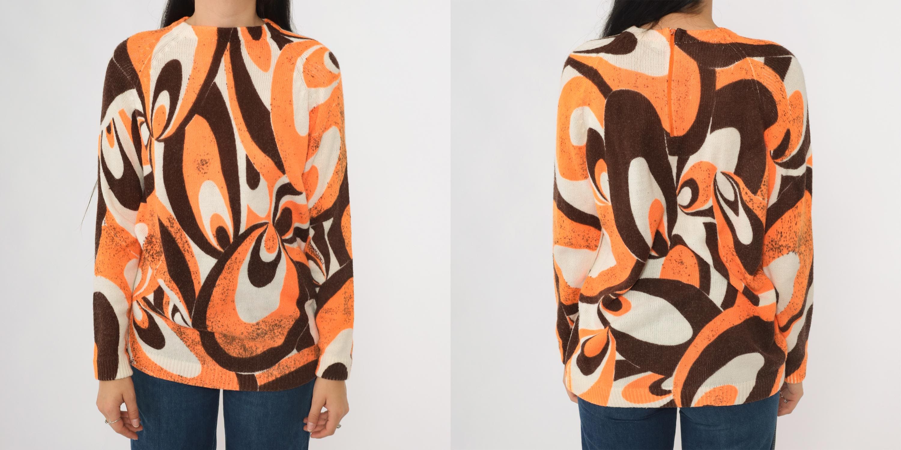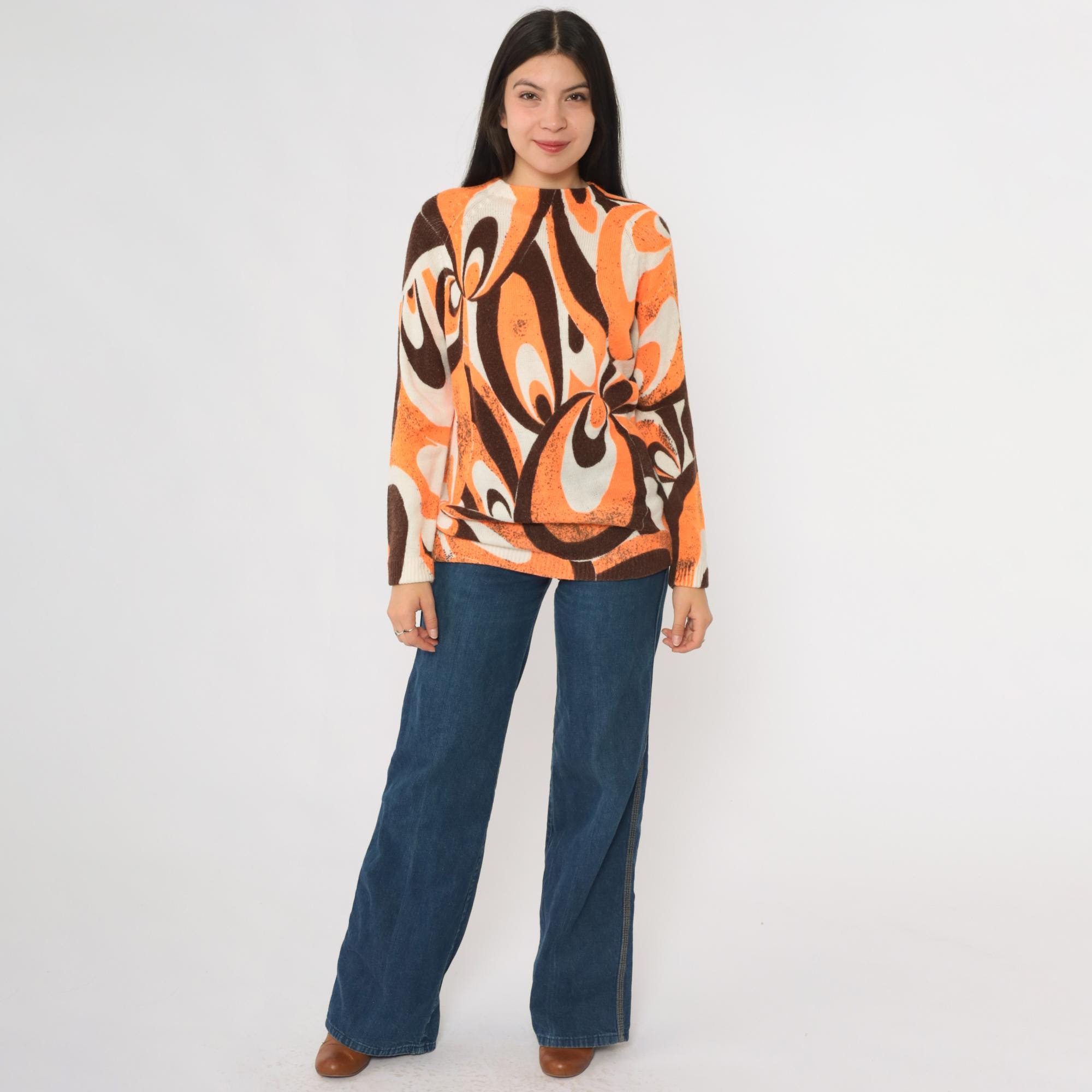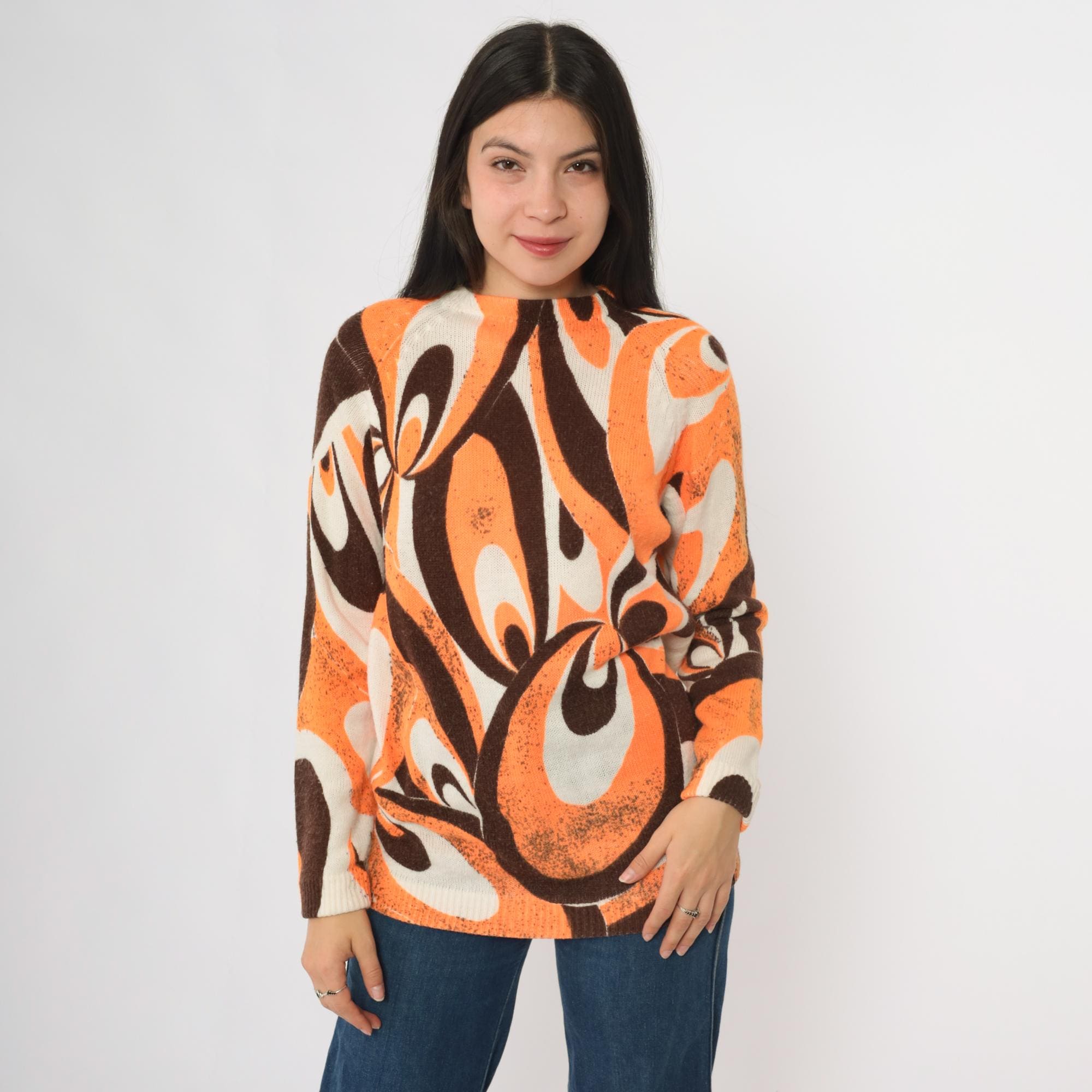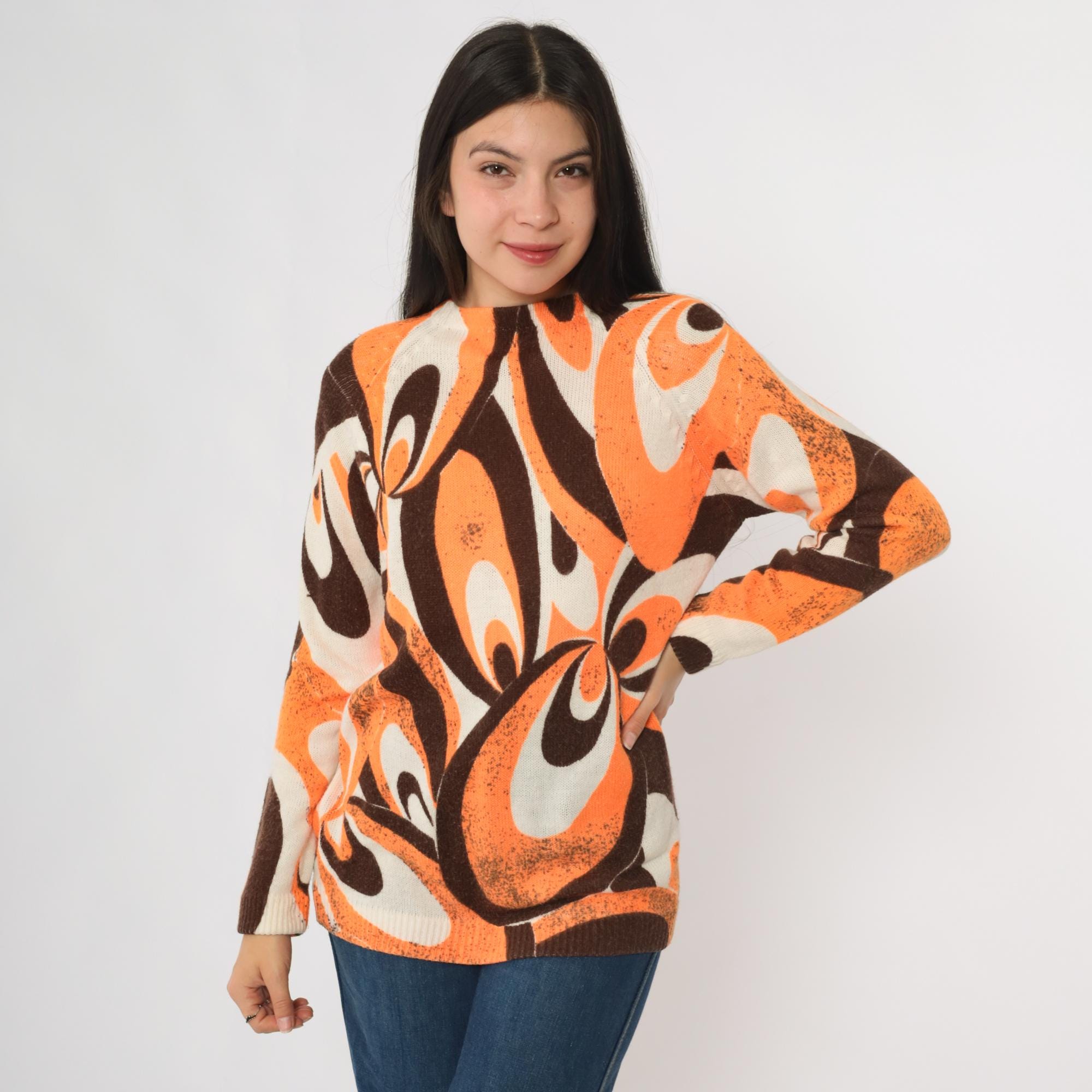 Vintage 70s psychedelic sweater featuring a bold orange, brown, and white abstract swirl pattern. This pullover knit has a crew neckline, long sleeves, and a slightly fitted shape through the body.