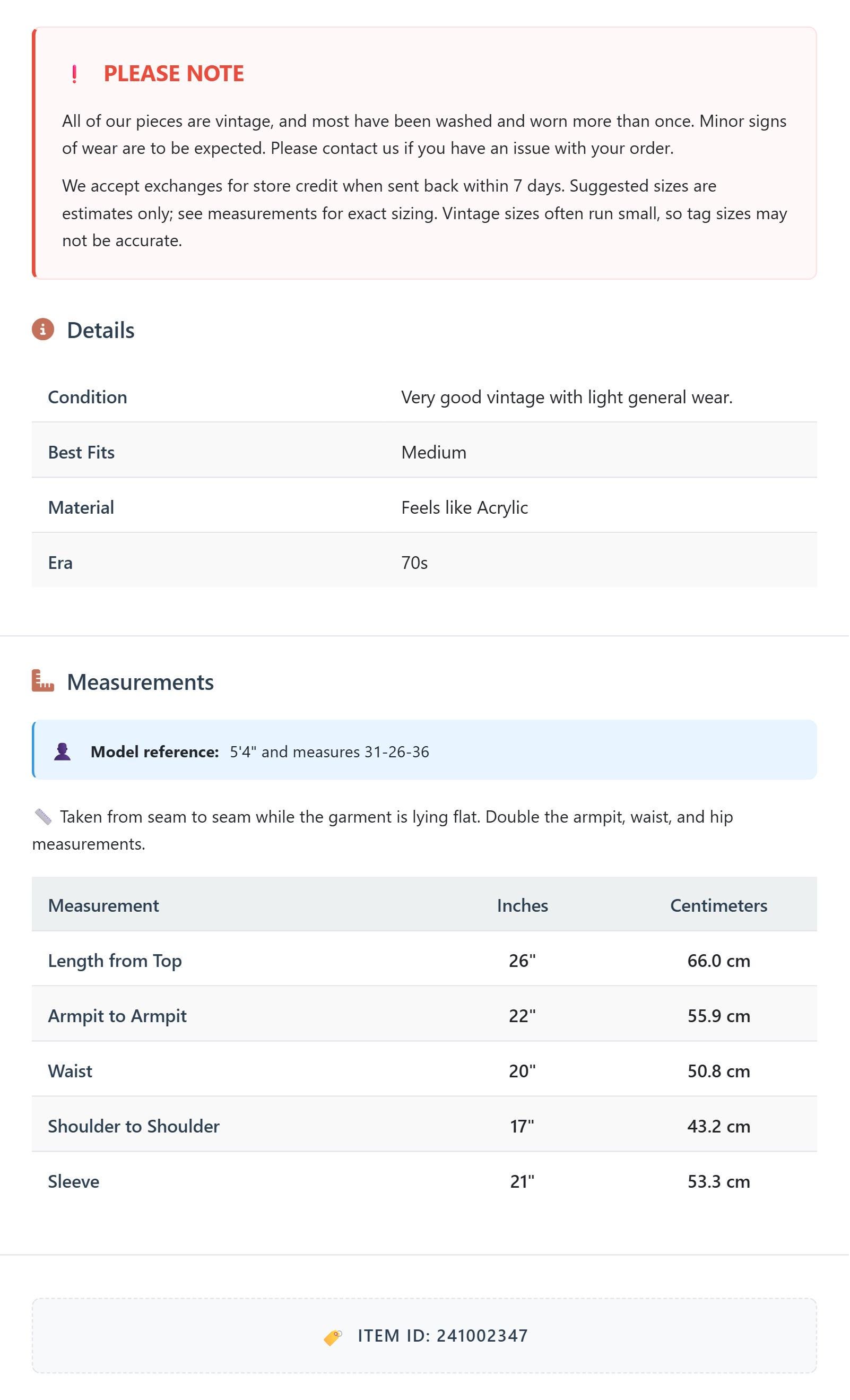 Suggested sizes are estimates only; see measurements for exact sizing. Vintage sizes often run small, so tag sizes may not be accurate.