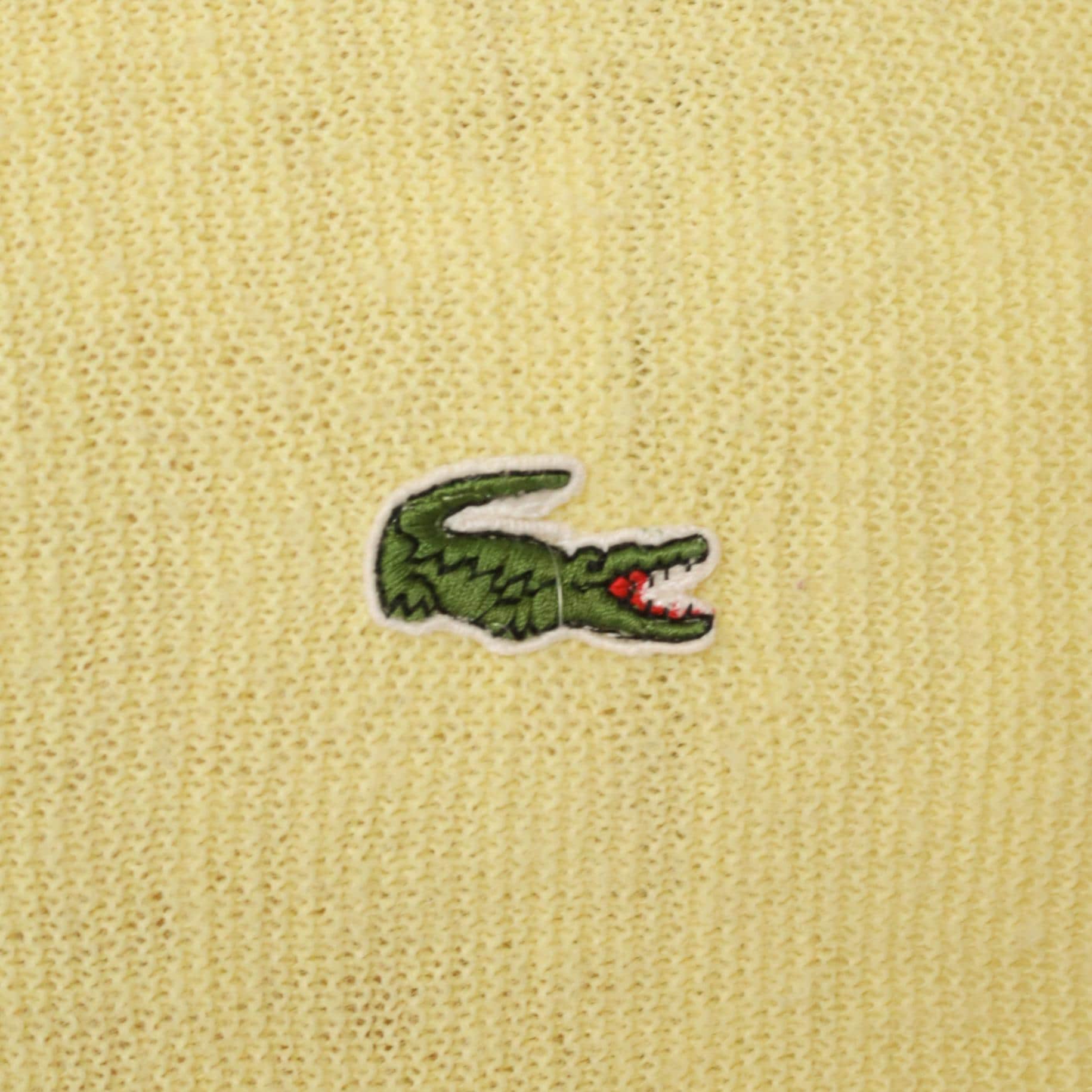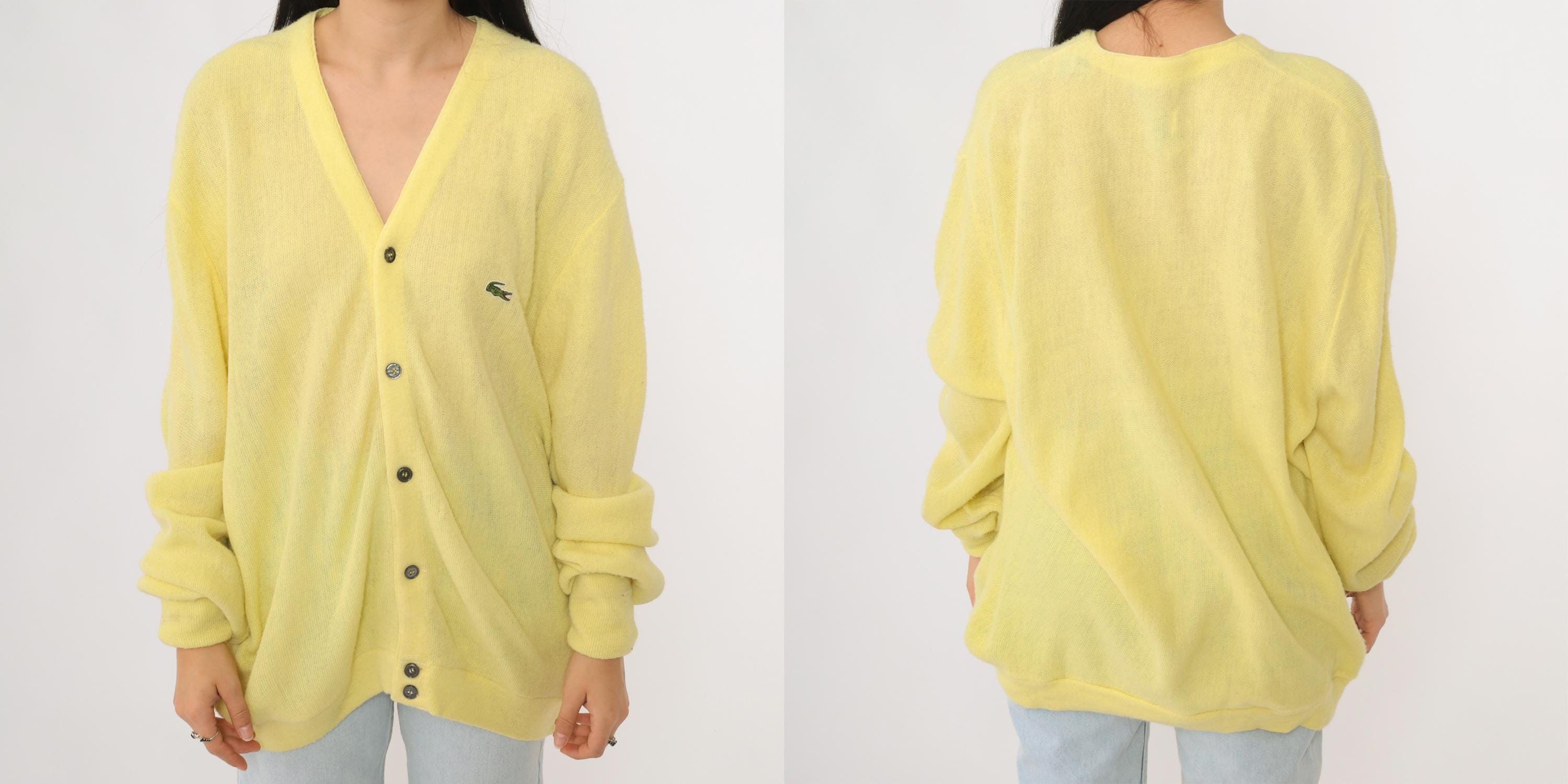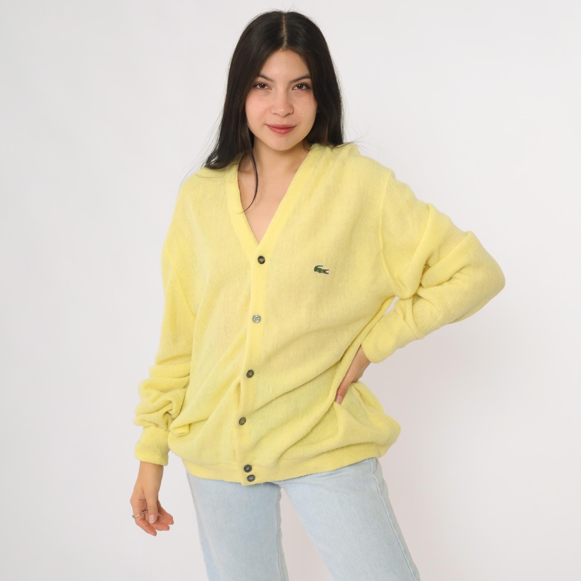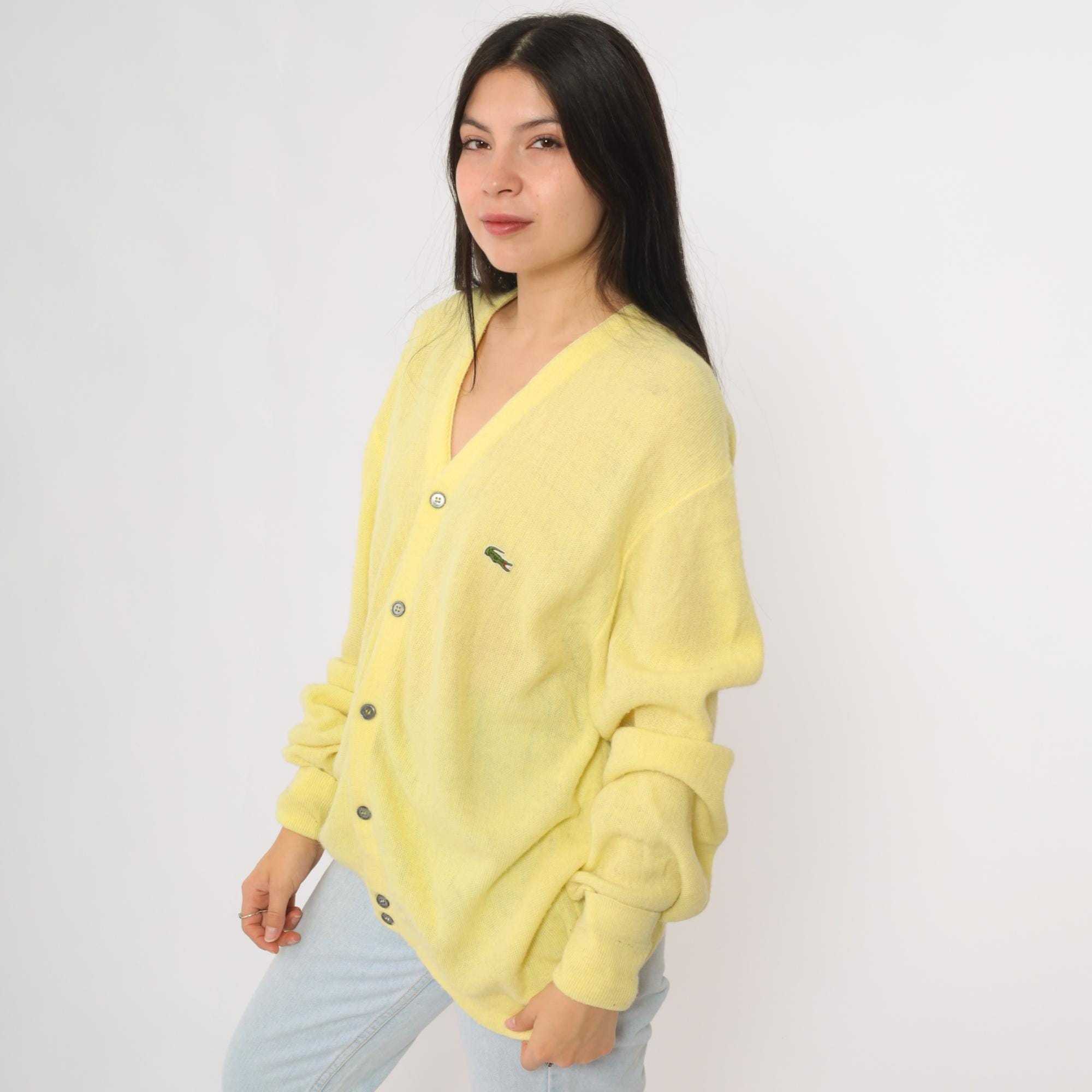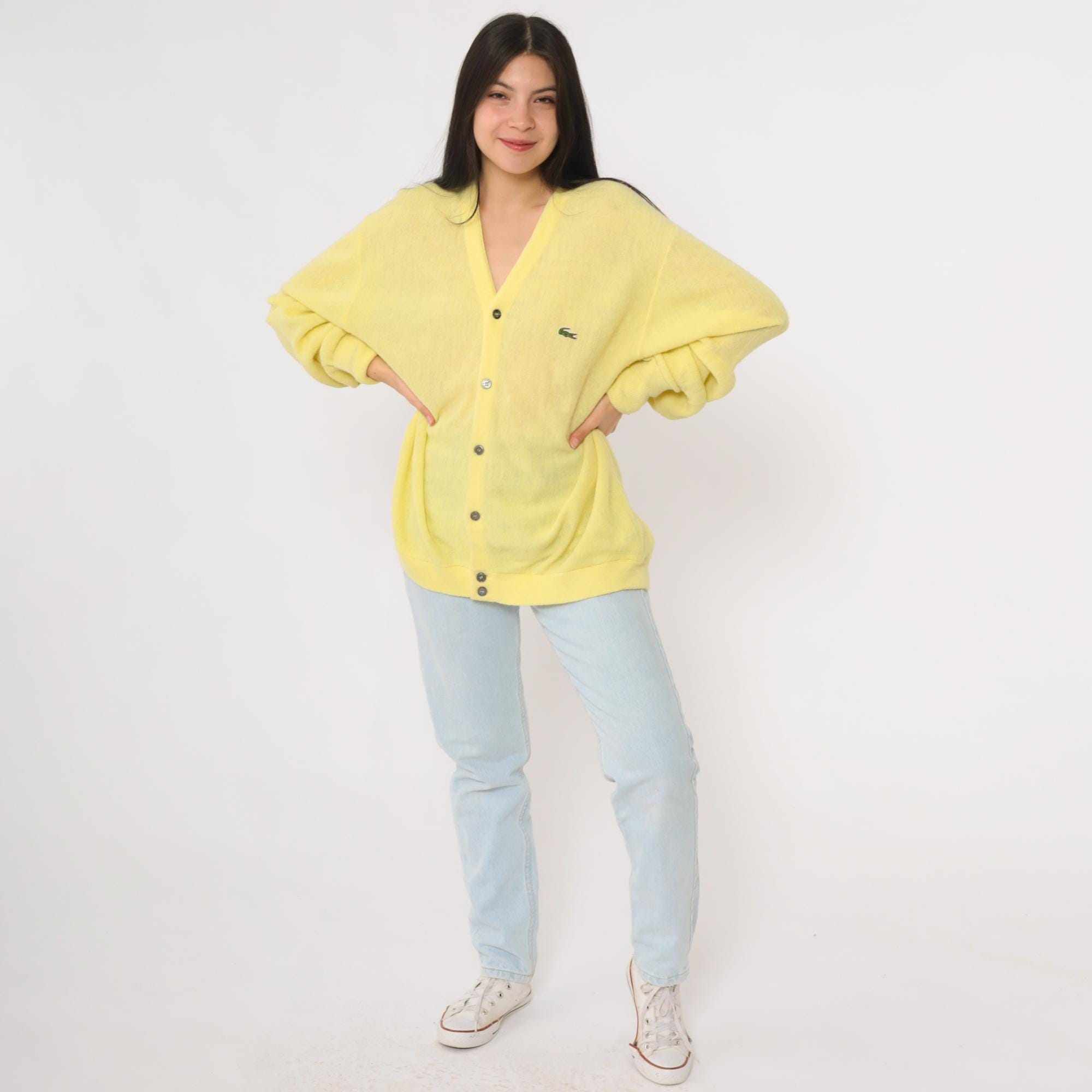 Vintage 70s yellow Lacoste cardigan with an oversized fit. Features a deep V-neckline, button front closure, long sleeves, and ribbed cuffs and hem. The chest is embroidered with the classic Lacoste crocodile logo.