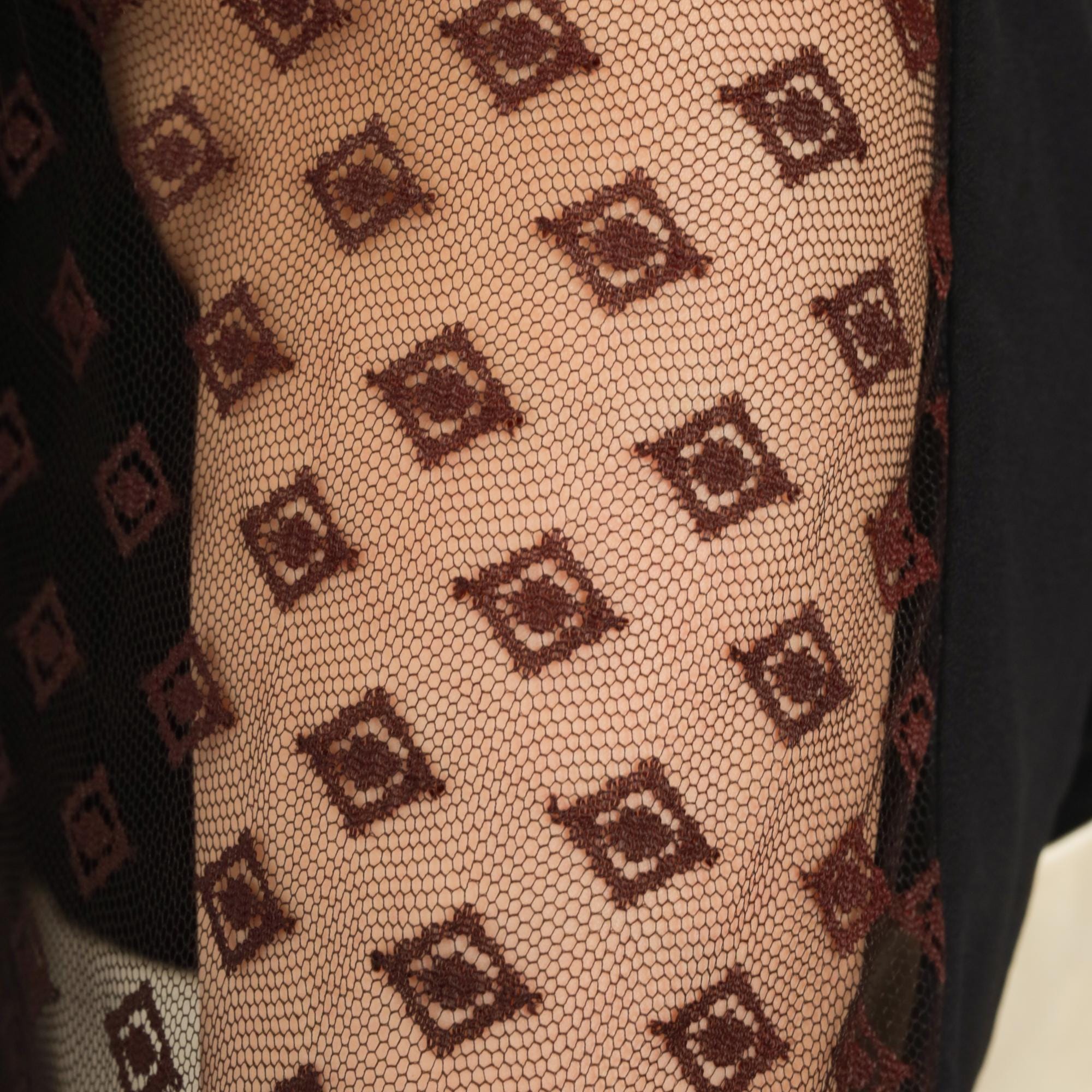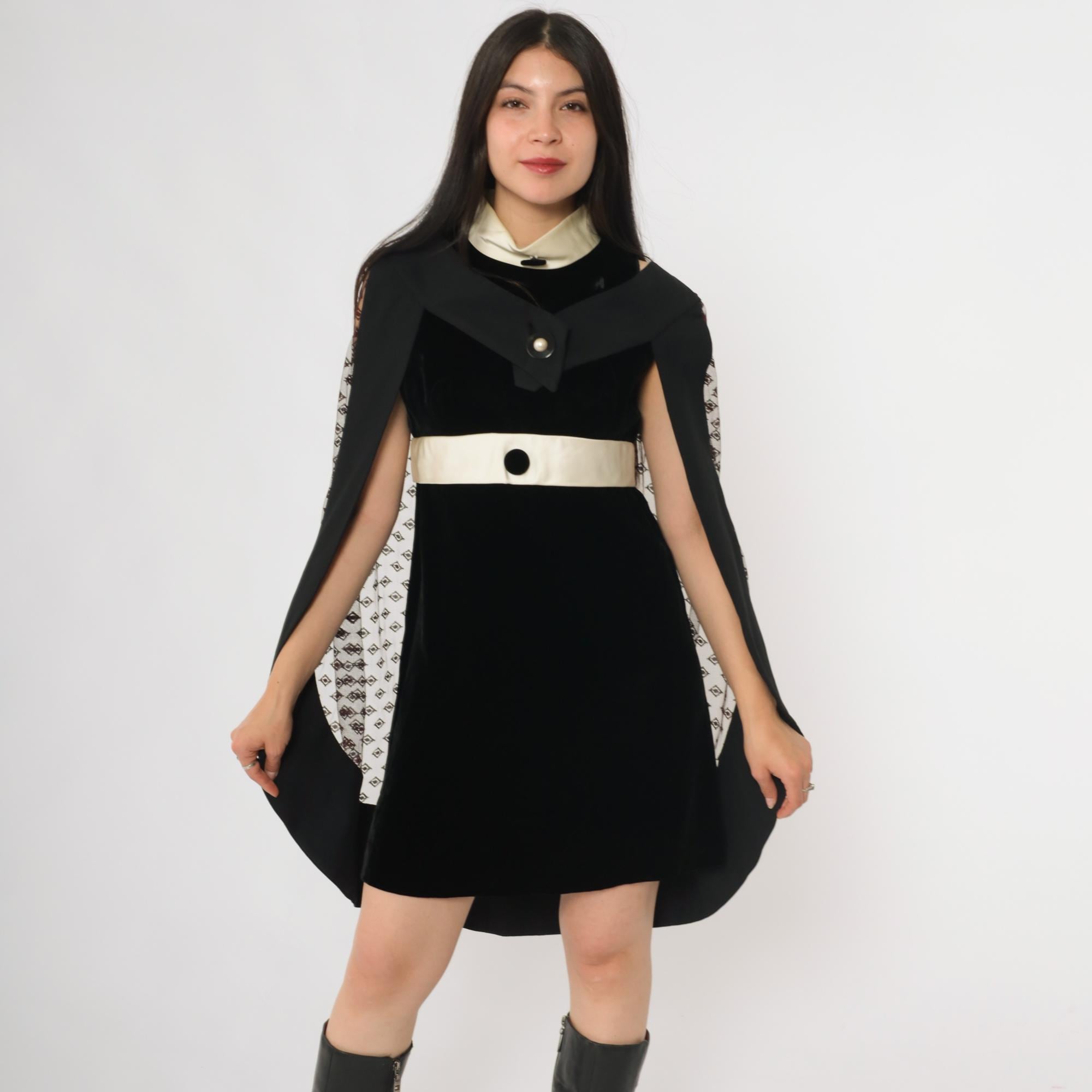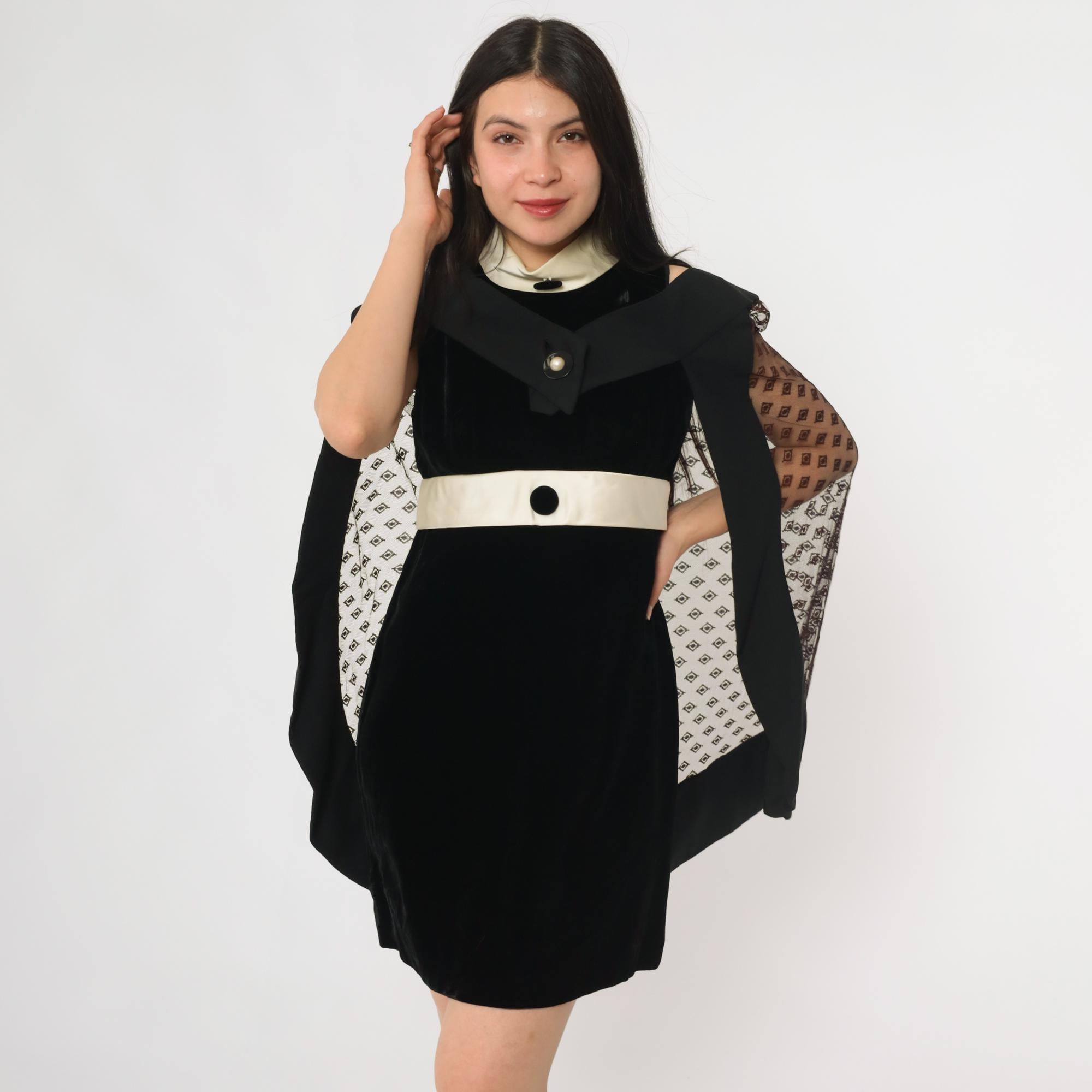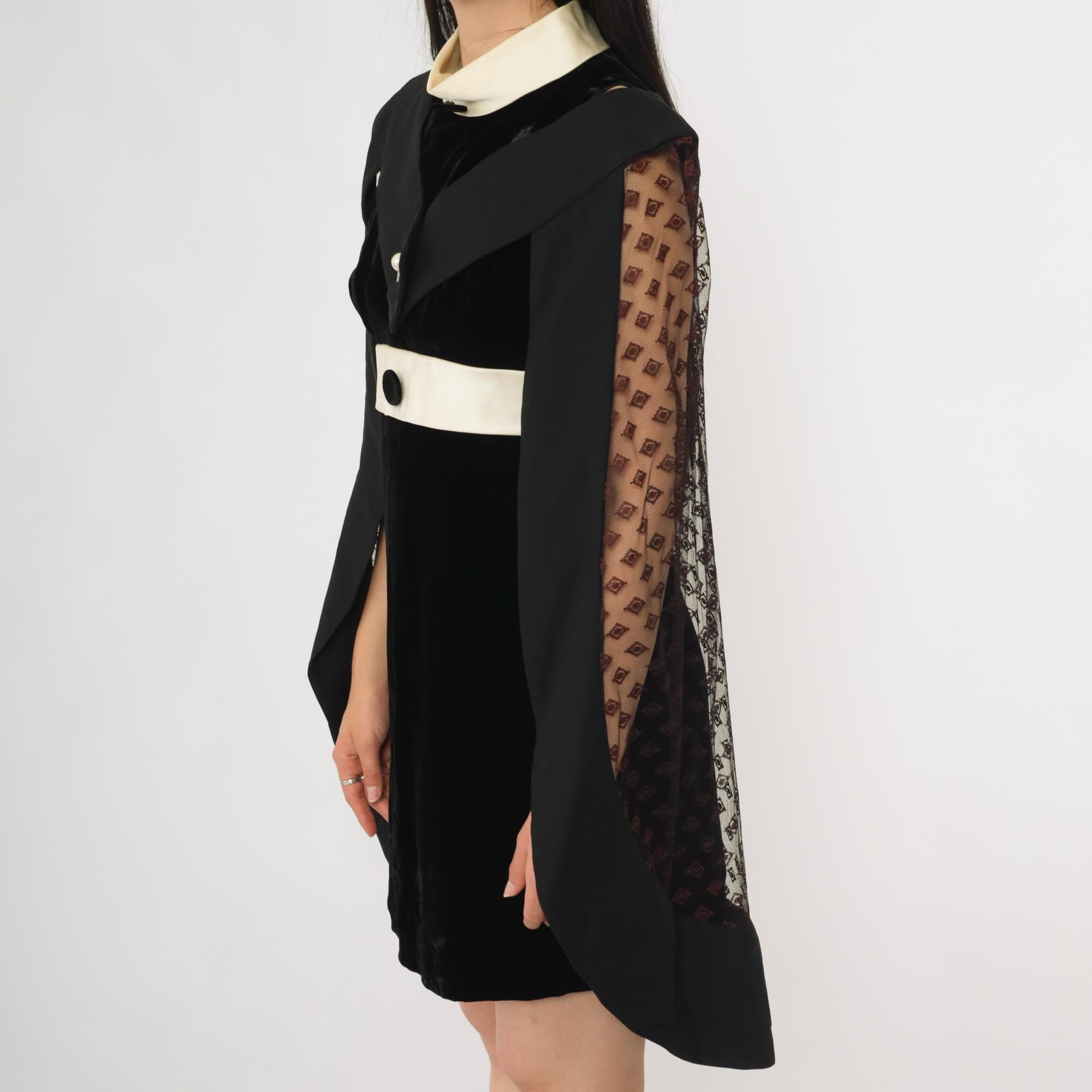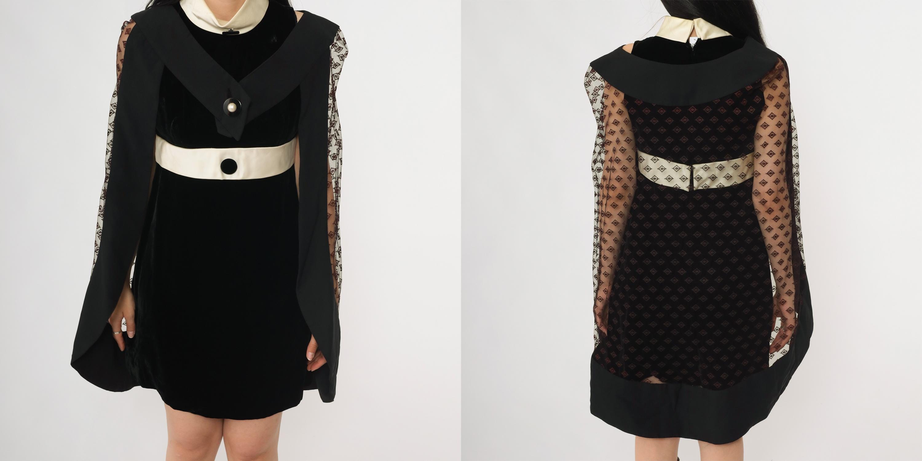 Vintage 60s sheer black lace cape featuring a geometric diamond pattern throughout. This cape has an open front with a lightweight drape and a dramatic mod silhouette.