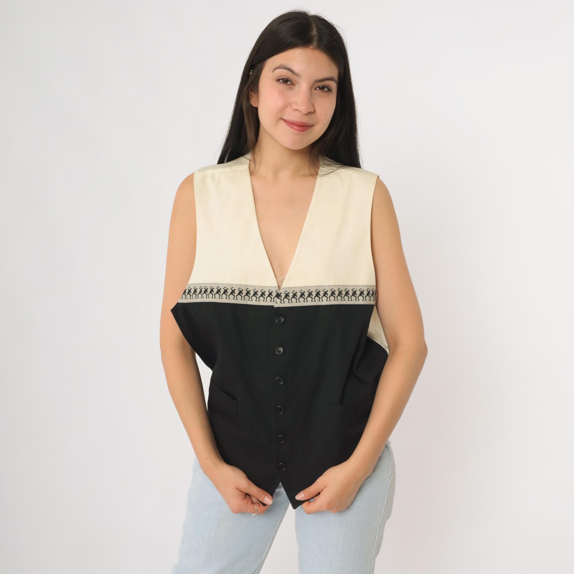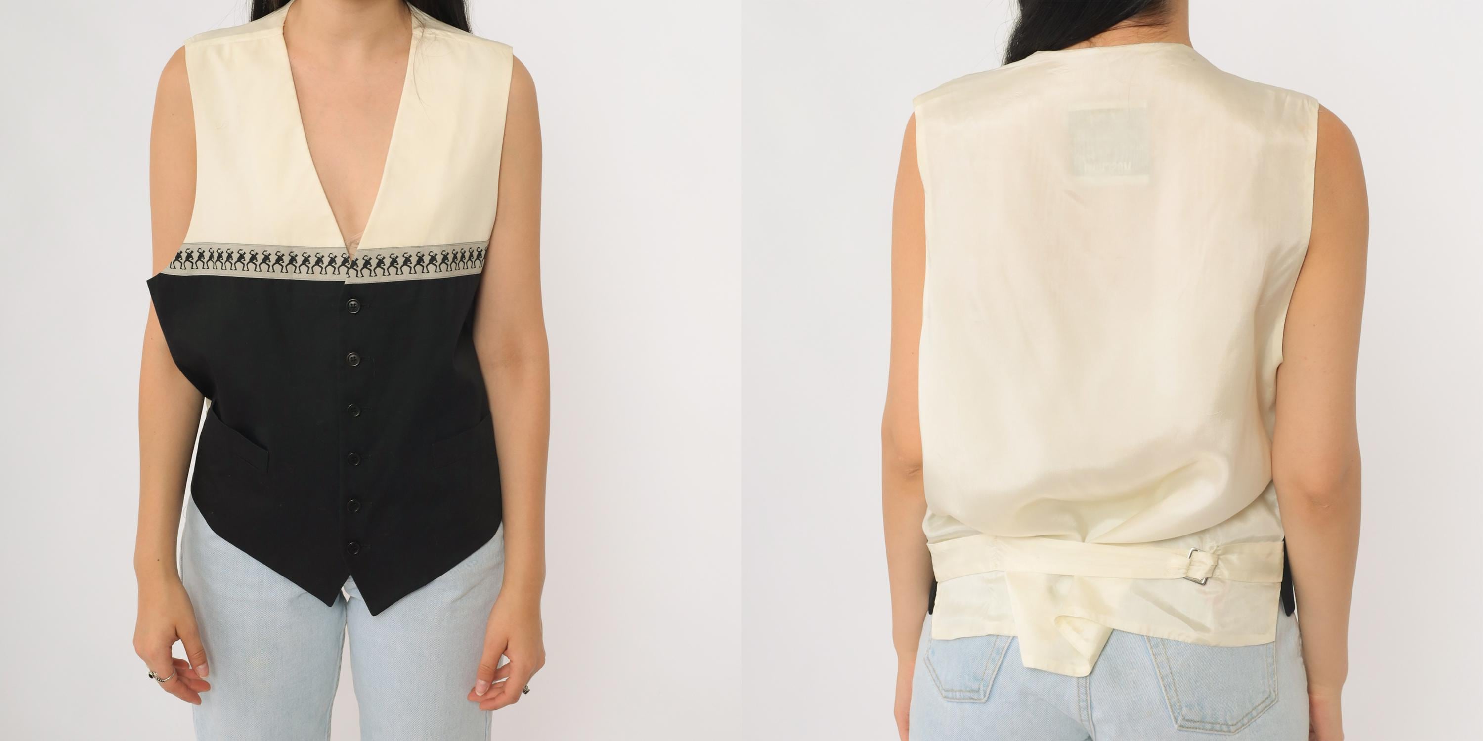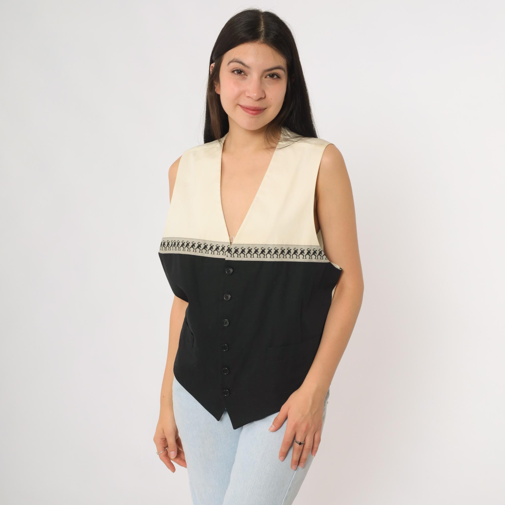 Vintage 90s Moschino Cheap and Chic vest in a black and white colorblock design. Features a novelty border print across the chest, a tailored fit, and button front closure with welt pockets. Fully lined with an adjustable back strap.
