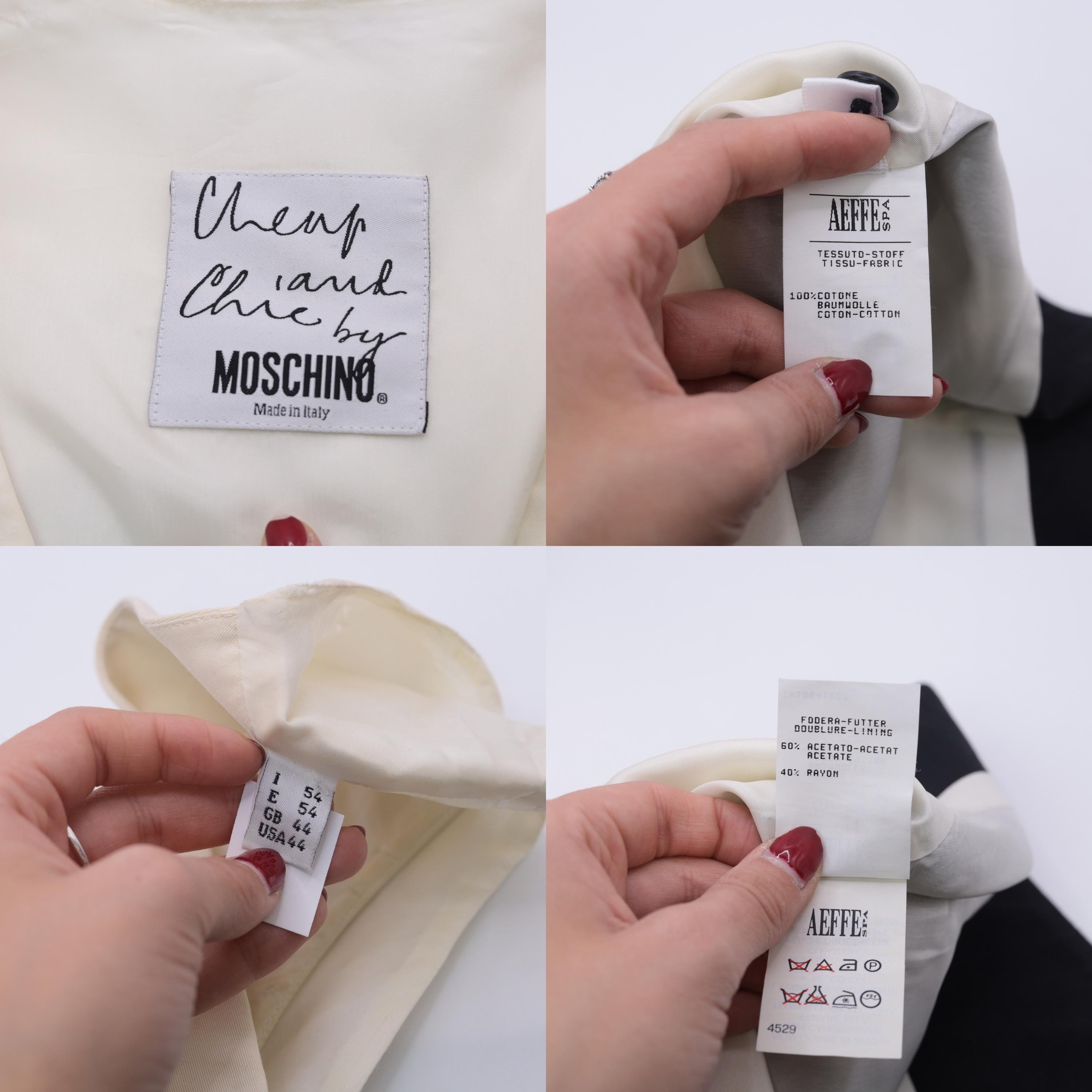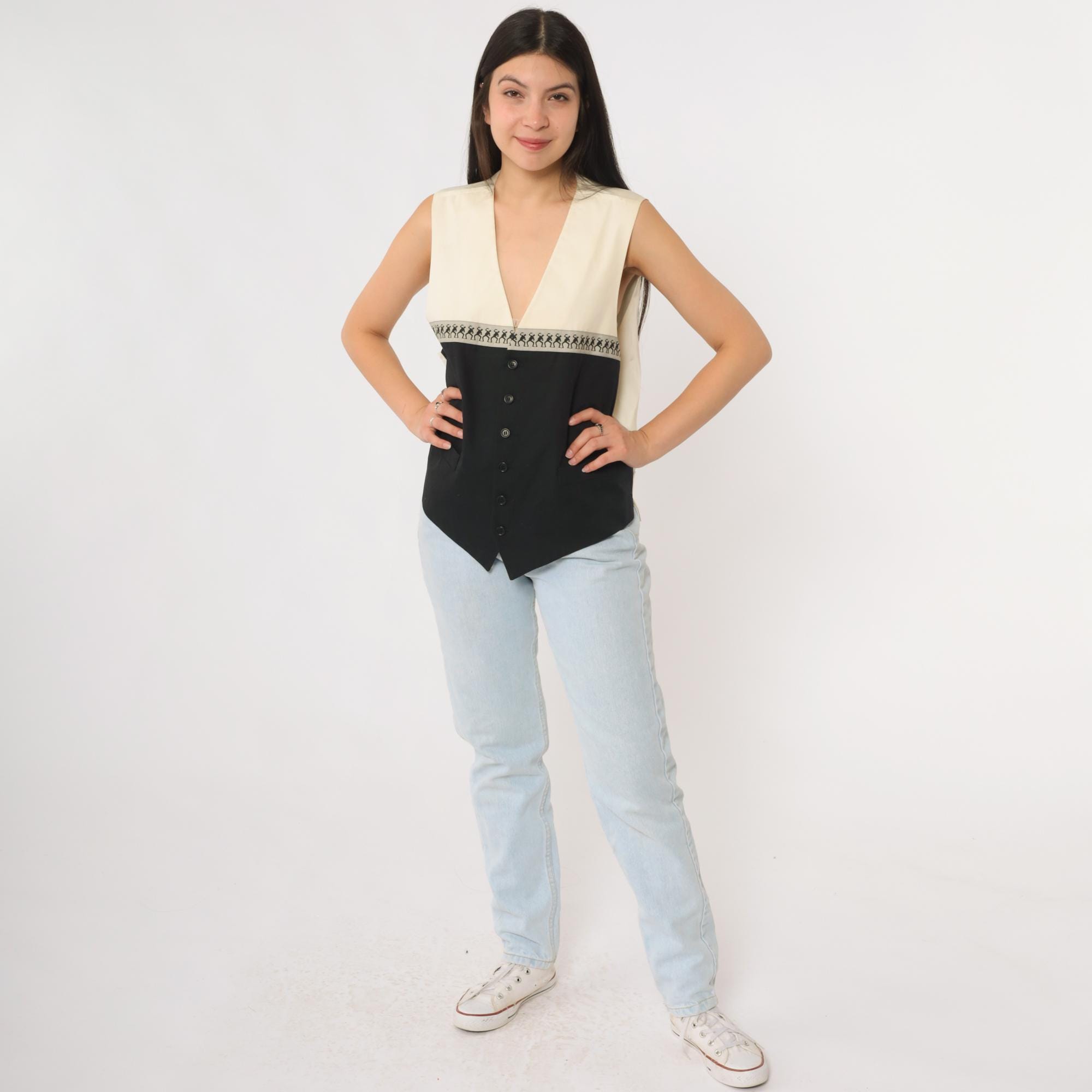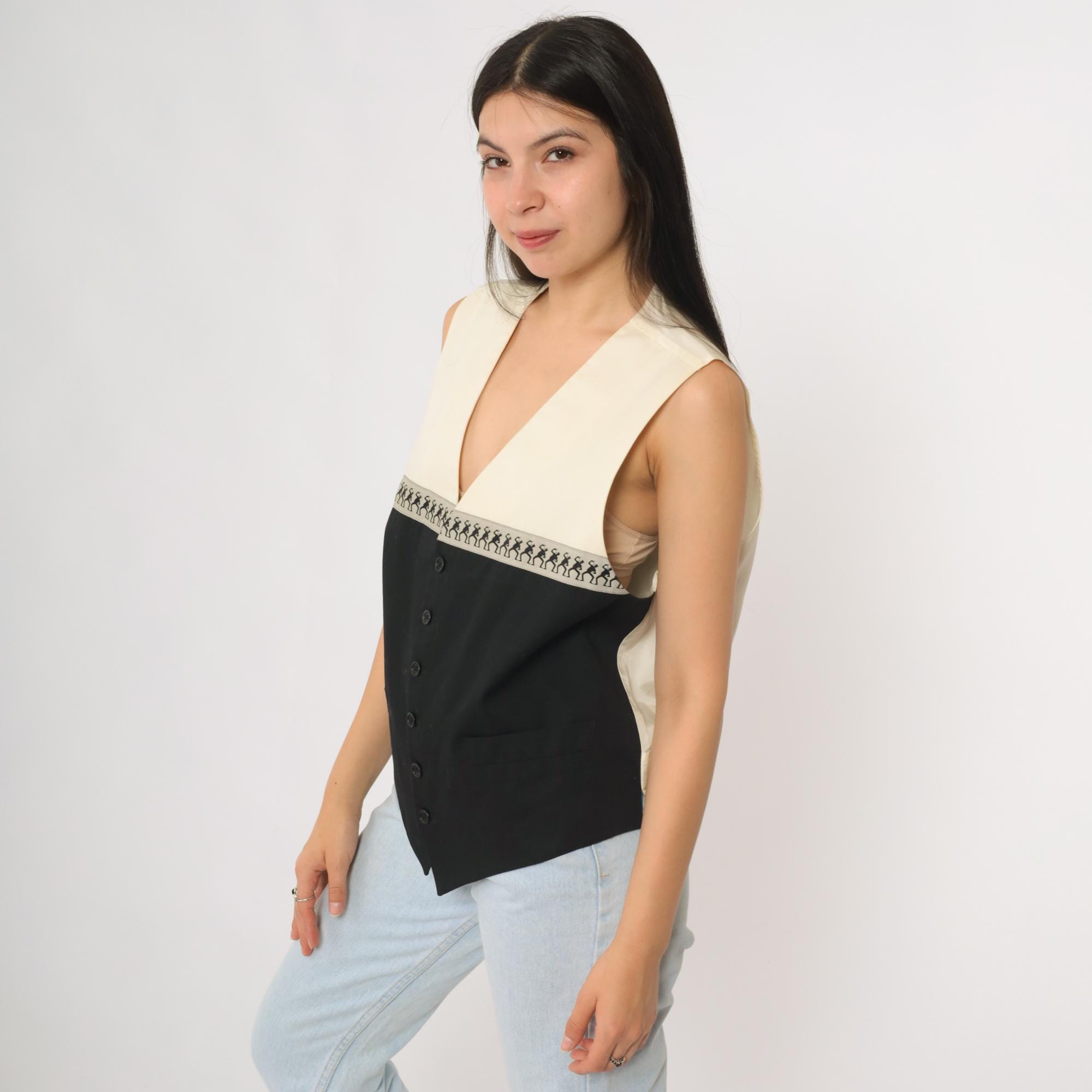 Vintage 90s Moschino Cheap and Chic vest in a black and white colorblock design. Features a novelty border print across the chest, a tailored fit, and button front closure with welt pockets. Fully lined with an adjustable back strap.