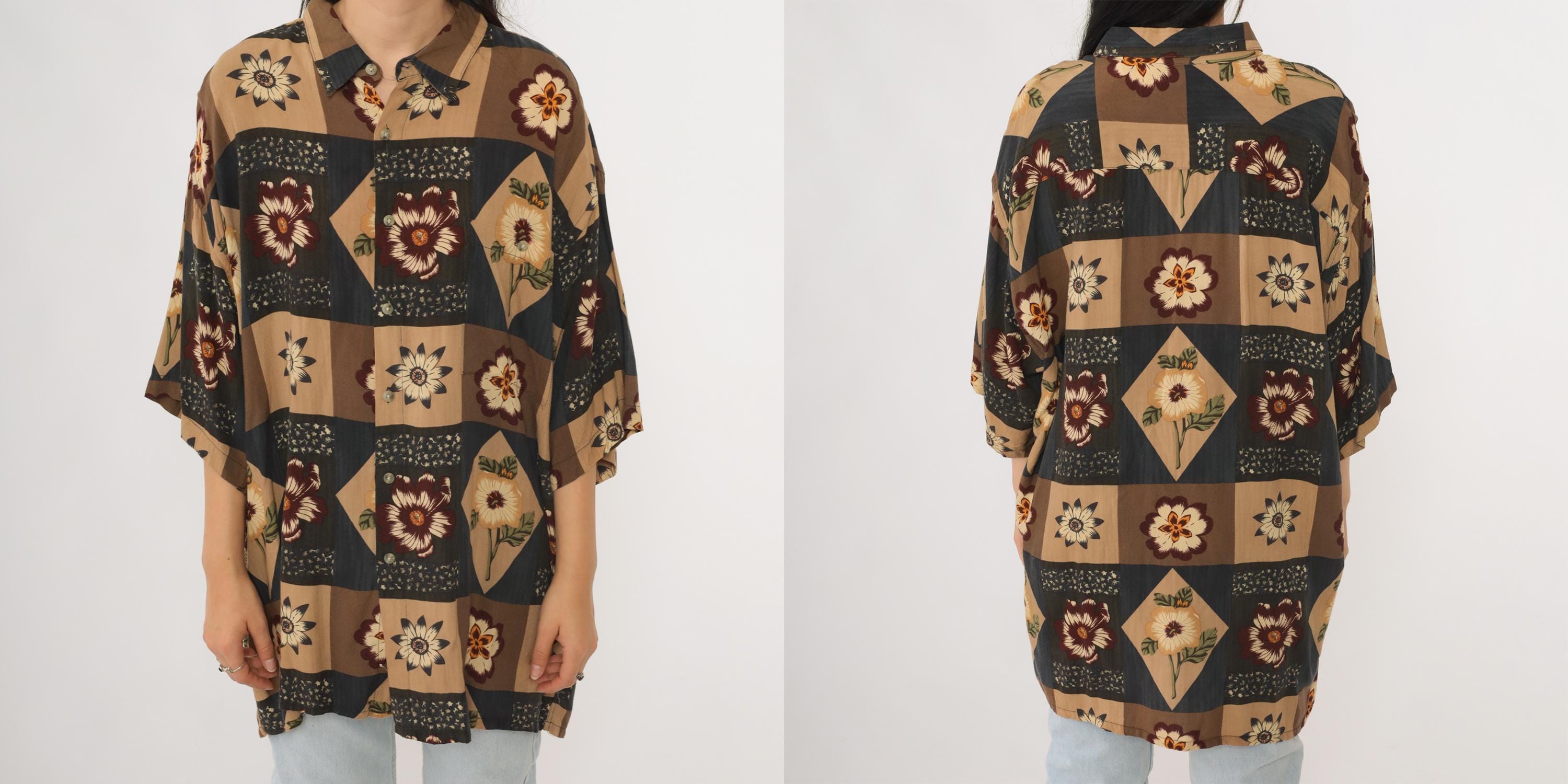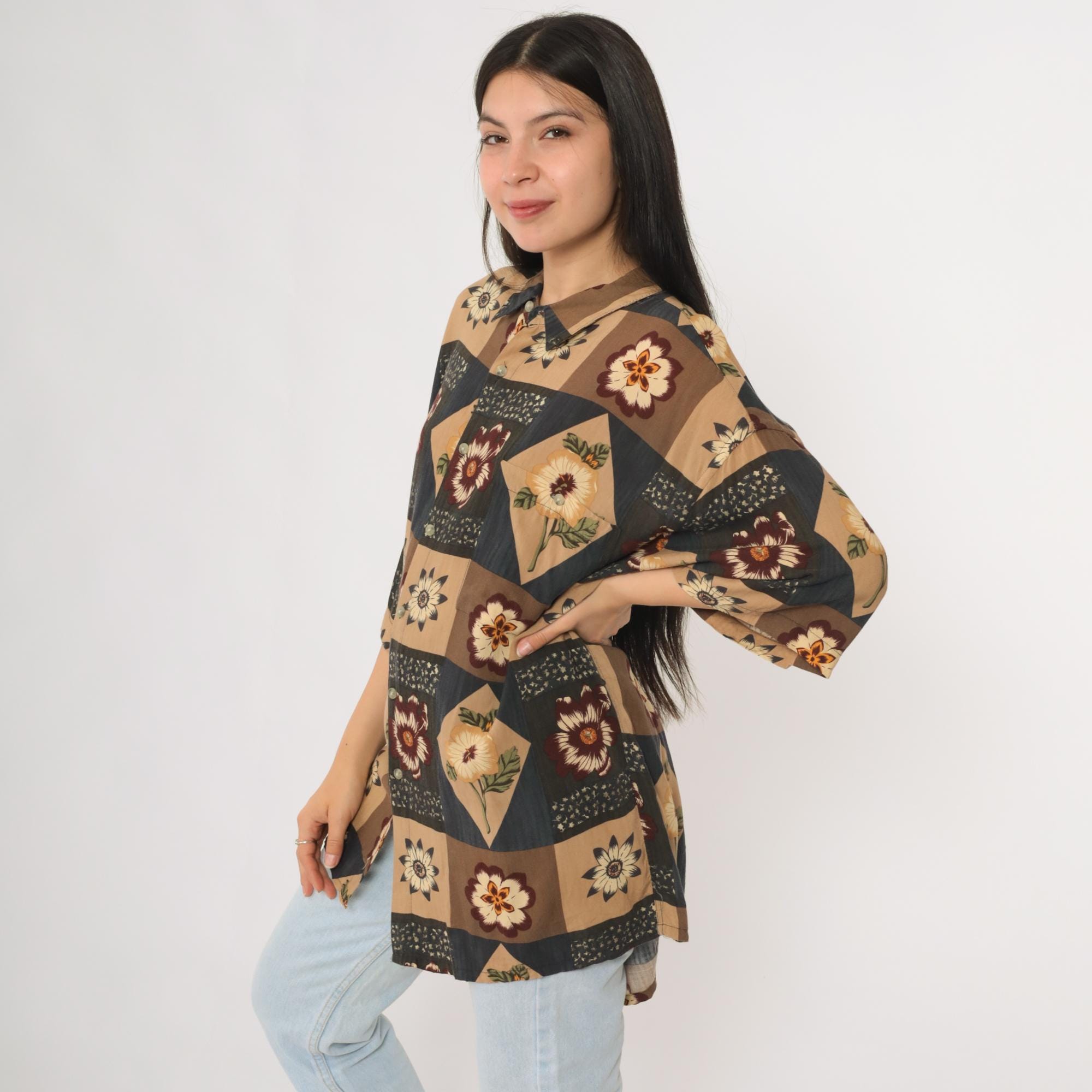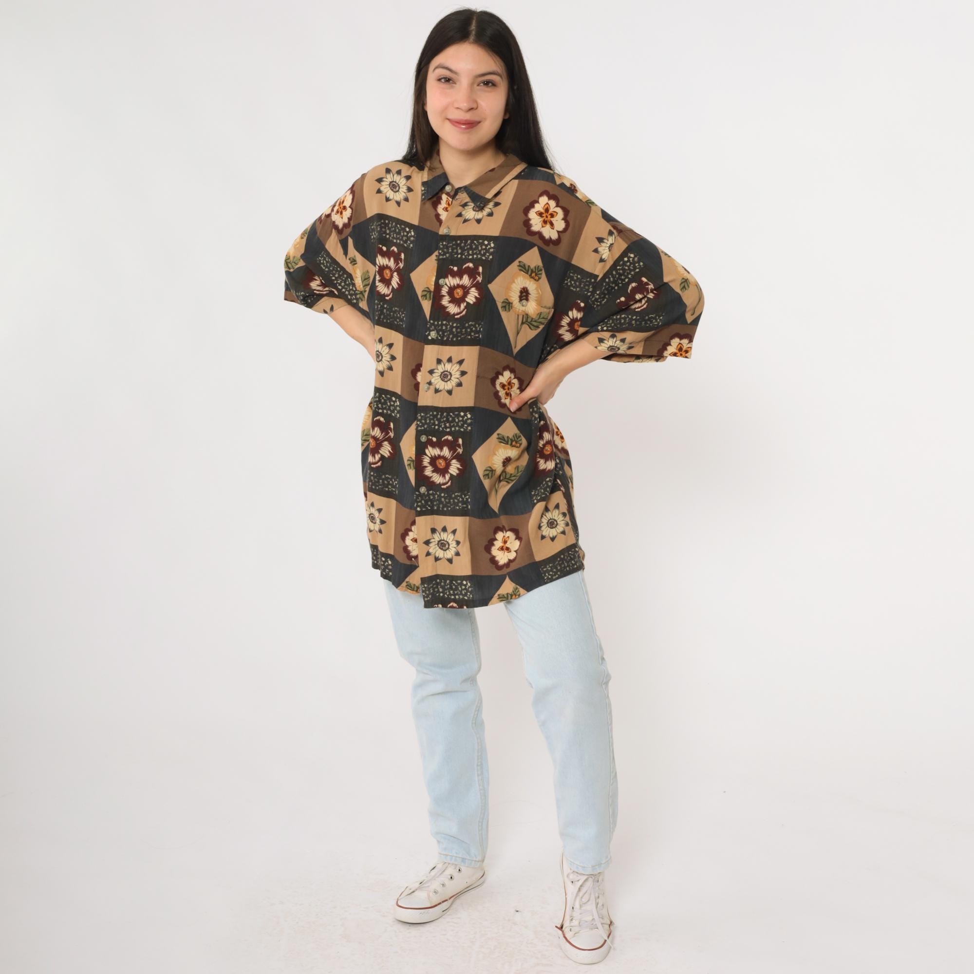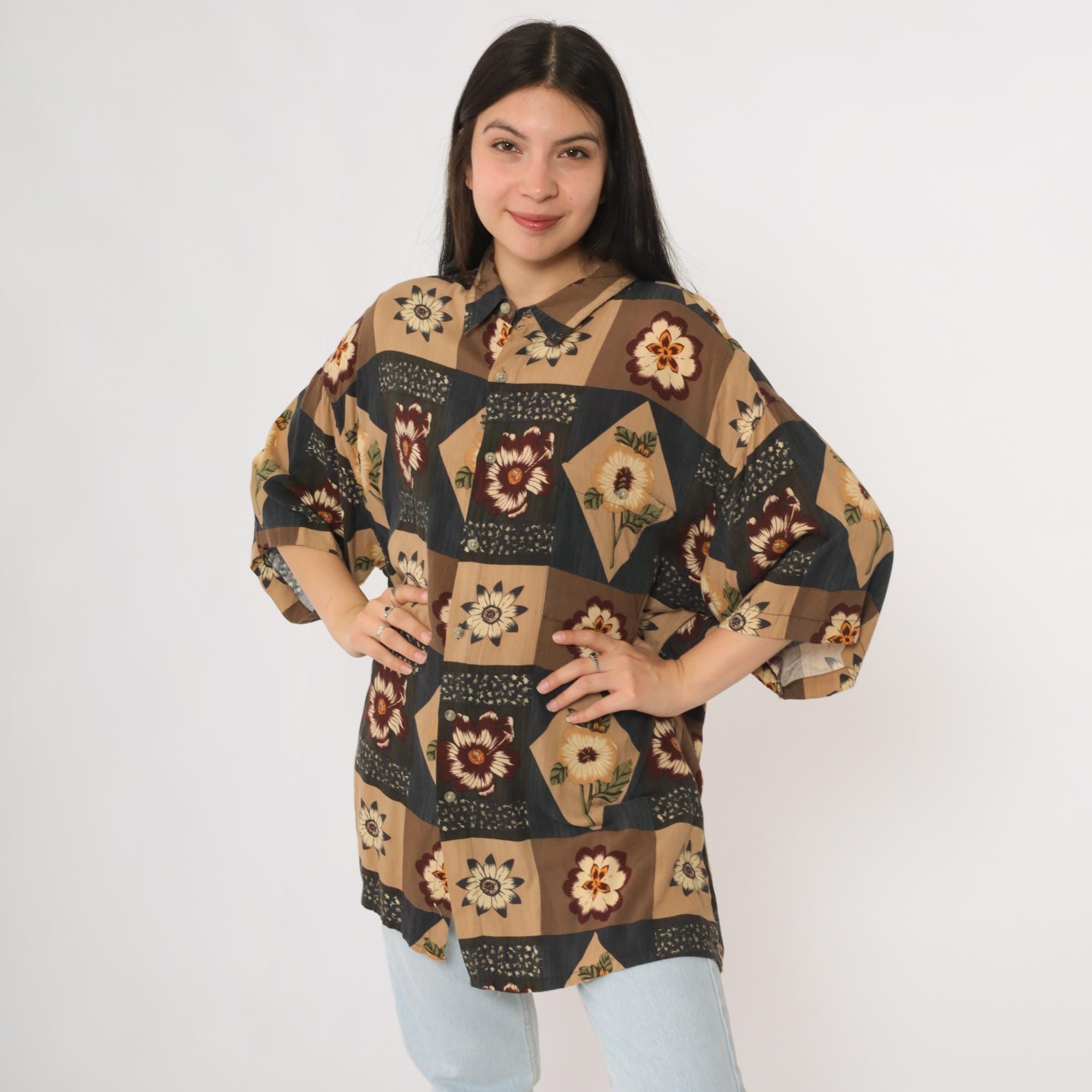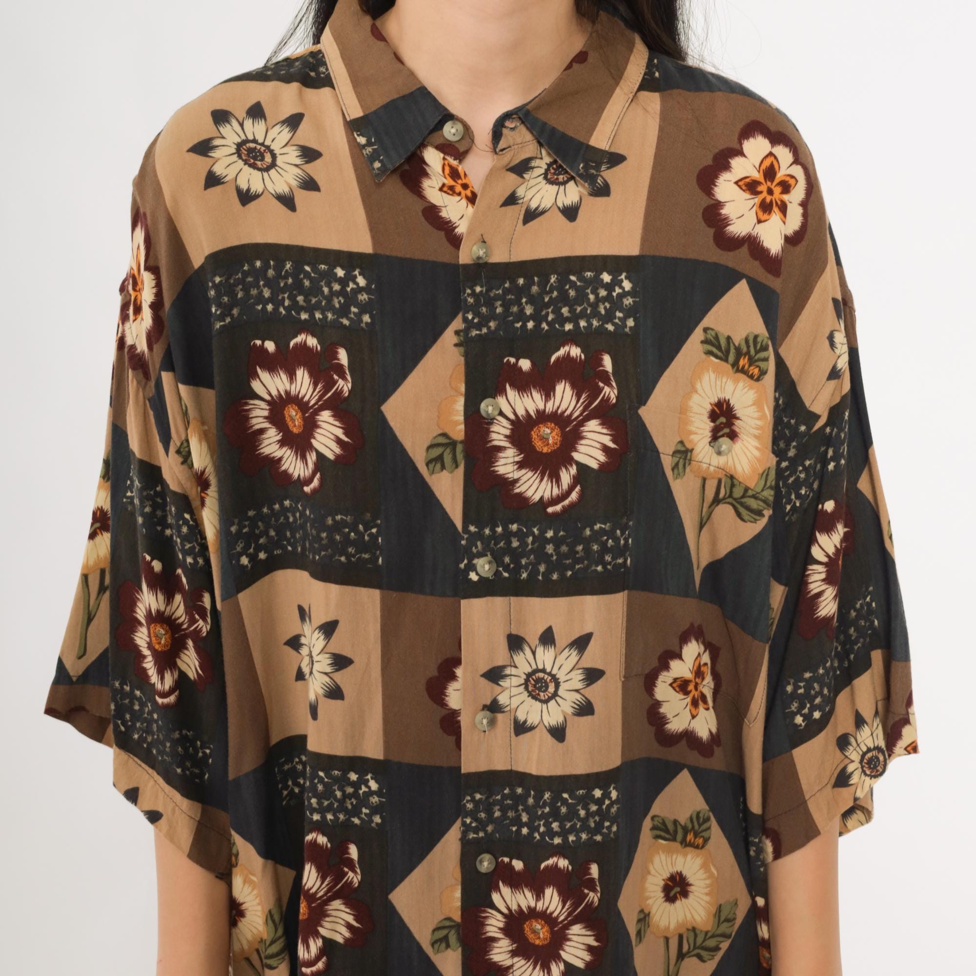 Vintage 90s Campia short sleeve button down shirt featuring a bold floral block print in shades of brown, beige, black, and red. Constructed from lightweight rayon with a pointed collar and straight hem.