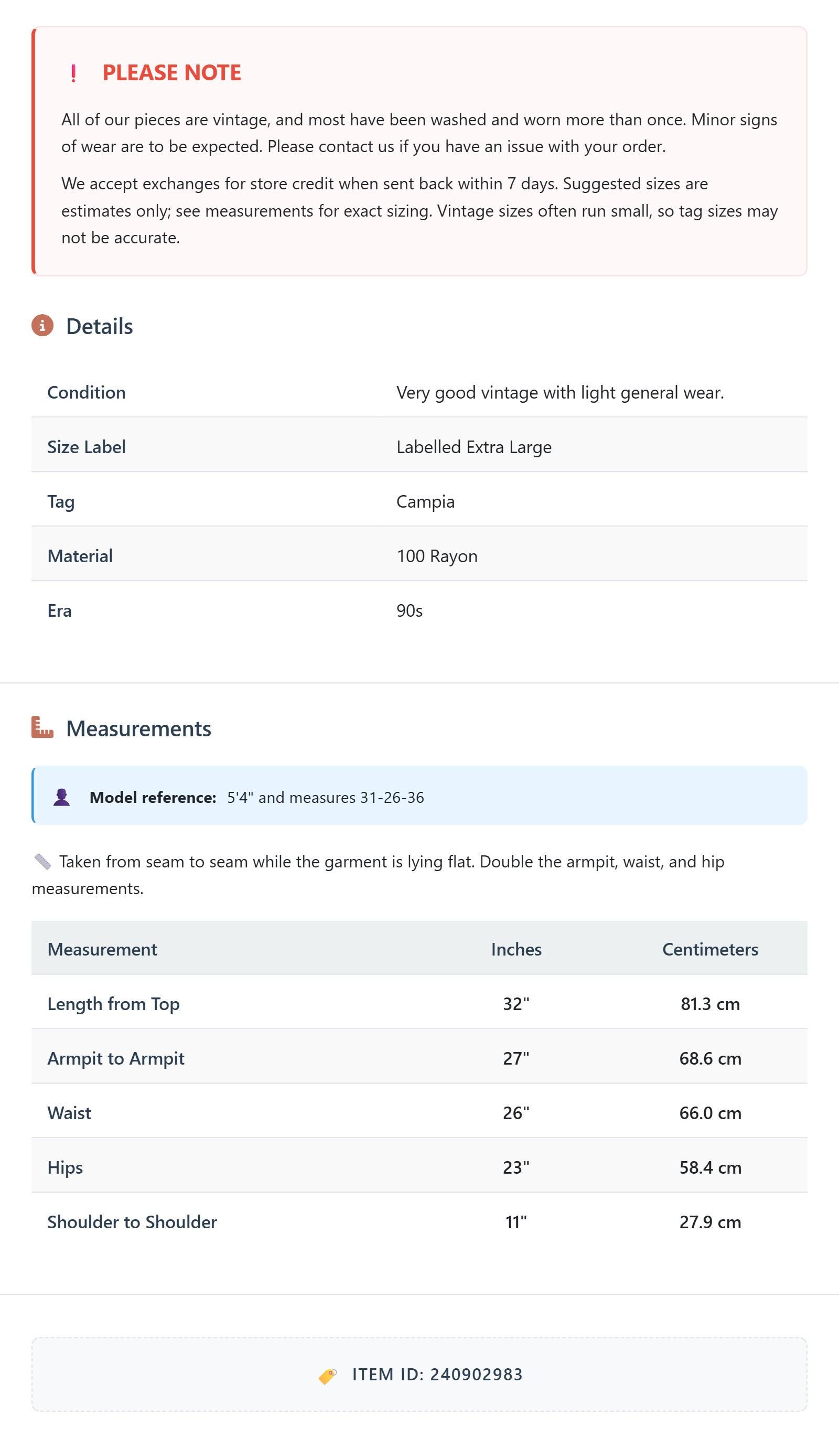 Suggested sizes are estimates only; see measurements for exact sizing. Vintage sizes often run small, so tag sizes may not be accurate.