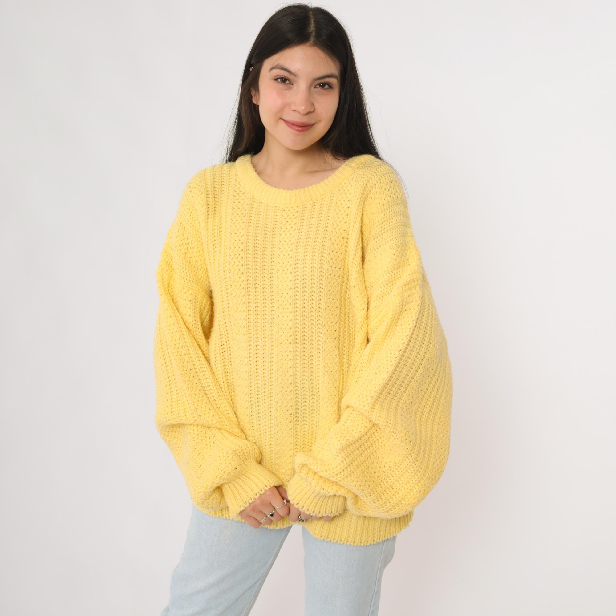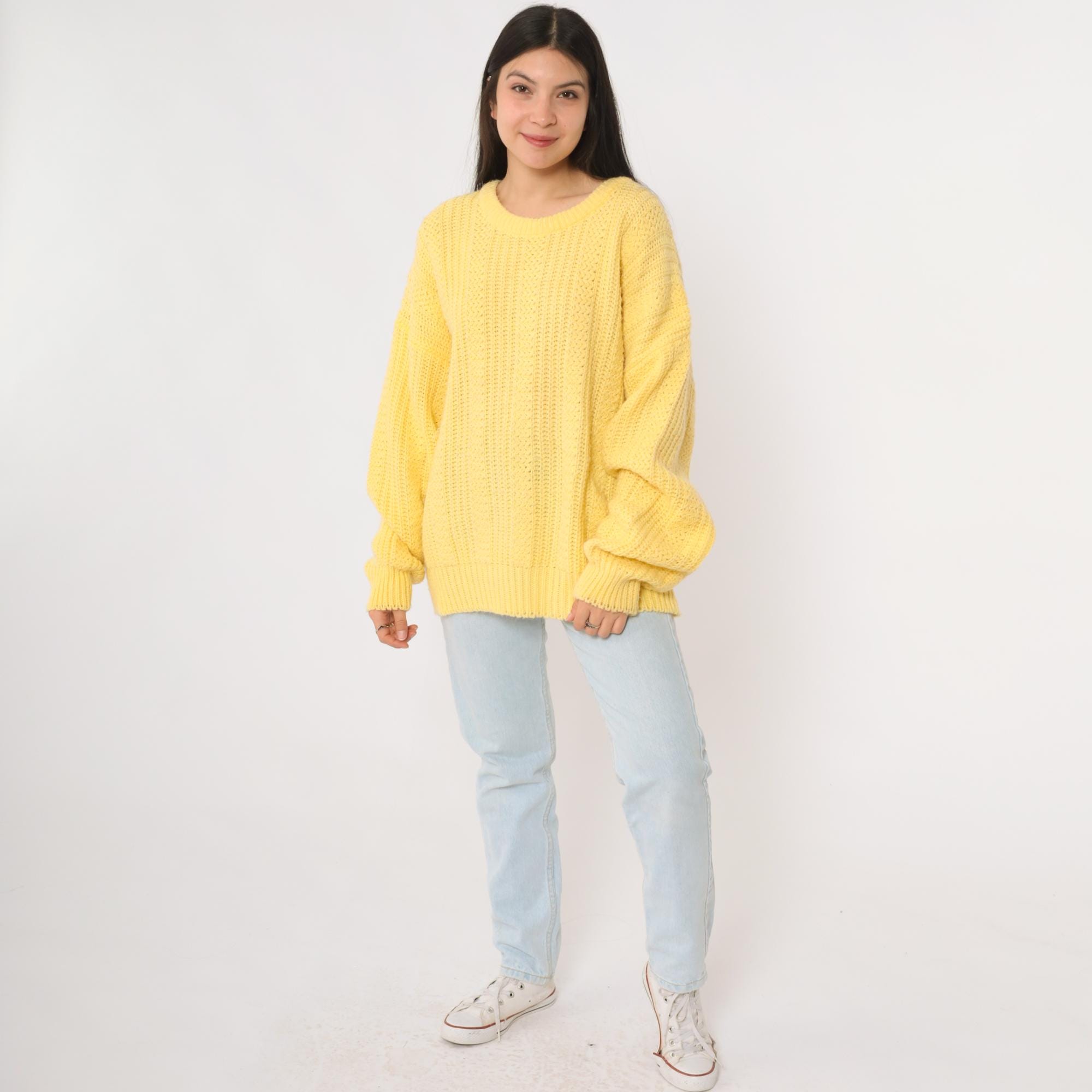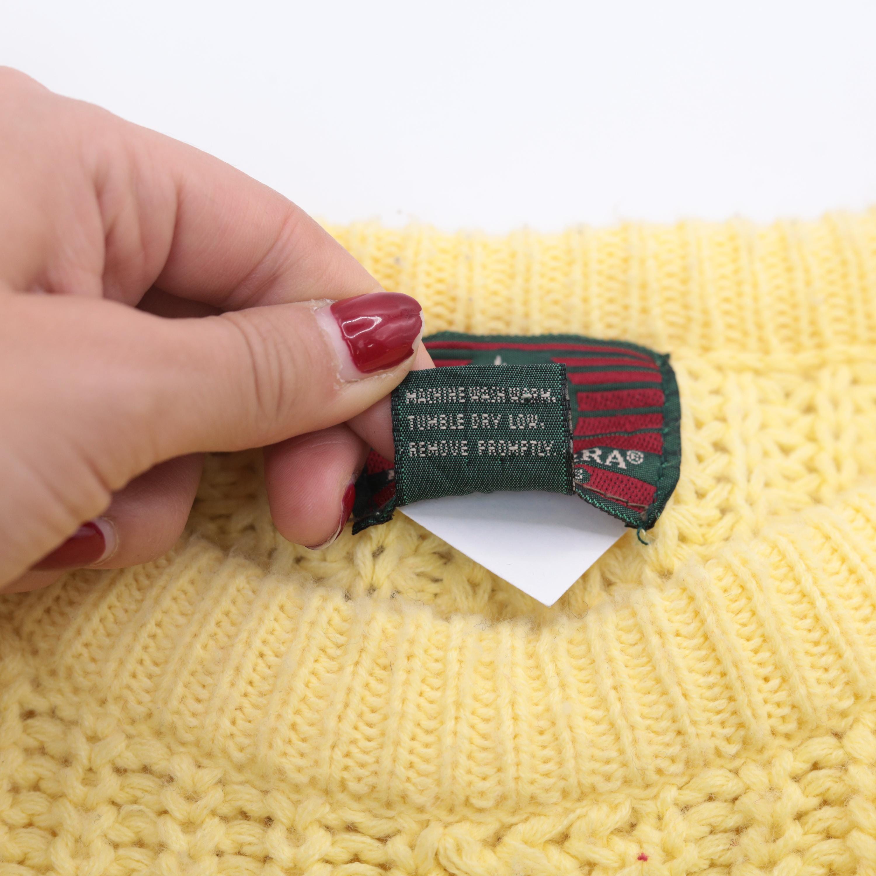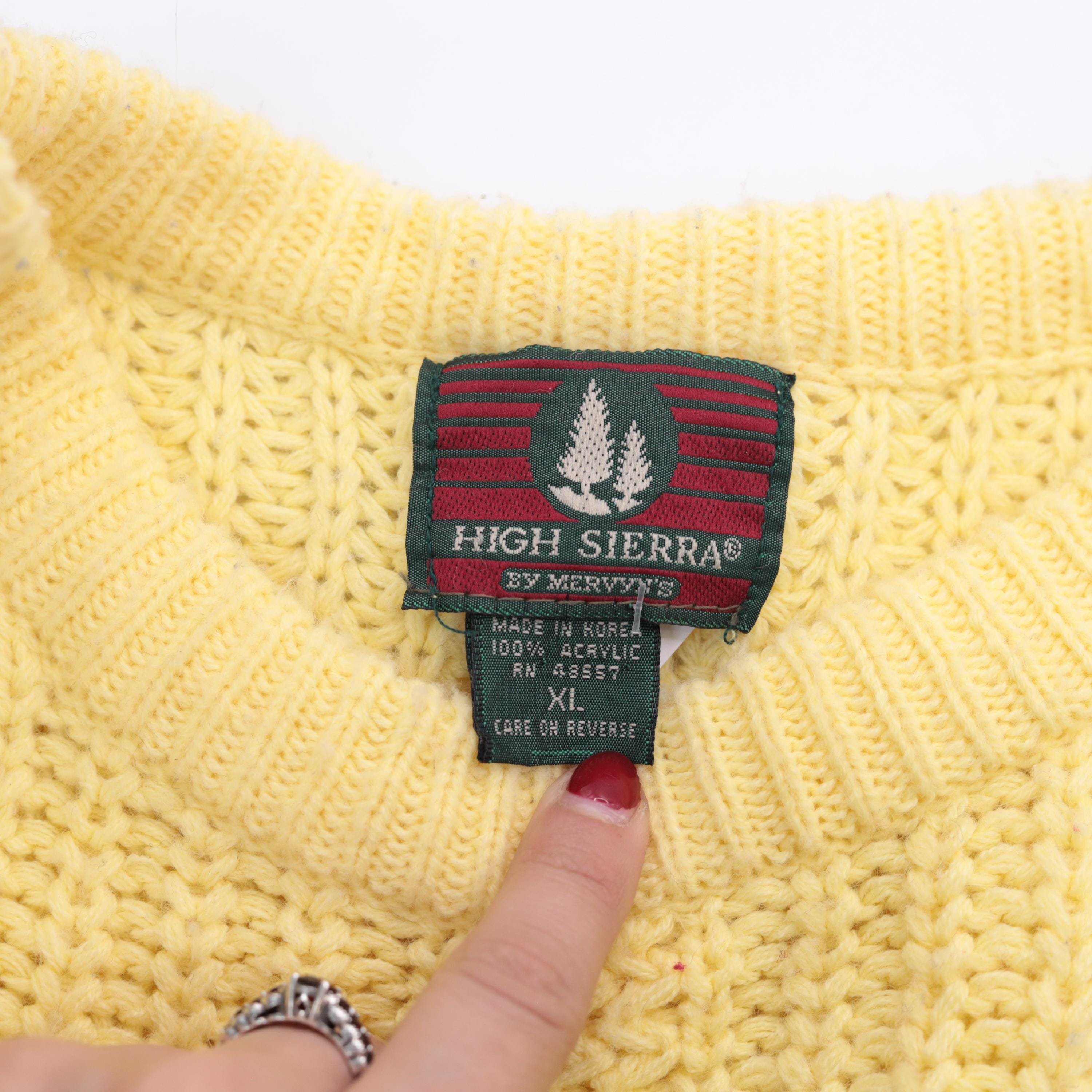 Vintage 90s High Sierra by Mervyns yellow knit sweater featuring a chunky textured knit design. This oversized pullover includes a classic crewneck, dropped shoulders, and long sleeves. Cozy and slouchy fit perfect for layering in winter.