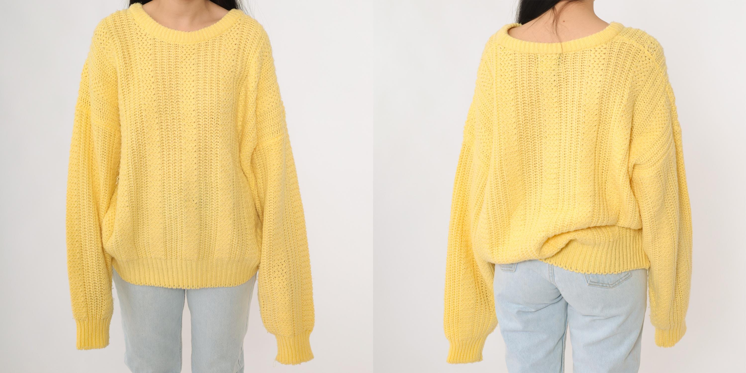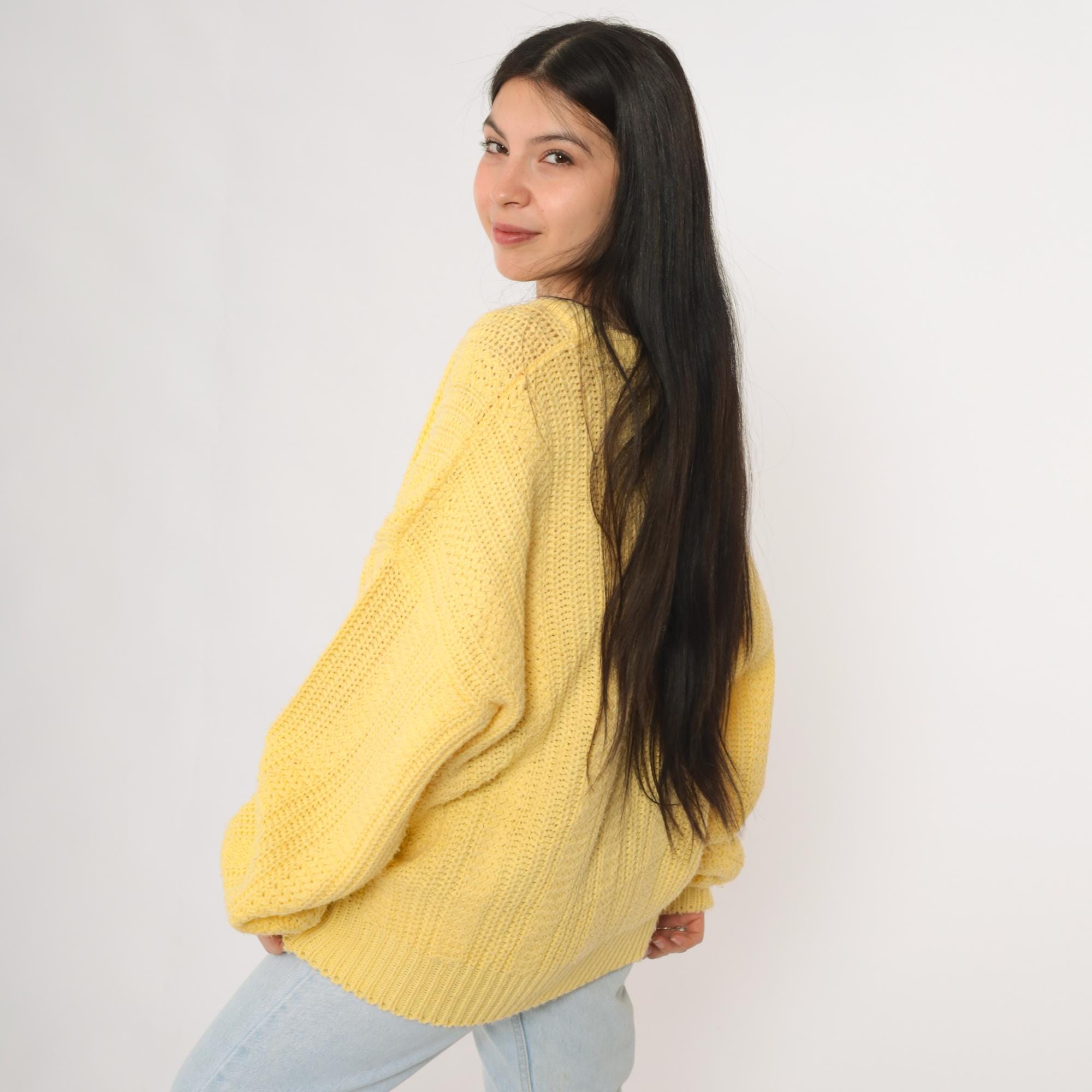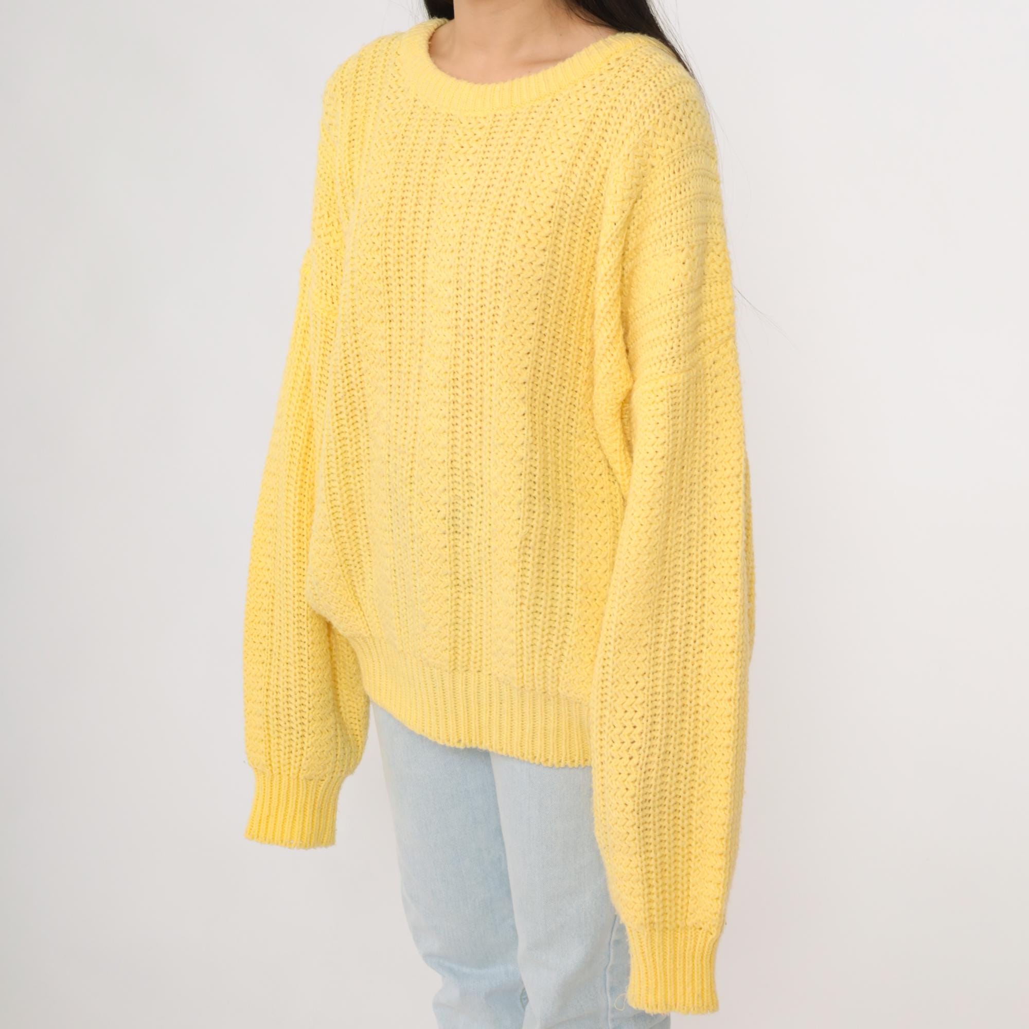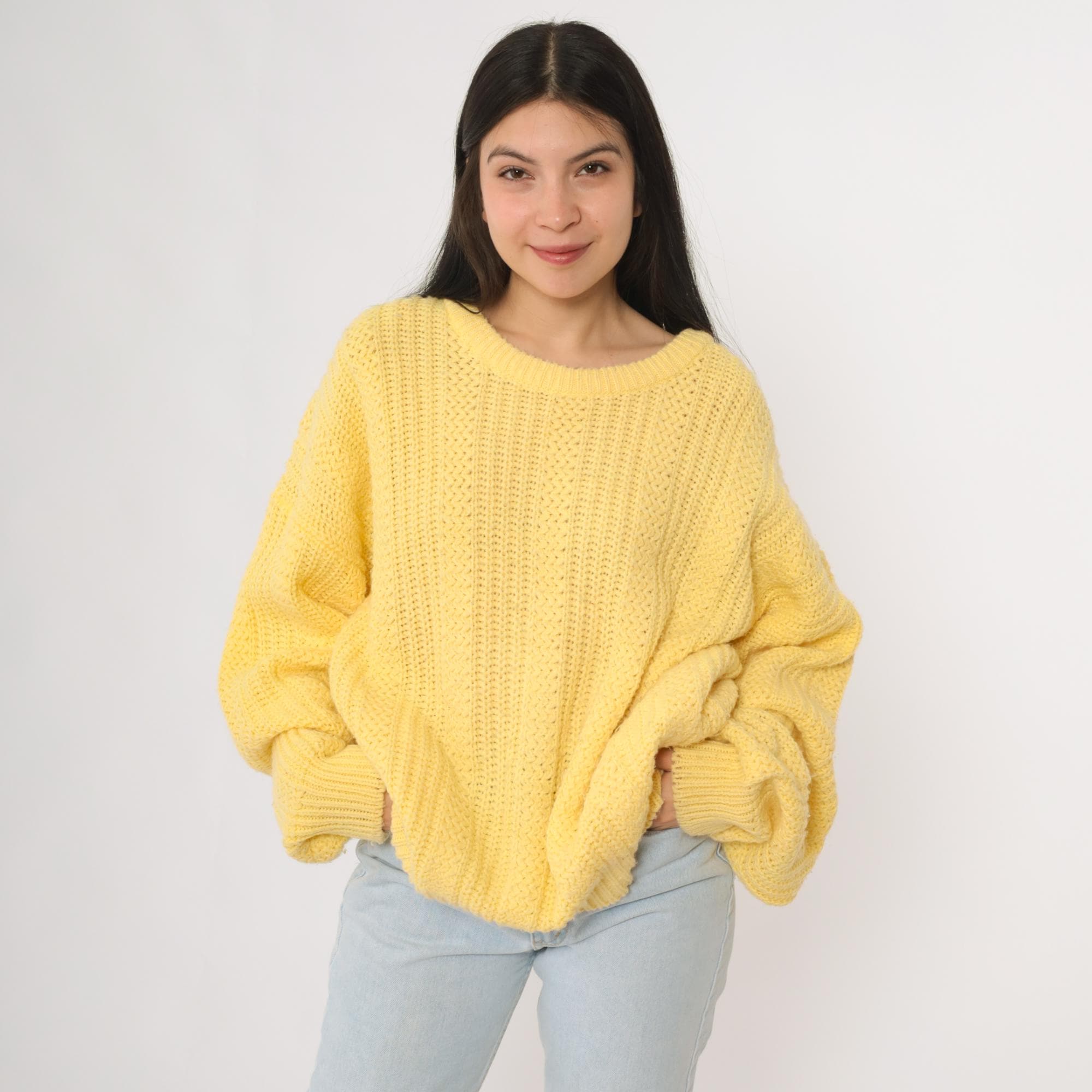 Vintage 90s High Sierra by Mervyns yellow knit sweater featuring a chunky textured knit design. This oversized pullover includes a classic crewneck, dropped shoulders, and long sleeves. Cozy and slouchy fit perfect for layering in winter.