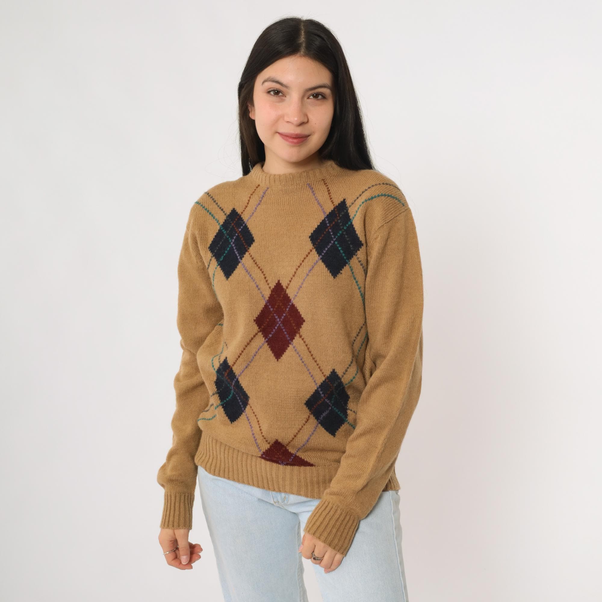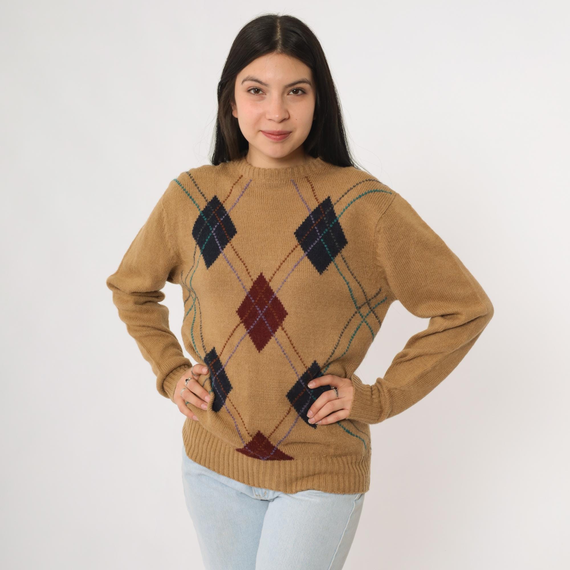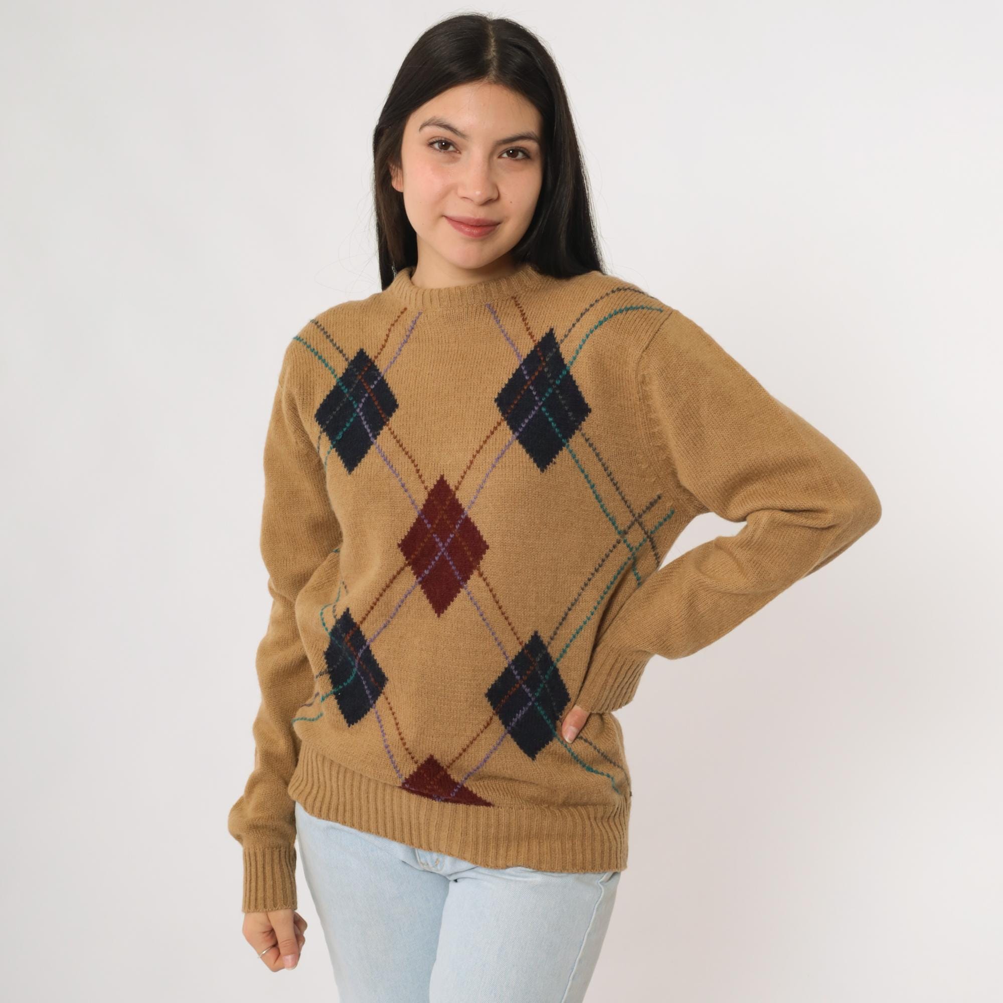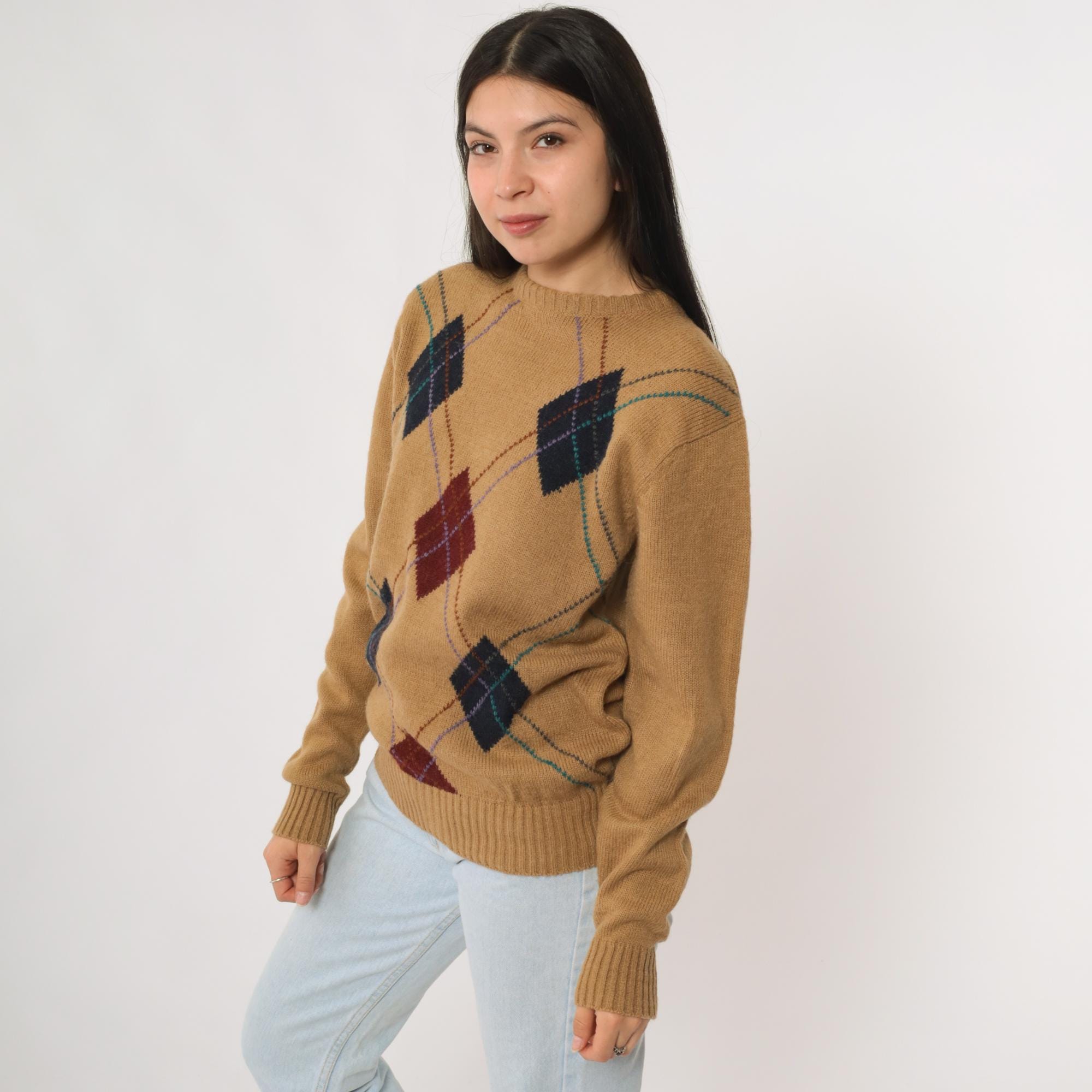 Vintage 80s Le Tigre sweater in a camel brown knit featuring a bold argyle diamond pattern in burgundy, navy, green, and purple. This pullover has long sleeves, ribbed cuffs and hem, and a classic crew neckline.