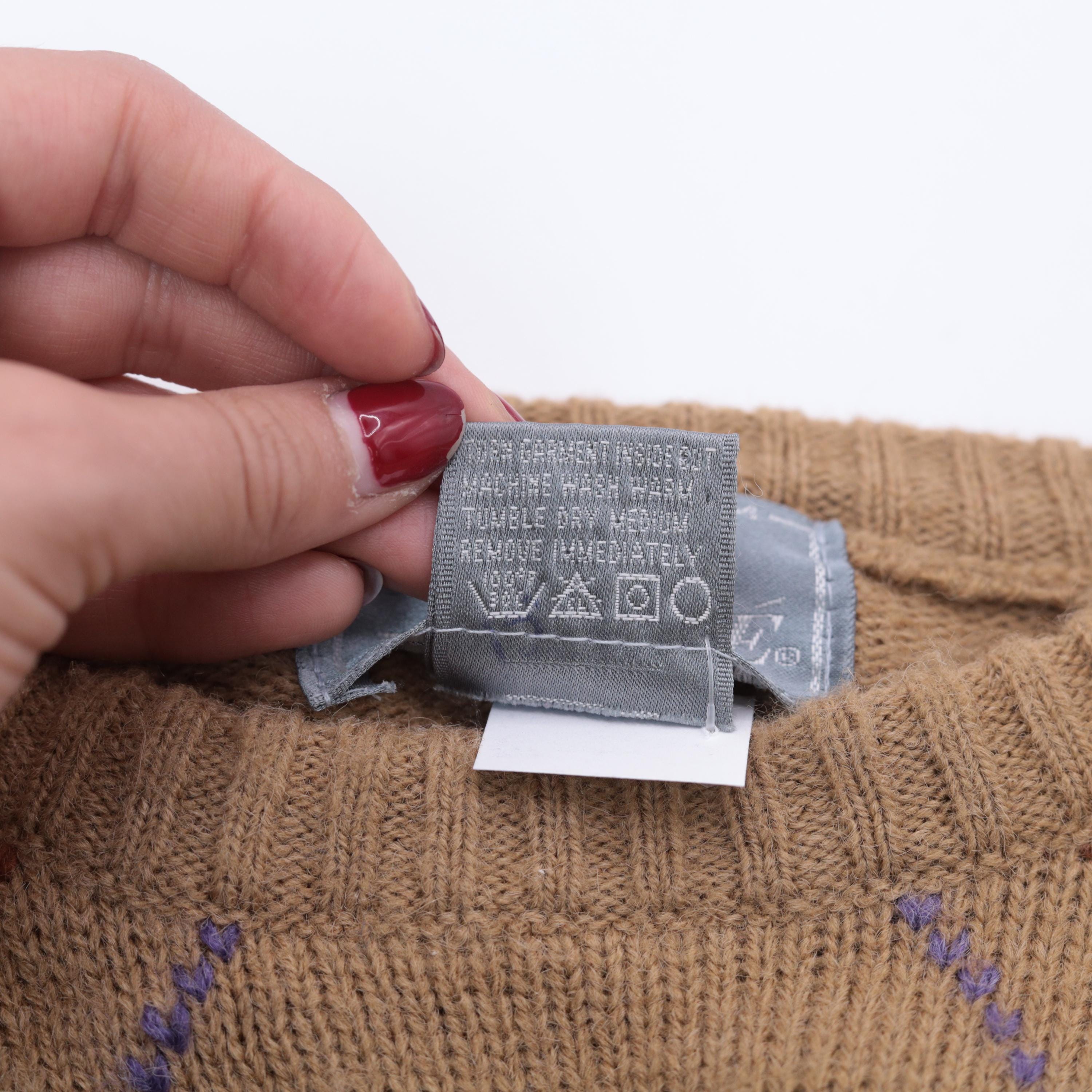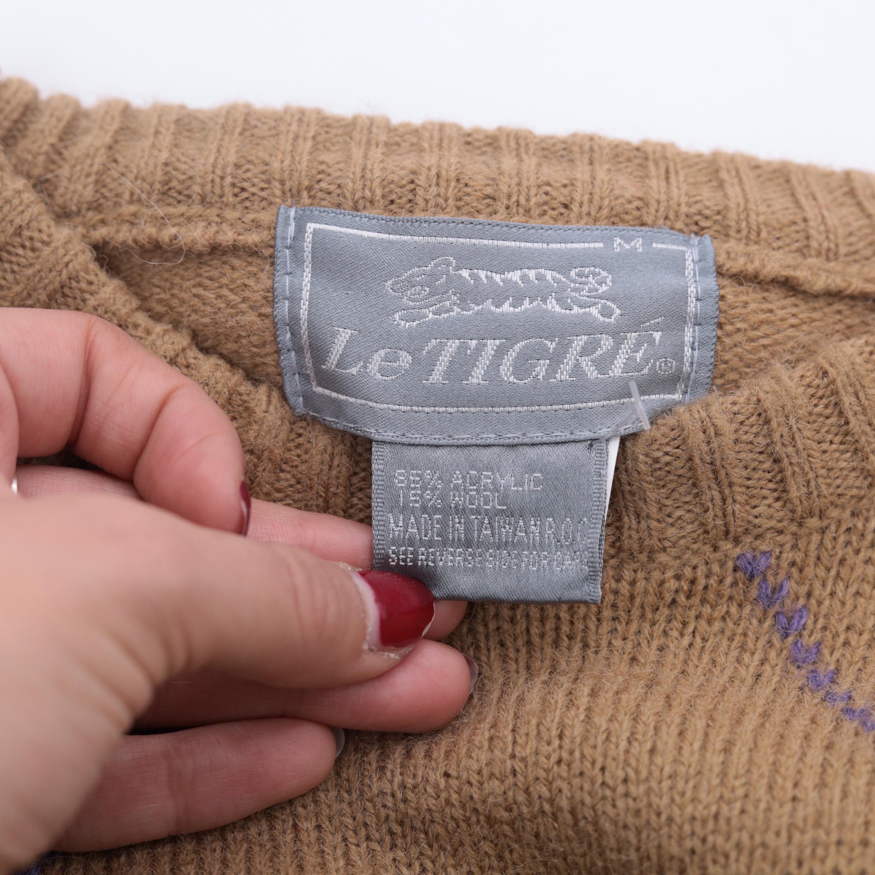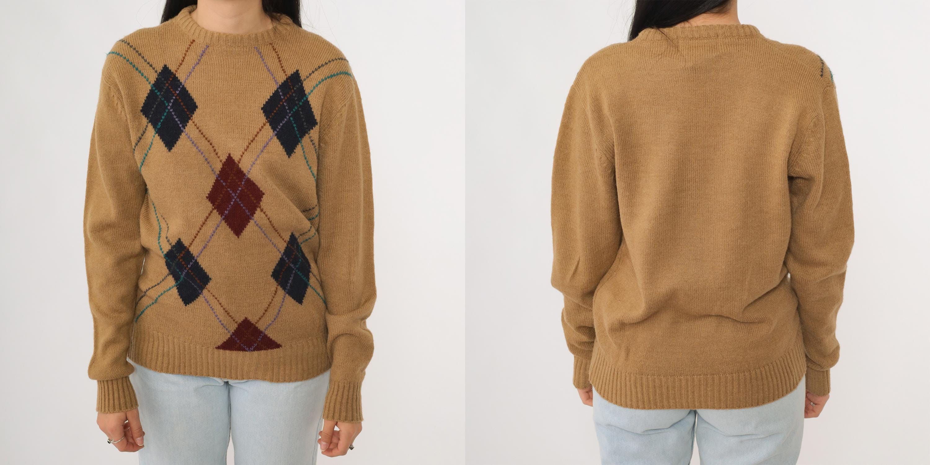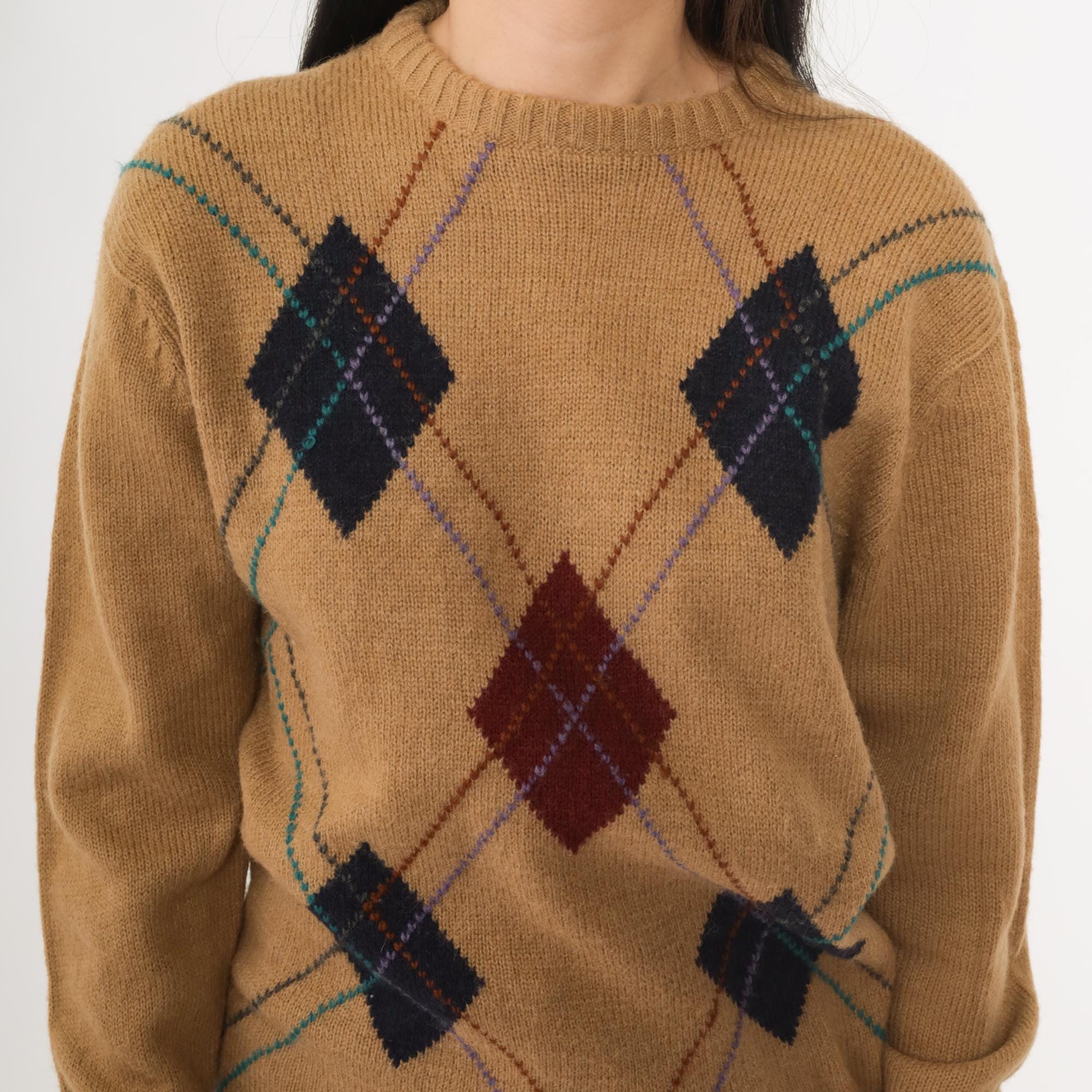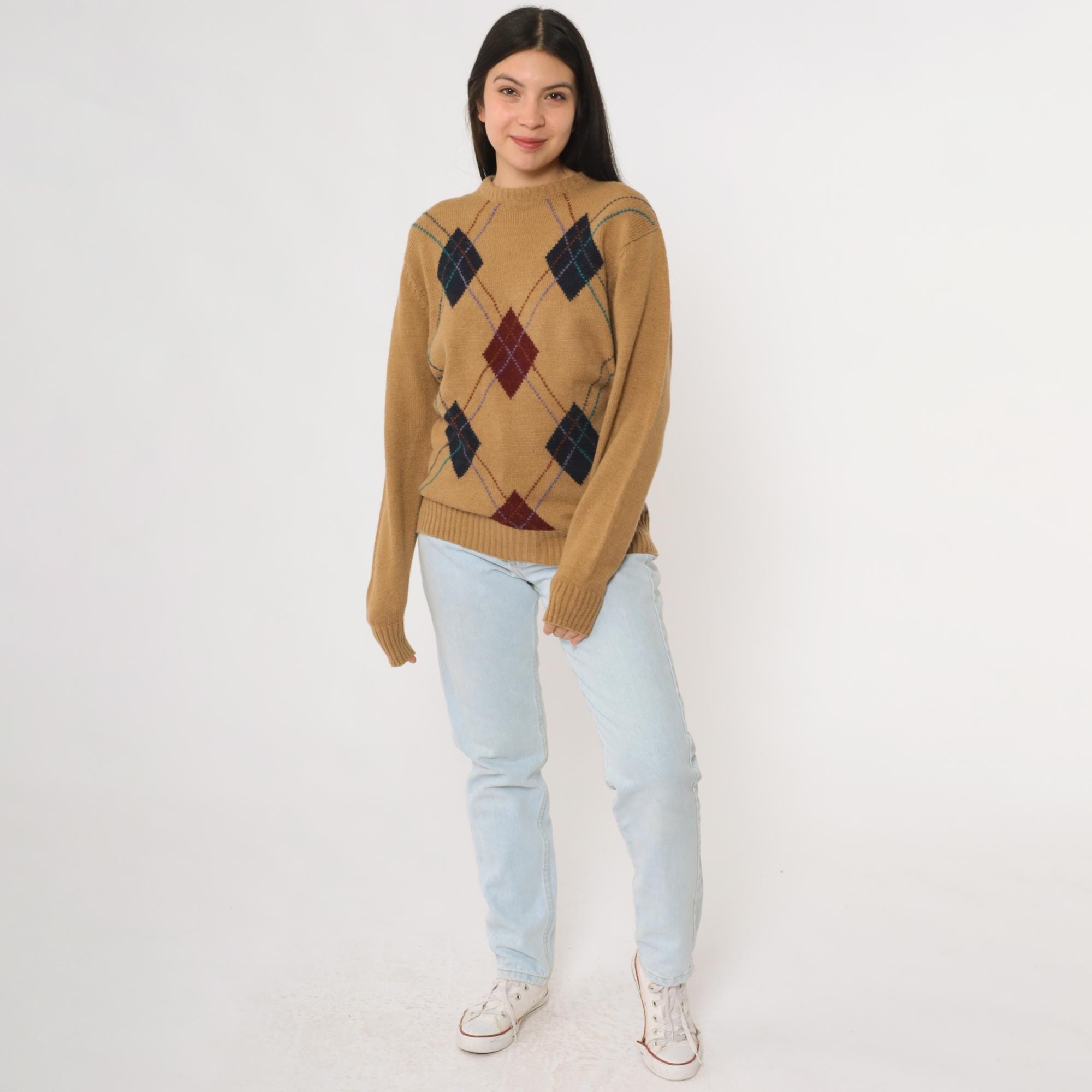 Vintage 80s Le Tigre sweater in a camel brown knit featuring a bold argyle diamond pattern in burgundy, navy, green, and purple. This pullover has long sleeves, ribbed cuffs and hem, and a classic crew neckline.