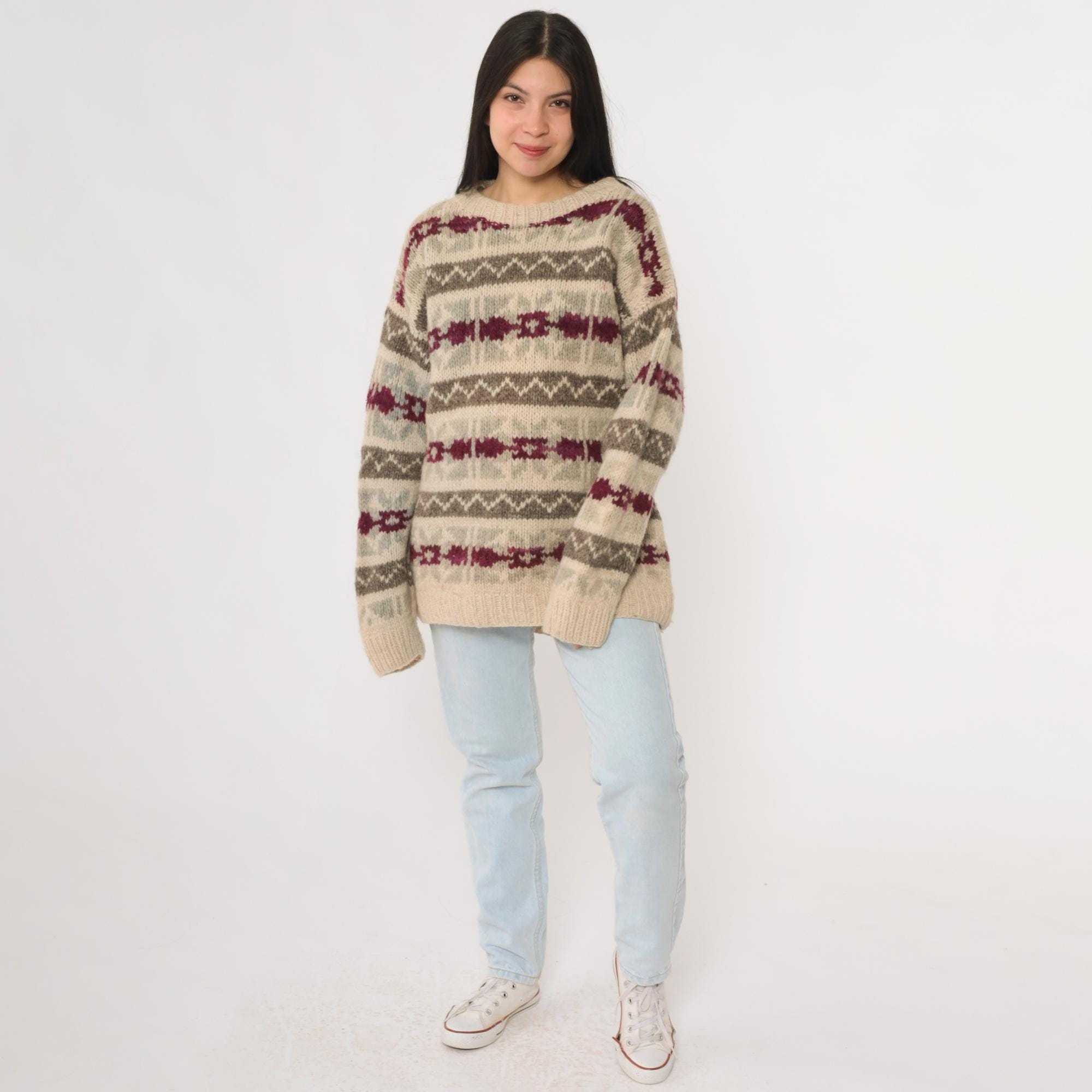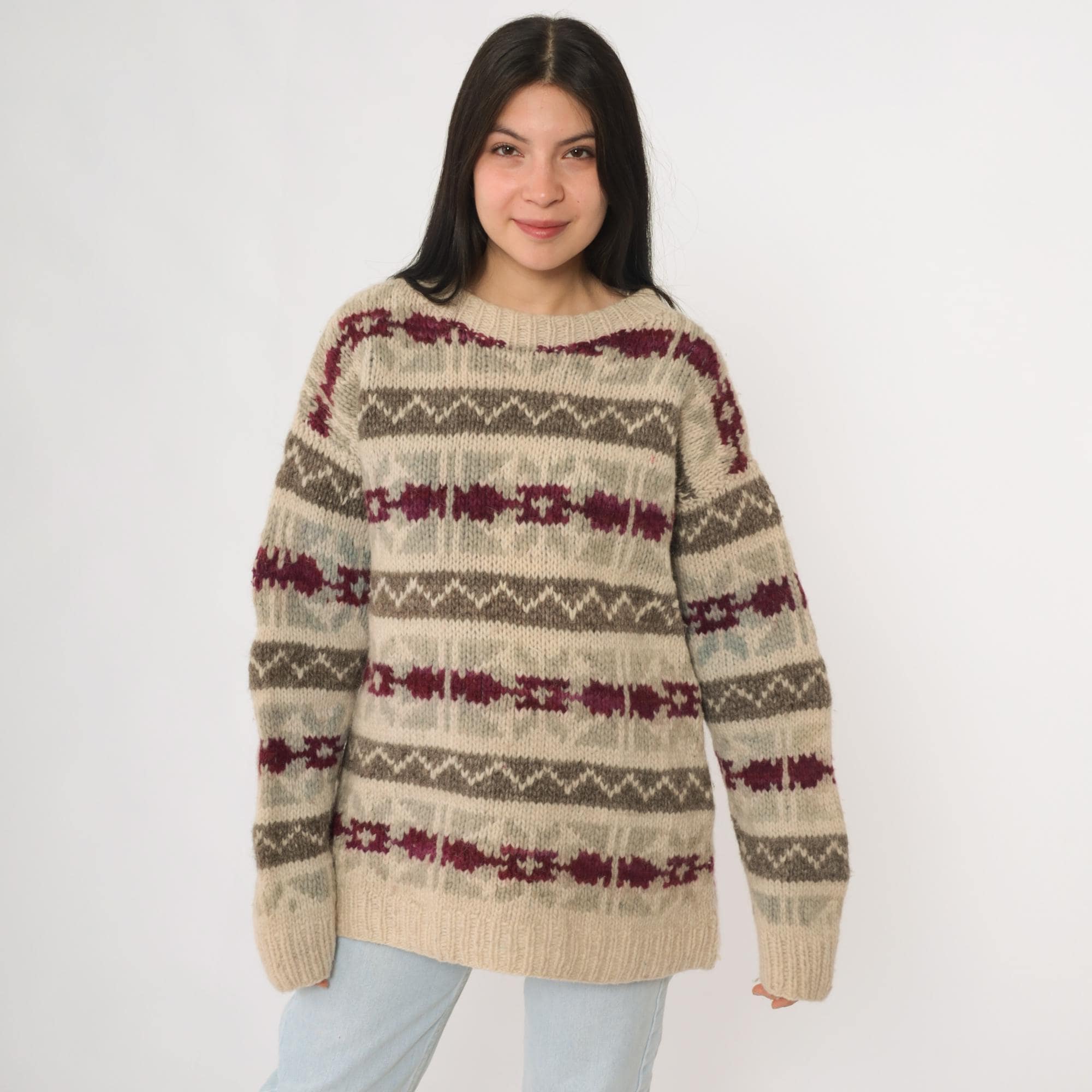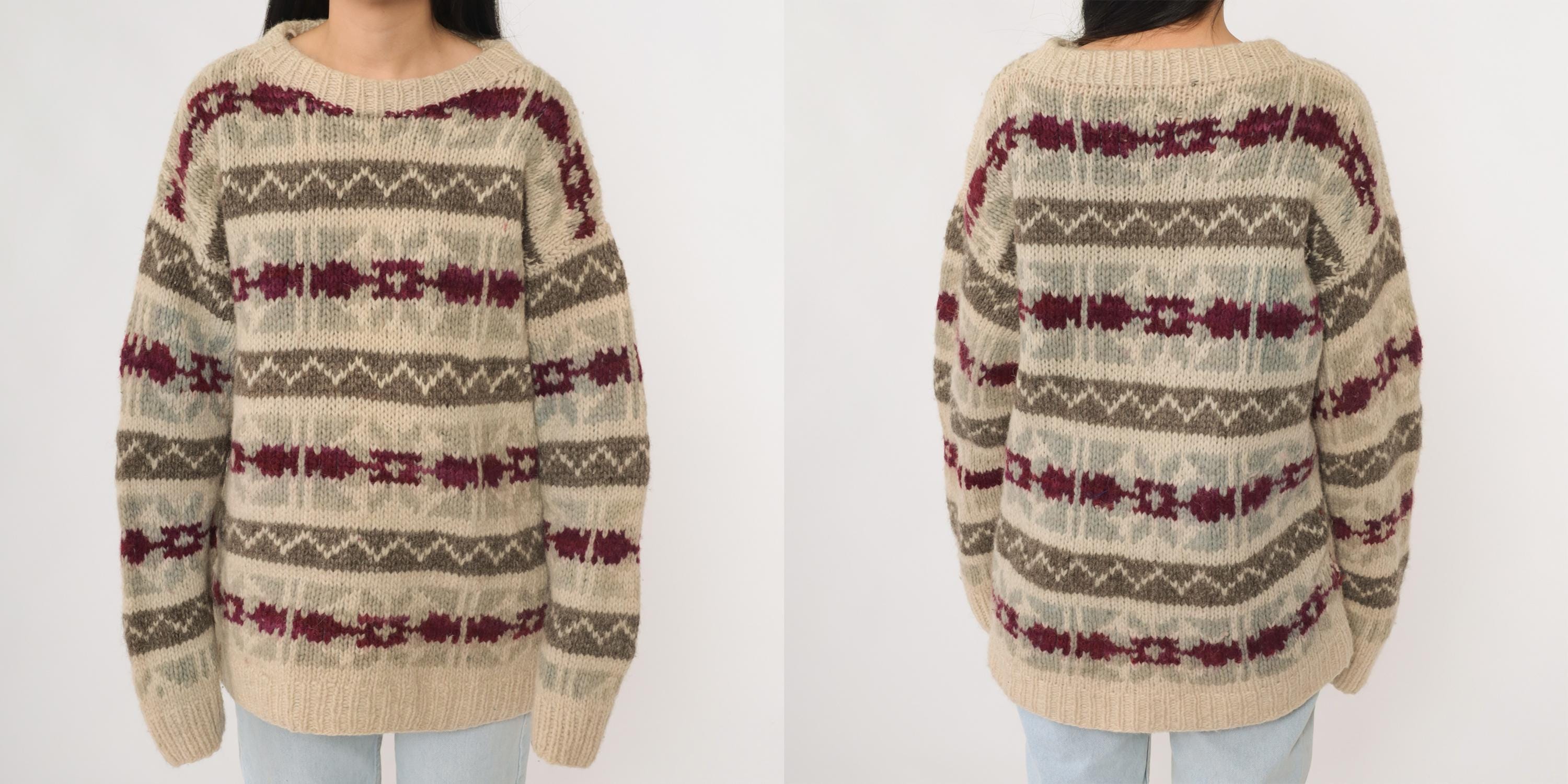 Vintage 90s wool sweater in beige featuring gray and burgundy striped knit pattern. This pullover has a crew neckline, ribbed cuffs and hem, and a relaxed long sleeve fit. Made of wool with a cozy heavyweight feel, perfect for winter layering.