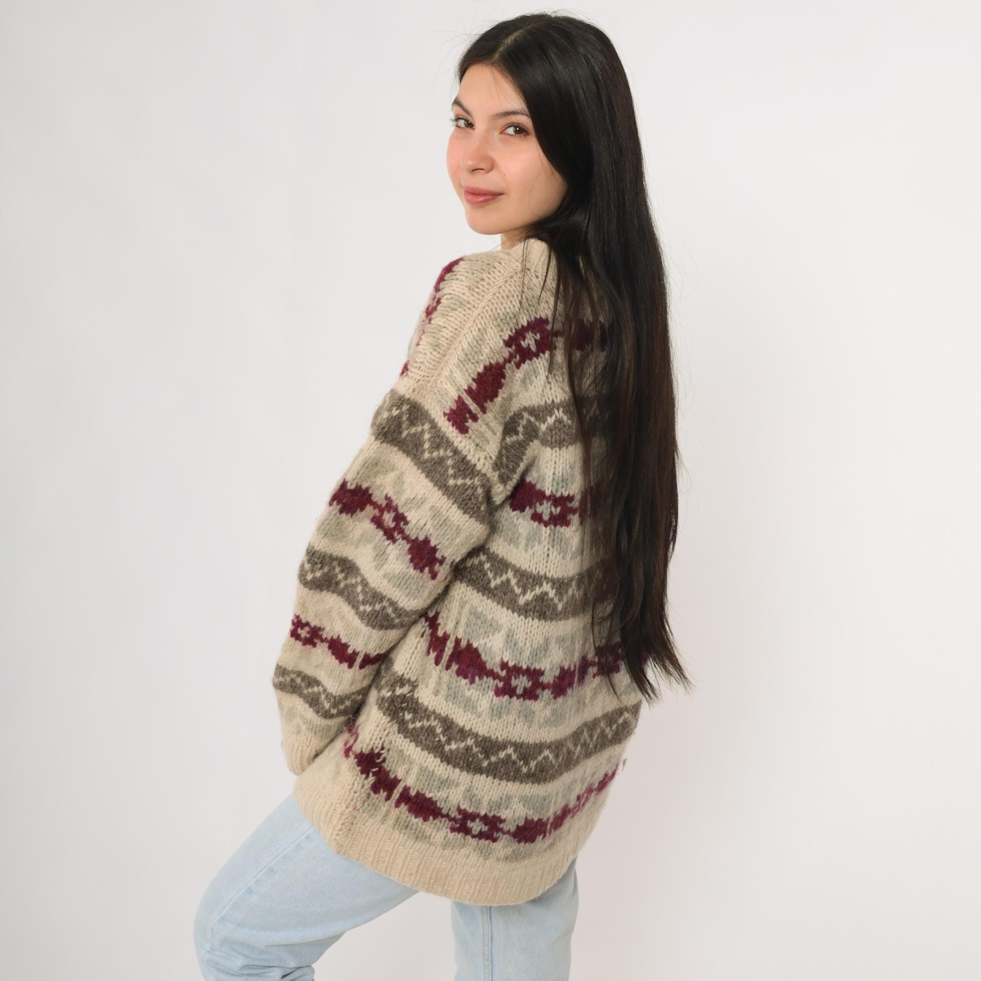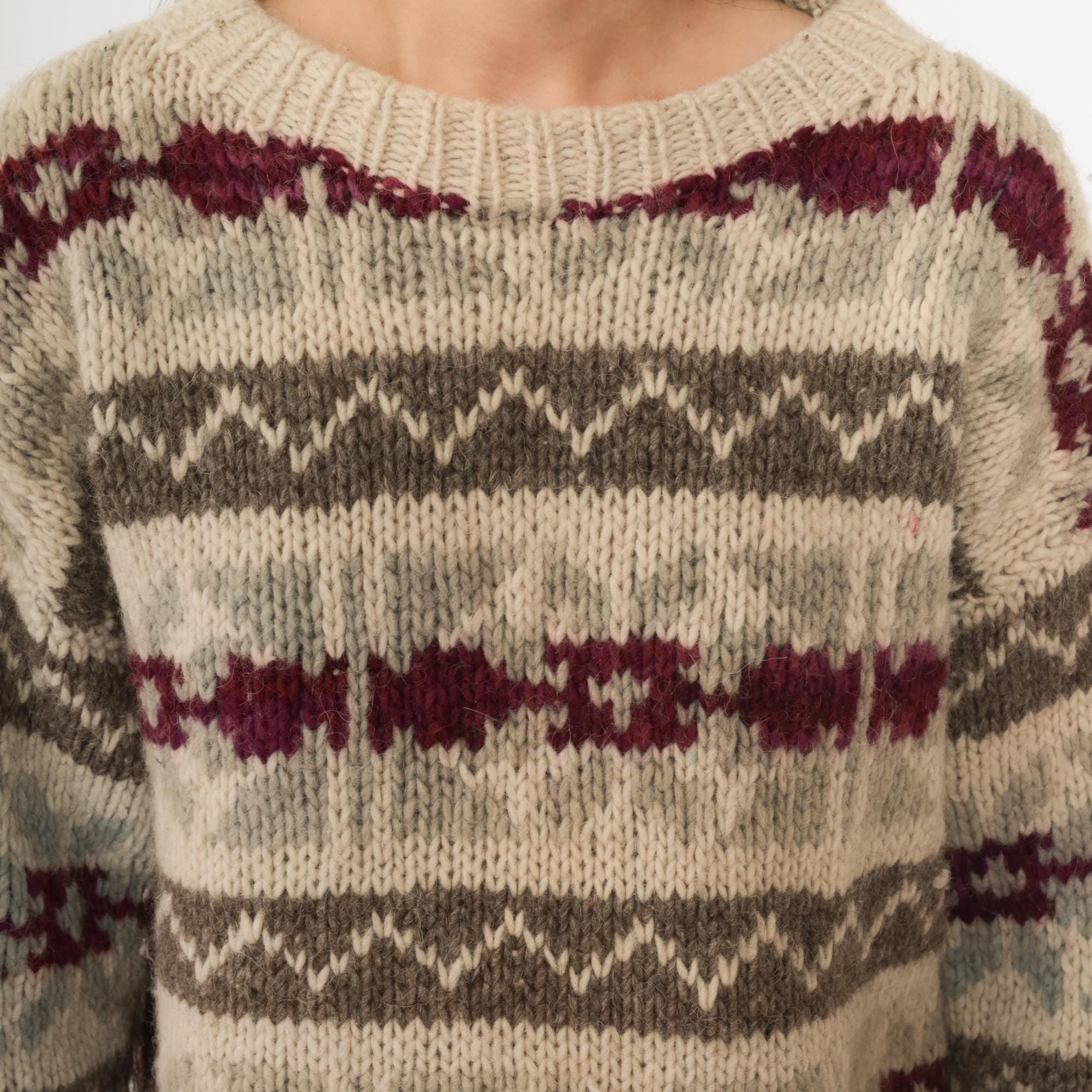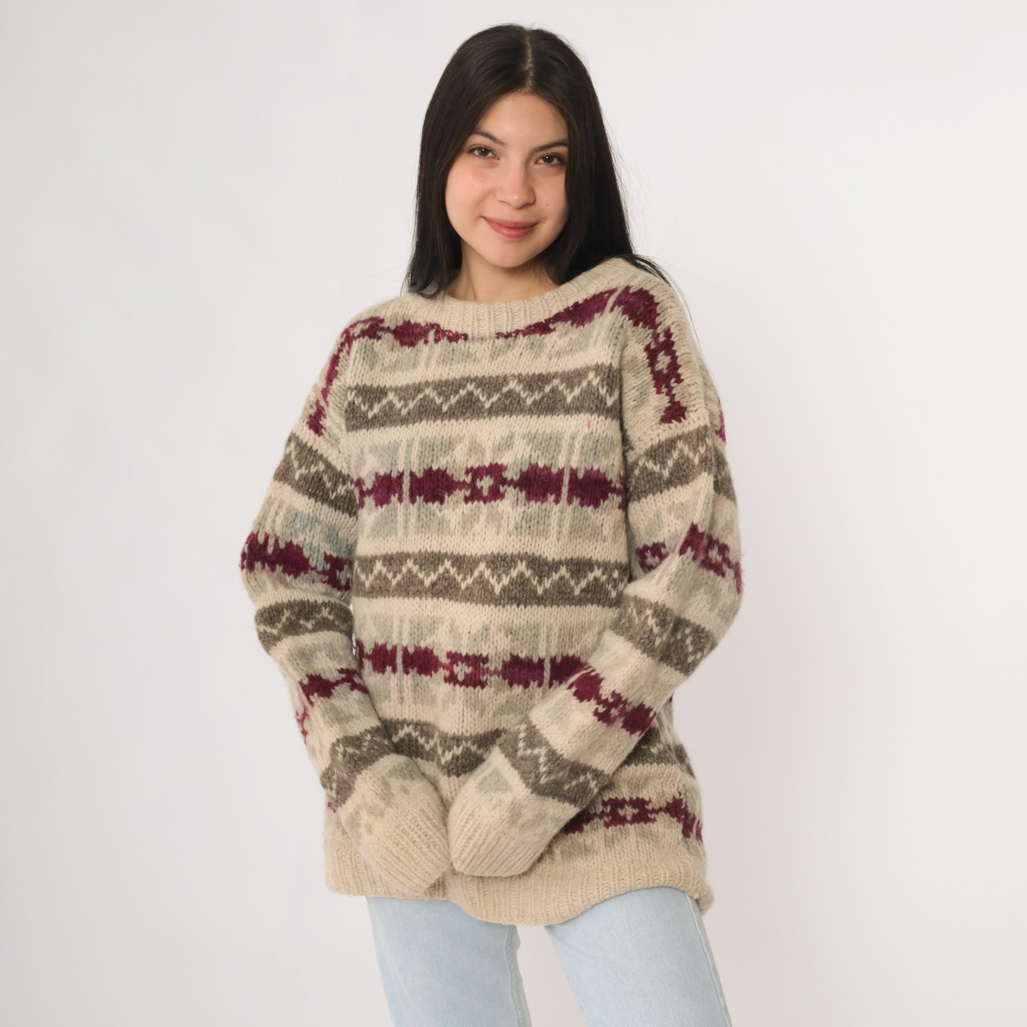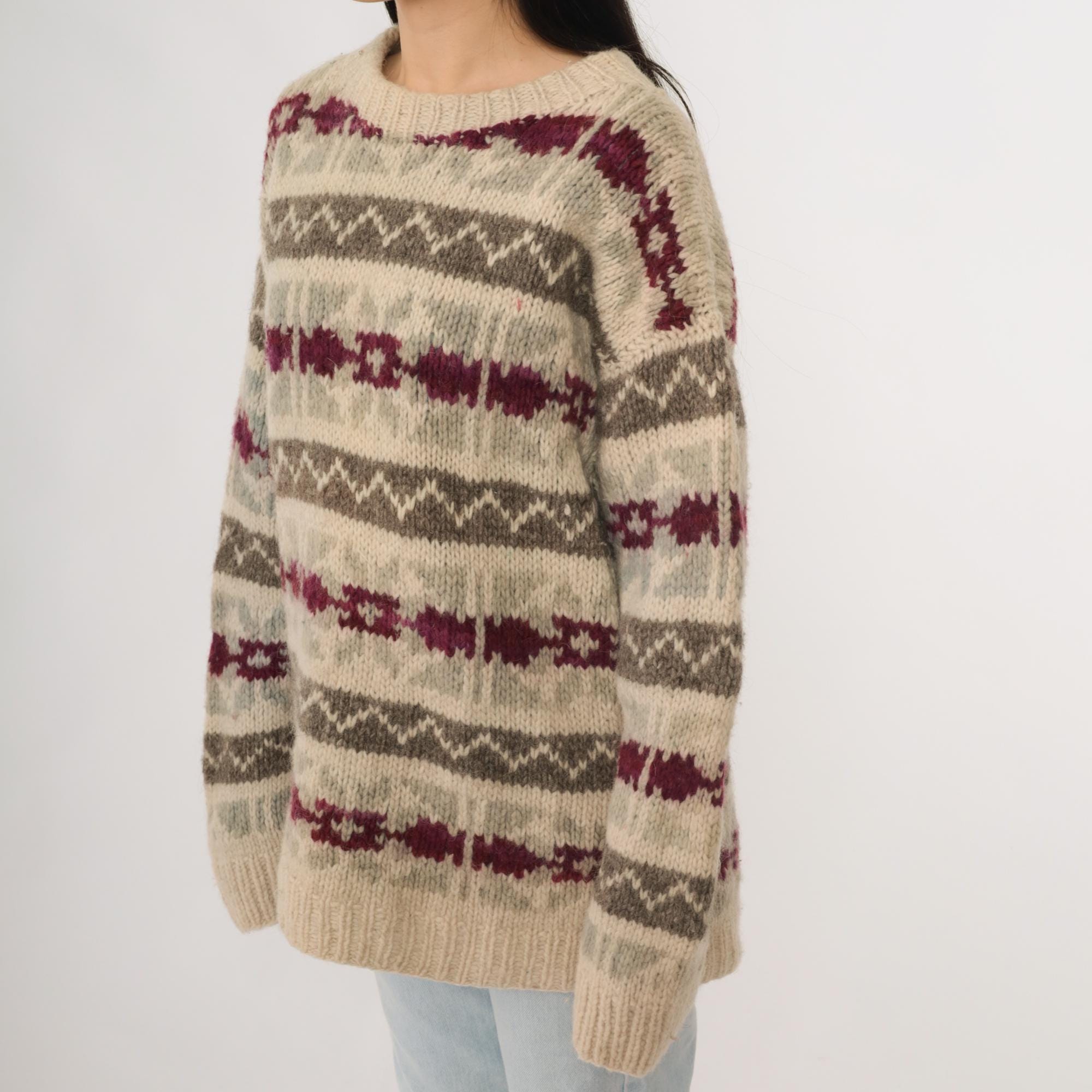Vintage 90s wool sweater in beige featuring gray and burgundy striped knit pattern. This pullover has a crew neckline, ribbed cuffs and hem, and a relaxed long sleeve fit. Made of wool with a cozy heavyweight feel, perfect for winter layering.