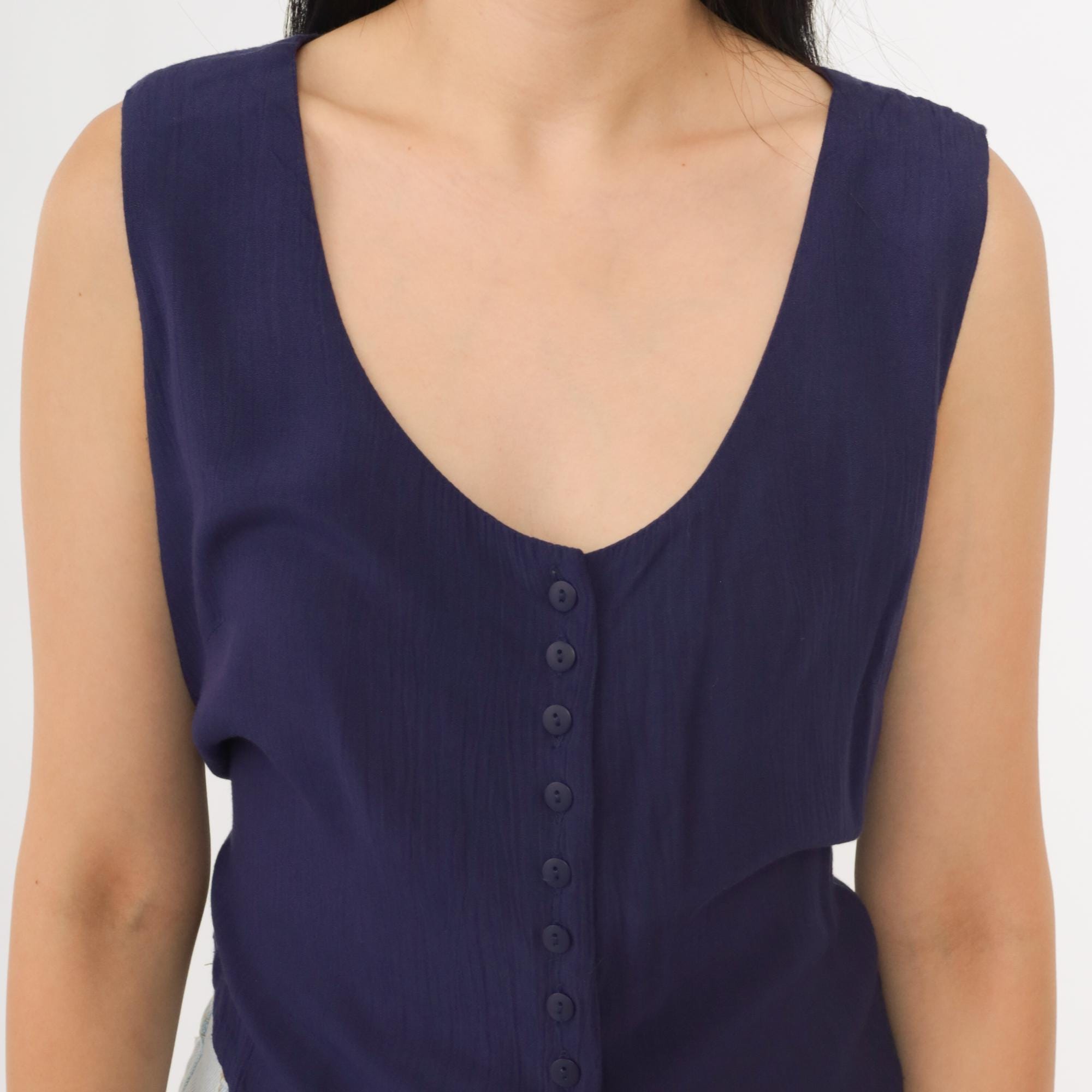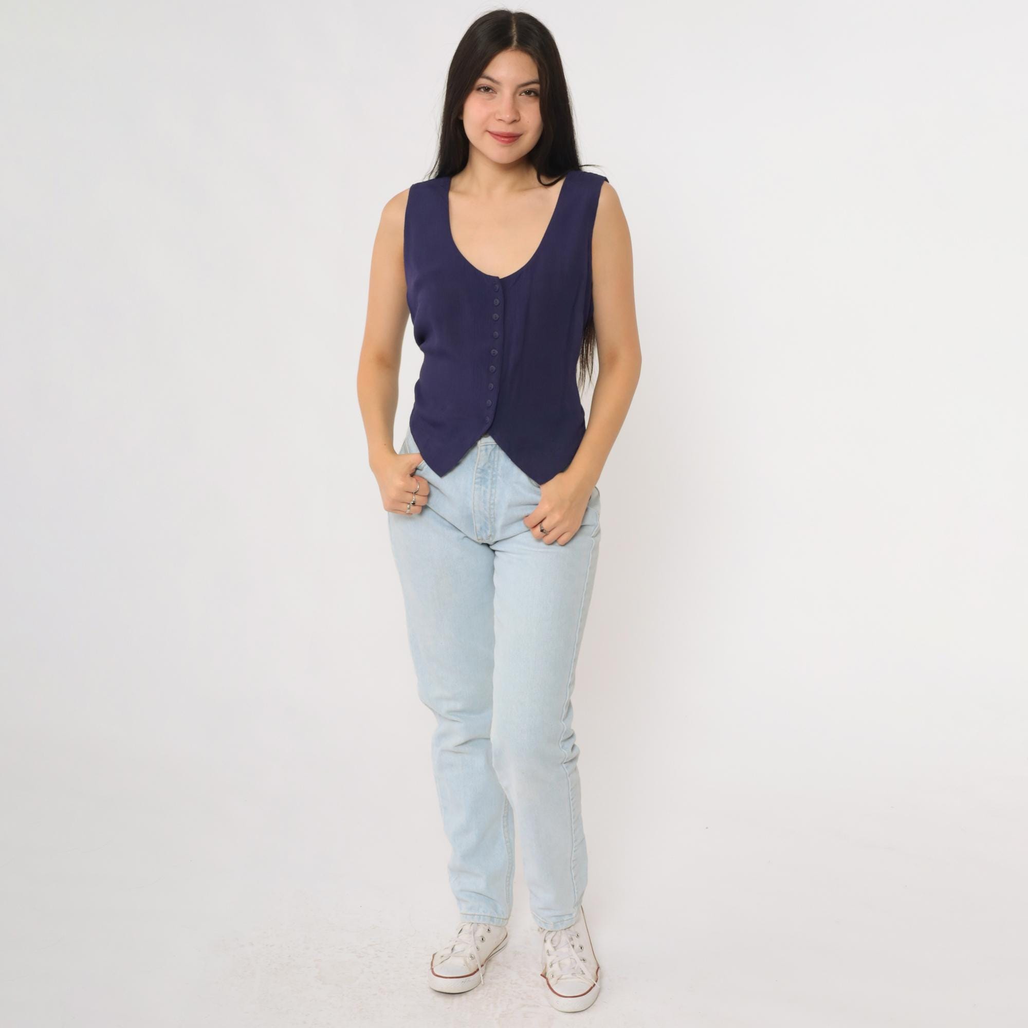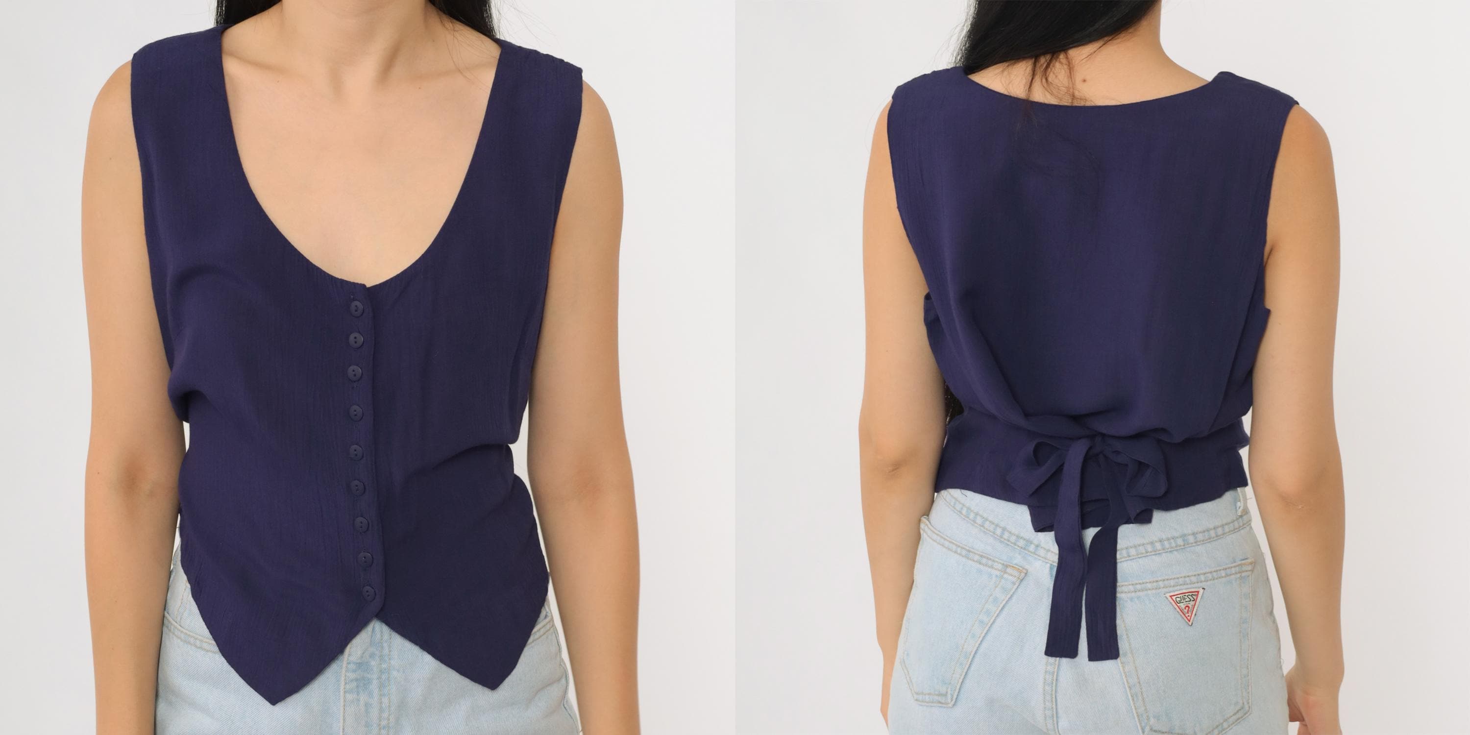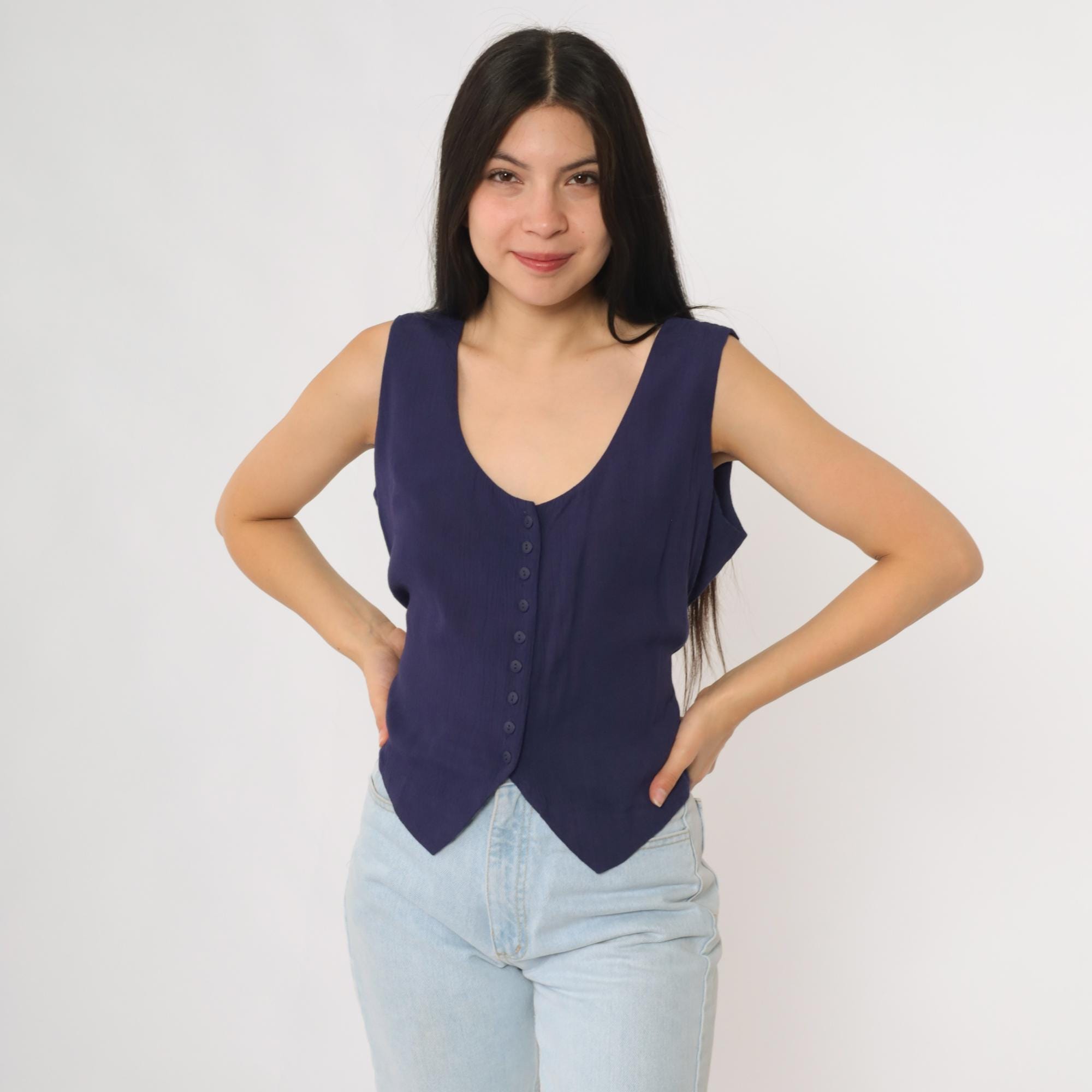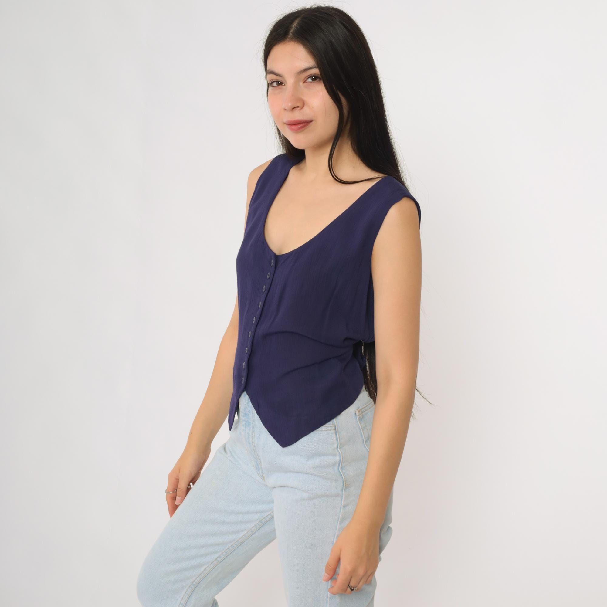 Vintage Y2K purple vest features a sleeveless cut with a scoop neckline and pointed hem. Designed with a full button front closure and adjustable tie at the back for shaping.