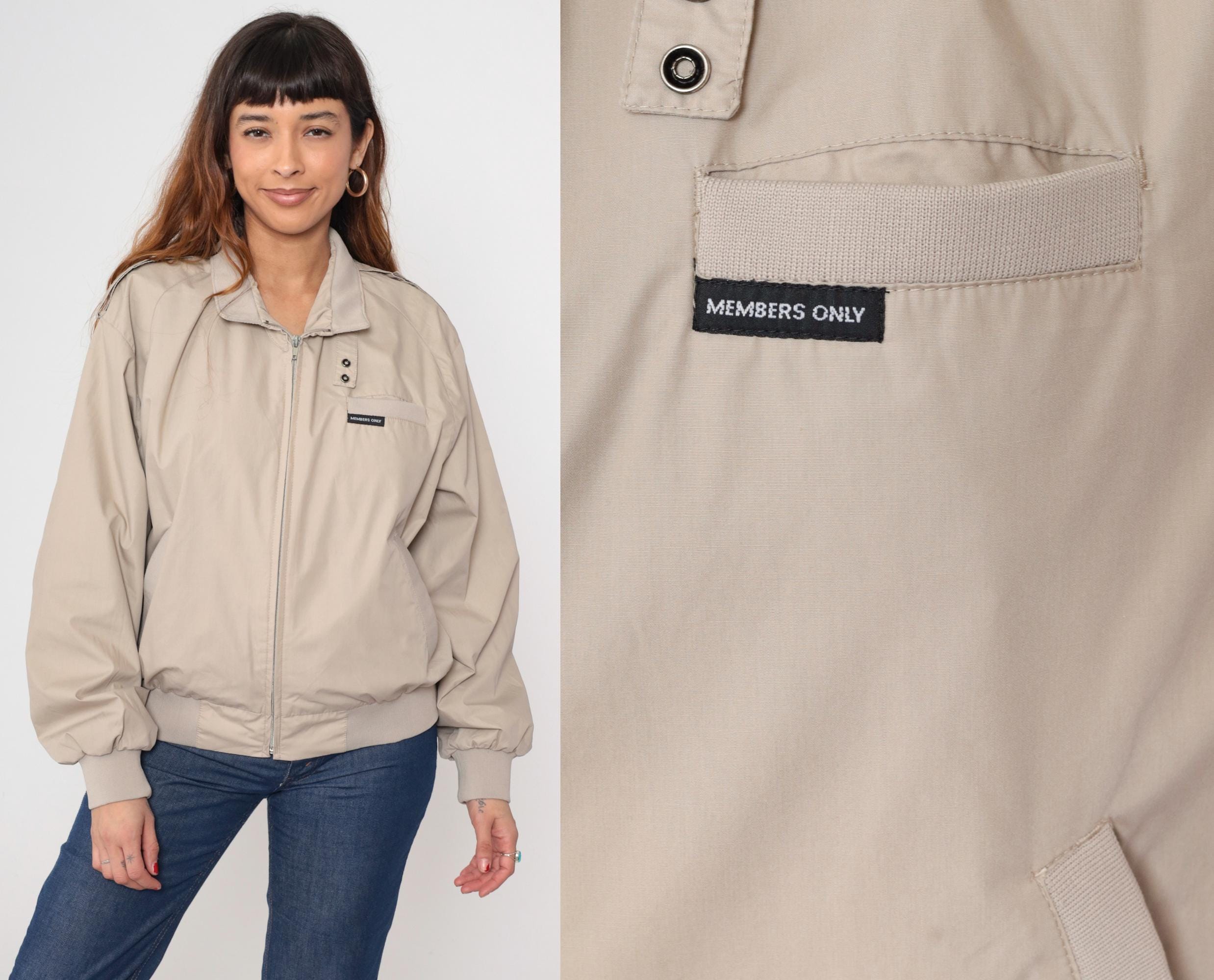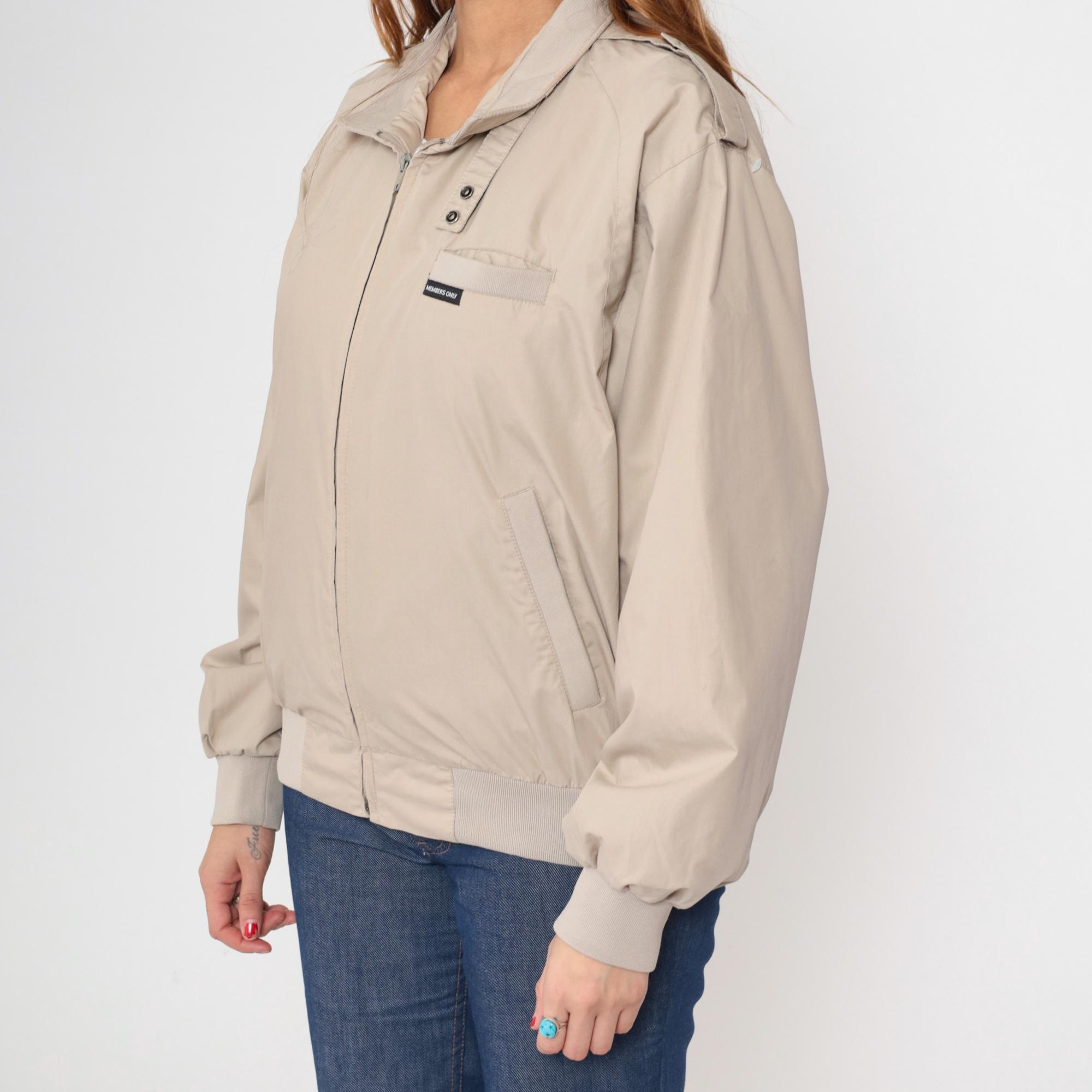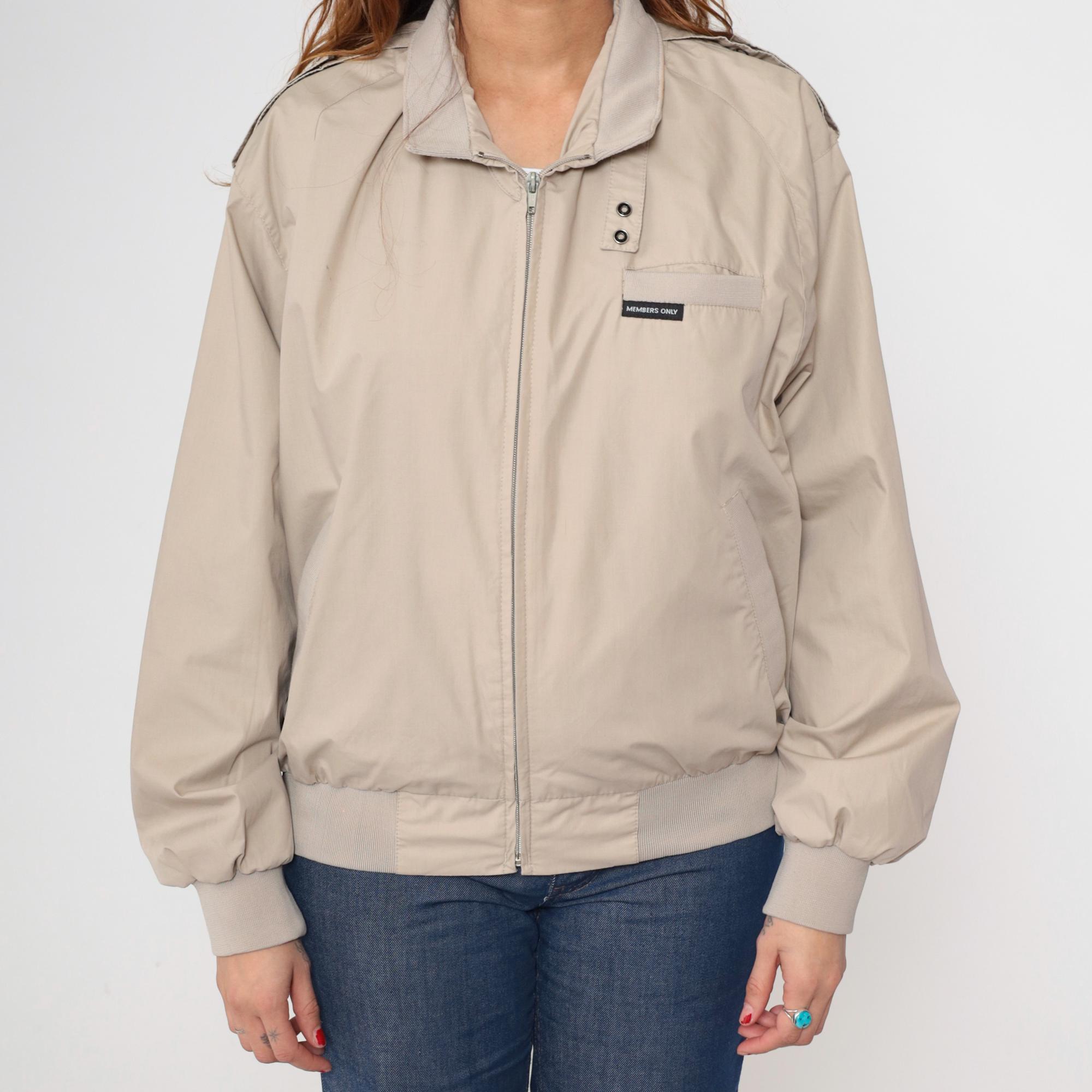 Vintage 80s Members Only jacket in light taupe. It has a front zip and shoulder epaulettes.