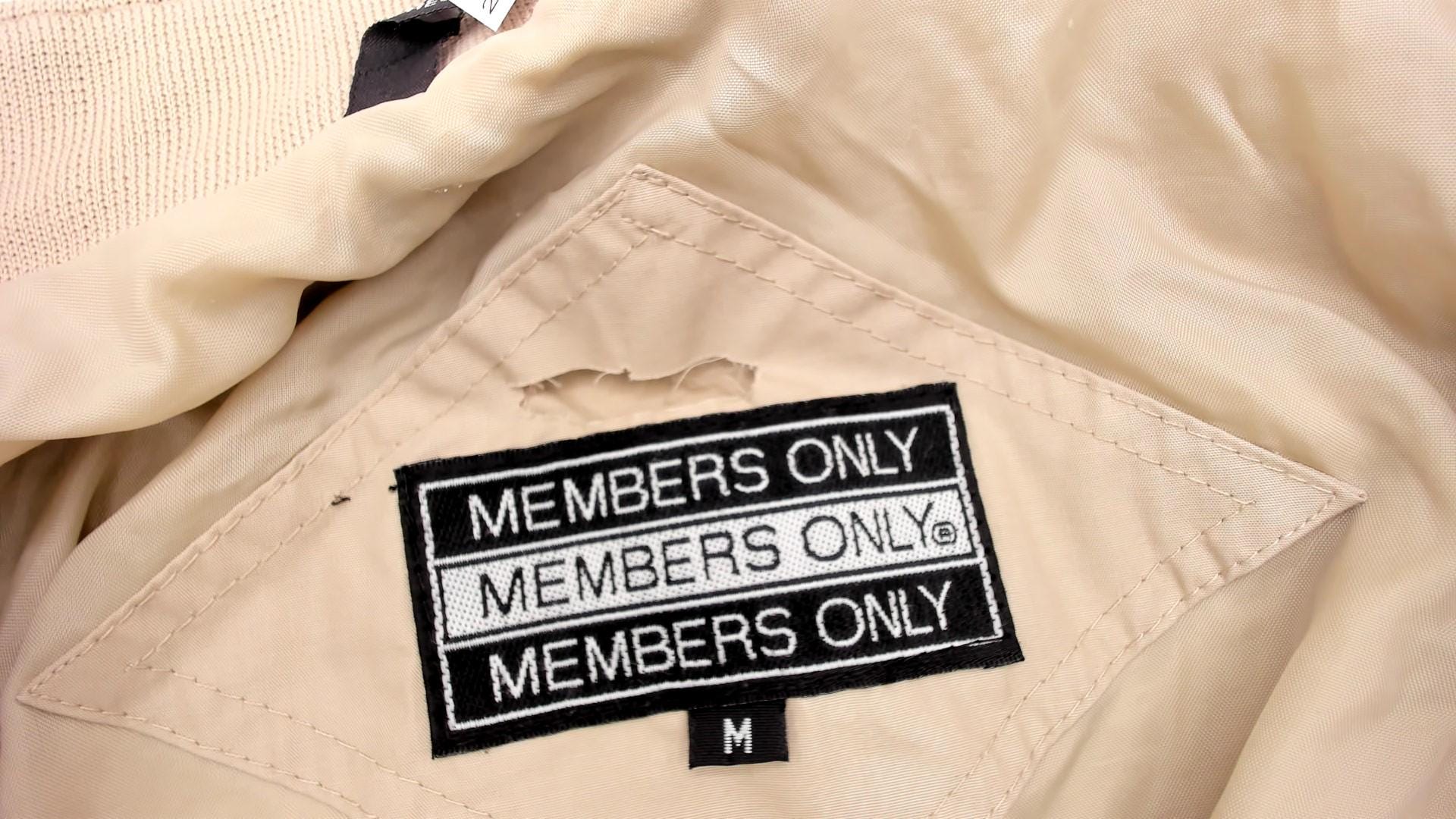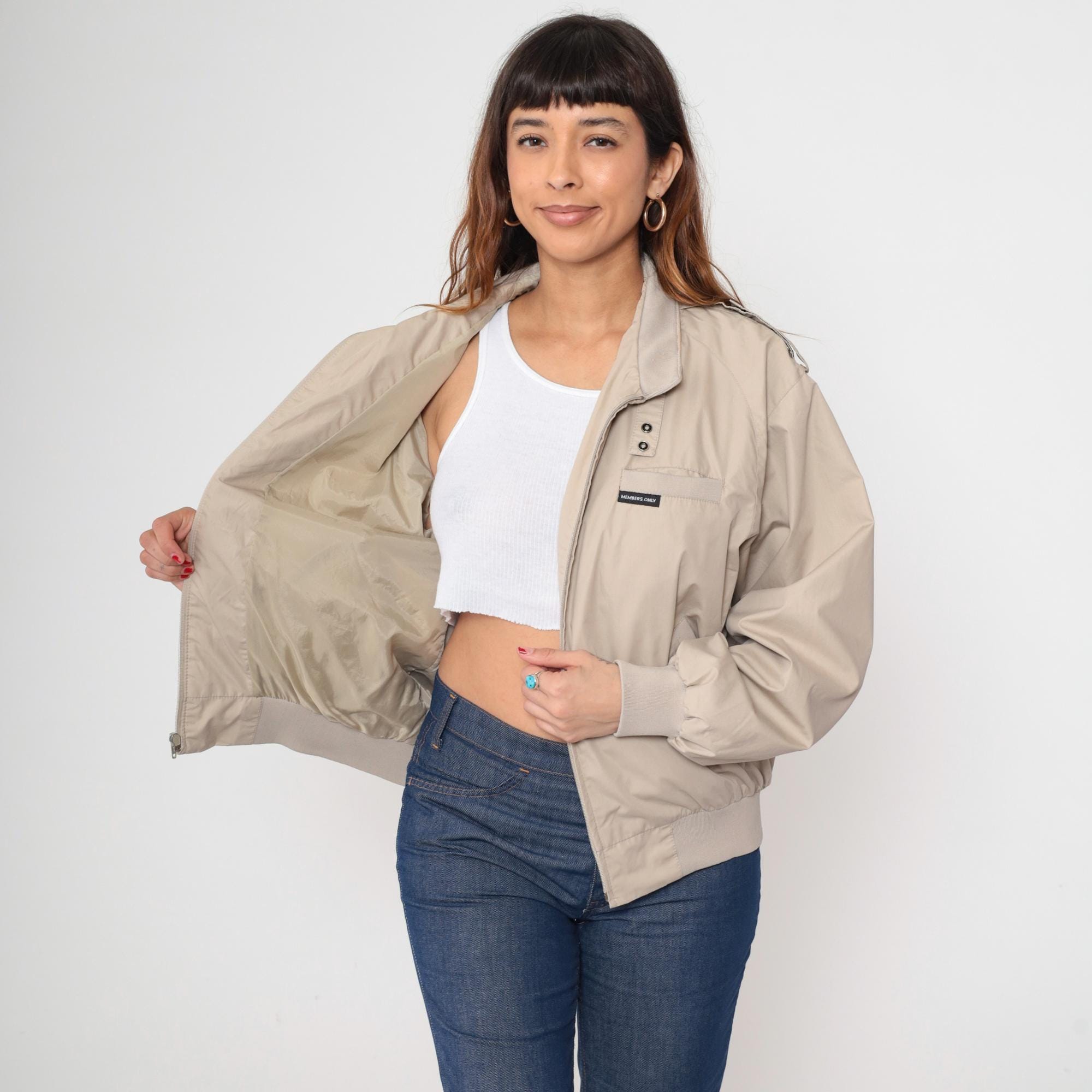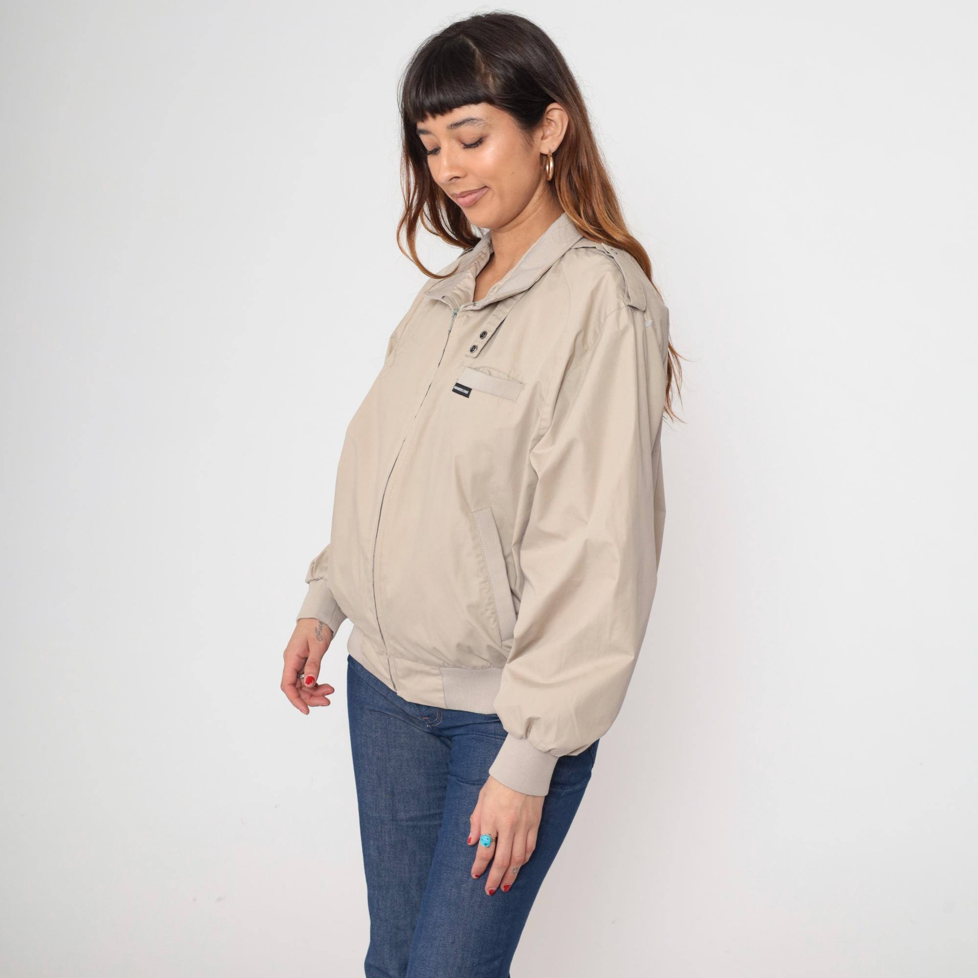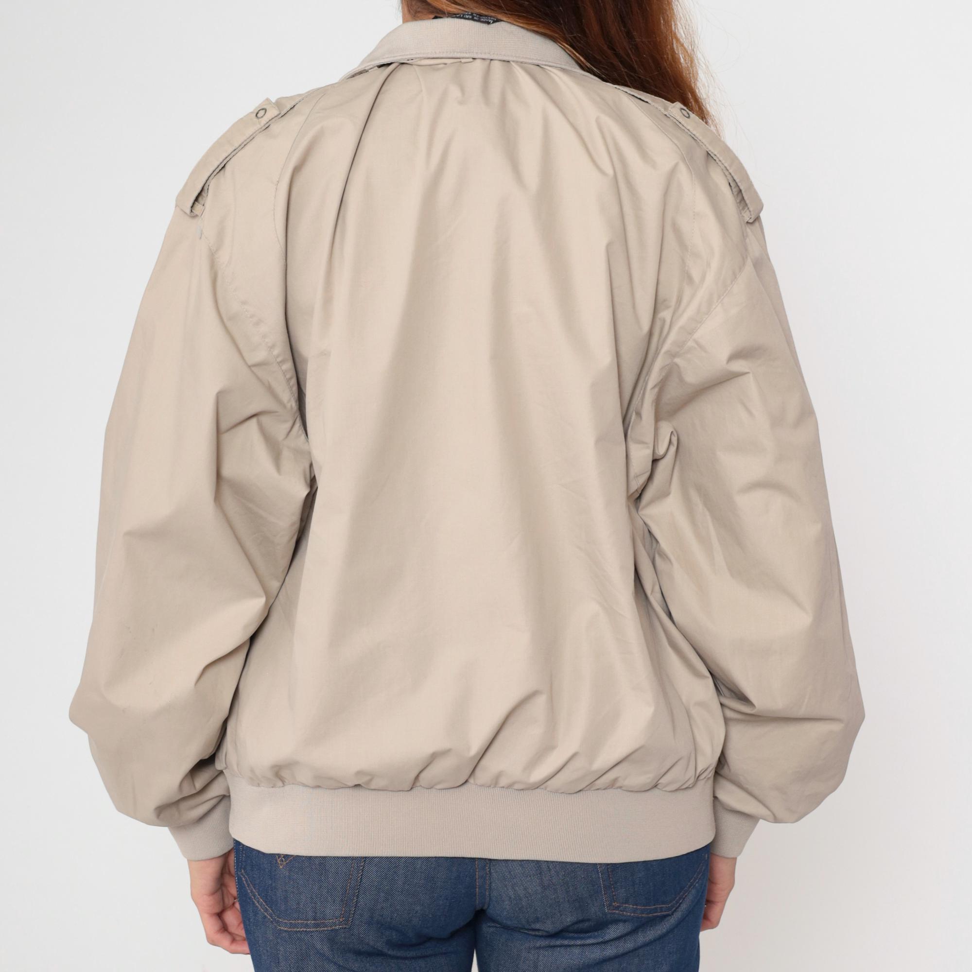 Vintage 80s Members Only jacket in light taupe. It has a front zip and shoulder epaulettes.