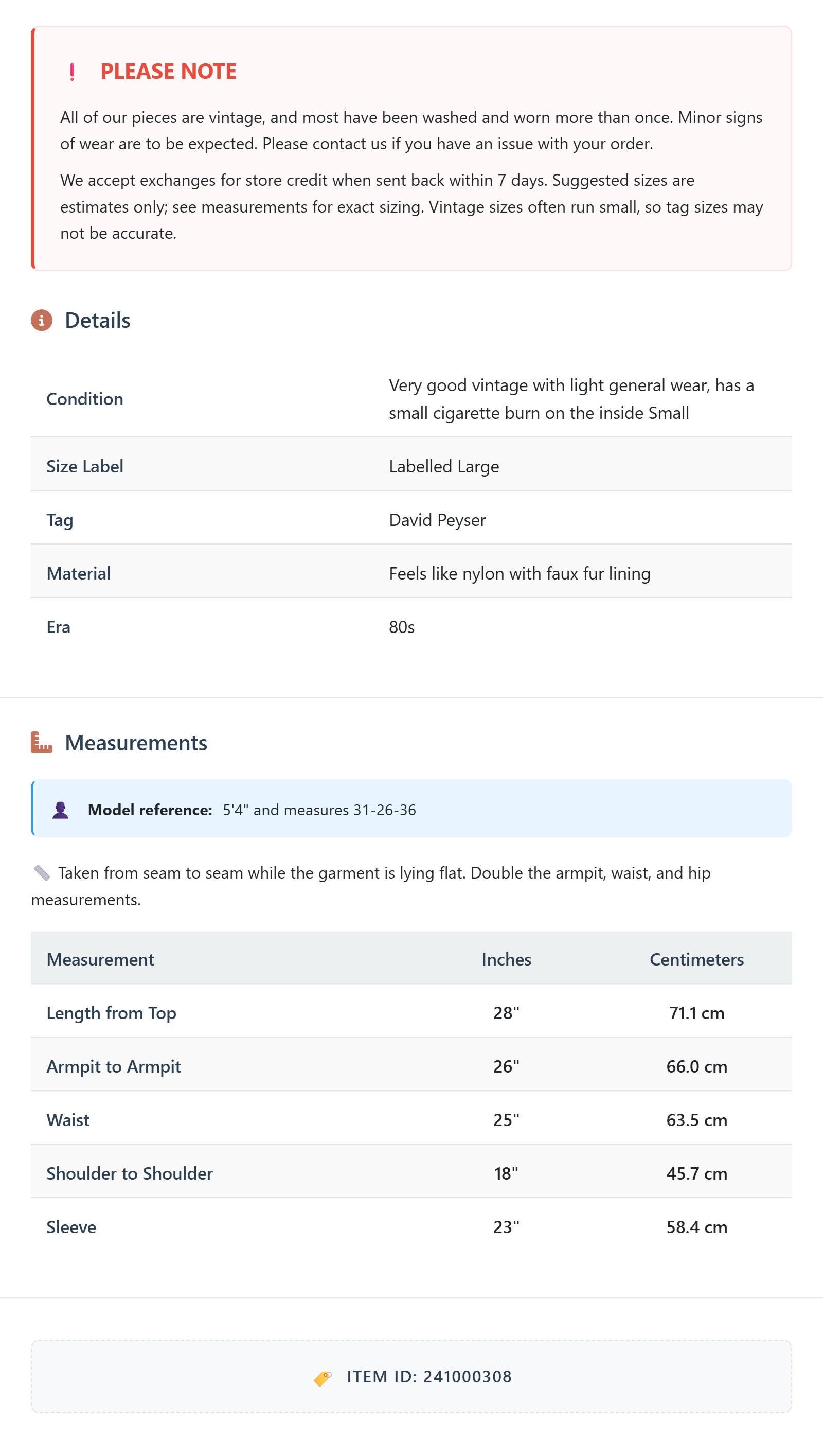 Condition: Very good vintage with light general wear, has a small cigarette burn on the inside Small