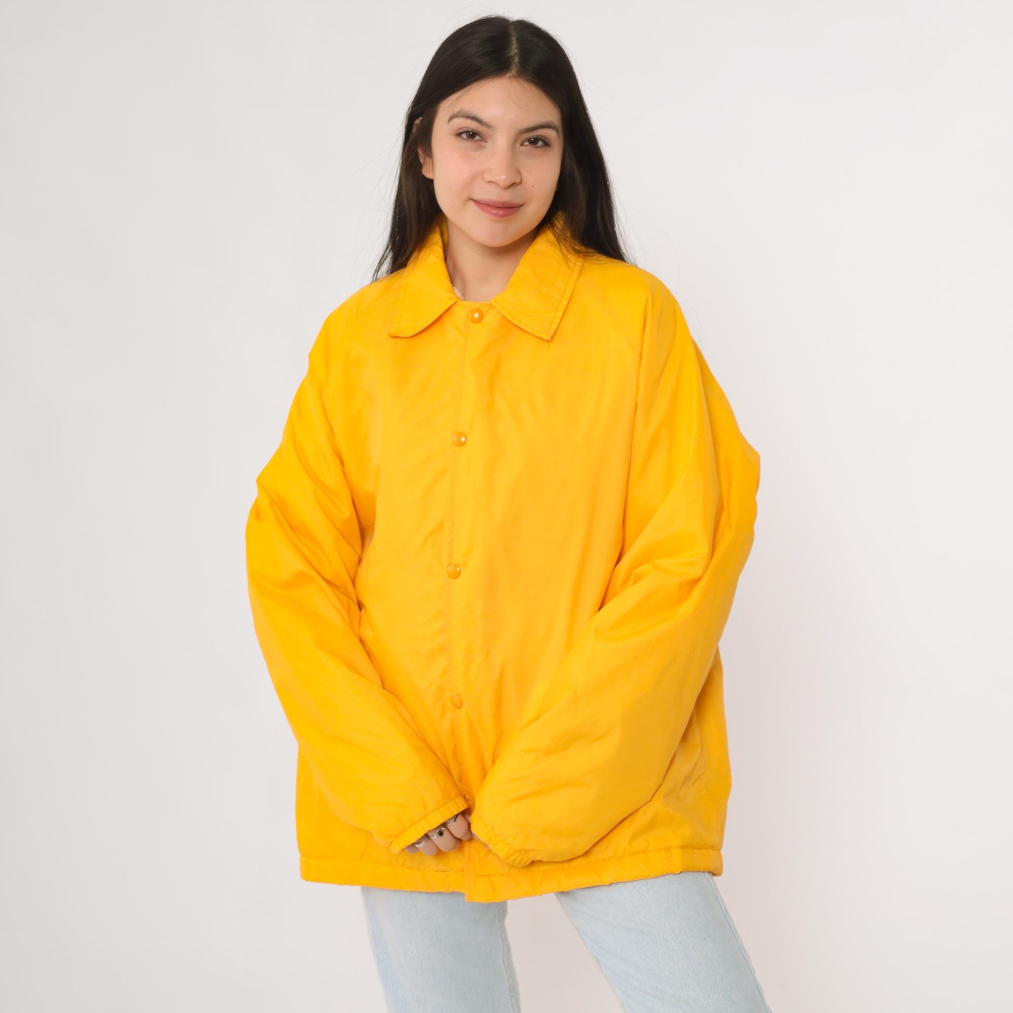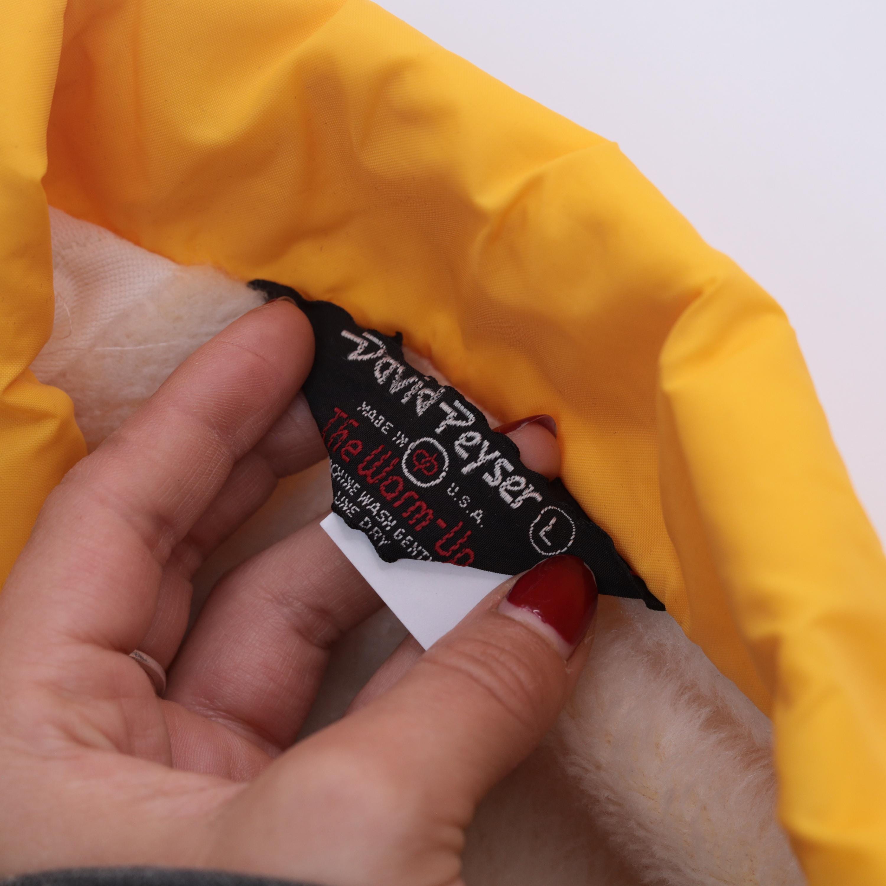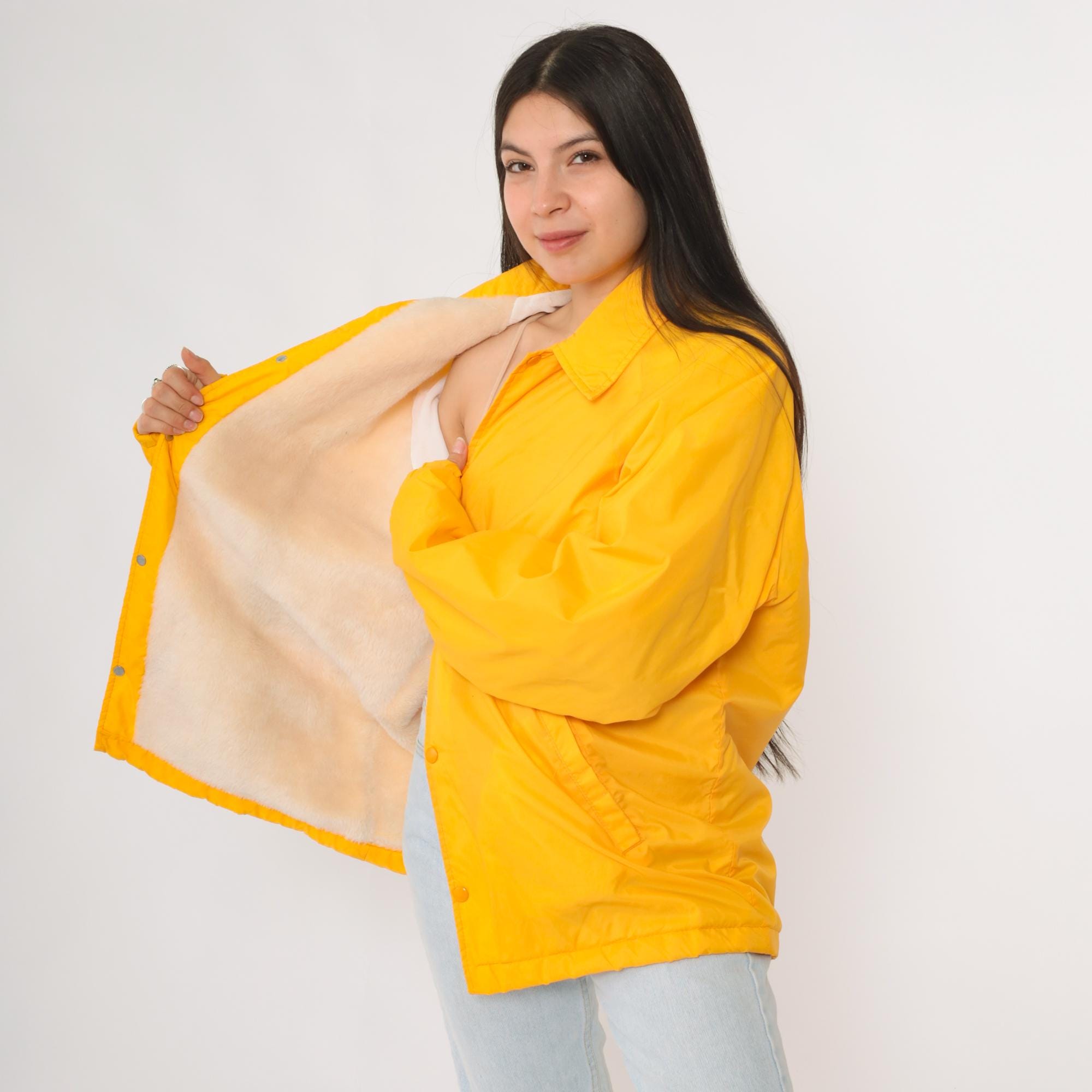 Vintage 80s David Peyser "The Warm Up" winter windbreaker jacket in a vibrant yellow nylon shell. Features snap button closure, two front pockets, and a soft faux fur lining for warmth. Designed in a coach style fit with long sleeves and a collared neckline.
