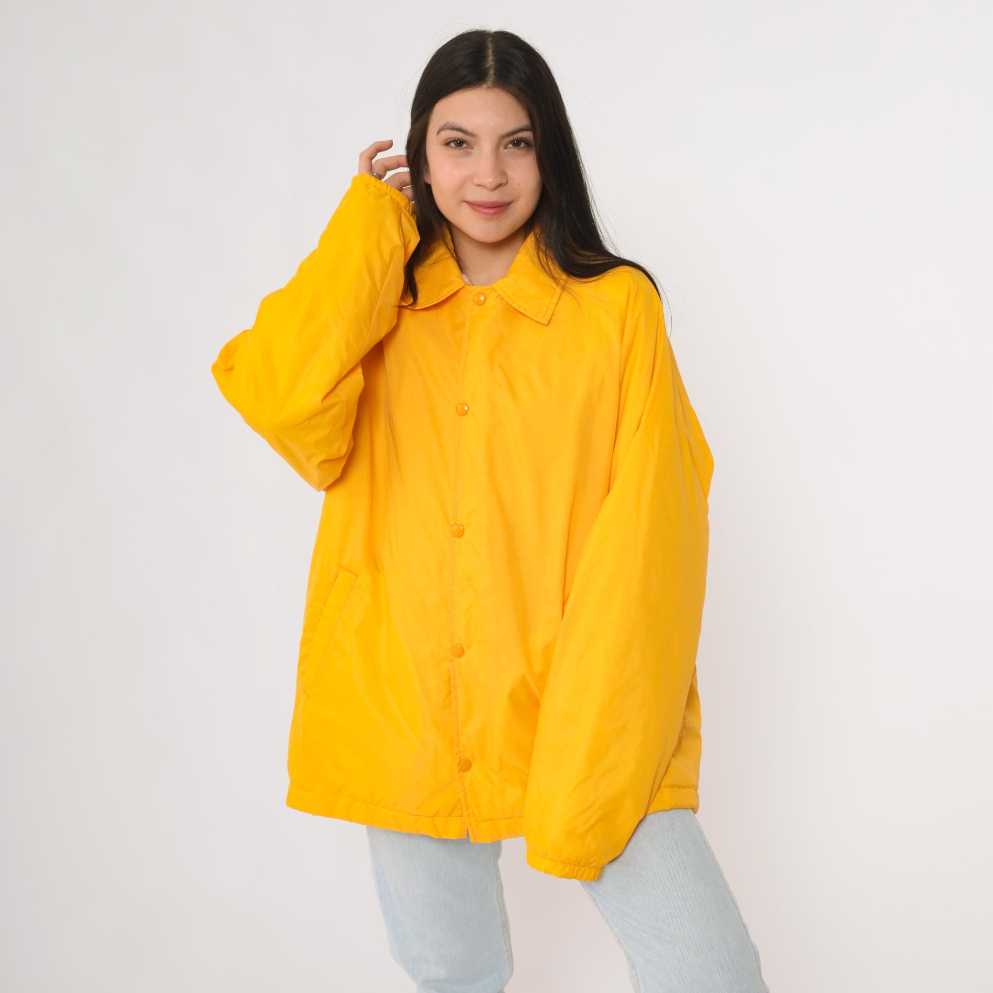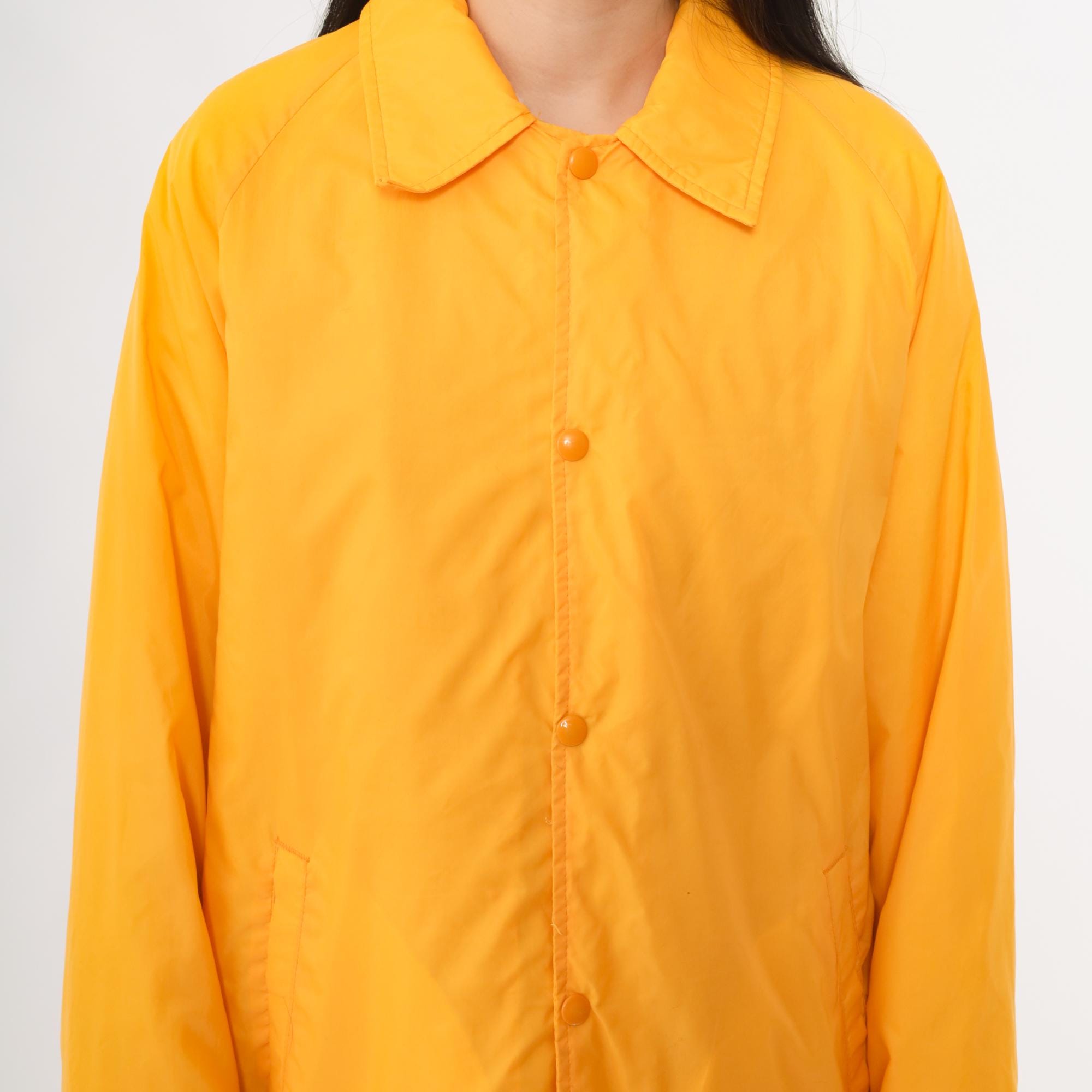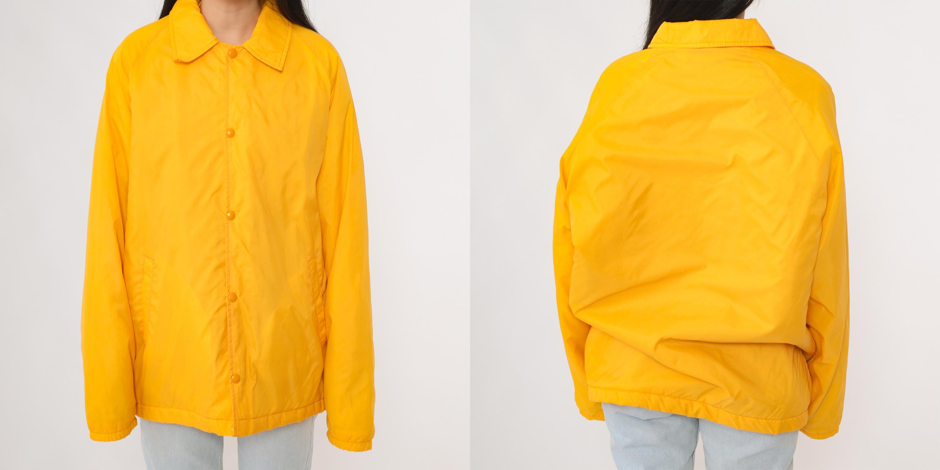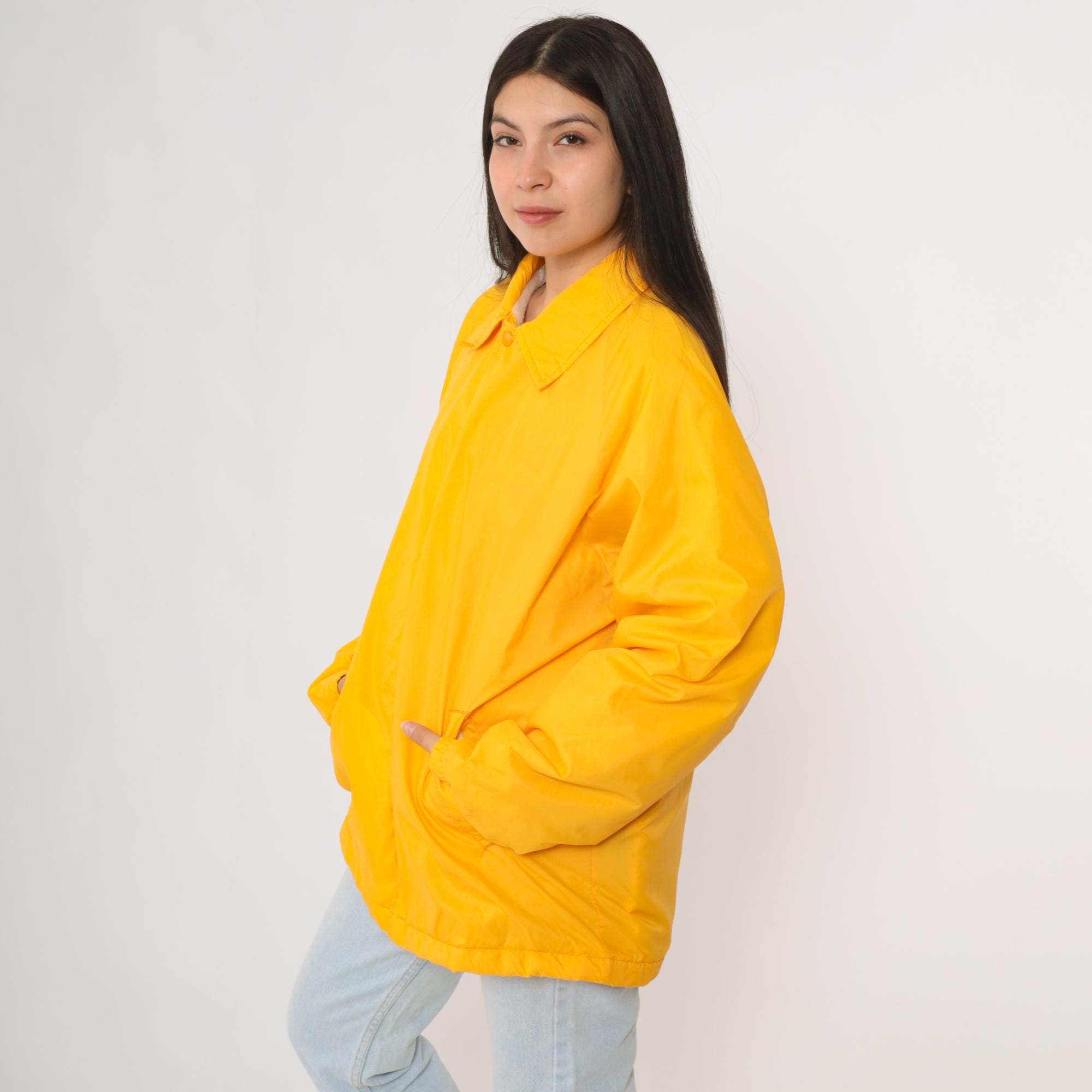 Vintage 80s David Peyser "The Warm Up" winter windbreaker jacket in a vibrant yellow nylon shell. Features snap button closure, two front pockets, and a soft faux fur lining for warmth. Designed in a coach style fit with long sleeves and a collared neckline.