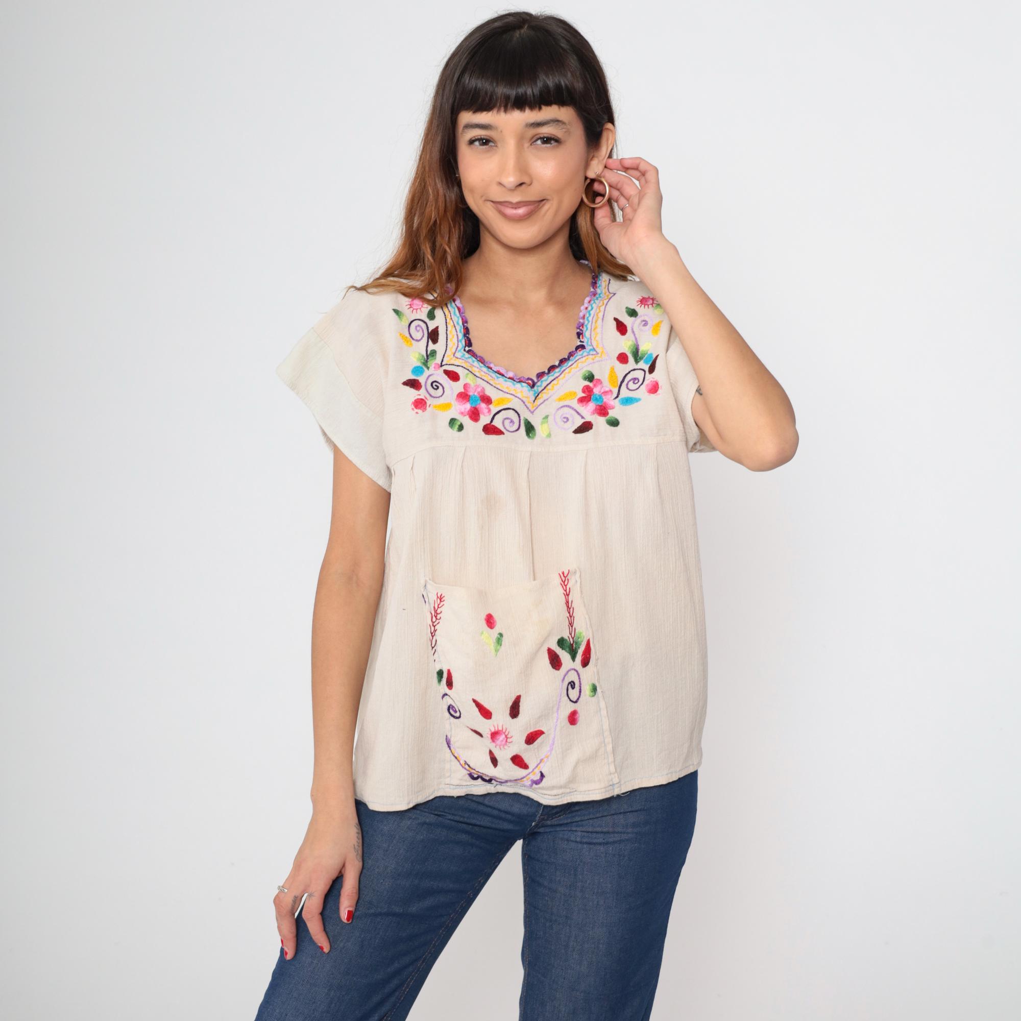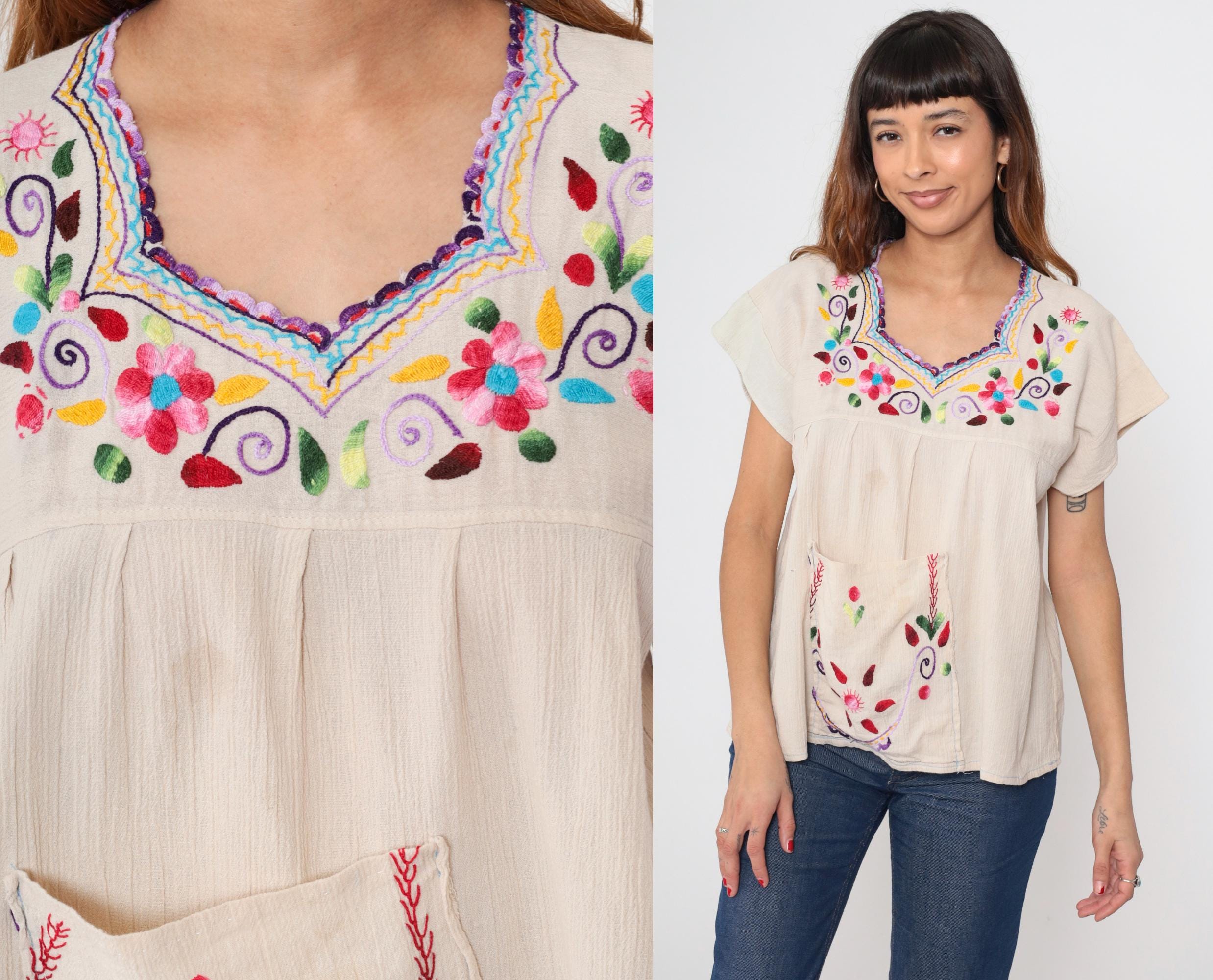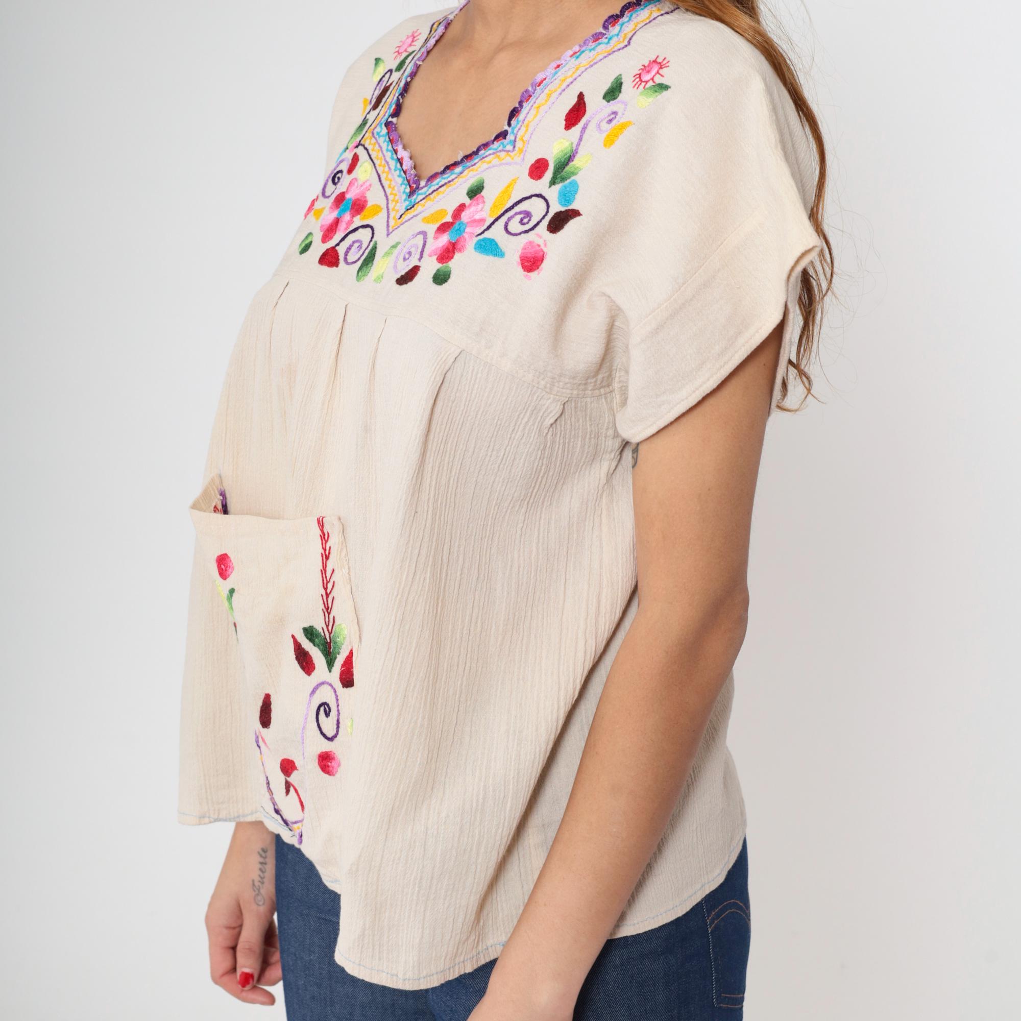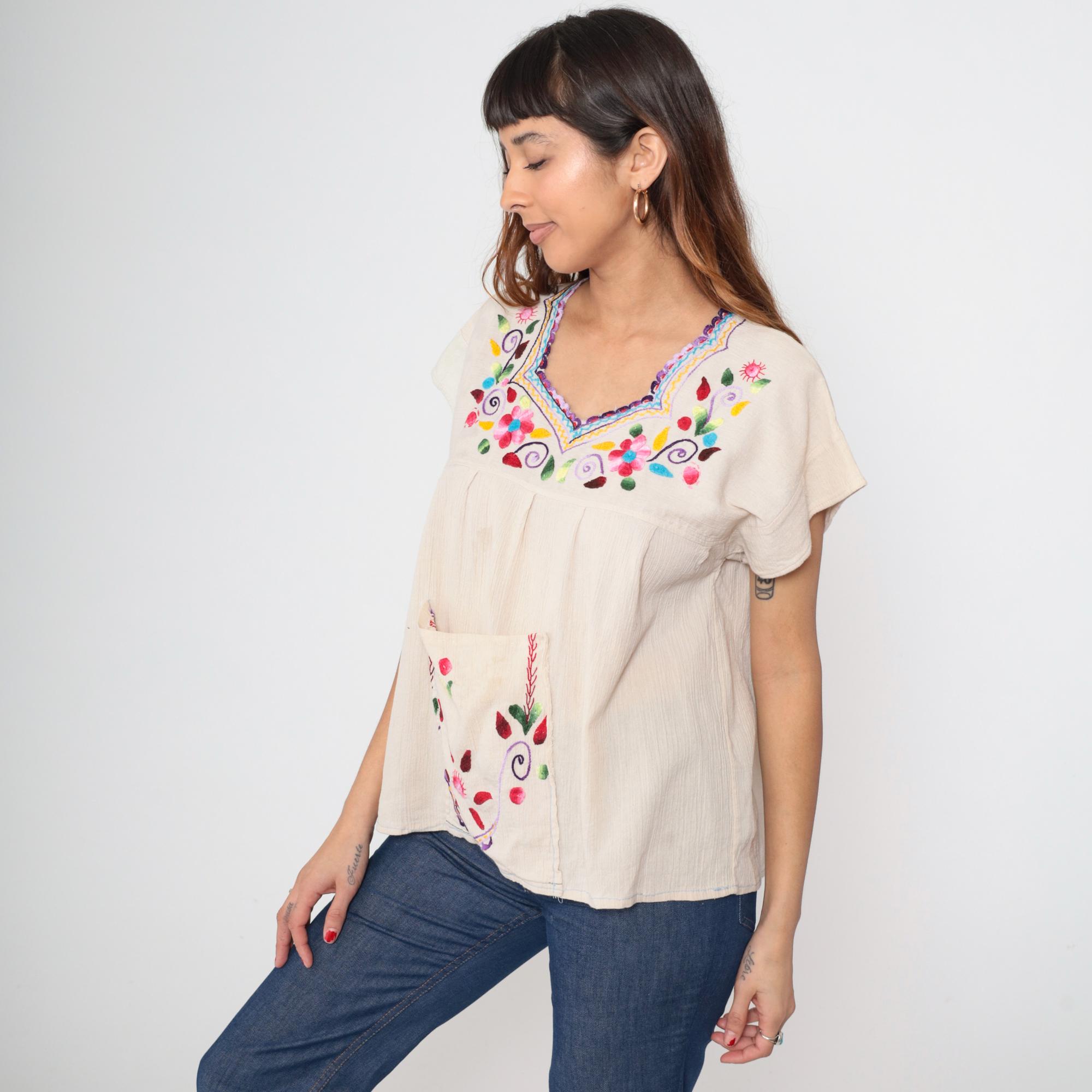 Vintage Y2k Mexican blouse with floral embroidery on cream cotton. Tunic cut with cap sleeves.