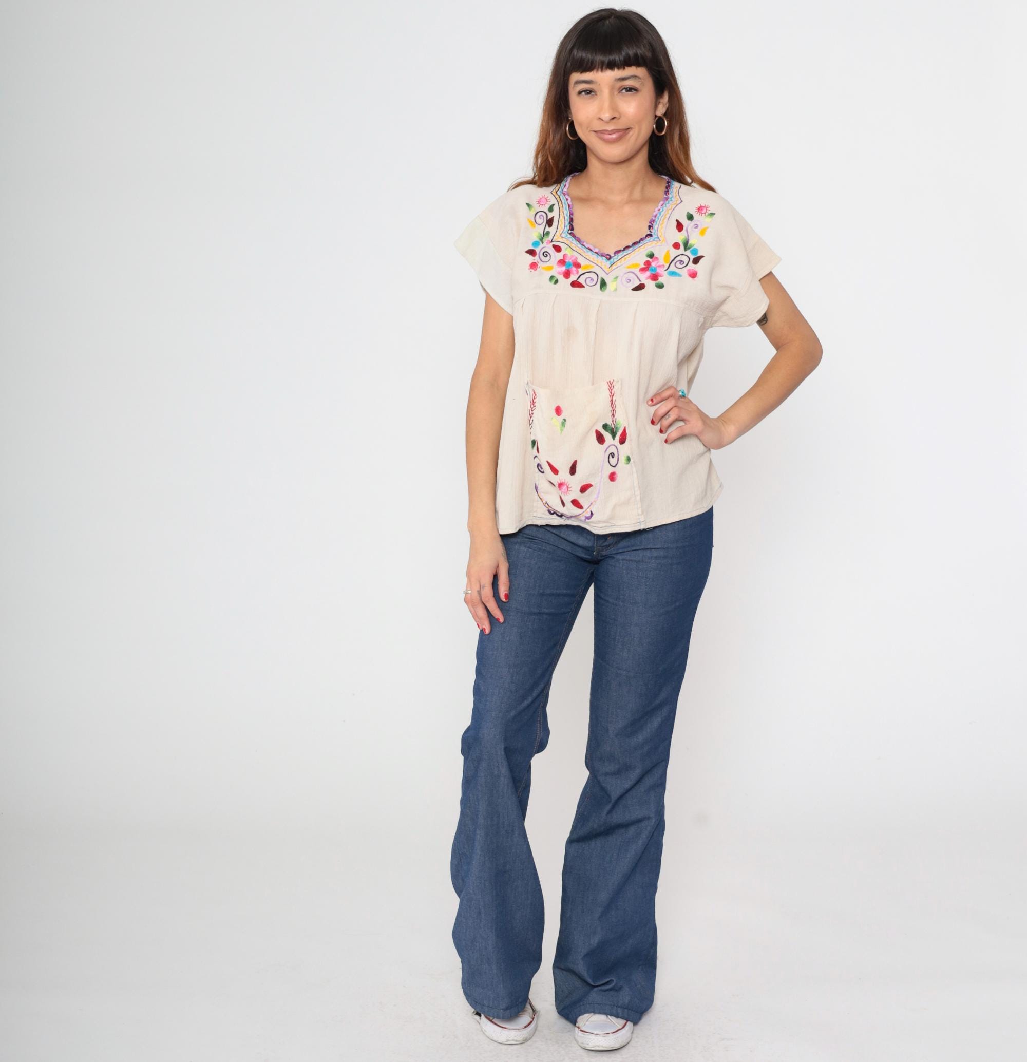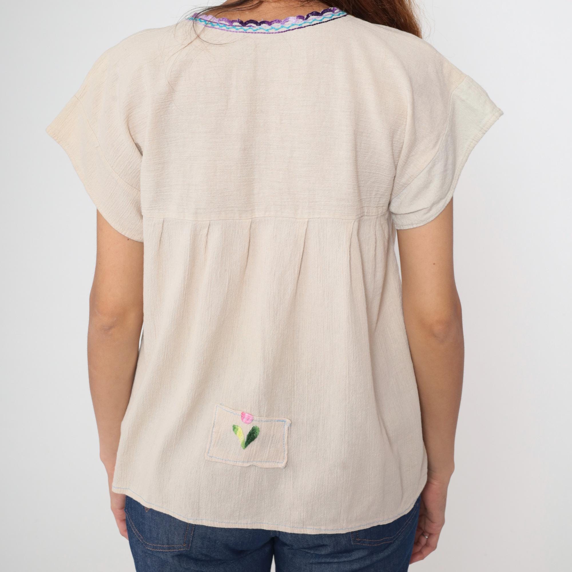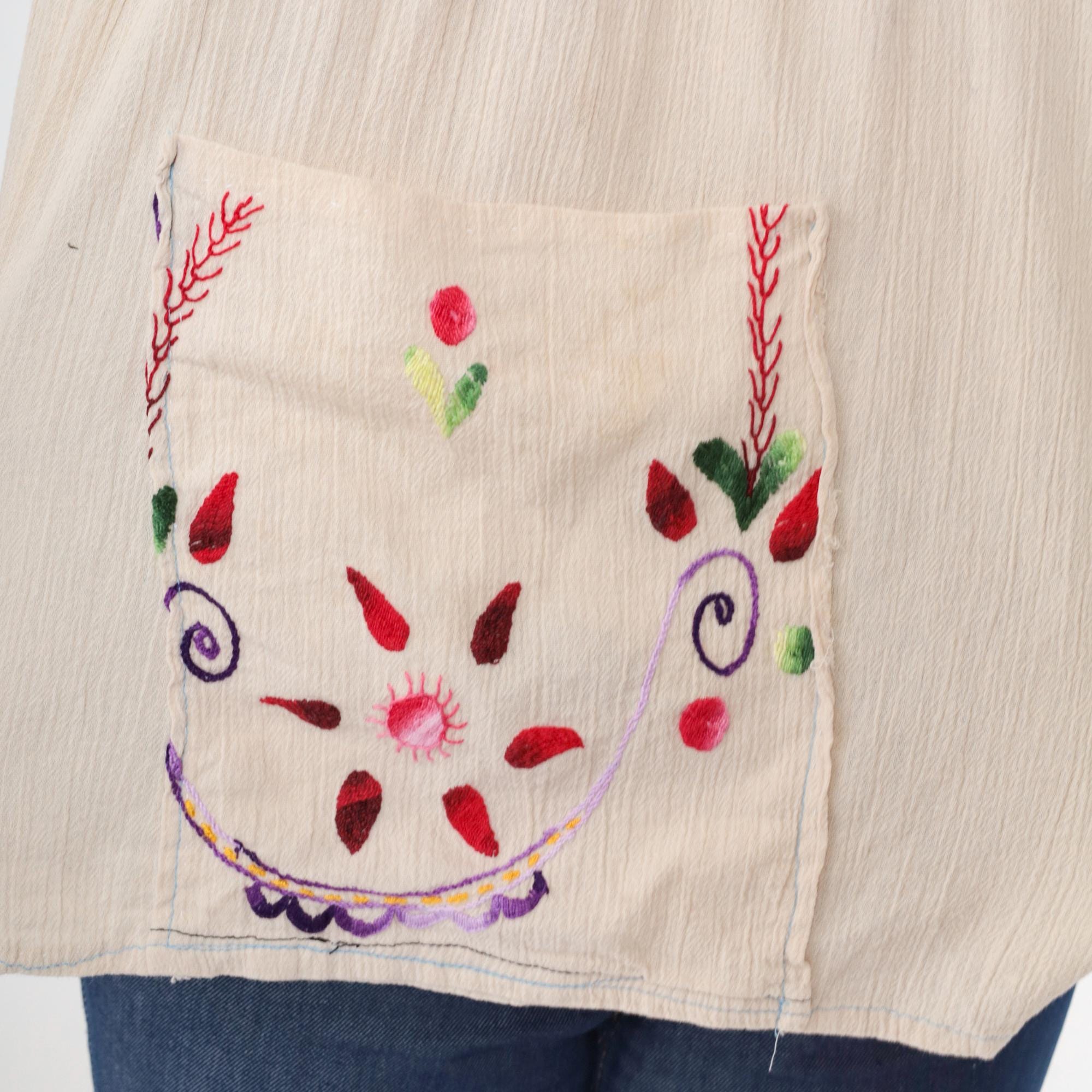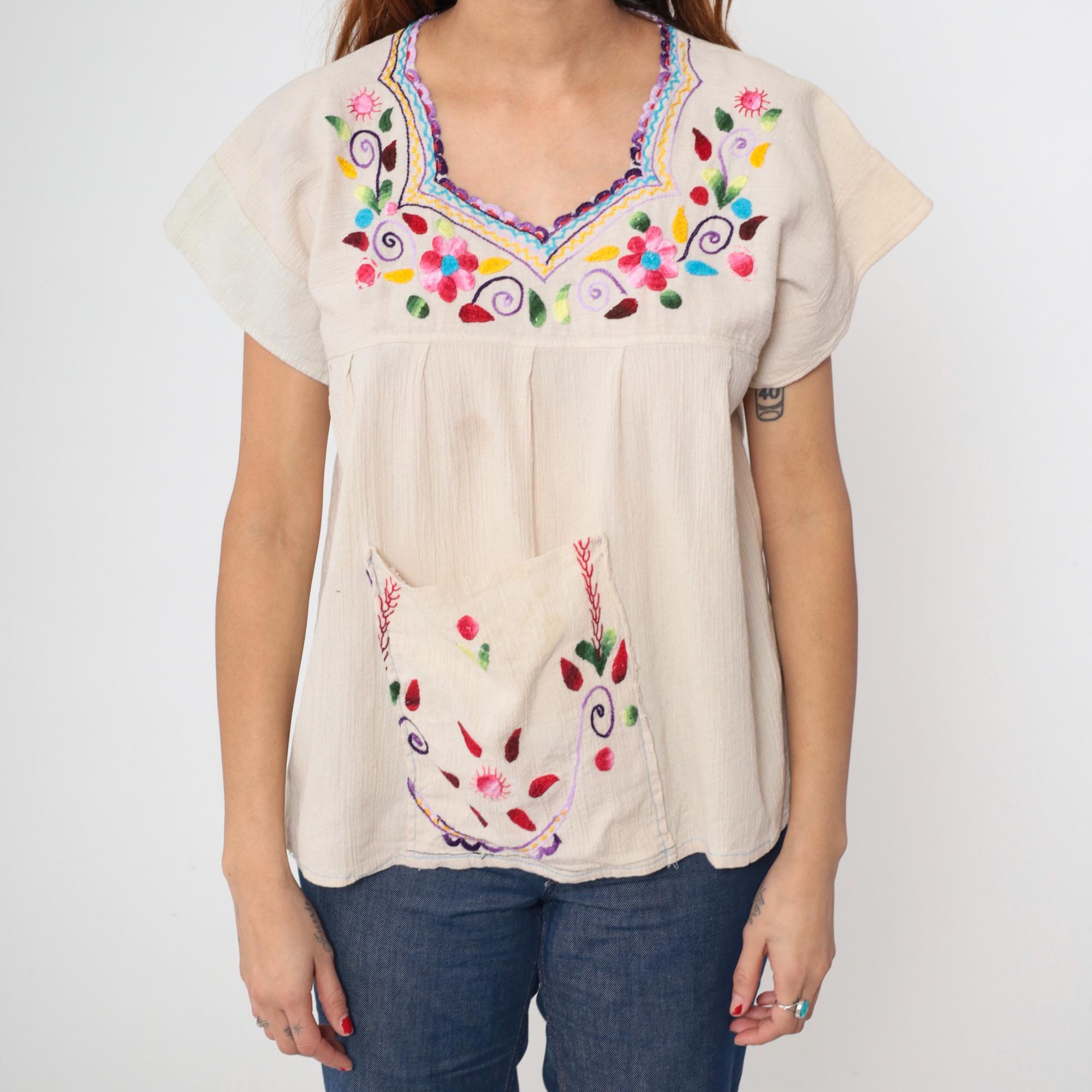 Vintage Y2k Mexican blouse with floral embroidery on cream cotton. Tunic cut with cap sleeves.