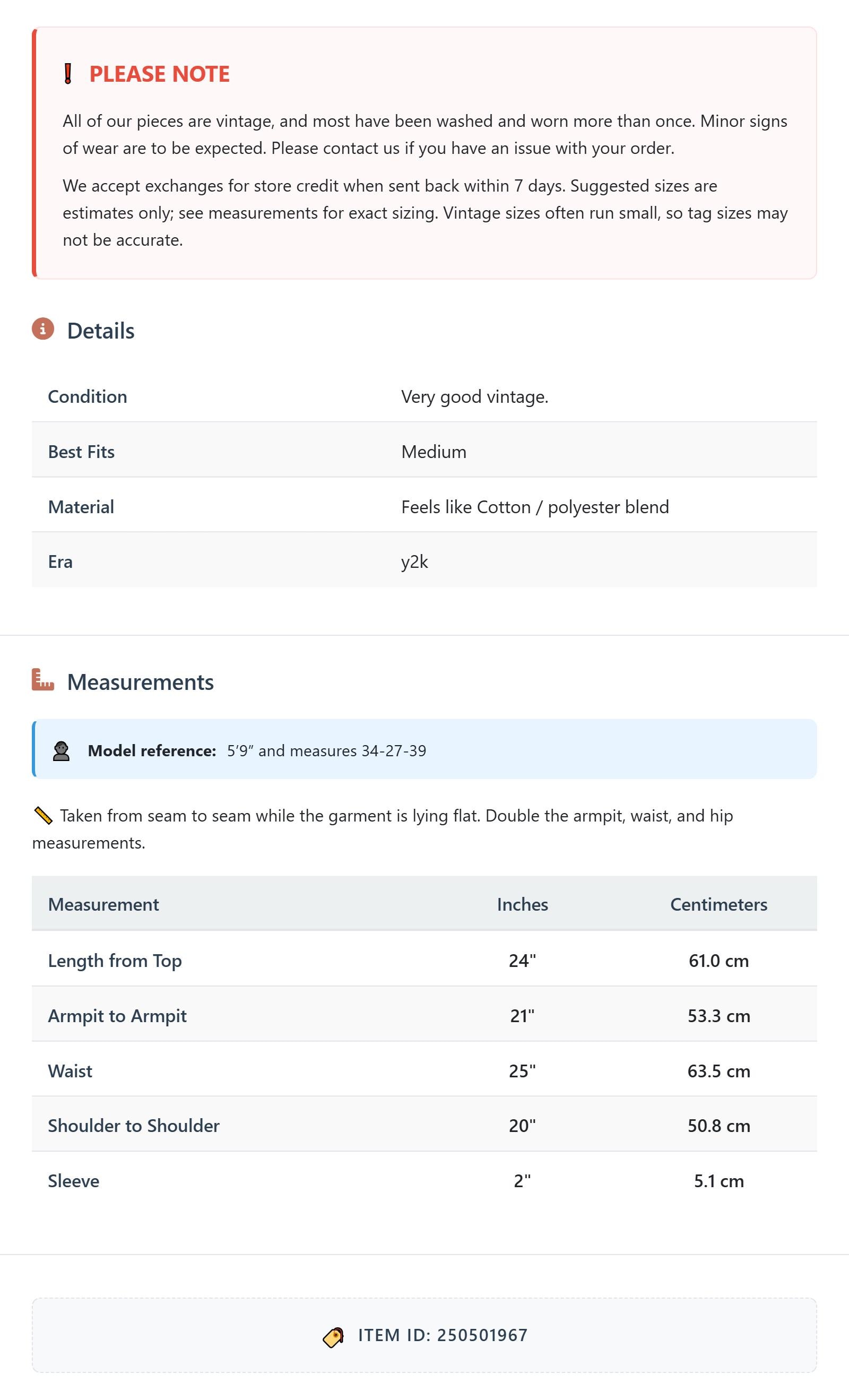 Suggested sizes are estimates only; see measurements for exact sizing. Vintage sizes often run small, so tag sizes may not be accurate.