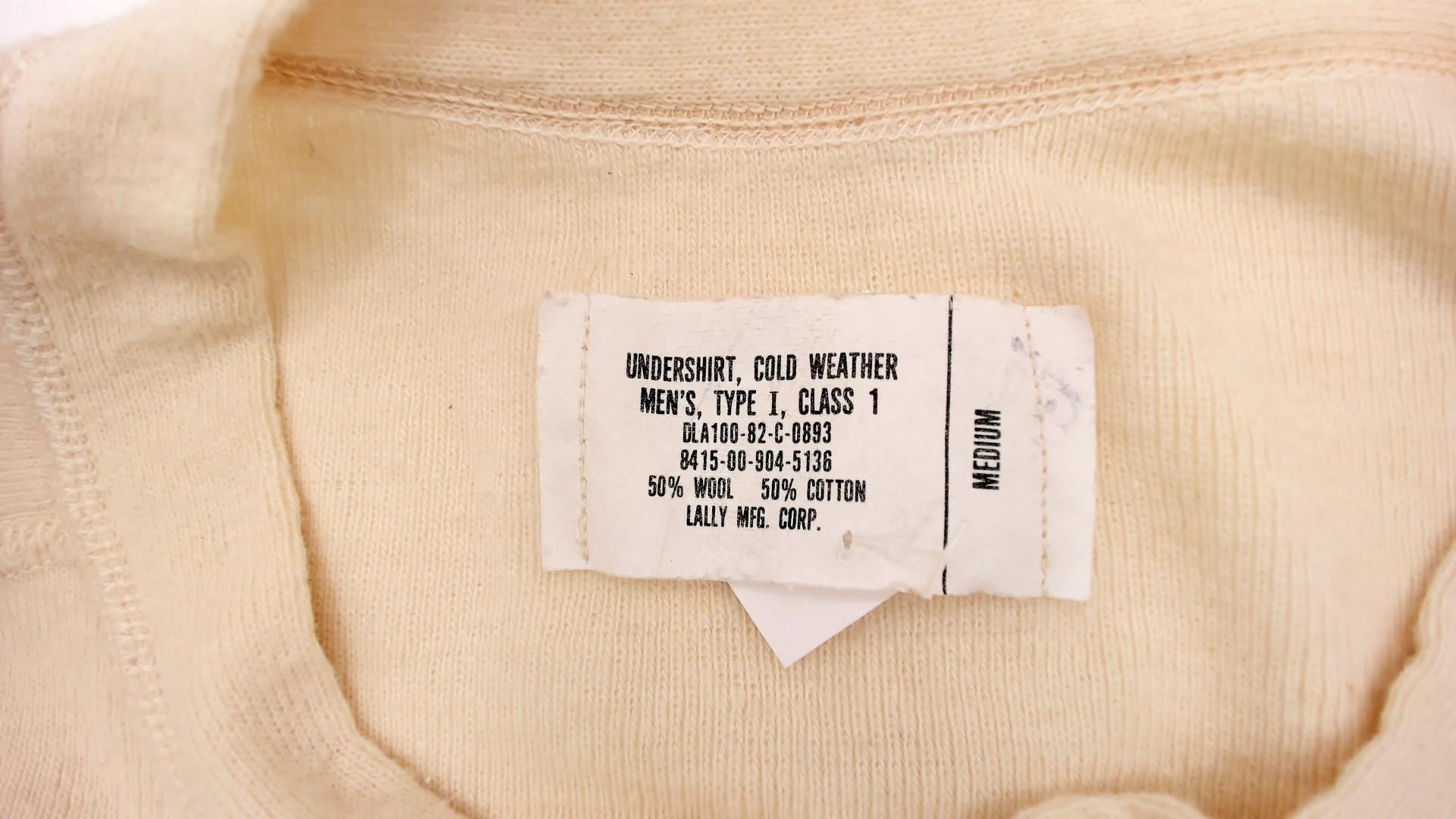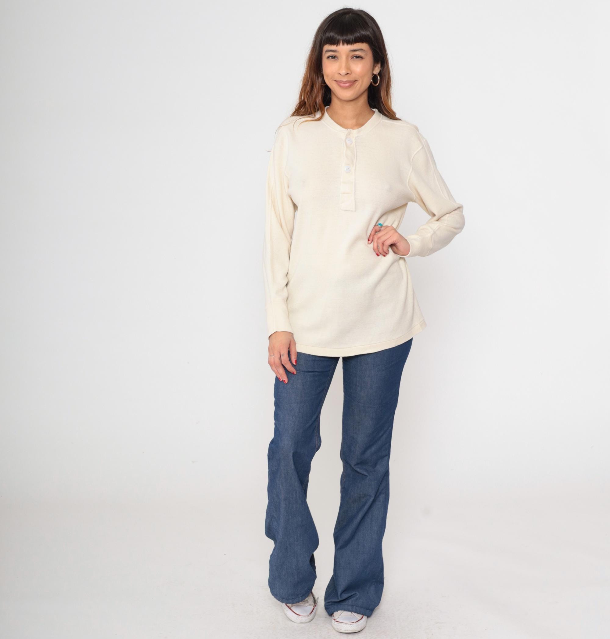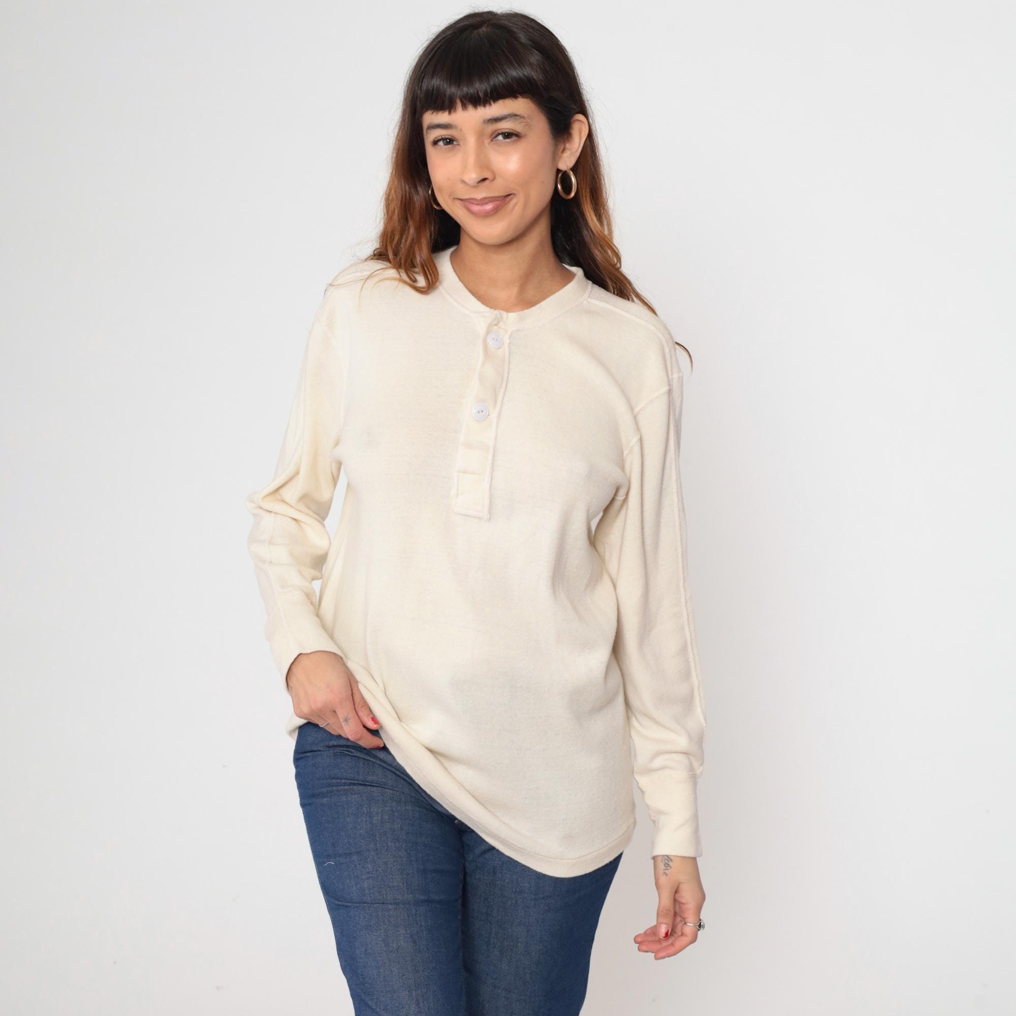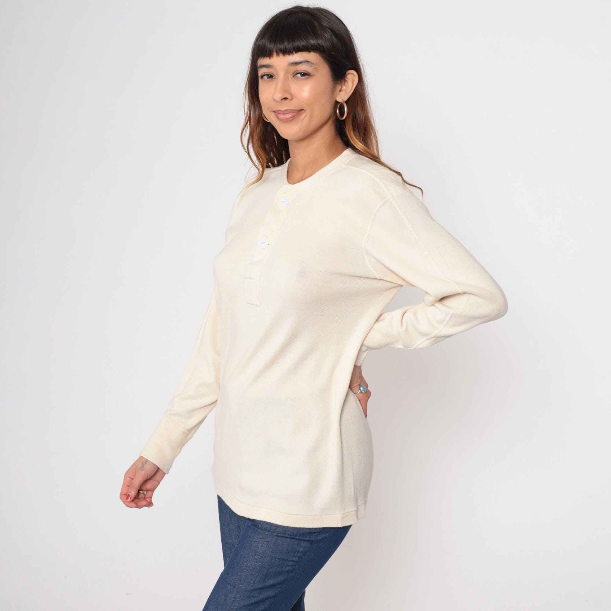 Vintage 80s undershirt in a plain cream wool blend. Long sleeves and buttons up the chest.