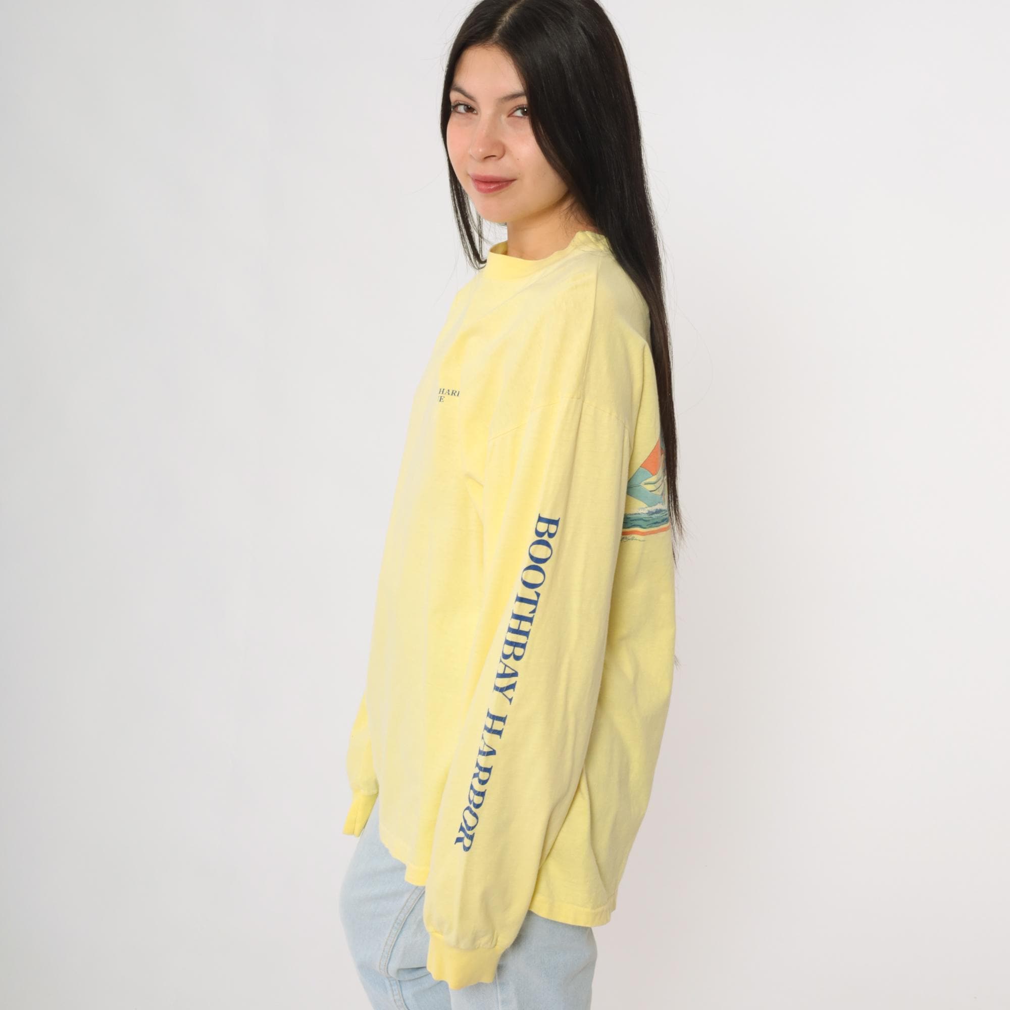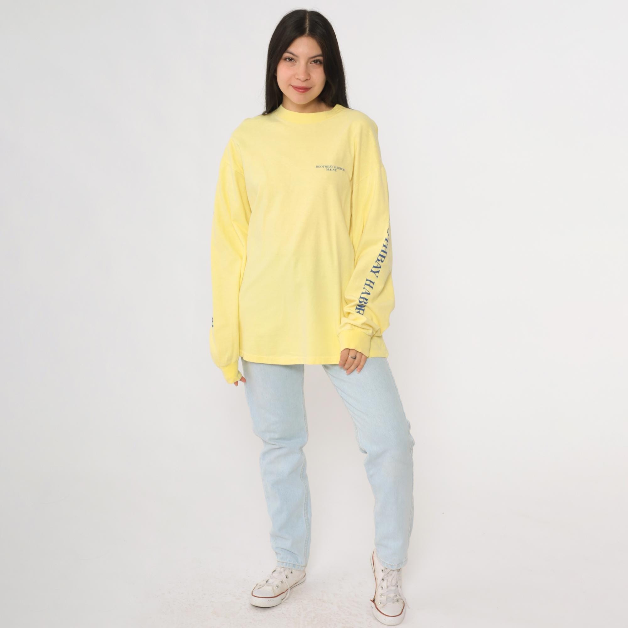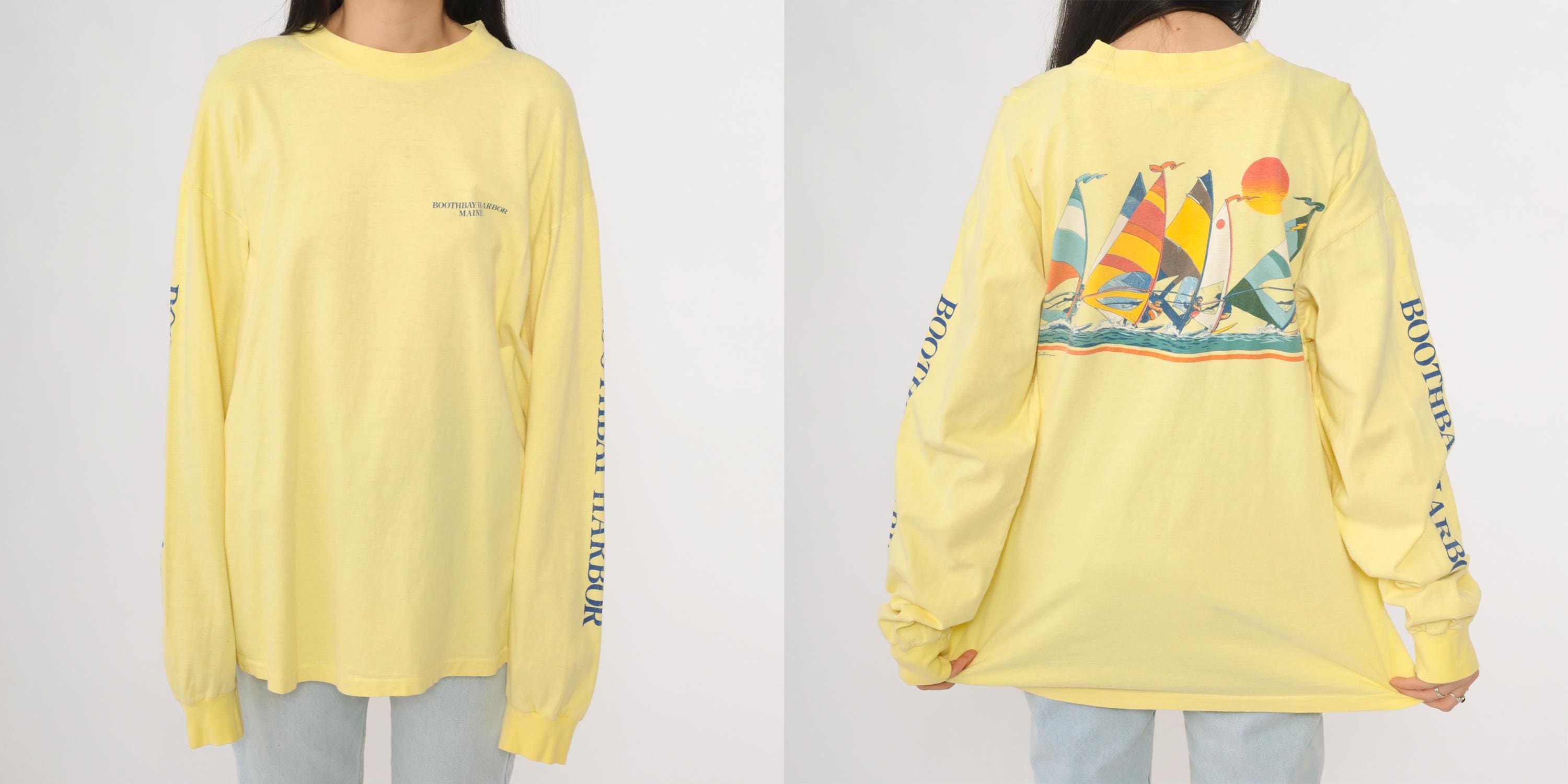 Vintage 90s Hanes Beefy T long sleeve shirt in pale yellow featuring Boothbay Harbor, Maine printed on the chest and sleeves with a bold regatta sailboat graphic across the back. Made in USA with a classic crew neck, ribbed cuffs, and oversized fit