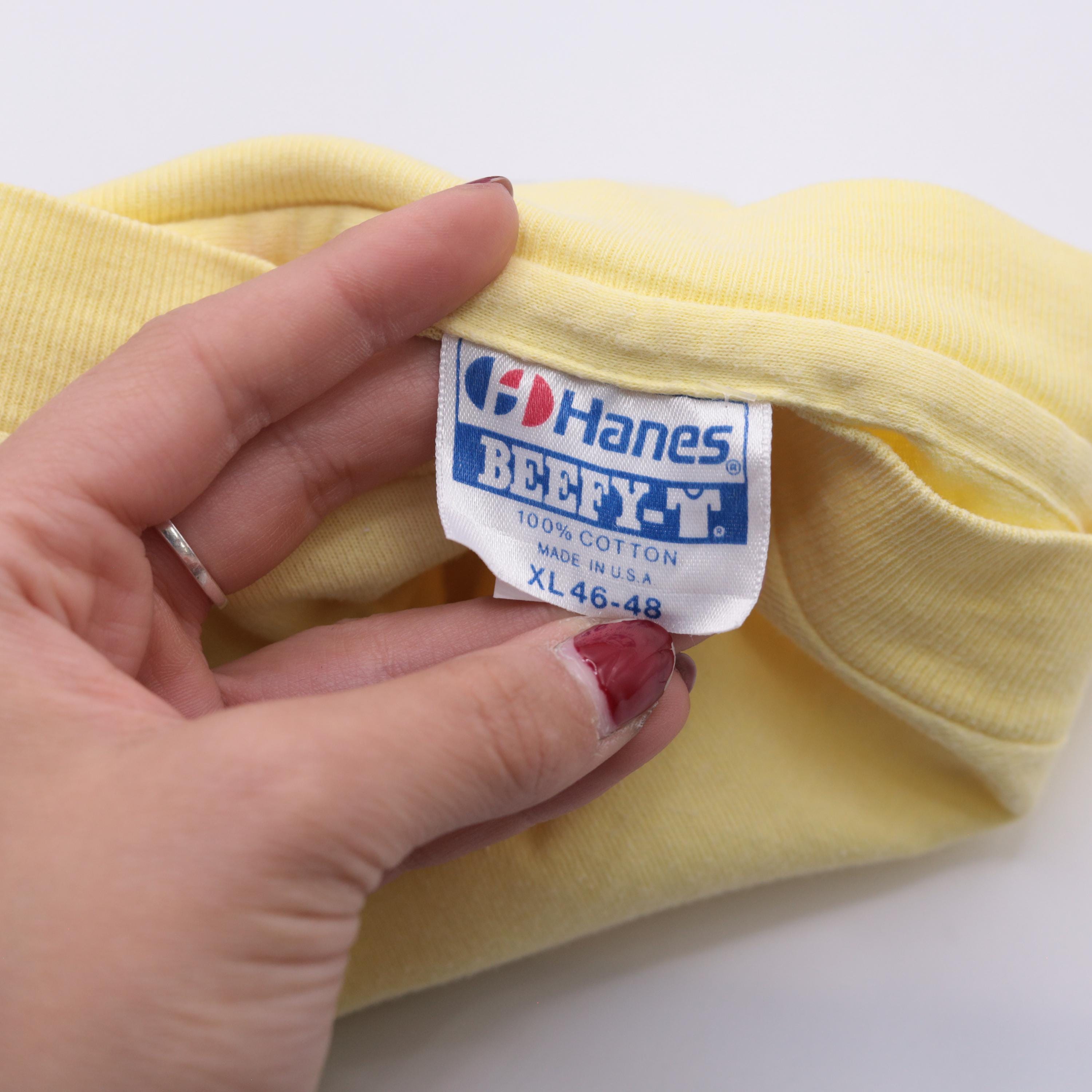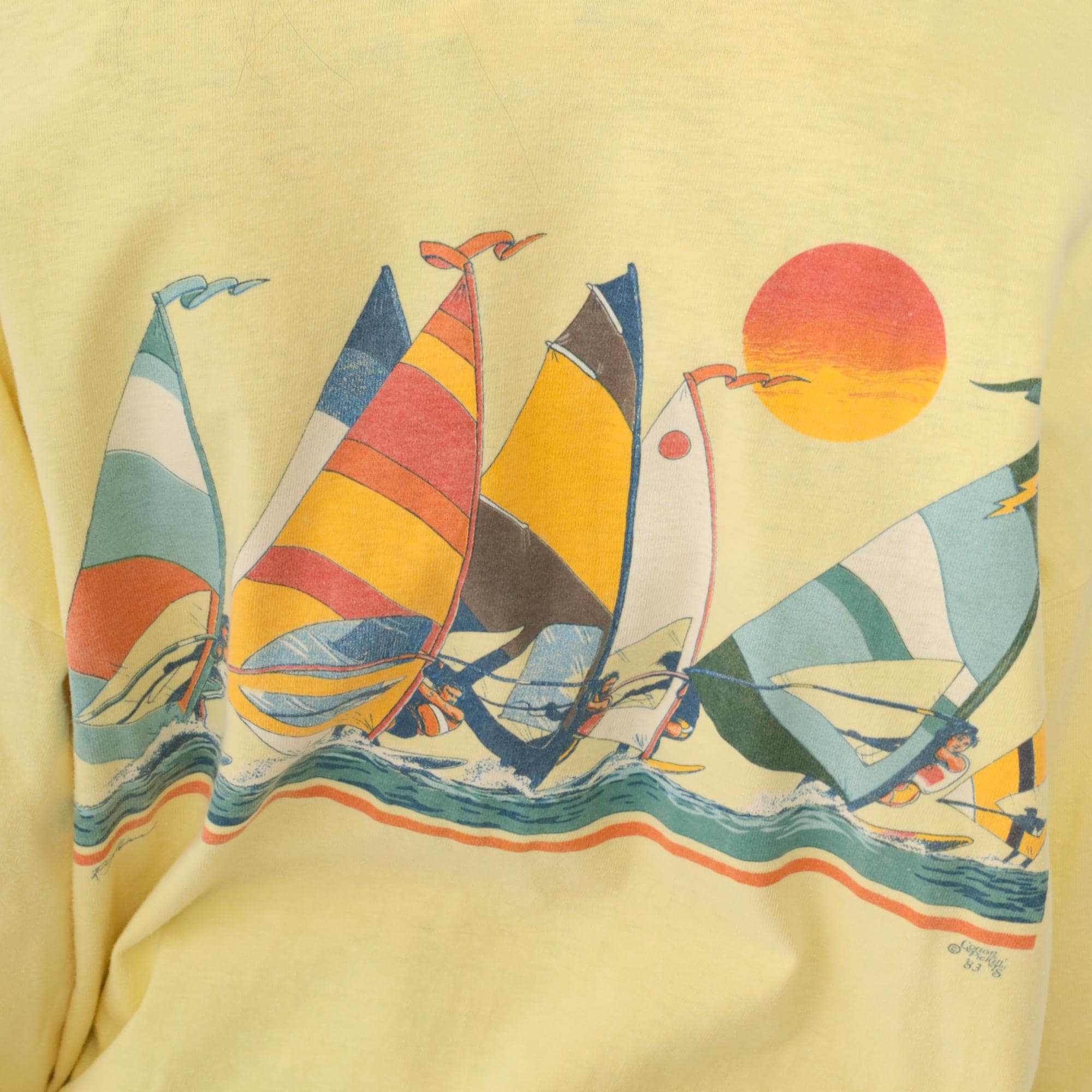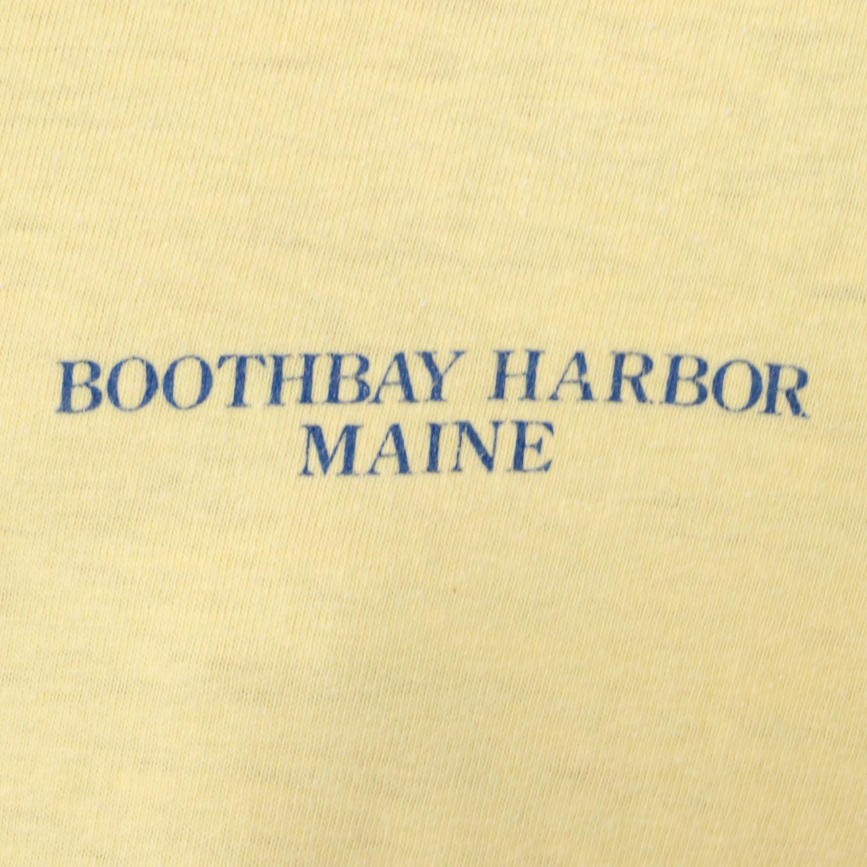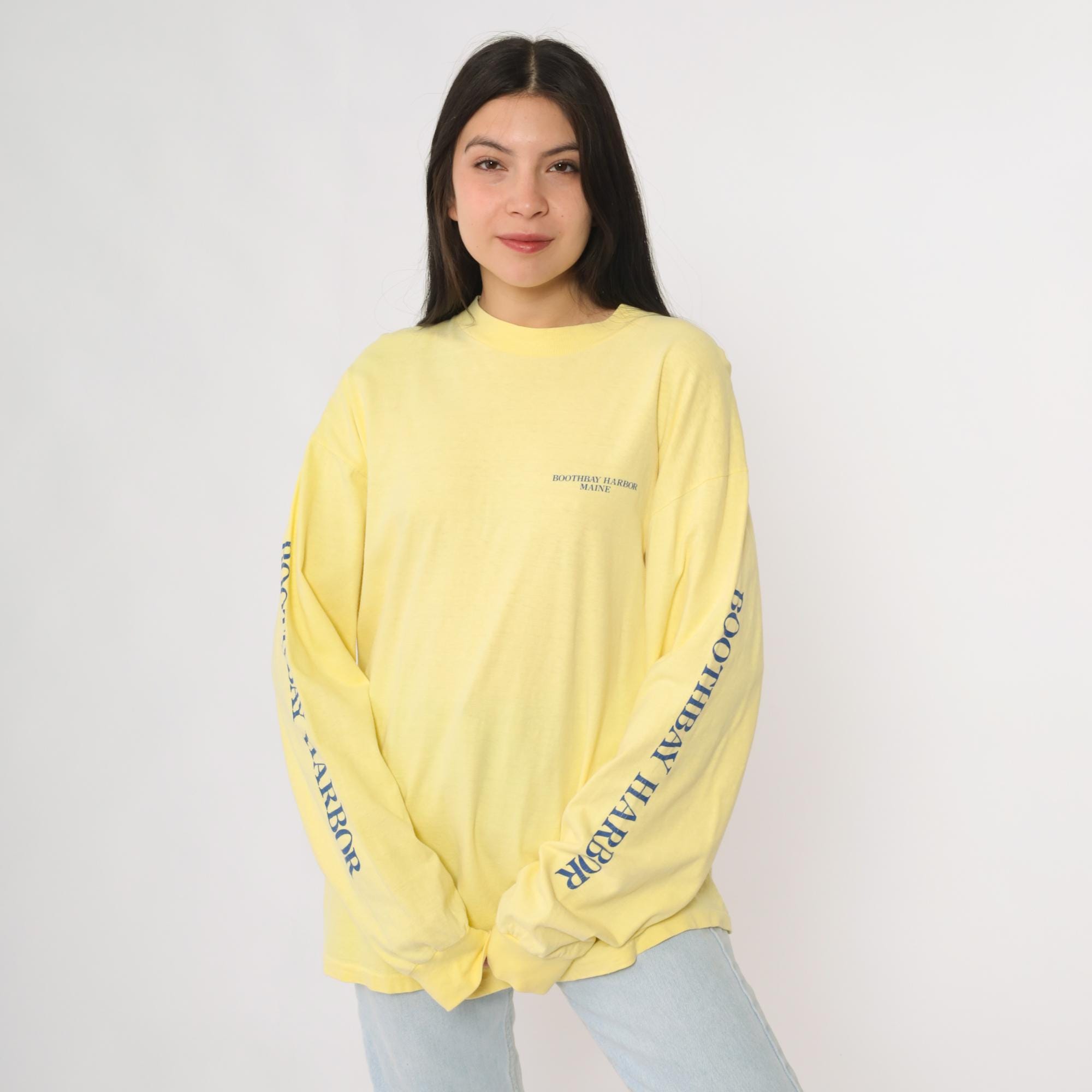 Vintage 90s Hanes Beefy T long sleeve shirt in pale yellow featuring Boothbay Harbor, Maine printed on the chest and sleeves with a bold regatta sailboat graphic across the back. Made in USA with a classic crew neck, ribbed cuffs, and oversized fit