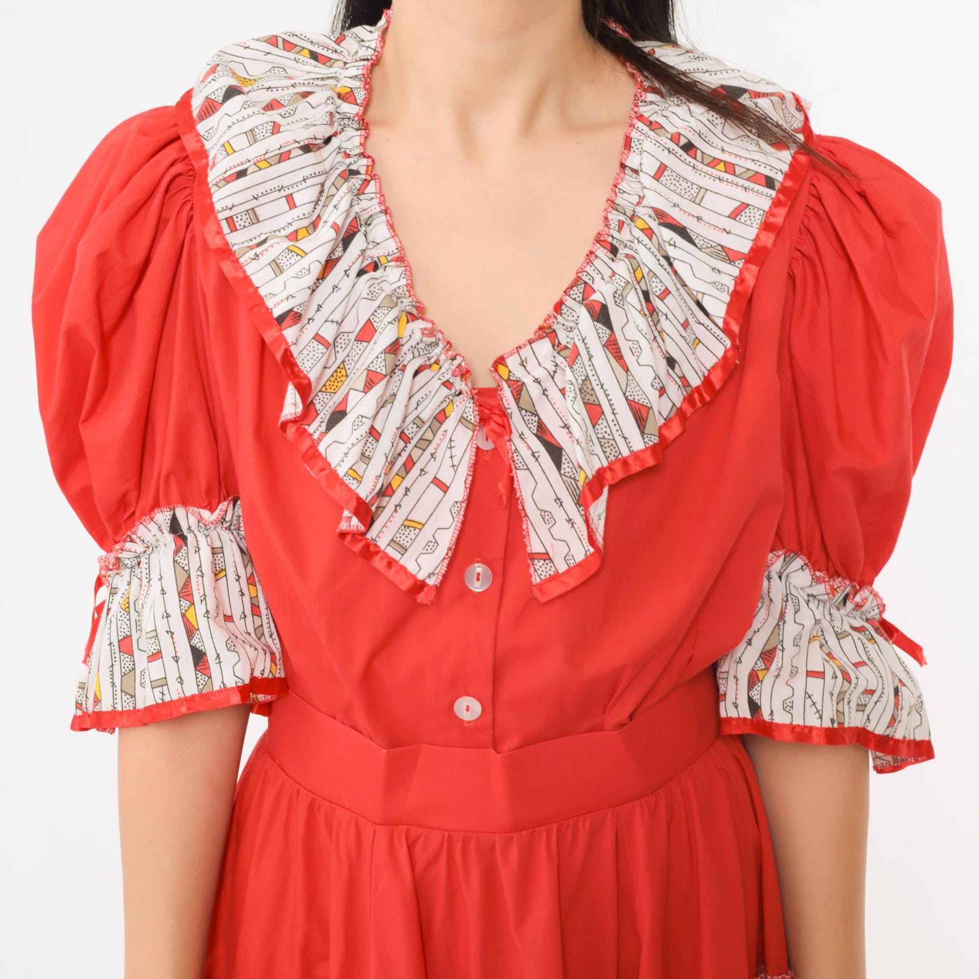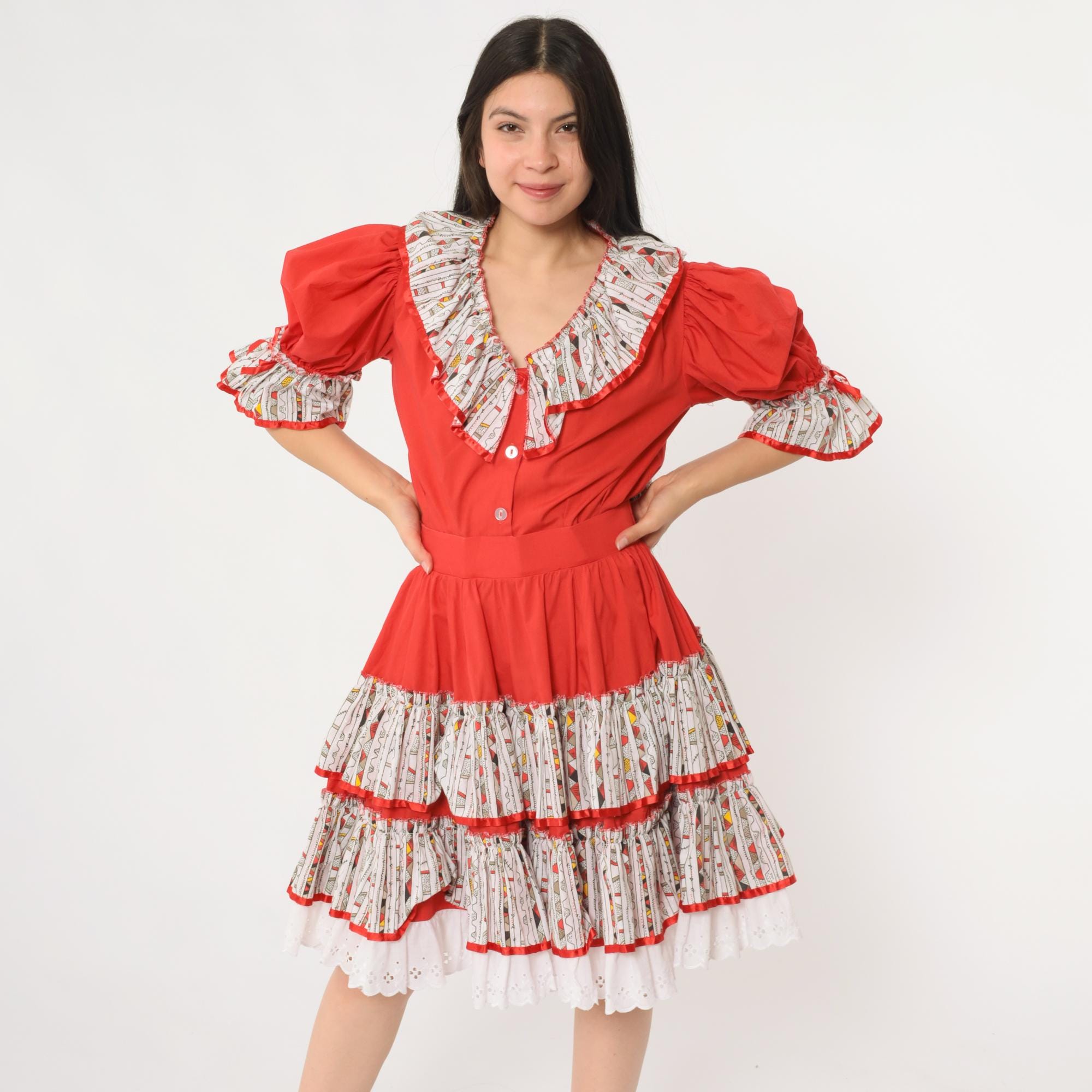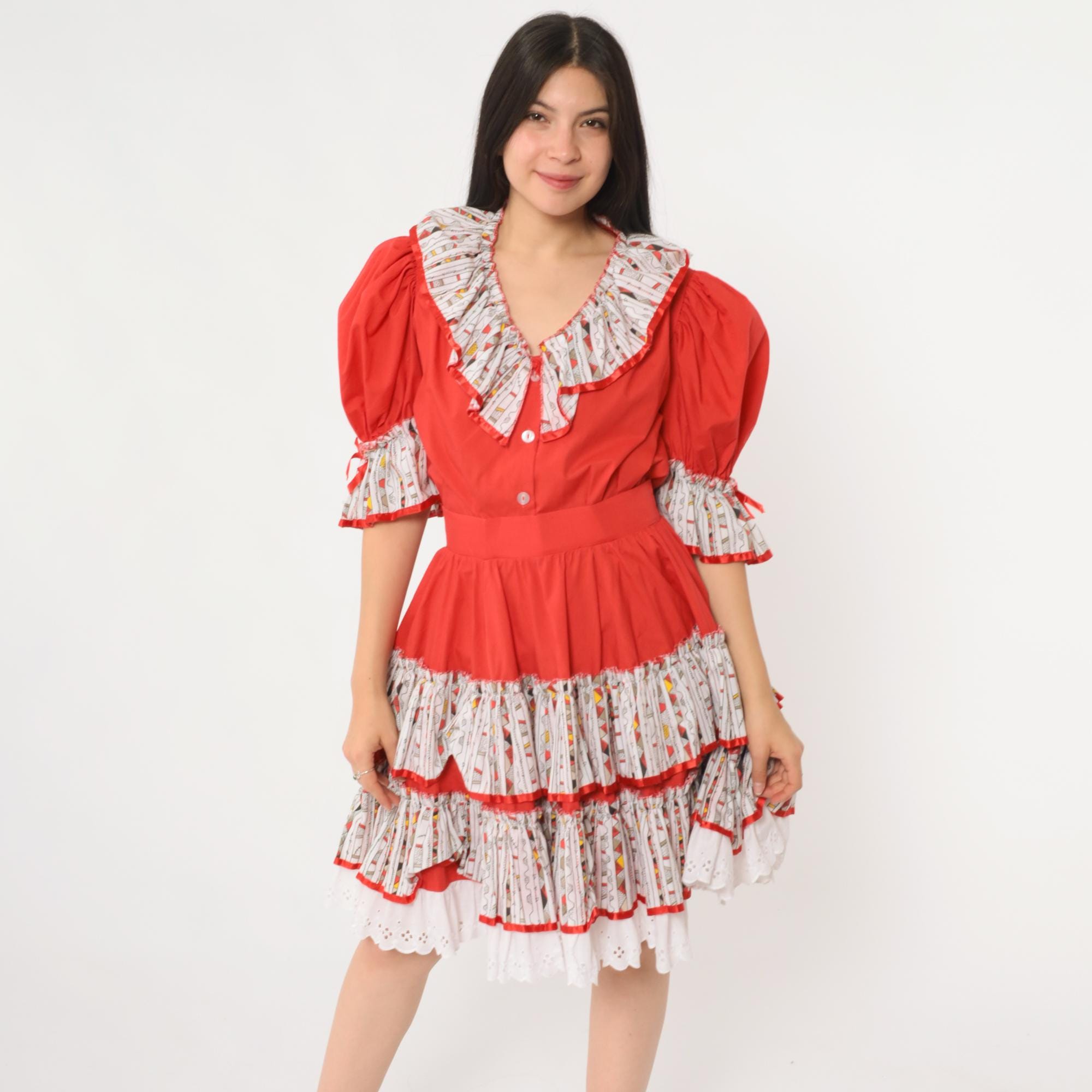 Vintage 80s two piece set featuring a bold red puff sleeve top and matching full skirt. The top has a deep ruffle collar with button front closure, elastic sleeve cuffs, and contrast ruffle trim in a white geometric printed fabric. The matching skirt has a full tiered silhouette with layers of ruffled trim in the same contrast print, finished with white eyelet lace at the hem. Includes a fitted waistband and side zip closure.